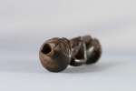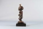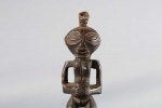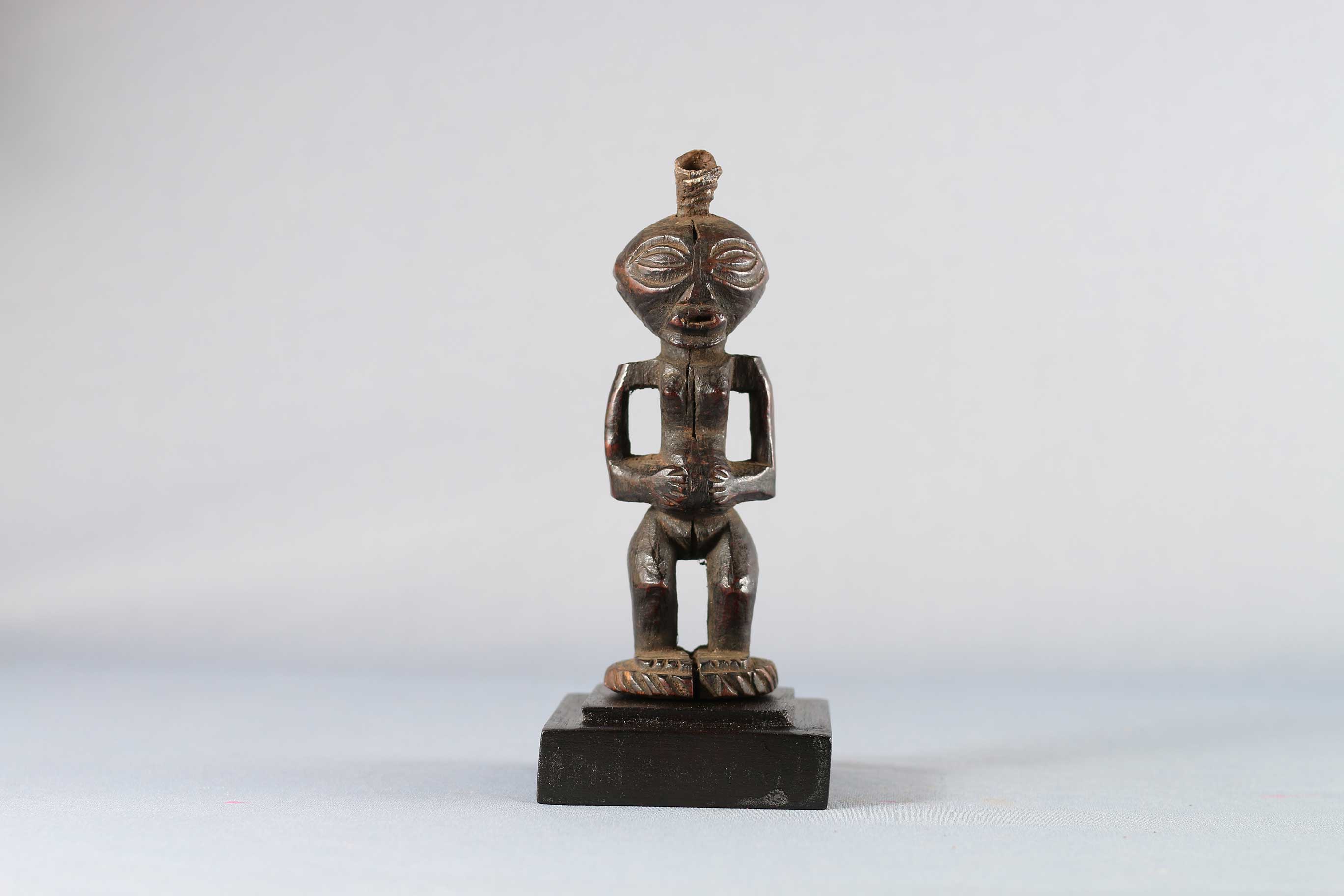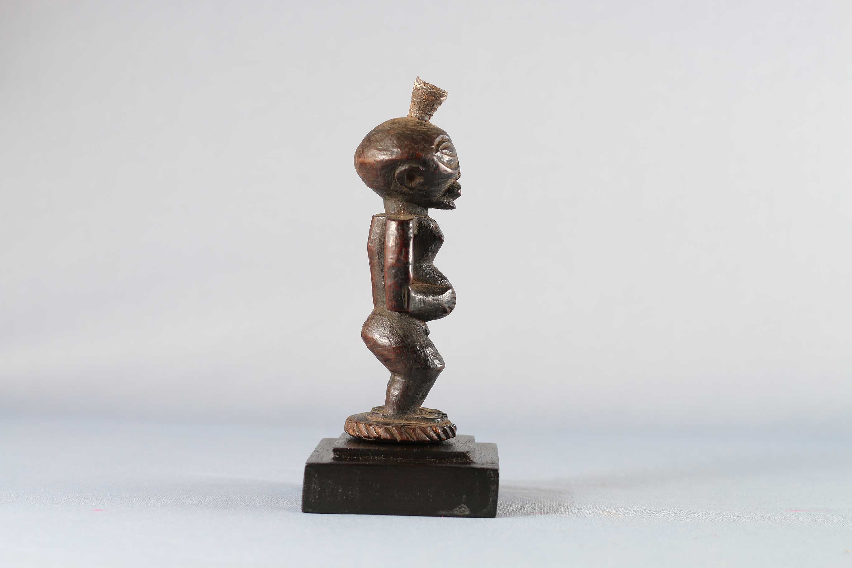 The Songye people are a Bantu ethnic group from the central Democratic Republic Of Congo, the Songye made power figures known as Nkisi that were used to combat witchcraft and sorcery. They were also believed to bring promote fertility and success, vanquish enemies and protect one from evil. The smaller ones were for individual families and the larger ones acted as intercessors between ancestral spirits and the living, they were owned by and served the entire community and also brought togetherness among the community. Such sculptures were commissioned by chiefs and elders, the entire community selected the tree in which the sculpture was to be carved in and it was carved by a professional artist called a Nganga who selected the type of wood and features. Although protective, these were confrontational objects, with a warrior’s attitude. The following is a sculpture crafted from hardwood with its hands resting to the belly, a dark patina and it shows clear signs of age.