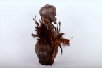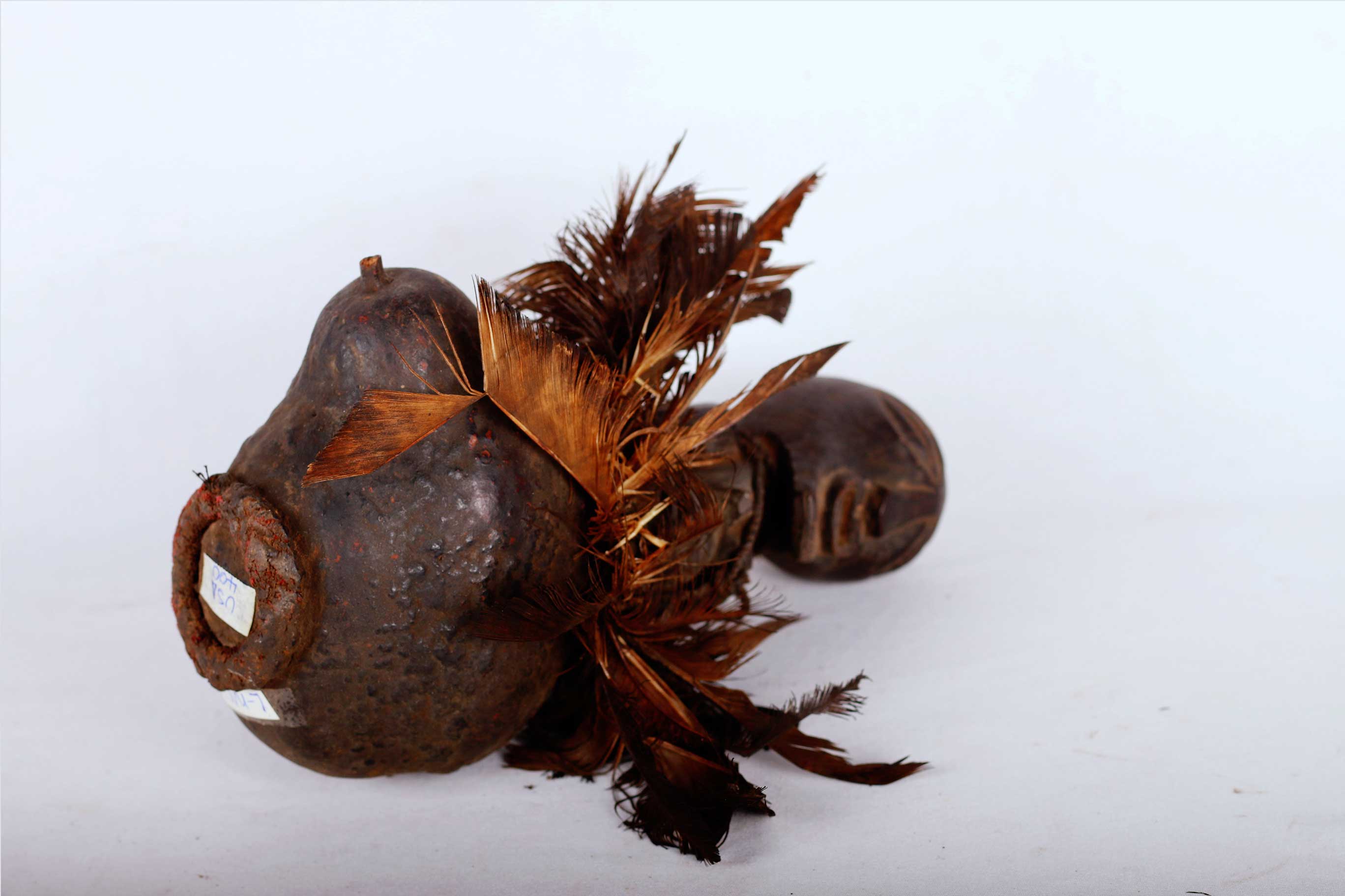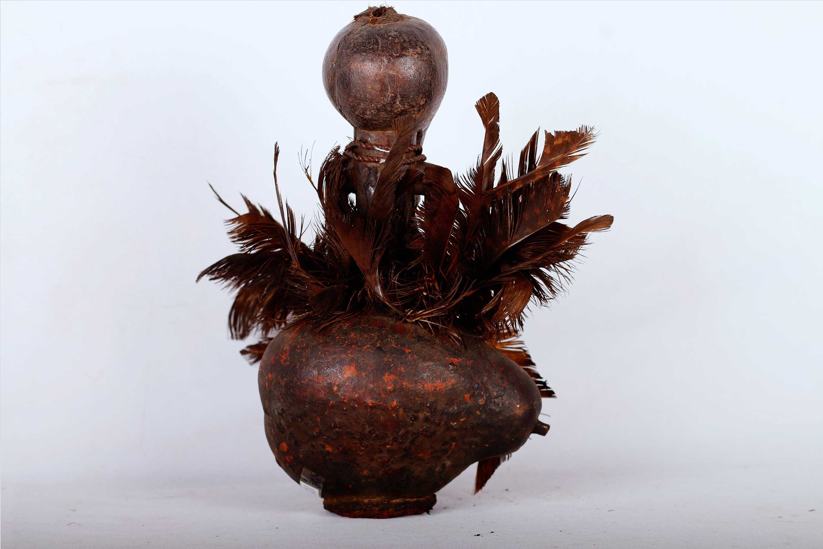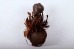 The Songye are a Bantu ethnic group from the central Democratic Republic of the Congo. The Songye people, like Luba people, are well-known woodcarvers who are renowned for making ceremonial masks, power figures, and other ceremonial items. Calabashes were primarily used for divination purposes. Calabashes such as this were often cut from a gourd, the following vessel bears a black patina and is covered in bird feathers, it is a bush collected item and we believe that it is old because of its patination and tear.