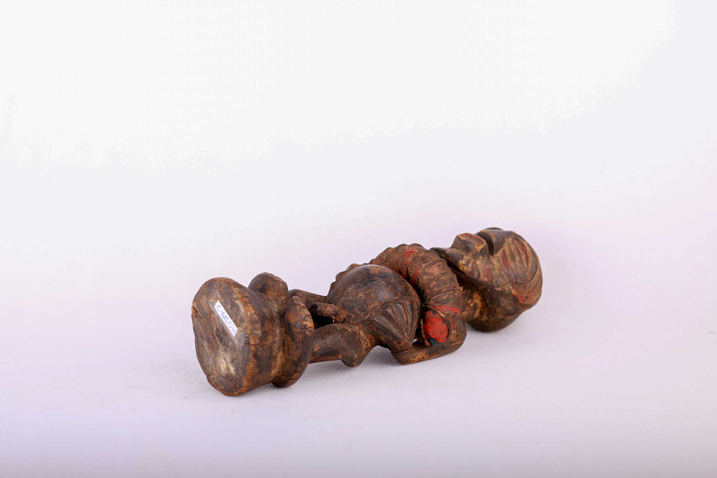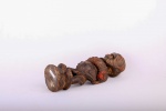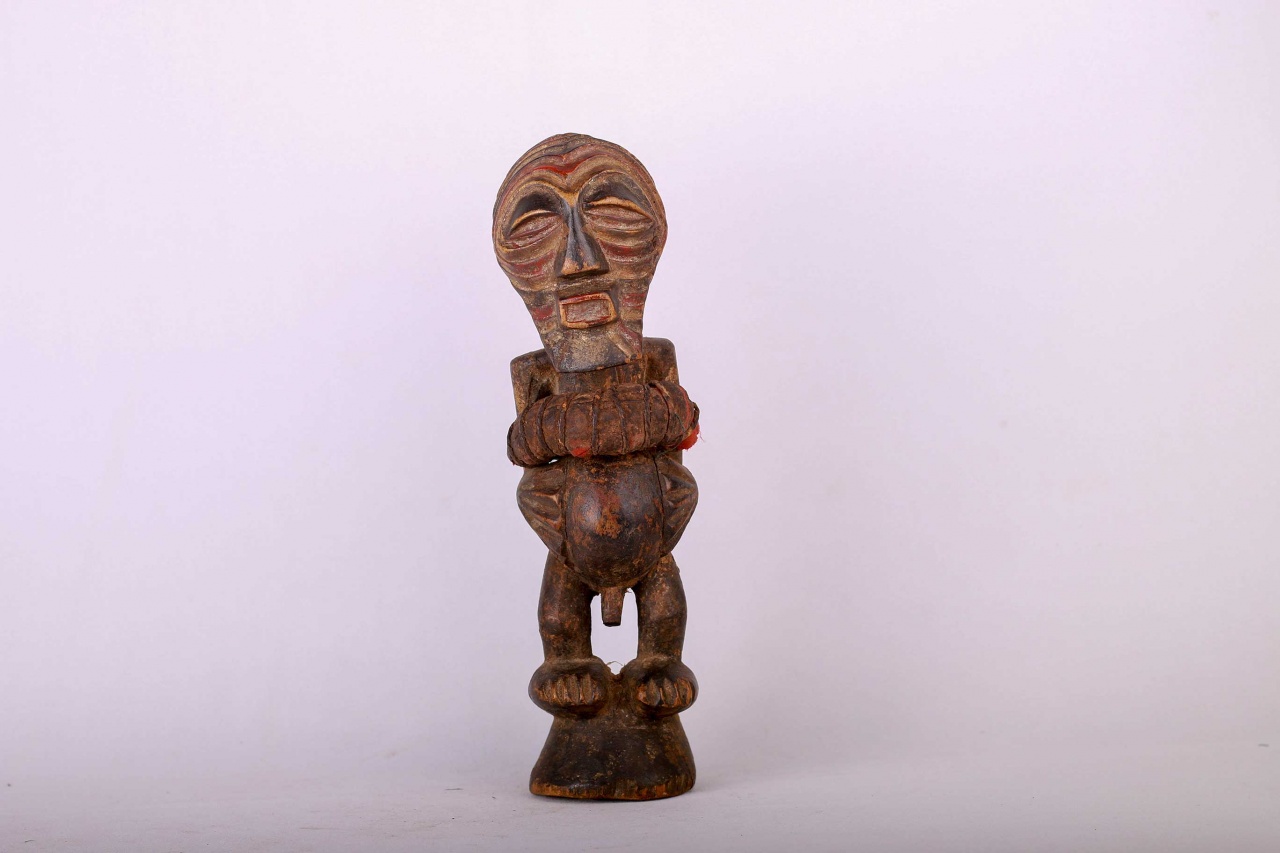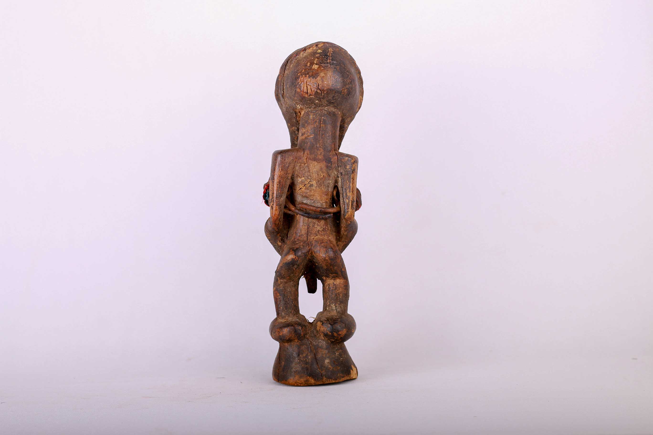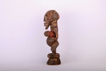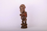 This well-carved miniature Songye power figure has hands on a prominent belly. Magical beliefs and practice are widespread among the Songye people who use figures such as this on family or village altars where they contact the spirits of ancestors, nature spirits and where offerings and prayers are given. Songye fetish figures, often have different materials attached to them including animal skins, nails, strips of metal, magical substances or whatever the owner specialist considers important to give the figure power to act. The following statue has a brown patina and looks visibly old.