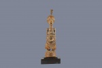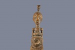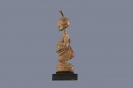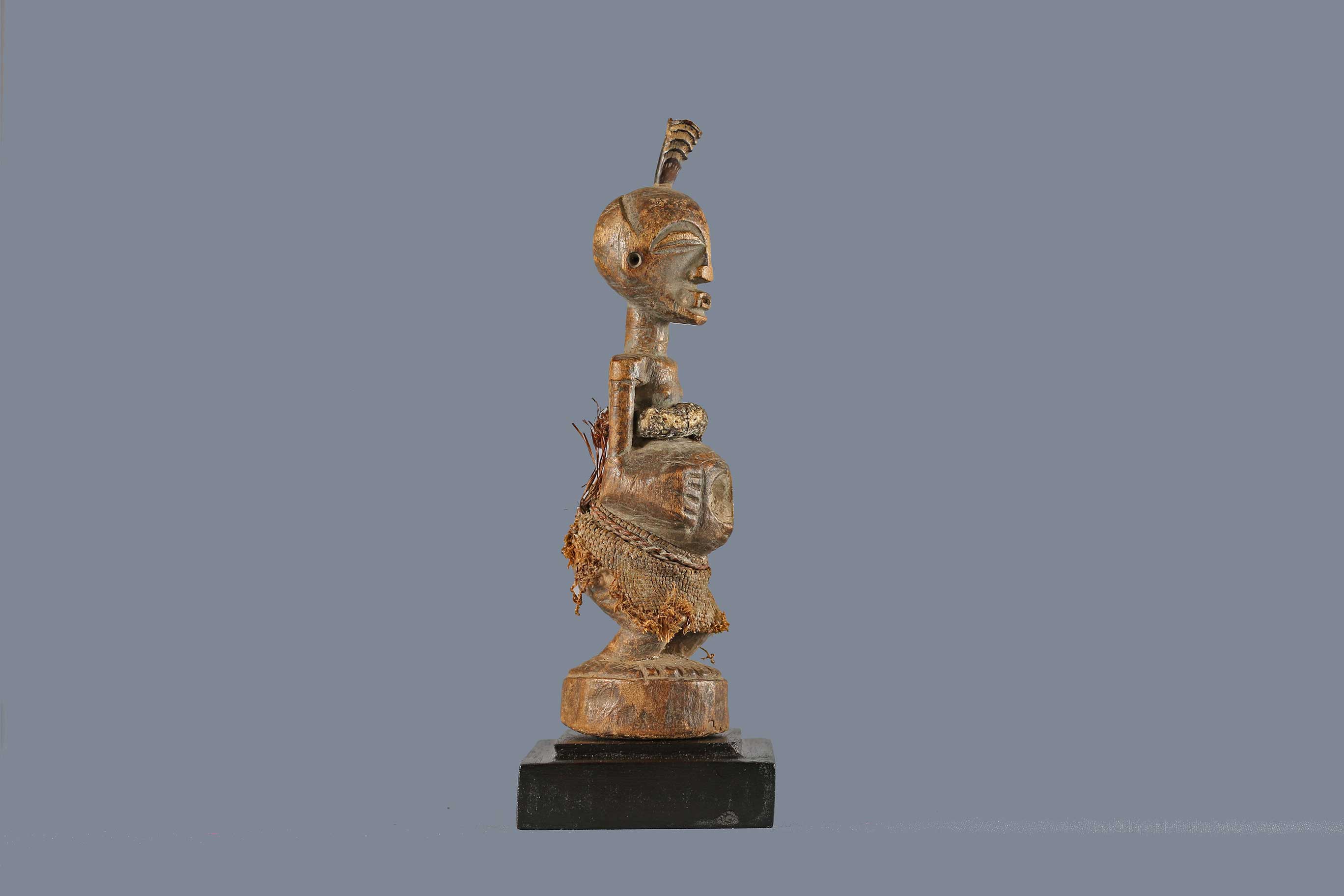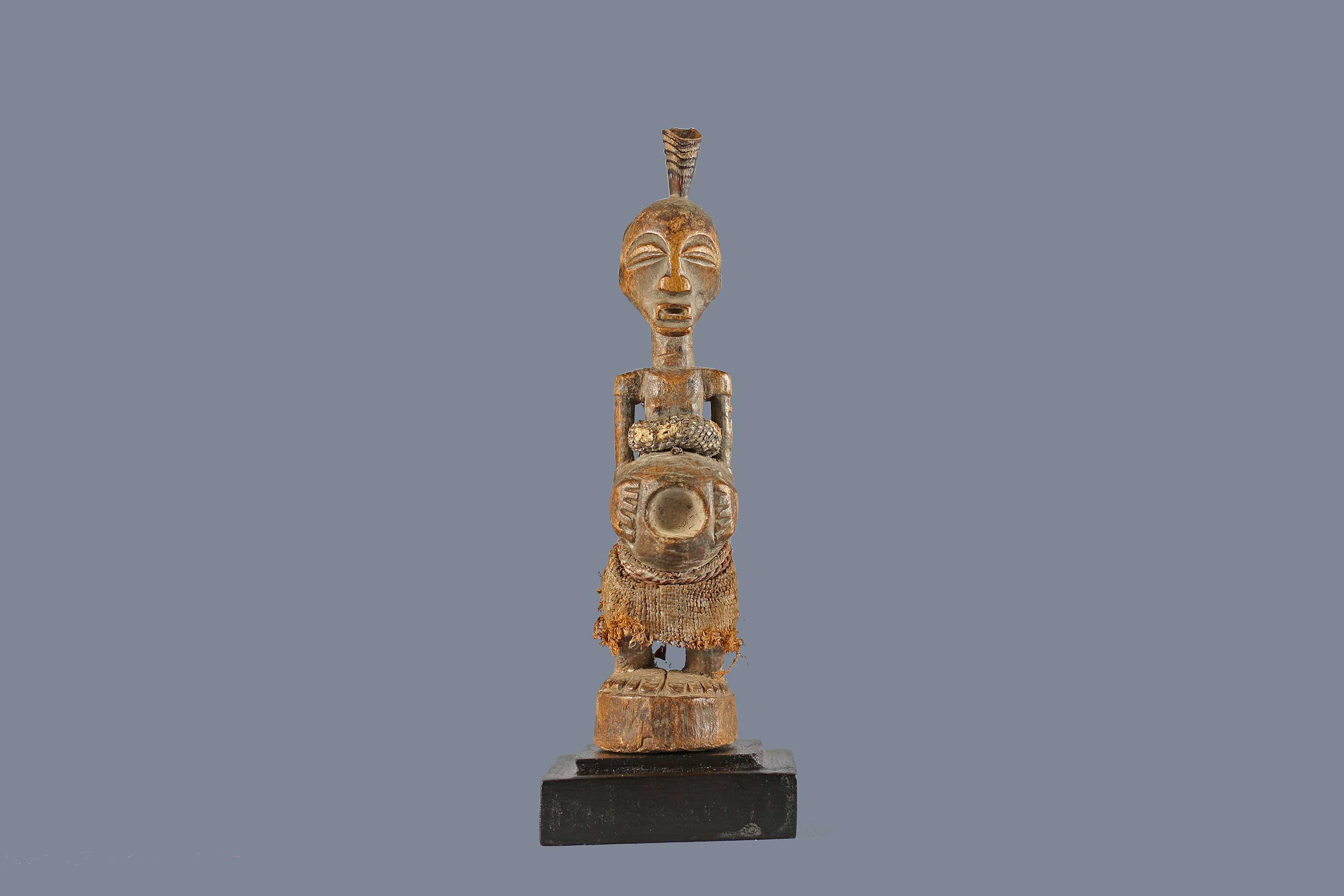 The Songye people are a Bantu ethnic group from the central Democratic Republic Of Congo, the Songye made power figures known as Nkisi that were used to combat witchcraft and sorcery. They were also believed to bring promote fertility and success, vanquish enemies and protect one from evil. The smaller ones were for individual families and the larger ones acted as intercessors between ancestral spirits and the living, they were owned by and served the entire community and also brought togetherness among the community. Such sculptures were commissioned by chiefs and elders, the entire community selected the tree in which the sculpture was to be carved in and it was carved by a professional artist called a Nganga who selected the type of wood and features. The following is a sculpture crafted from hardwood and has a khaki patina