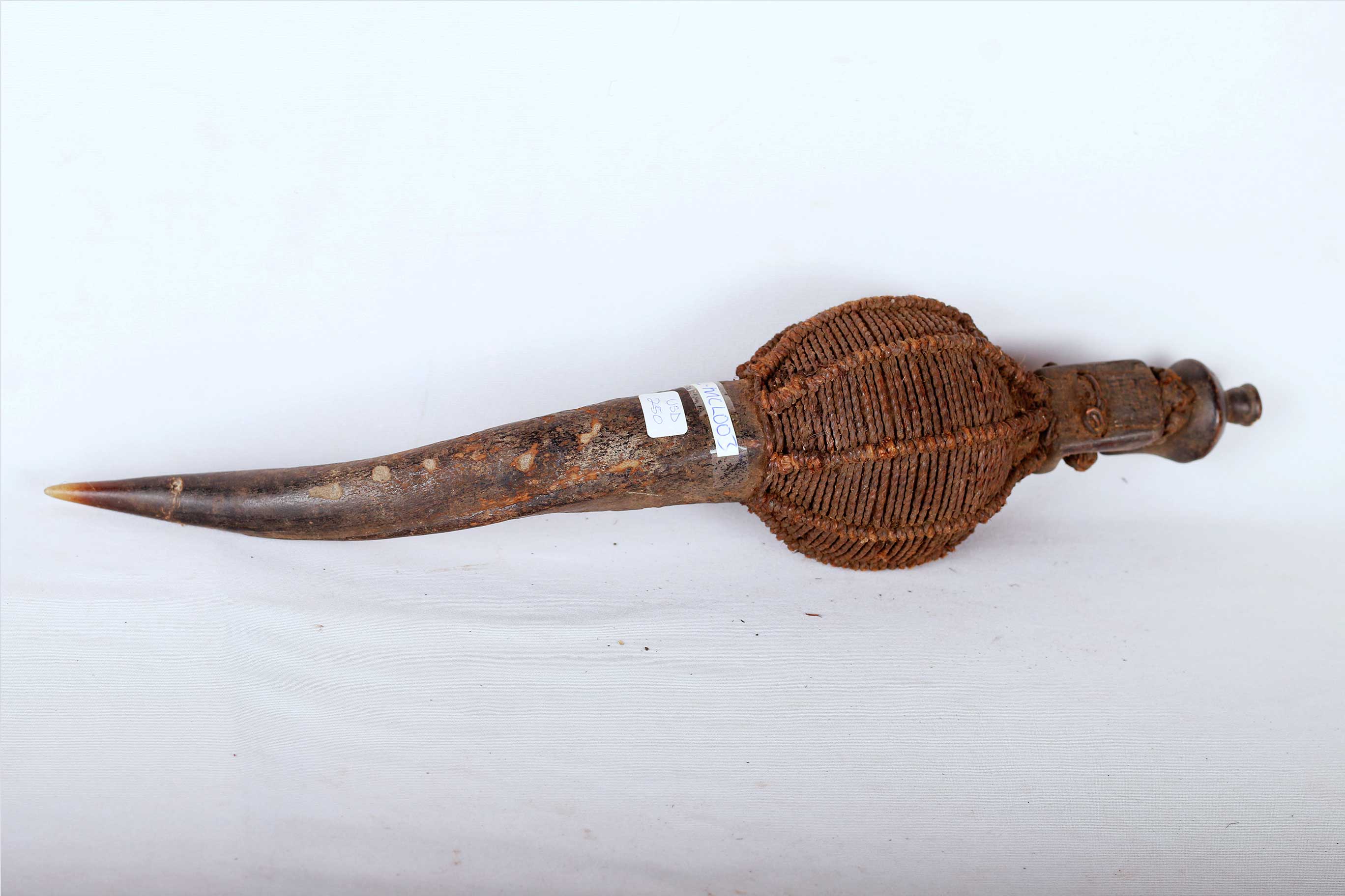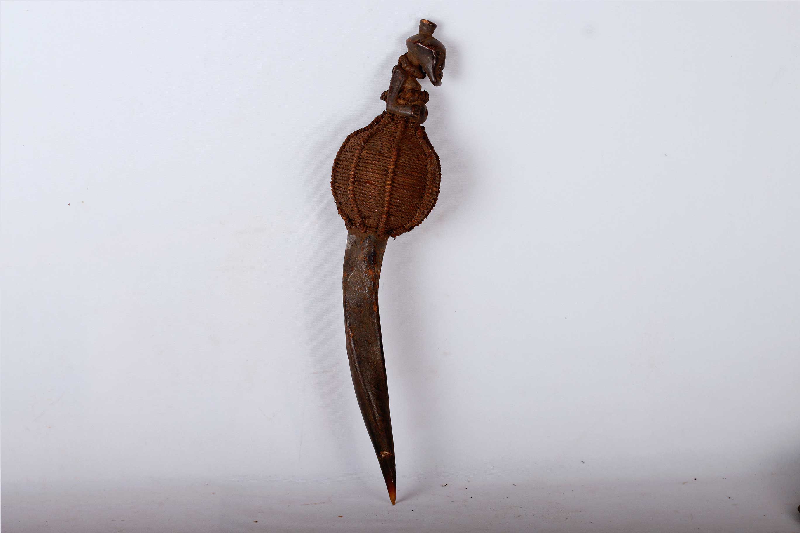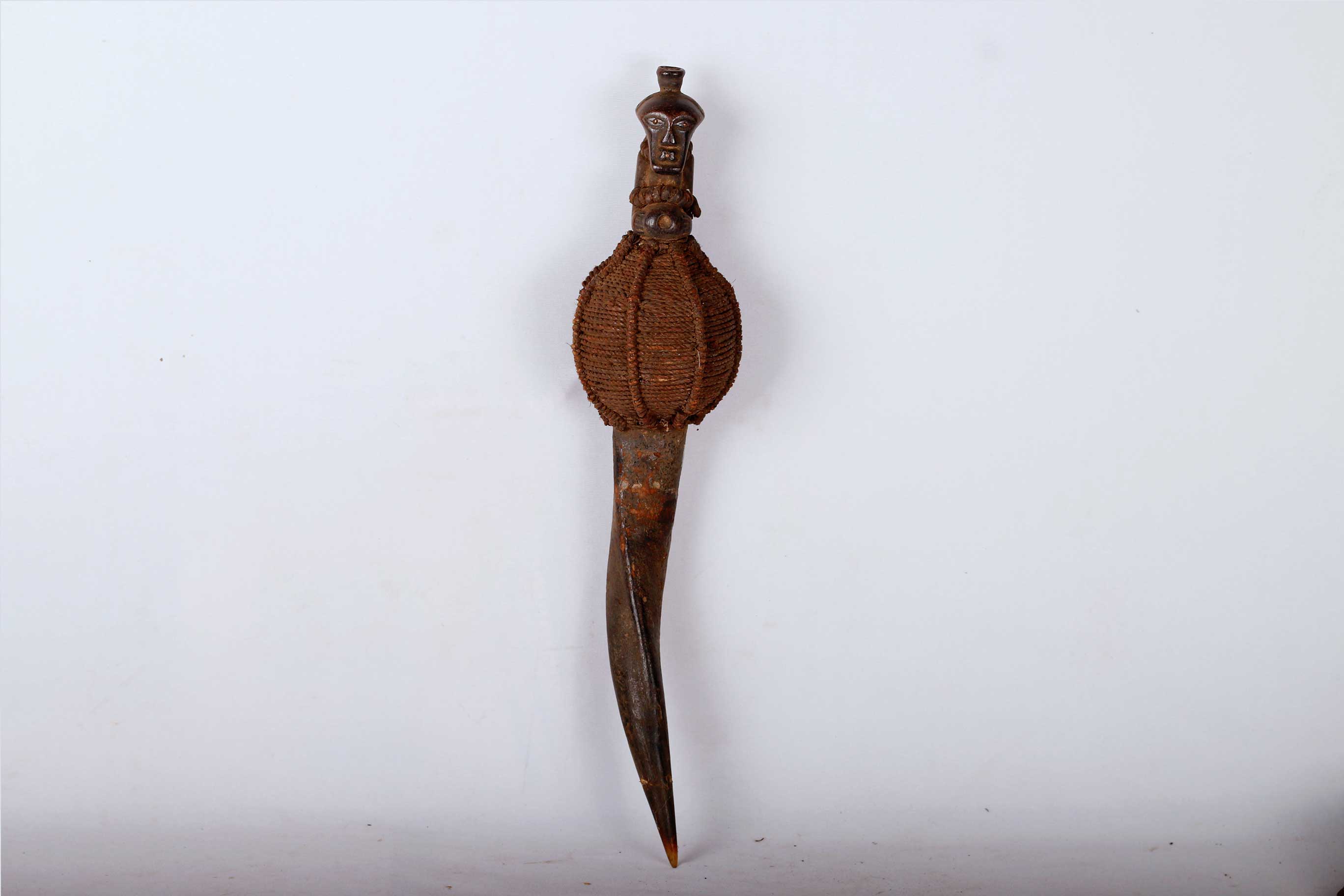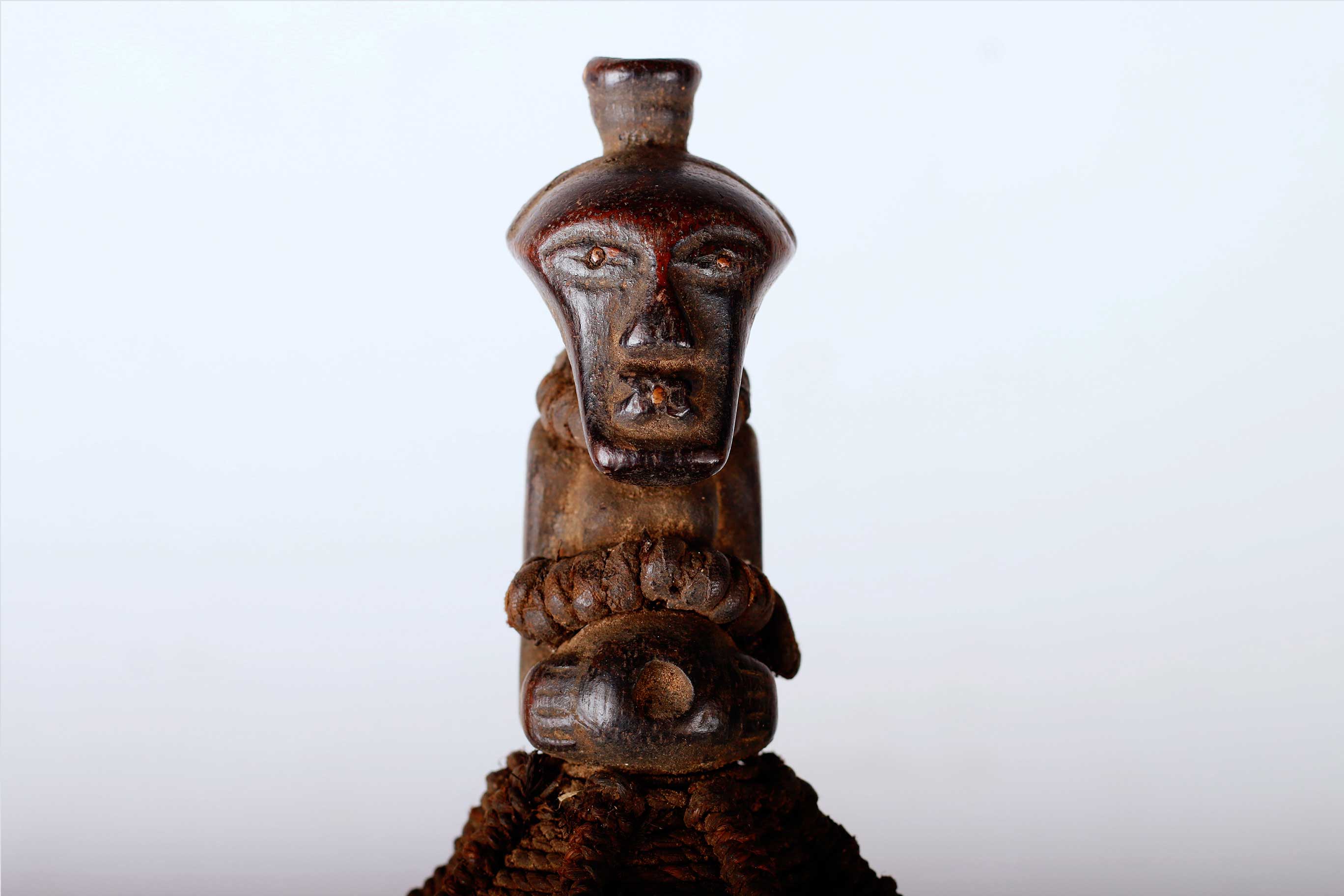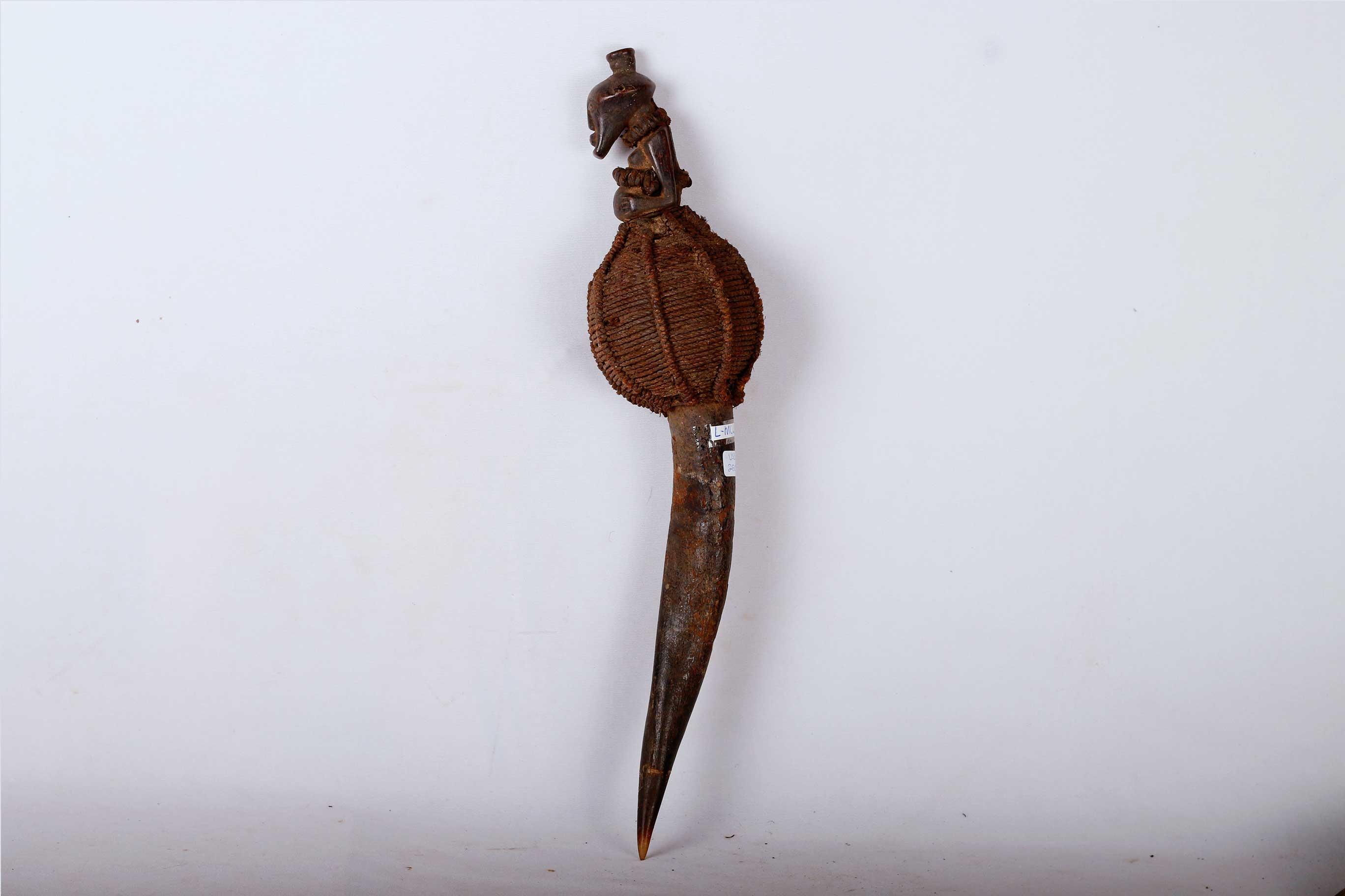 The Songye are a Bantu ethnic group from the central Democratic Republic of the Congo. The Songye people, like Luba people, are well-known woodcarvers who are renowned for making ceremonial masks, power figures, and other ceremonial items. Authentic old and important Songye power figure from the Democratic Republic of Congo called Minkisi these important figures were commissioned to provide supernatural forces. The horn at the bottom of the figure was usually made from antelope horn. This is an old fetish and it shows visible signs of age and usage.
