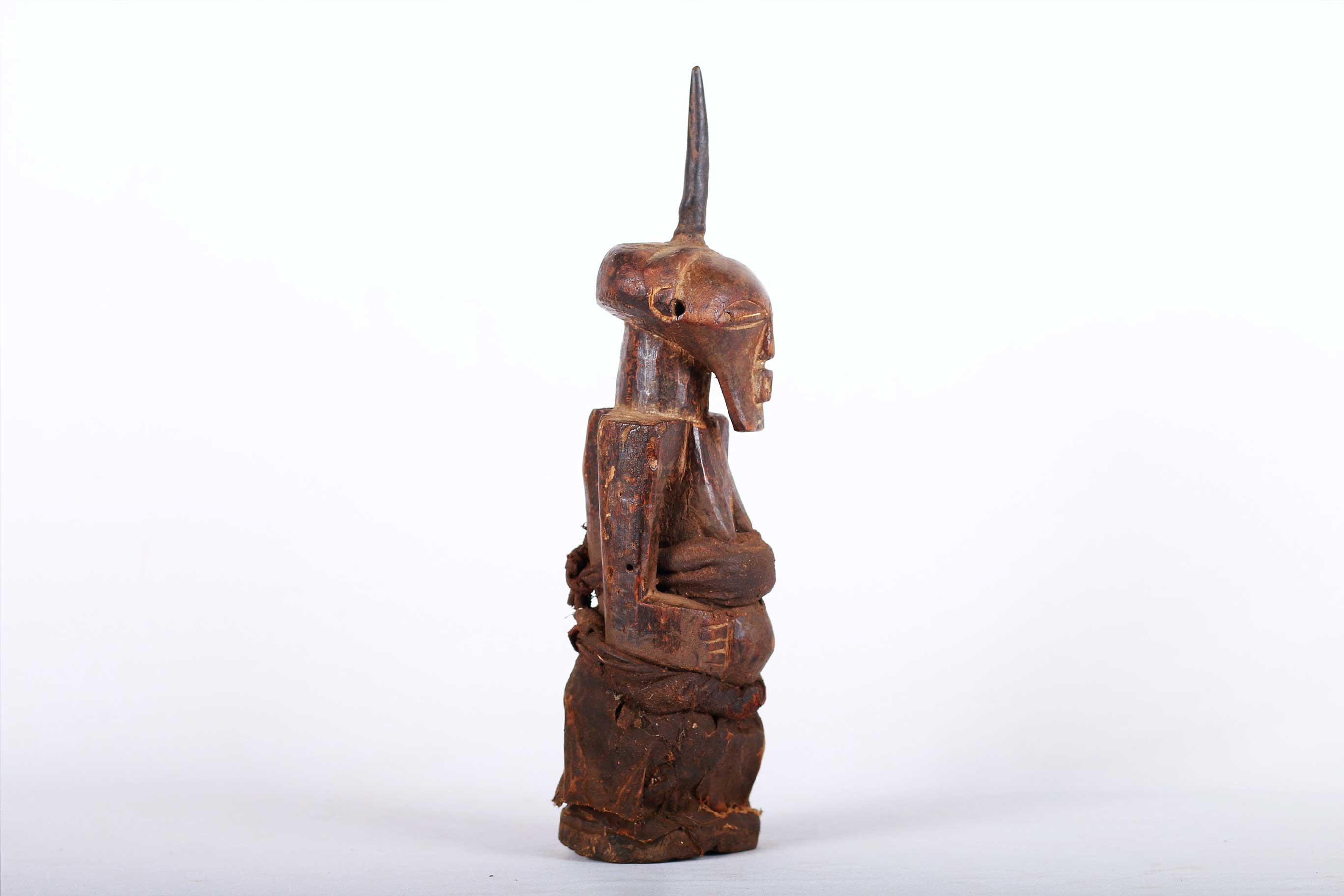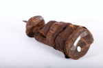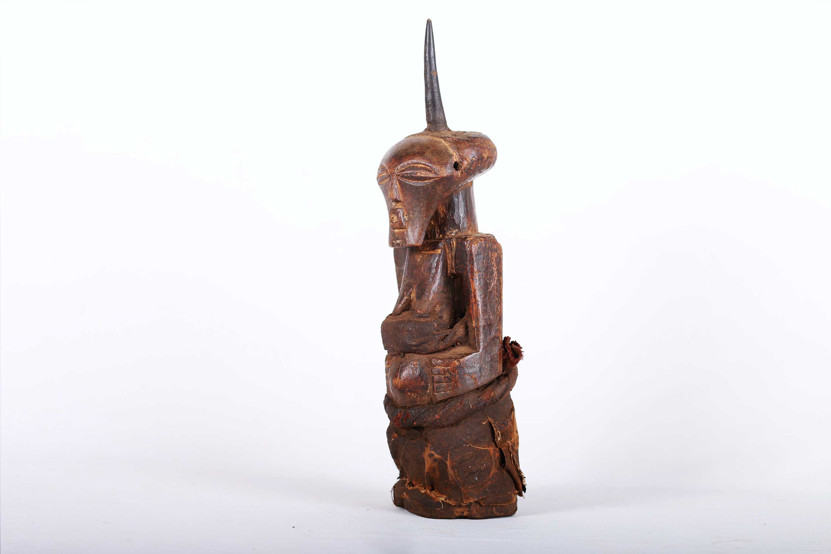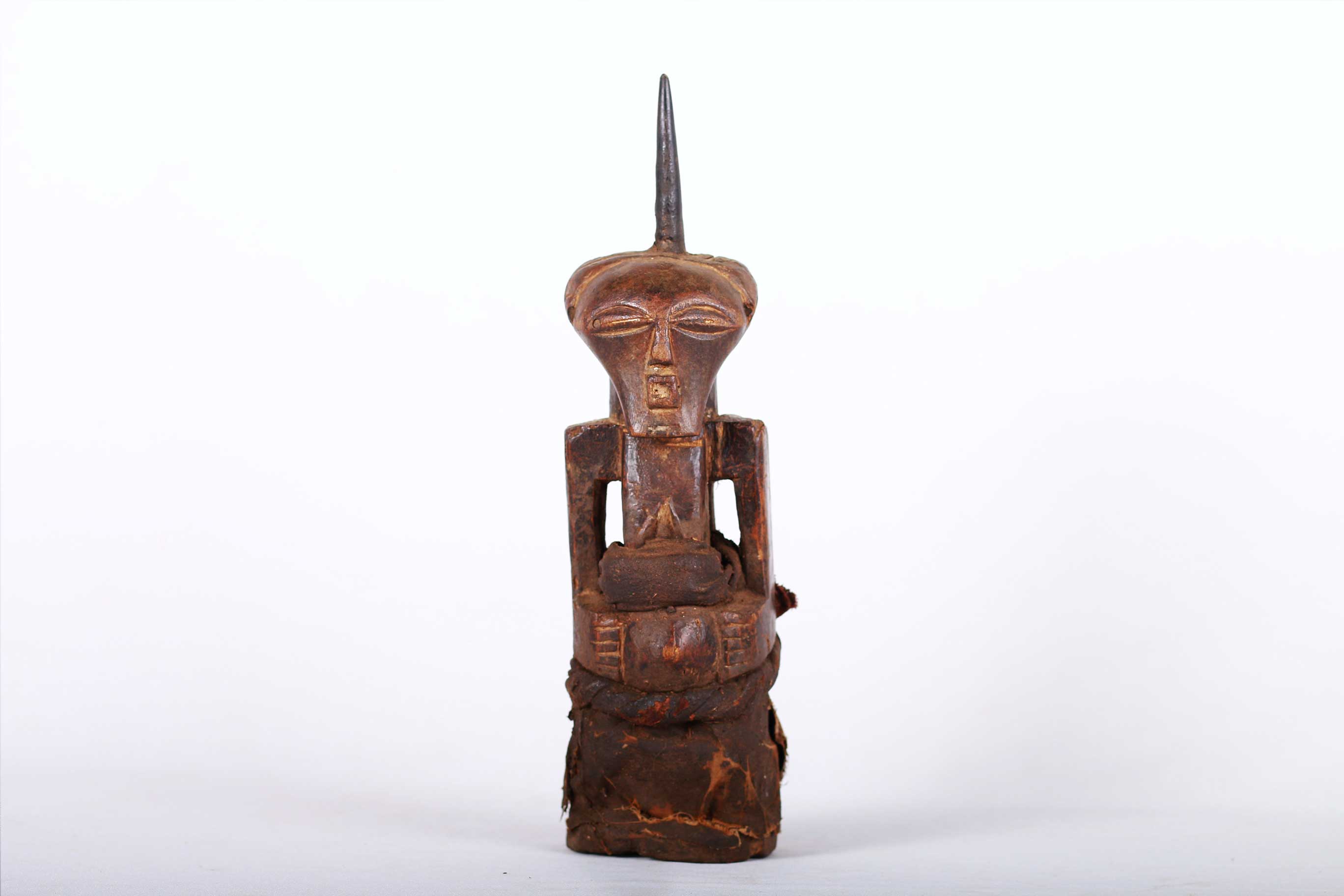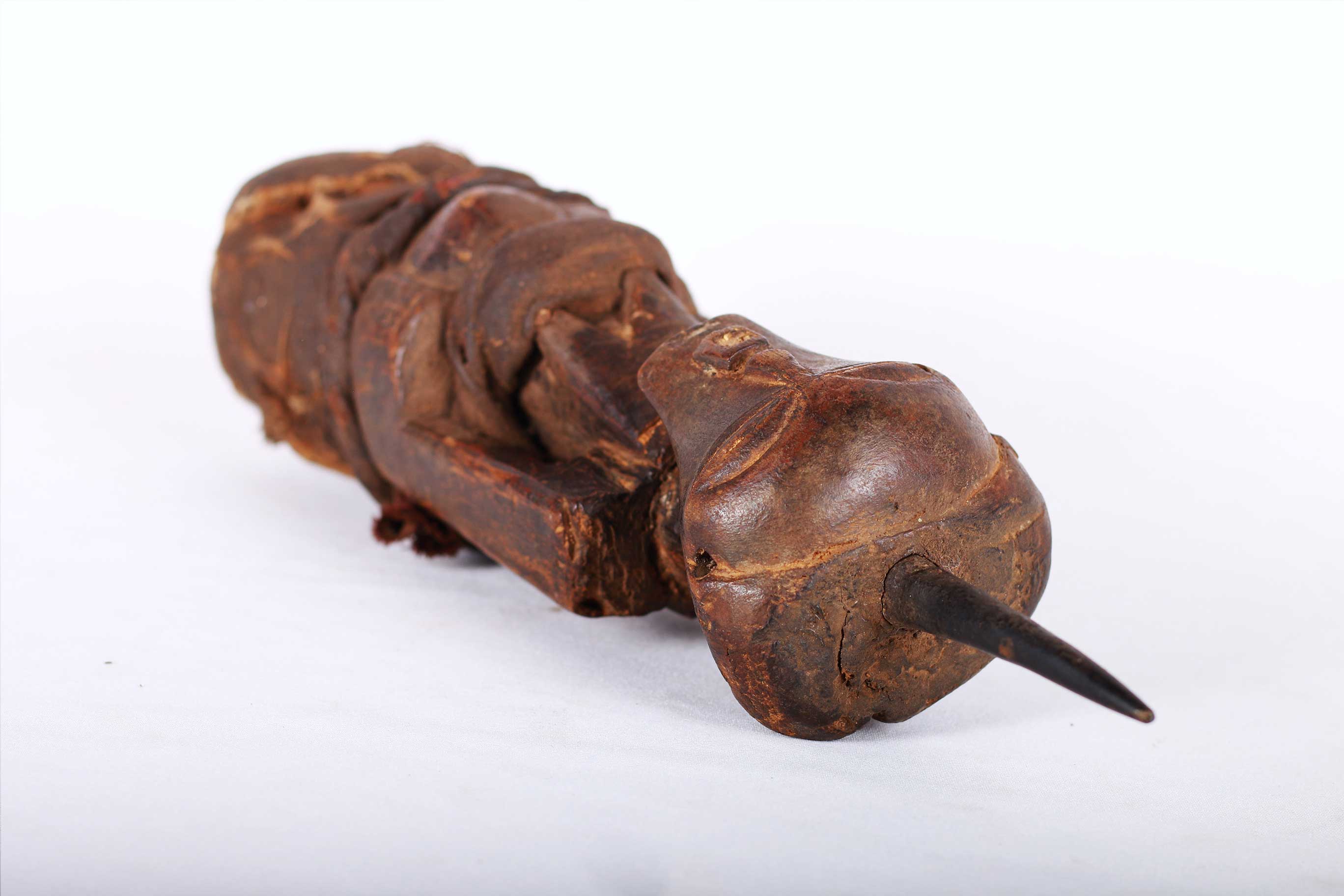 This well-carved miniature Songye power figure has hands on a prominent belly. The Songye live on the left bank of the Lualaba River, an area of savanna crossed by numerous major river systems Magical beliefs and practice are widespread among the Songye people who use figures such as this on family or village altars where they contact the spirits of ancestors, nature spirits and where offerings and prayers are given. Songye fetish figures, often have different materials attached to them including animal skins, nails, strips of metal, magical substances or whatever the owner specialist considers important to give the figure power to act.