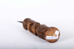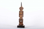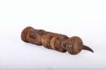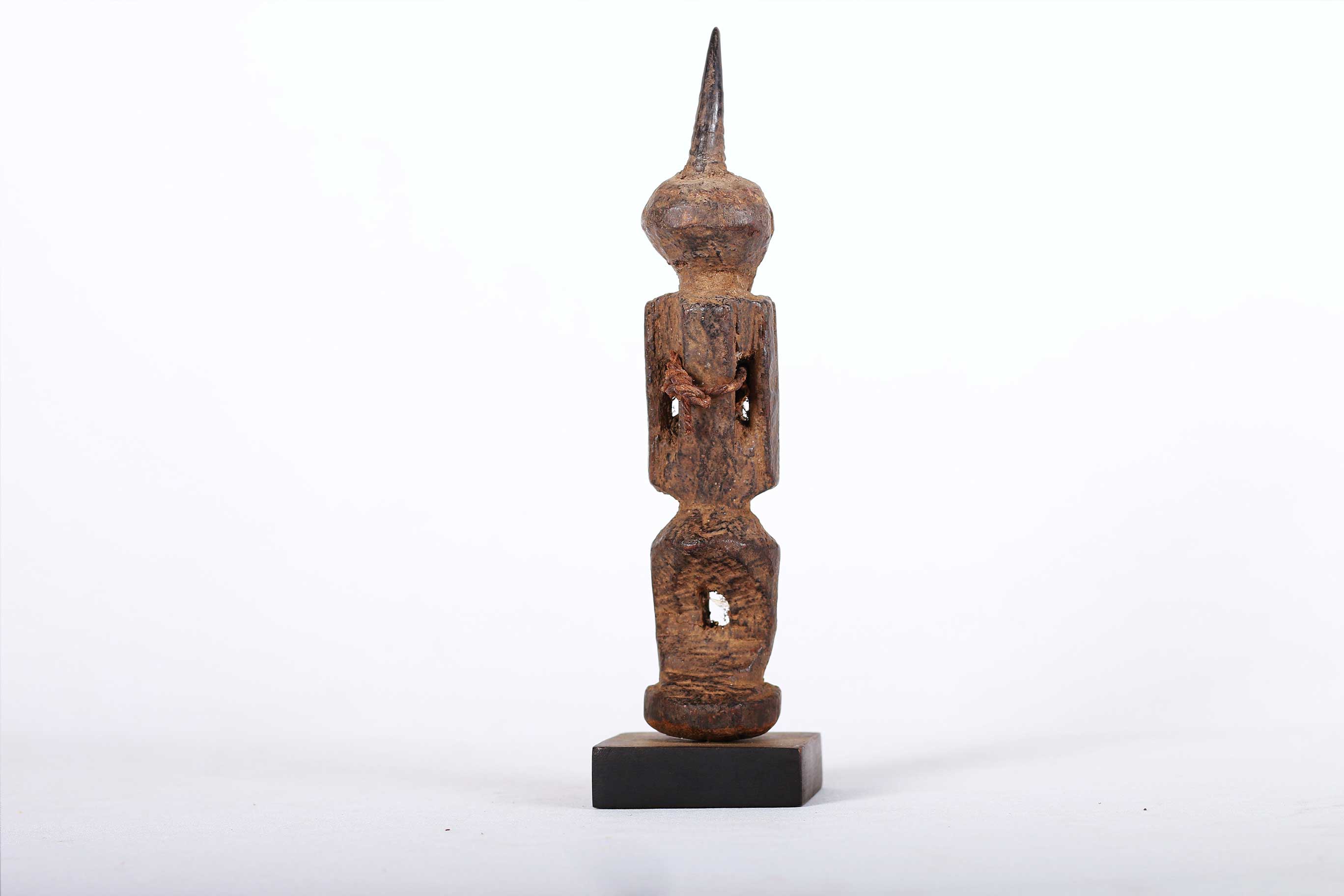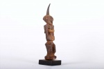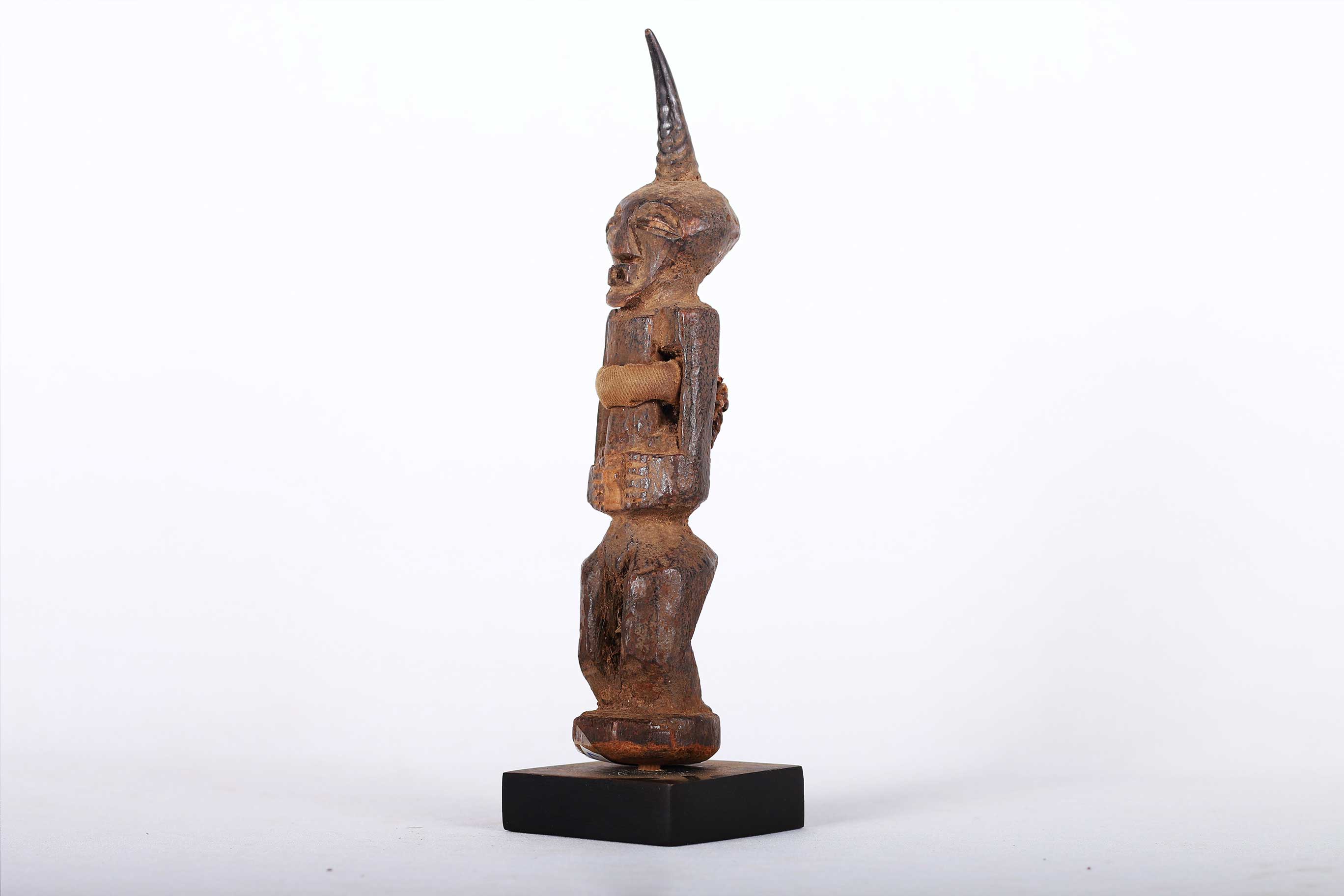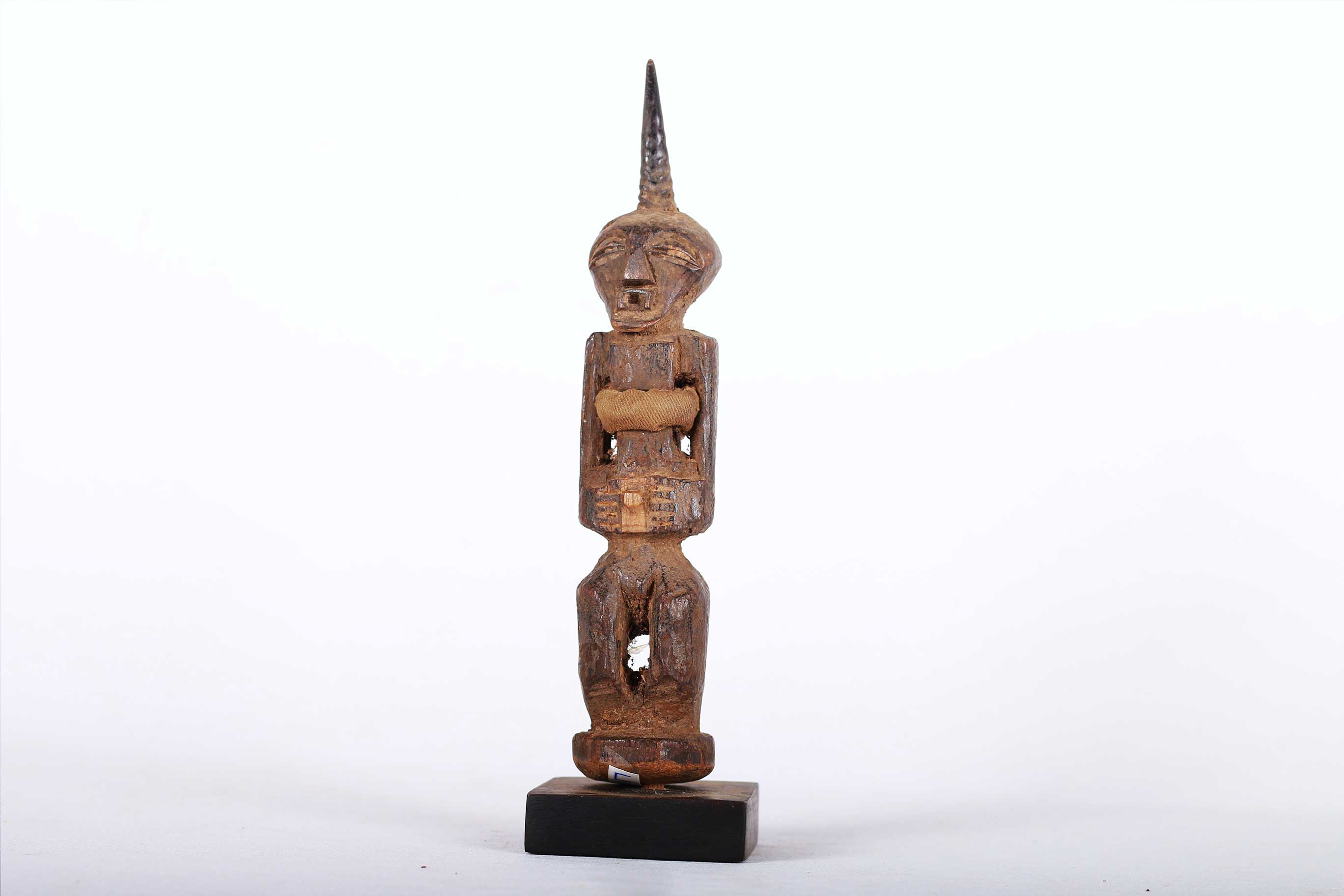 This well-carved miniature Songye power figure has hands on a prominent belly. Magical beliefs and practice are widespread among the Songye people who use figures such as this on family or village altars where they contact the spirits of ancestors, nature spirits and where offerings and prayers are given. Songye fetish figures, often have different materials attached to them including animal skins, nails, strips of metal, magical substances or whatever the owner specialist considers important to give the figure power to act. The following statue has a brown patina and looks visibly old.