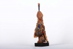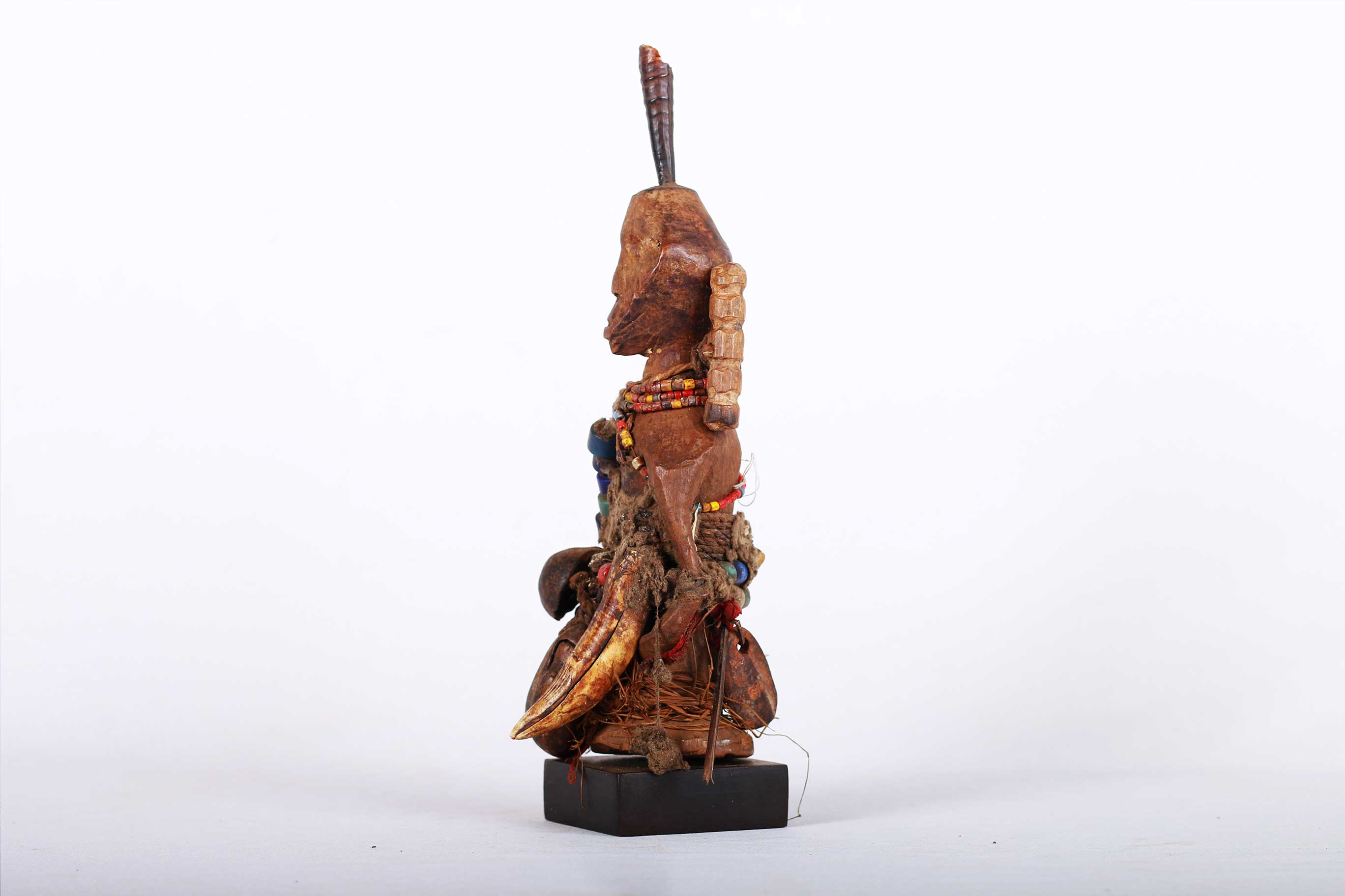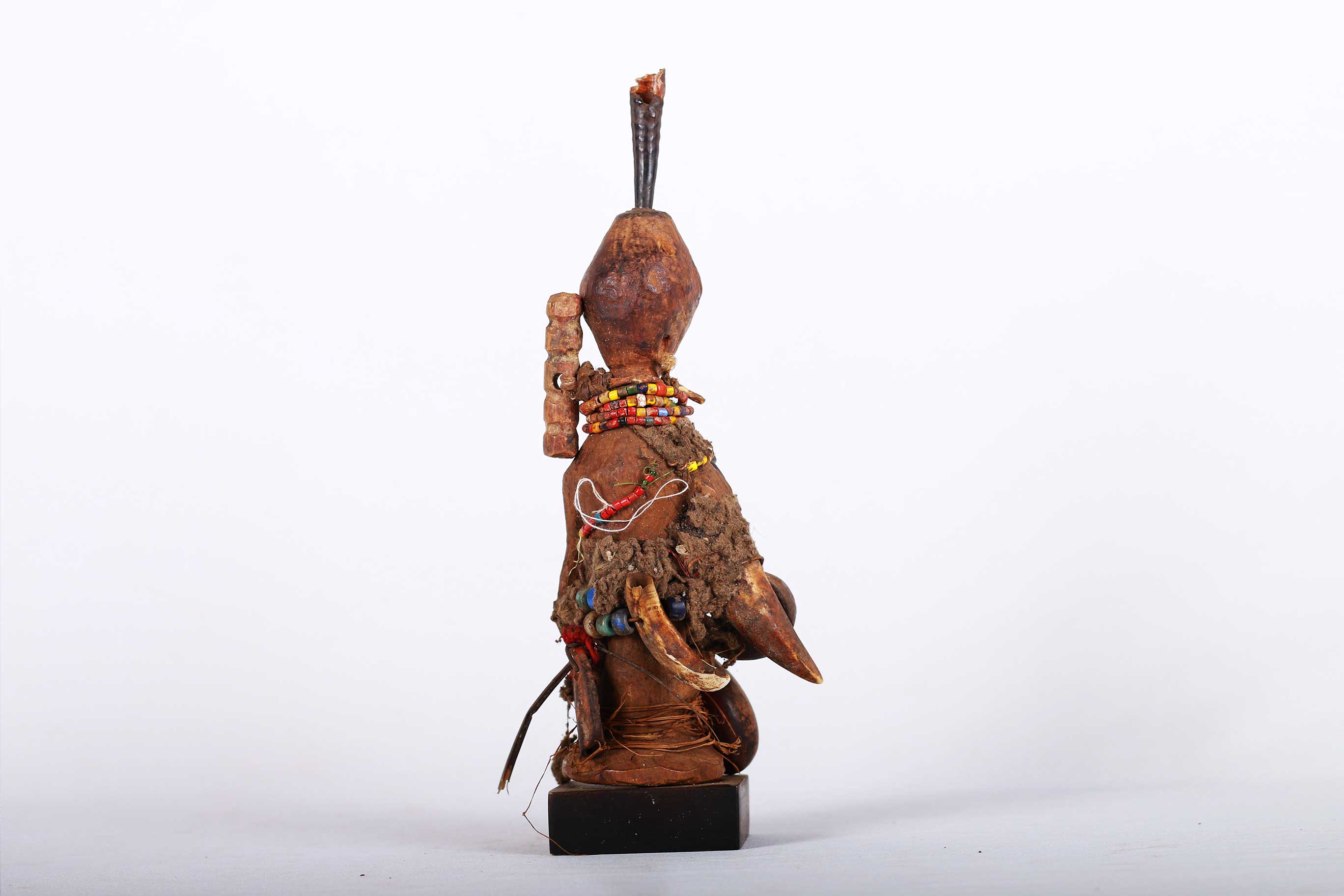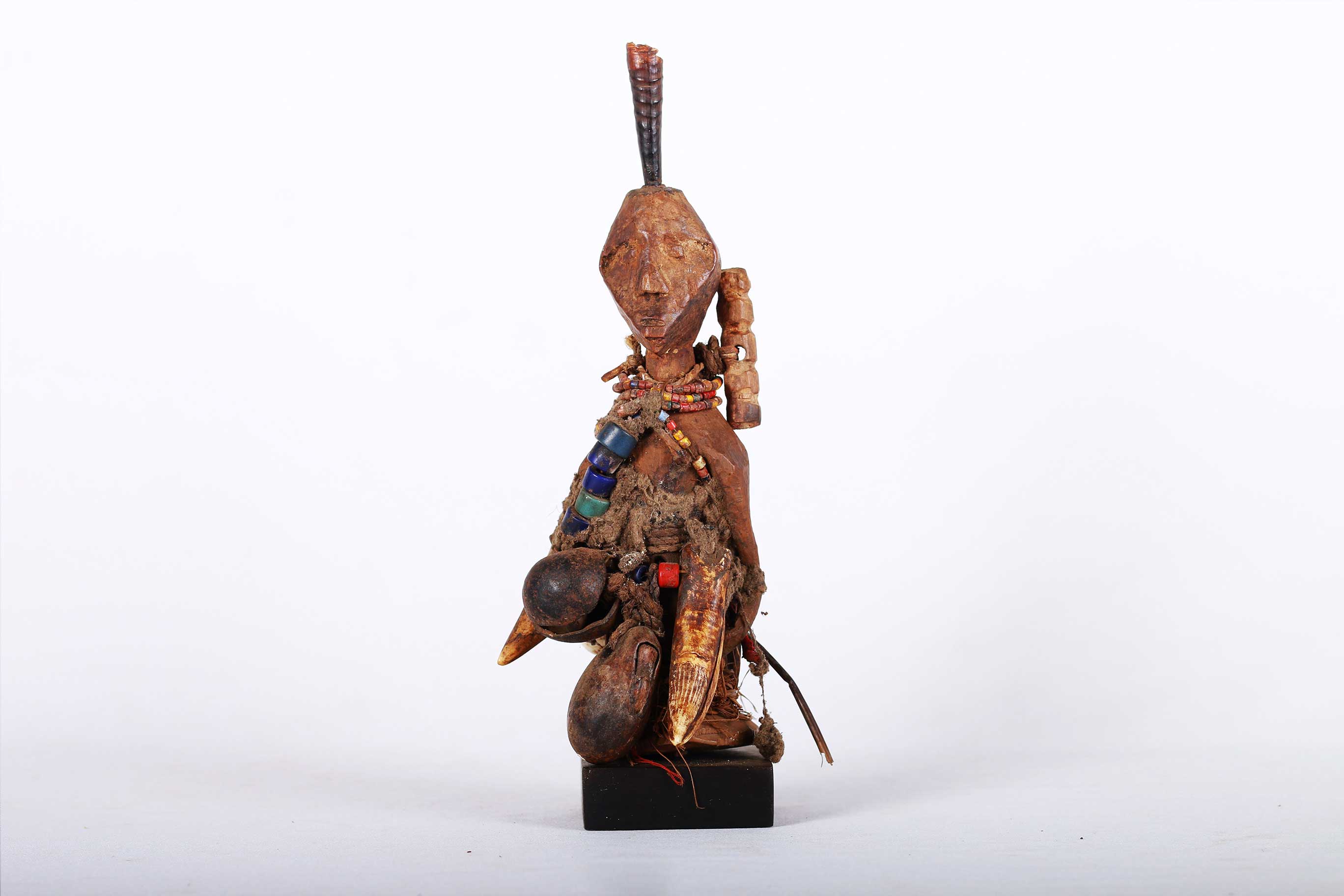 This well-carved miniature Songye power figure has hands on a prominent belly. Magical beliefs and practice are widespread among the Songye people who use figures such as this on family or village altars where they contact the spirits of ancestors, nature spirits and where offerings and prayers are given. Songye fetish figures, often have different materials attached to them including animal skins, nails, strips of metal, magical substances or whatever the owner specialist considers important to give the figure power to act.The following statue has a brown patina and looks visibly old.