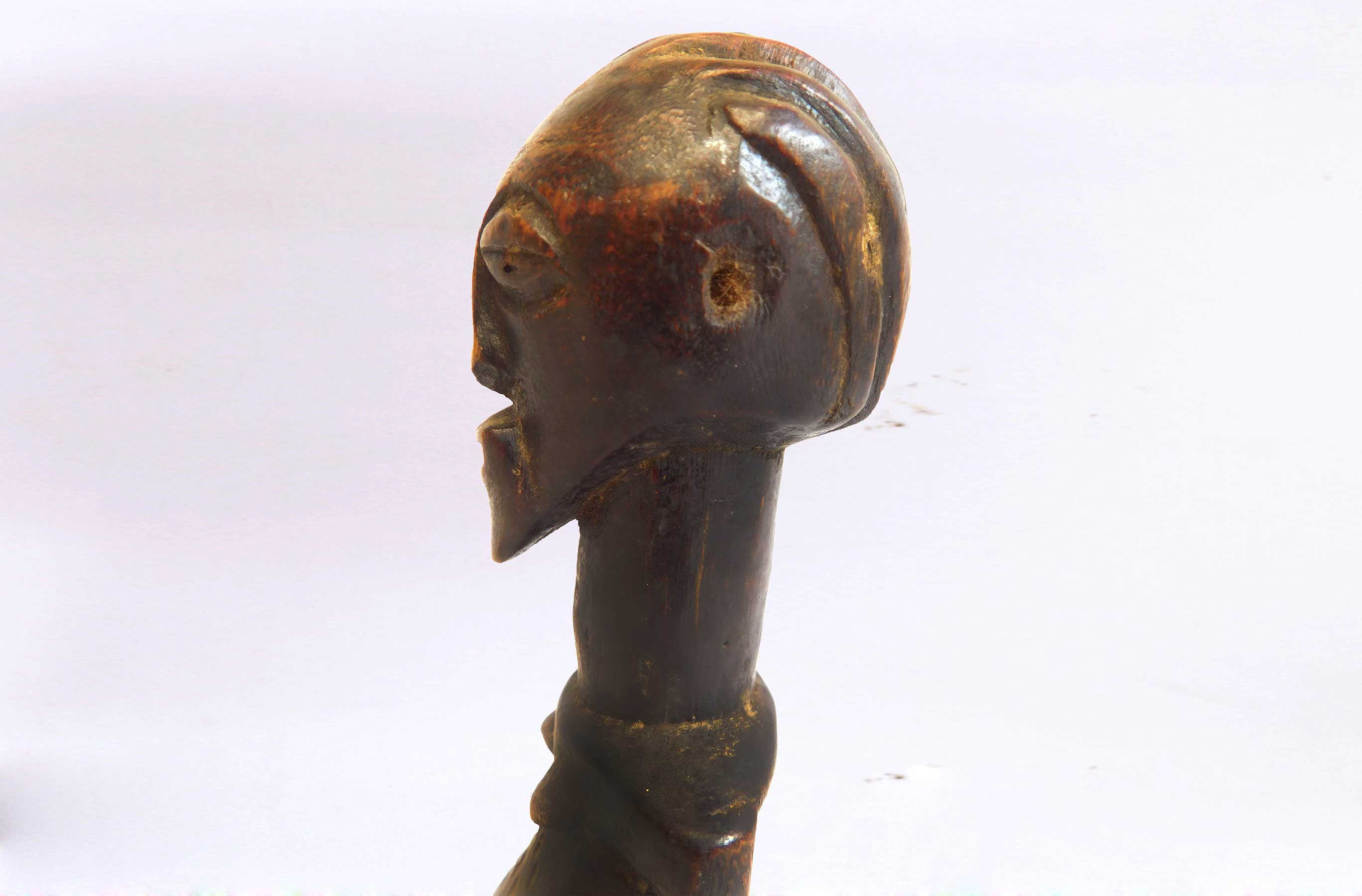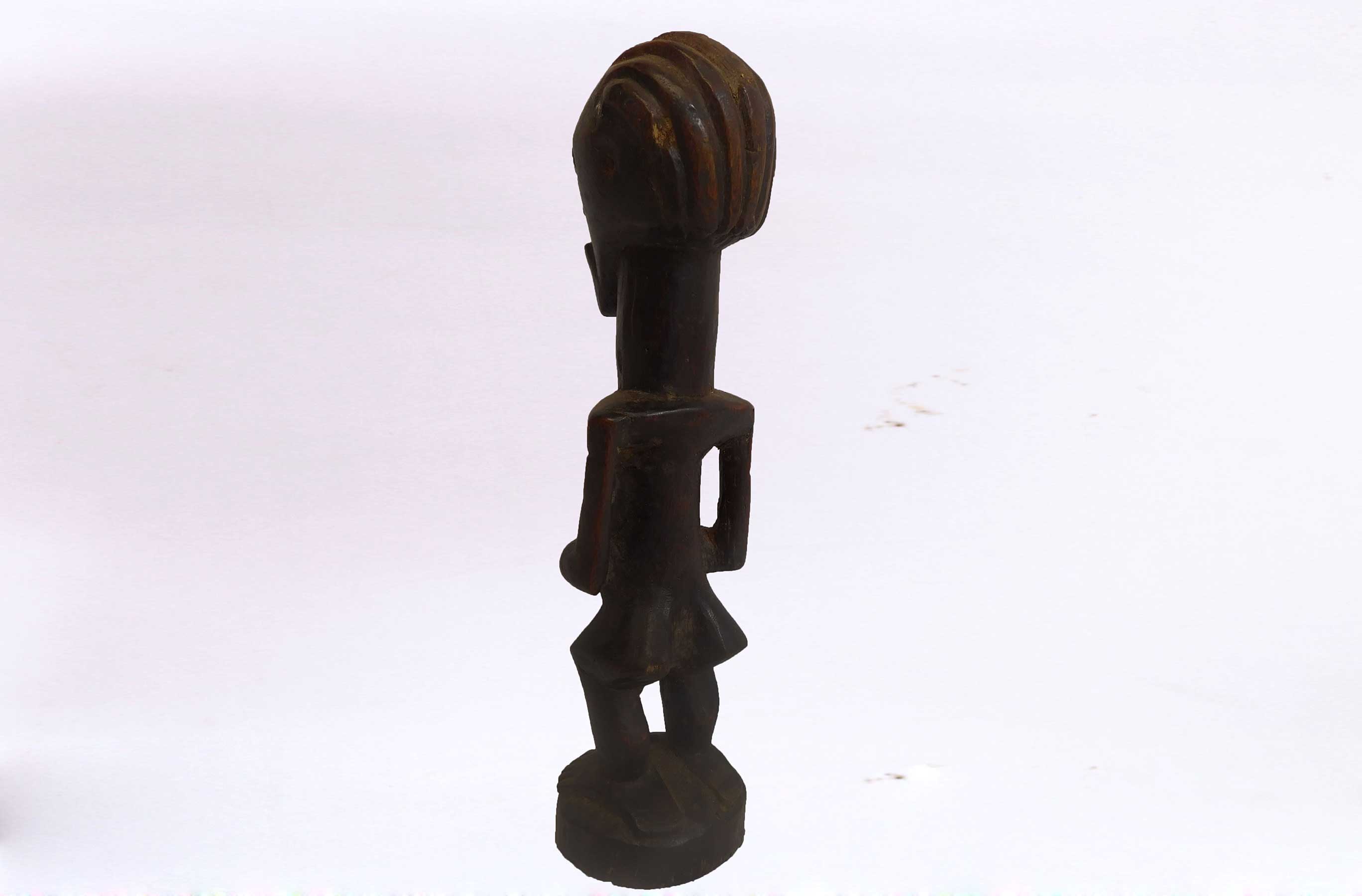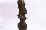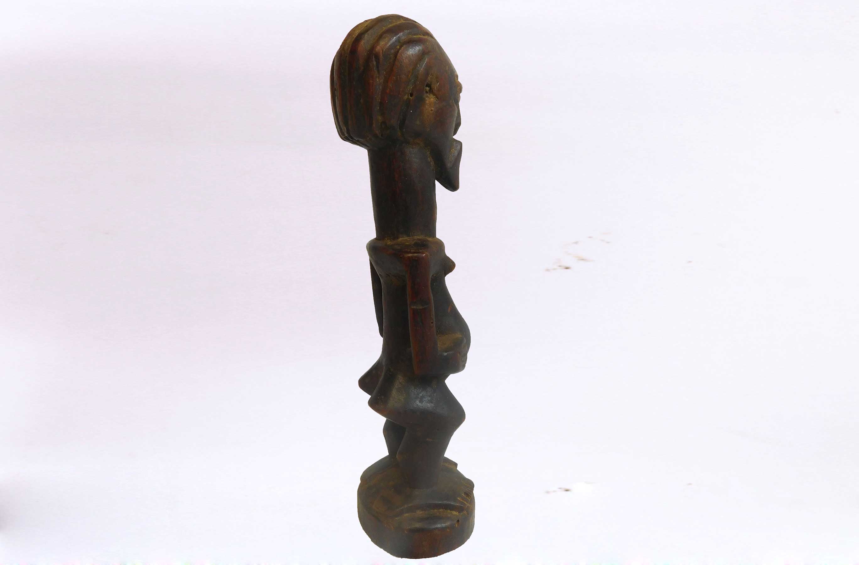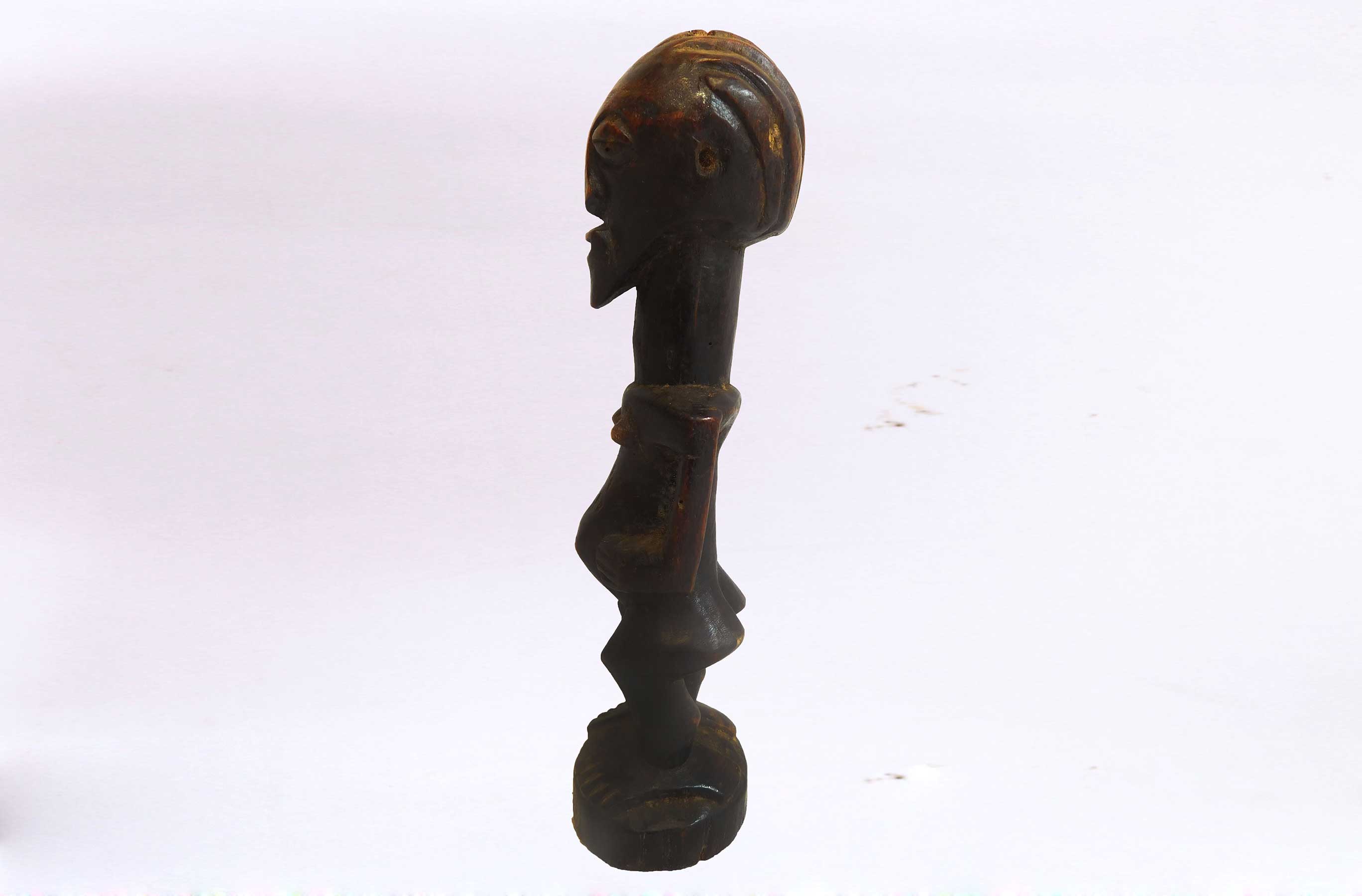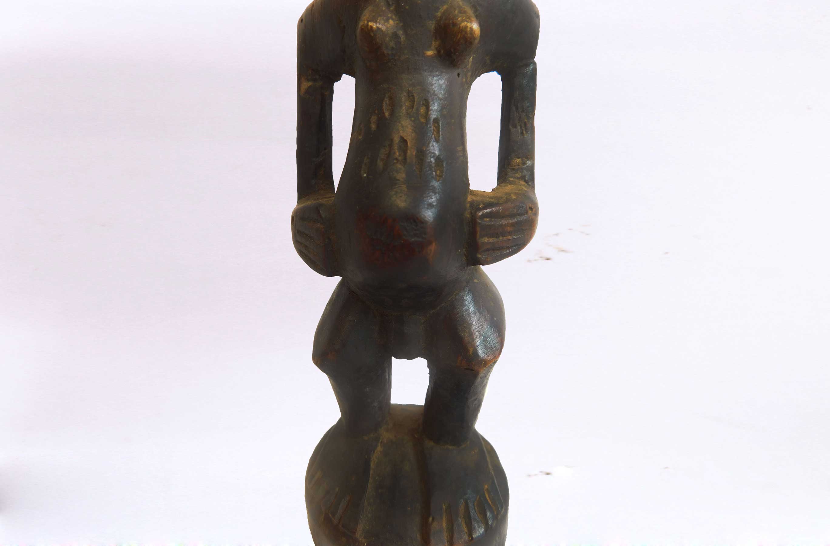 This well-carved miniature Songye power figure has hands on a prominent belly. Magical beliefs and practice are widespread among the Songye people who use figures such as this on family or village altars where they contact the spirits of ancestors, nature spirits and where offerings and prayers are given. Songye fetish figures, often have different materials attached to them including animal skins, nails, strips of metal, magical substances or whatever the owner specialist considers important to give the figure power to act. The following statue has a brown patina and looks visibly old.