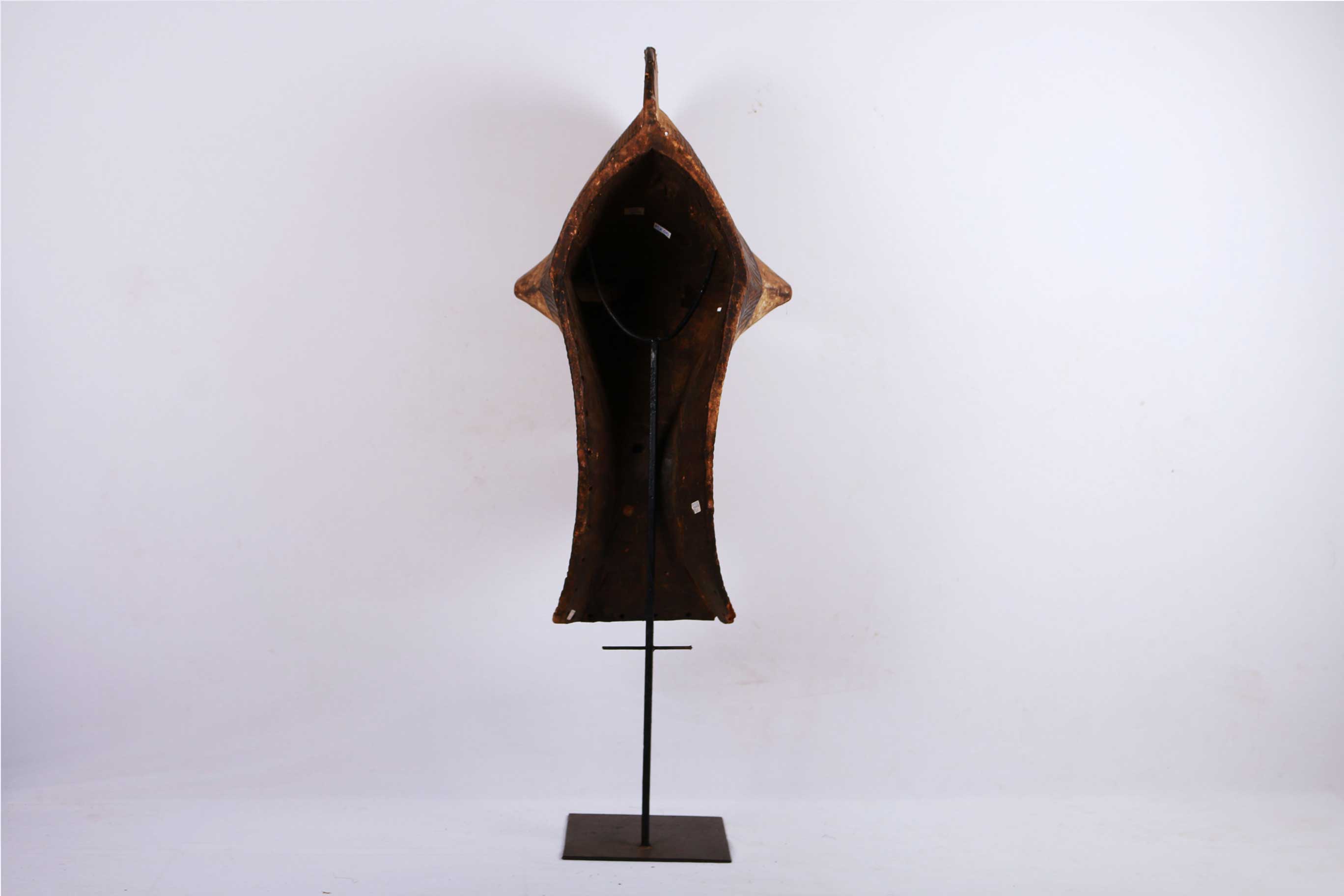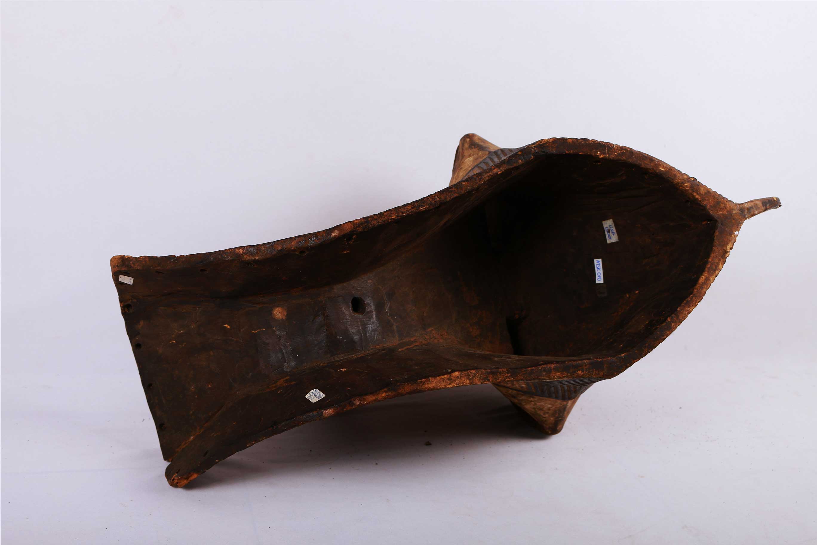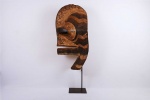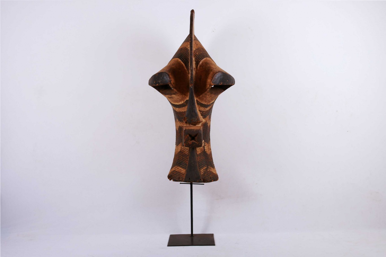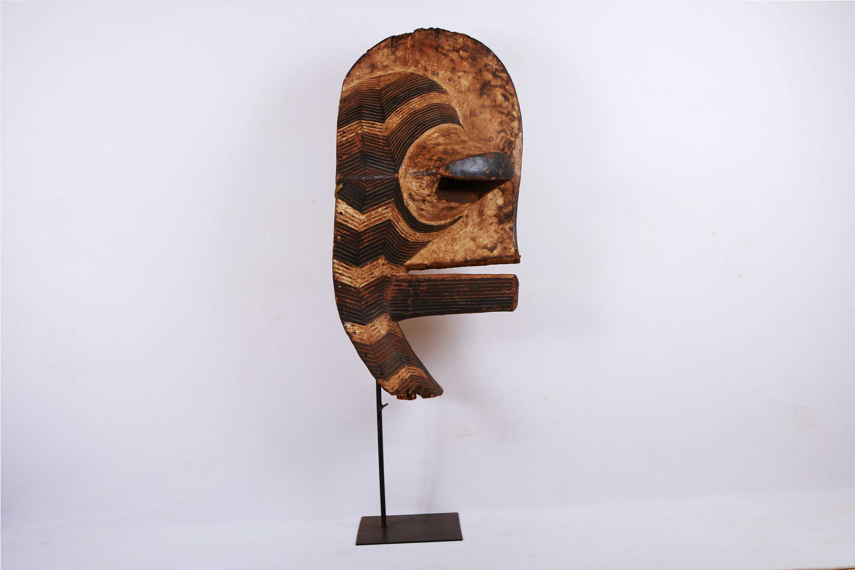 Kifwebe masks are masks believed to represent spirits, Depending on the region, it may be dark with white strips, or the reverse. The kifwebe masks embodied supernatural forces. The kifwebe society used them to ward off disaster or any threat. The masks, supplemented by a woven costume and a long beard of raffia bast, dance at various ceremonies. They are worn by men who act as police at the behest of a ruler or to intimidate the enemy. It can be either masculine if carved with a central crest, or feminine if displaying a plain coiffure. The size of the crest determines the magic power of the mask. Mask, colours, and costume all have symbolic meaning. The dancer who wears the male mask will display aggressive and uncontrolled behaviour with the aim of encouraging social conformity, whereas the dancer who wears the female mask display more gentle and controlled movements and is assumed to be associated with reproduction ceremonies. The use of white on the mask symbolizes positive concepts such as purity and peace, the moon and light. Red is associated with blood and fire, courage and fortitude, but also with danger and evil. Female masks essentially reflect positive forces and appear principally in dances held at night, such as during lunar ceremonies and at the investiture or death of a ruler. The mask had also the capacity to heal by means of the supernatural force it was supposed to incorporate.