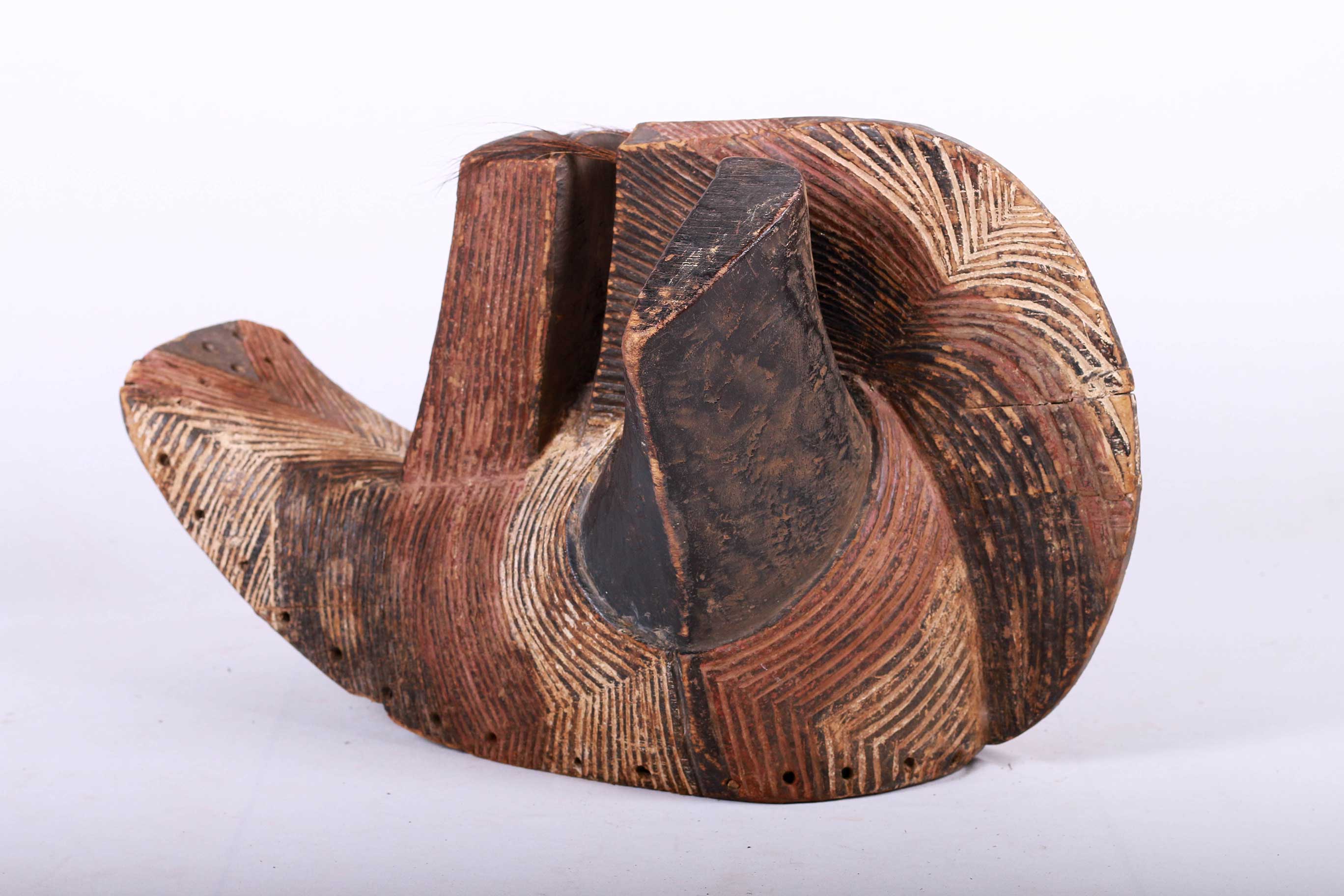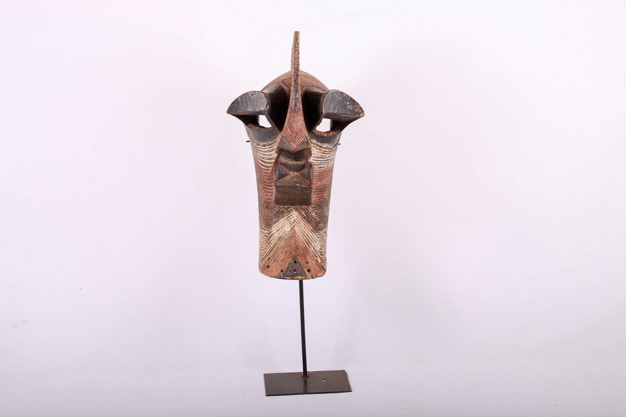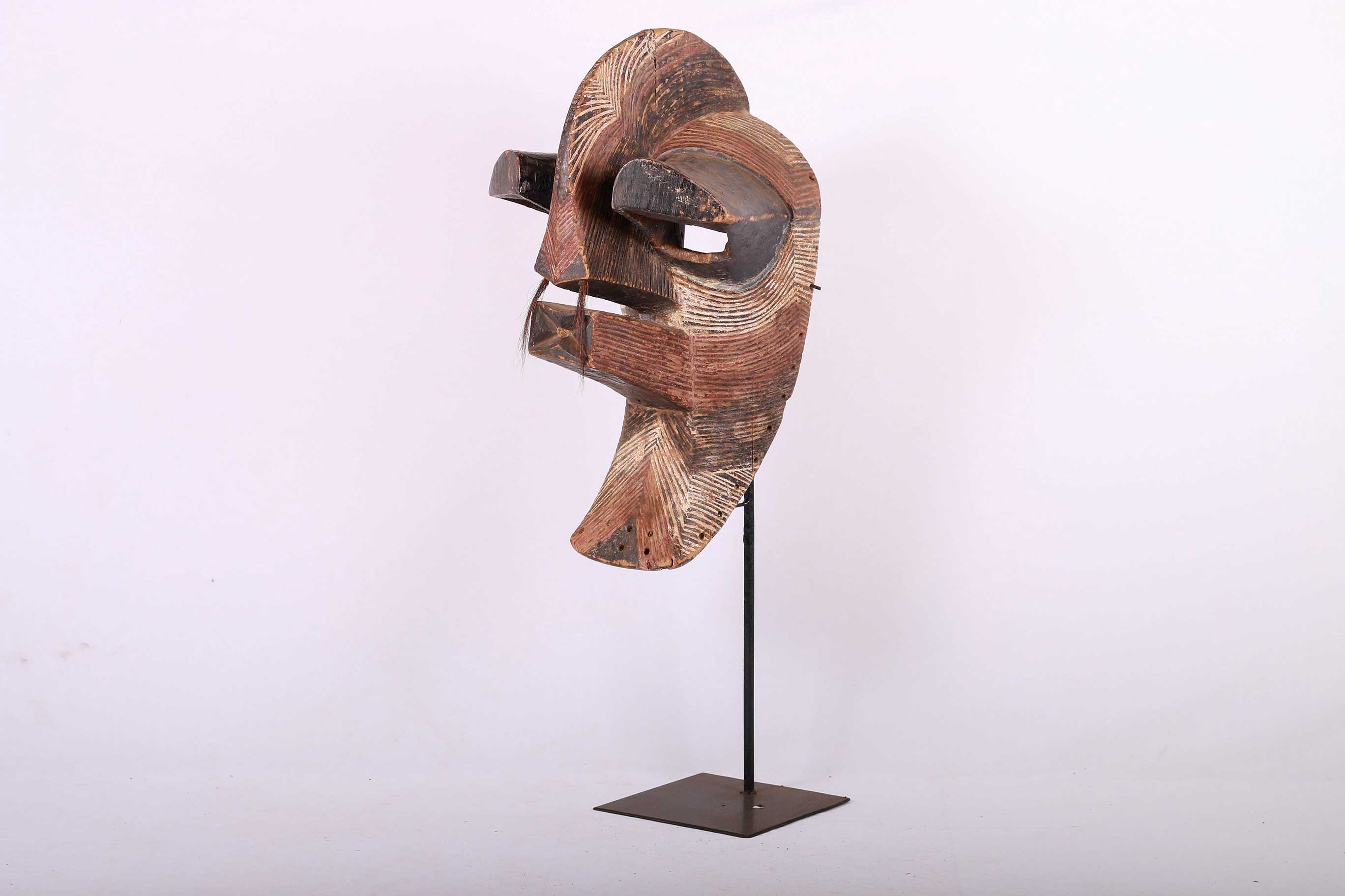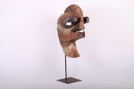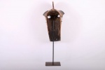 For the most part, Kifwebe masks no longer function to maintain social control among the Songye except in the southeastern regions bordering on Luba territory. Female masks, in direct relation to the physical world and procreation, move calmly; their task is to invoke benevolent spirits that will influence the future generation. Female masks are associated with the moon and are worn for moon rituals as well as during funerals and initiation rites. The following mask shows age and good usage.