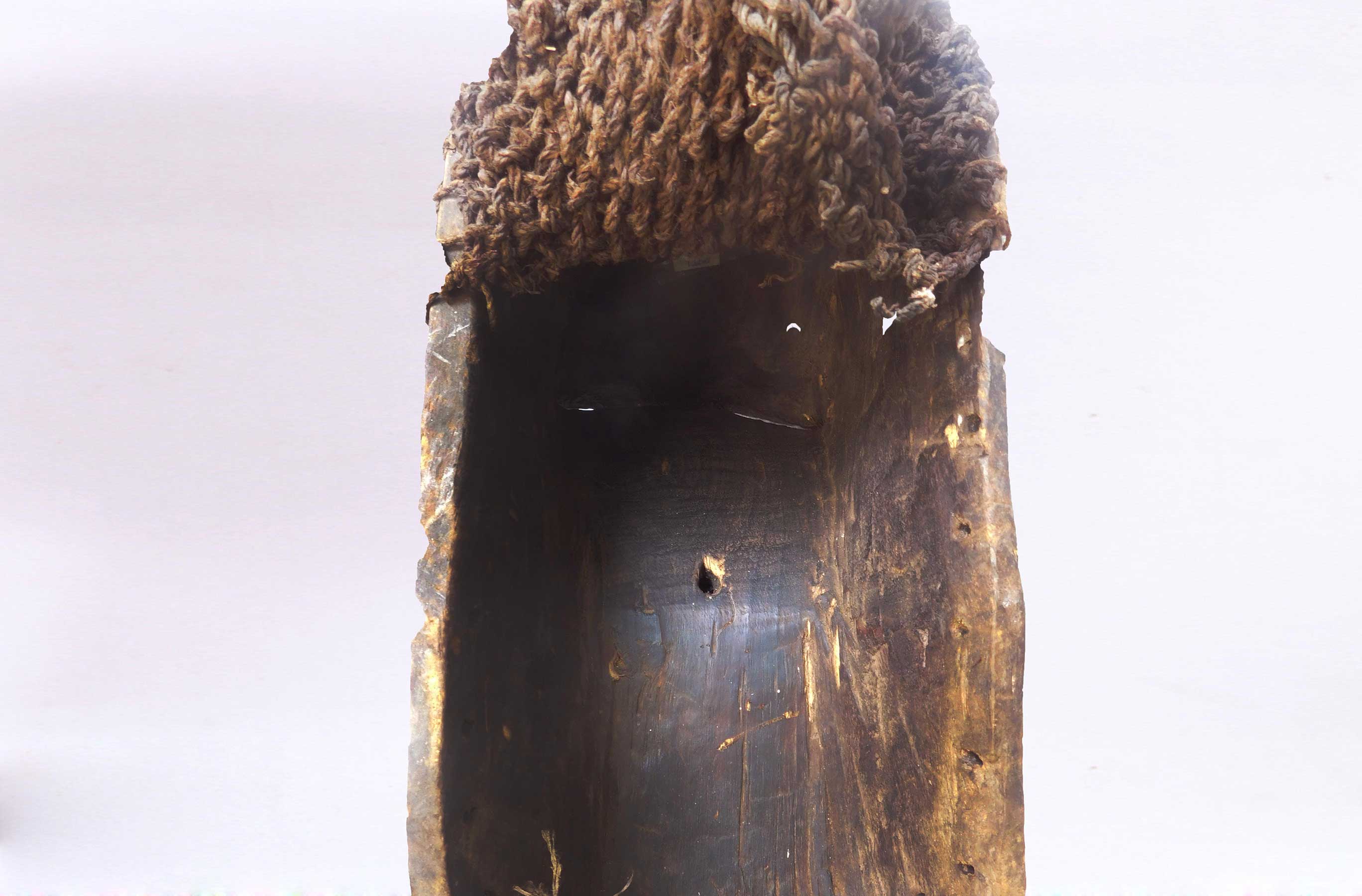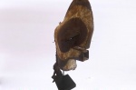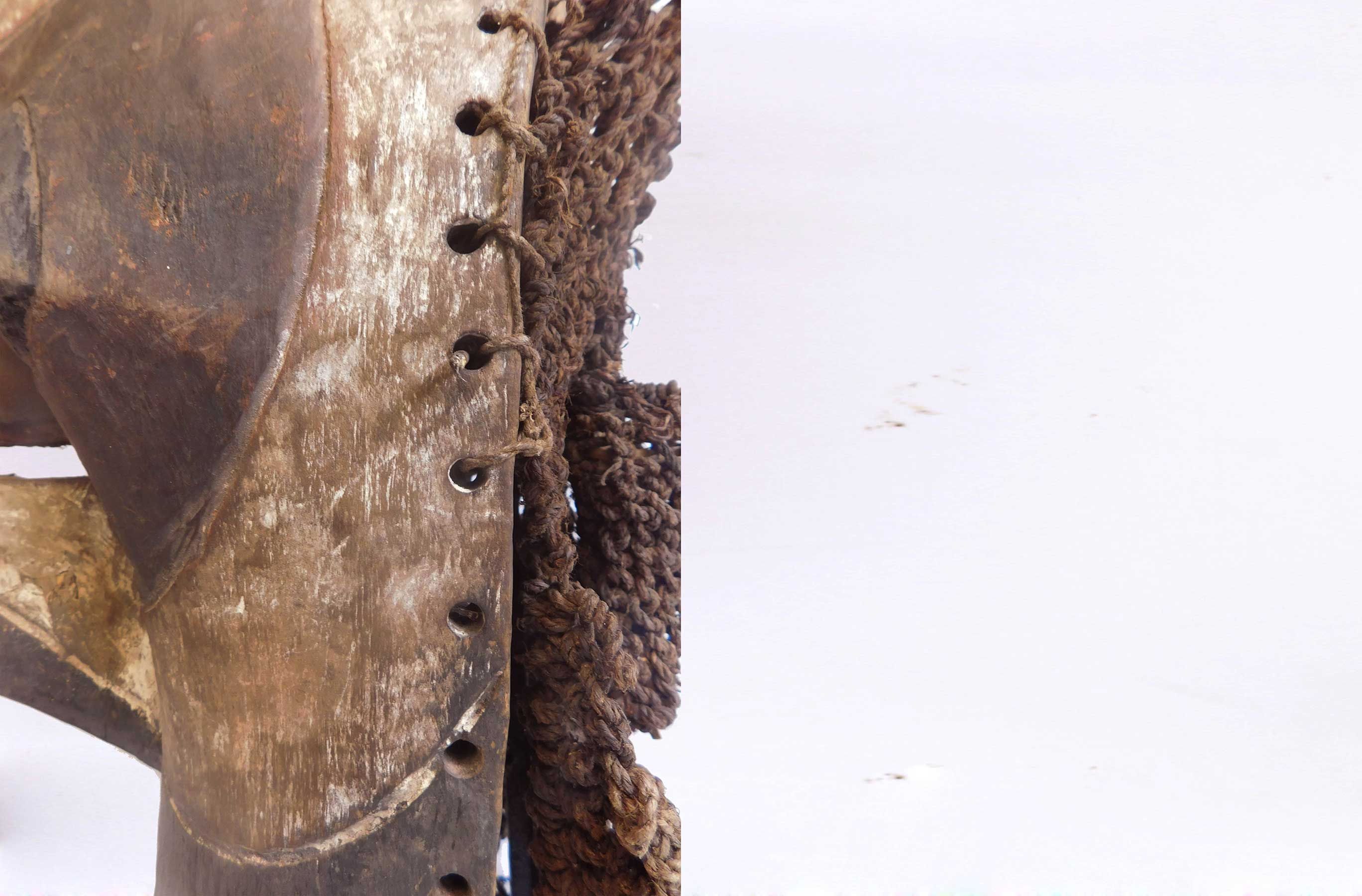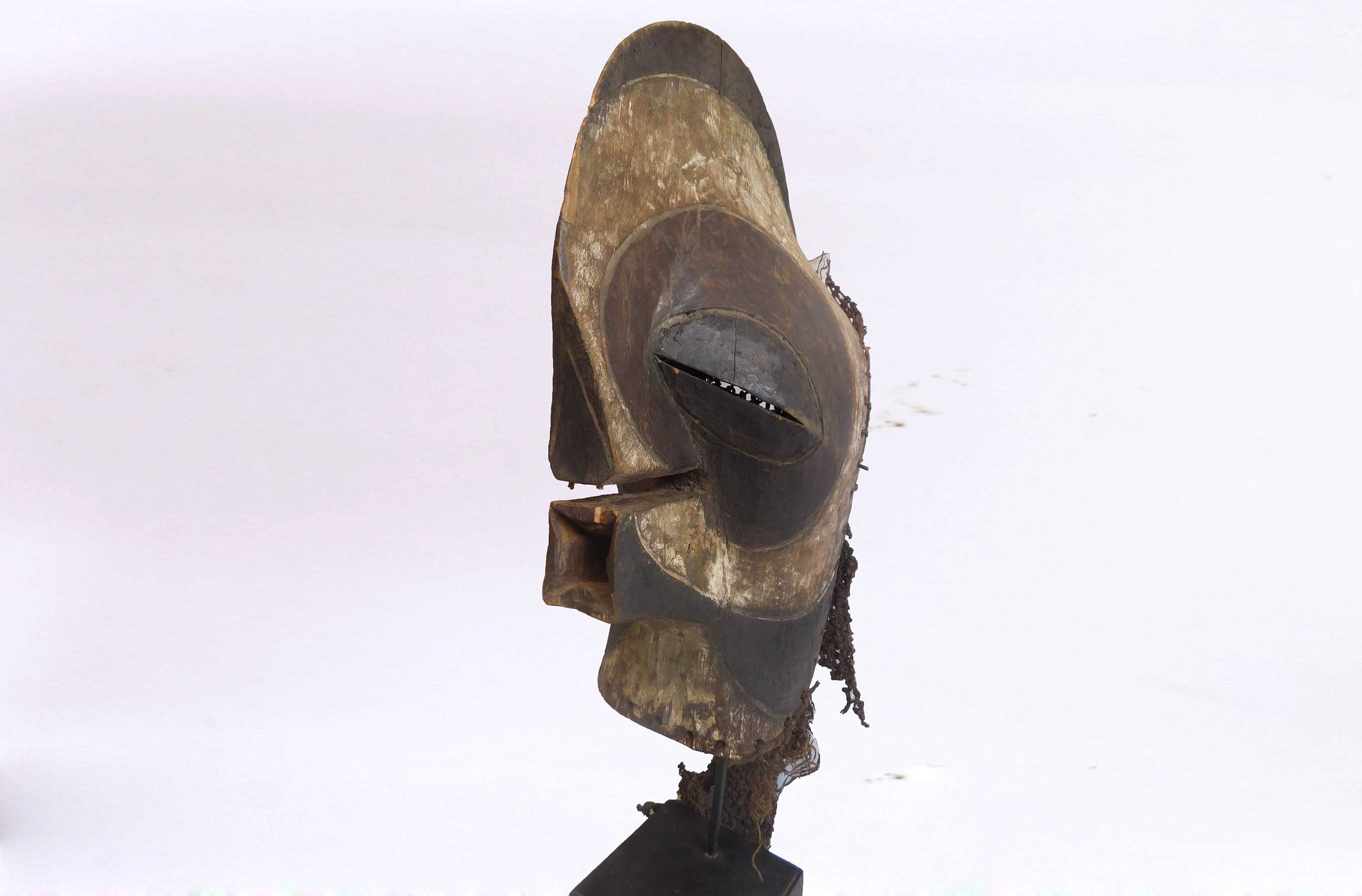 Kifwebe masks are masks believed to represent spirits, Depending on the region, it may be dark with white strips, or the reverse. The kifwebe masks embodied supernatural forces. The kifwebe society used them to ward off disaster or any threat. The masks, supplemented by a woven costume and a long beard of raffia bast, dance at various ceremonies. They are worn by men who act as police at the behest of a ruler or to intimidate the enemy. It can be either masculine if carved with a central crest, or feminine if displaying a plain coiffure. The size of the crest determines the magic power of the mask. Mask, colors, and costumes all have symbolic meanings. The dancer who wears the male mask will display aggressive and uncontrolled behavior with the aim of encouraging social conformity, whereas the dancer who wears the female mask displays more gentle and controlled movements and is assumed to be associated with reproduction ceremonies. The use of white on the mask symbolizes positive concepts such as purity and peace, the moon and light. Red is associated with blood and fire, courage and fortitude, but also with danger and evil. Female masks essentially reflect positive forces and appear principally in dances held at night, such as during lunar ceremonies and at the investiture or death of a ruler. The mask had also the capacity to heal by means of the supernatural force it was supposed to incorporate.