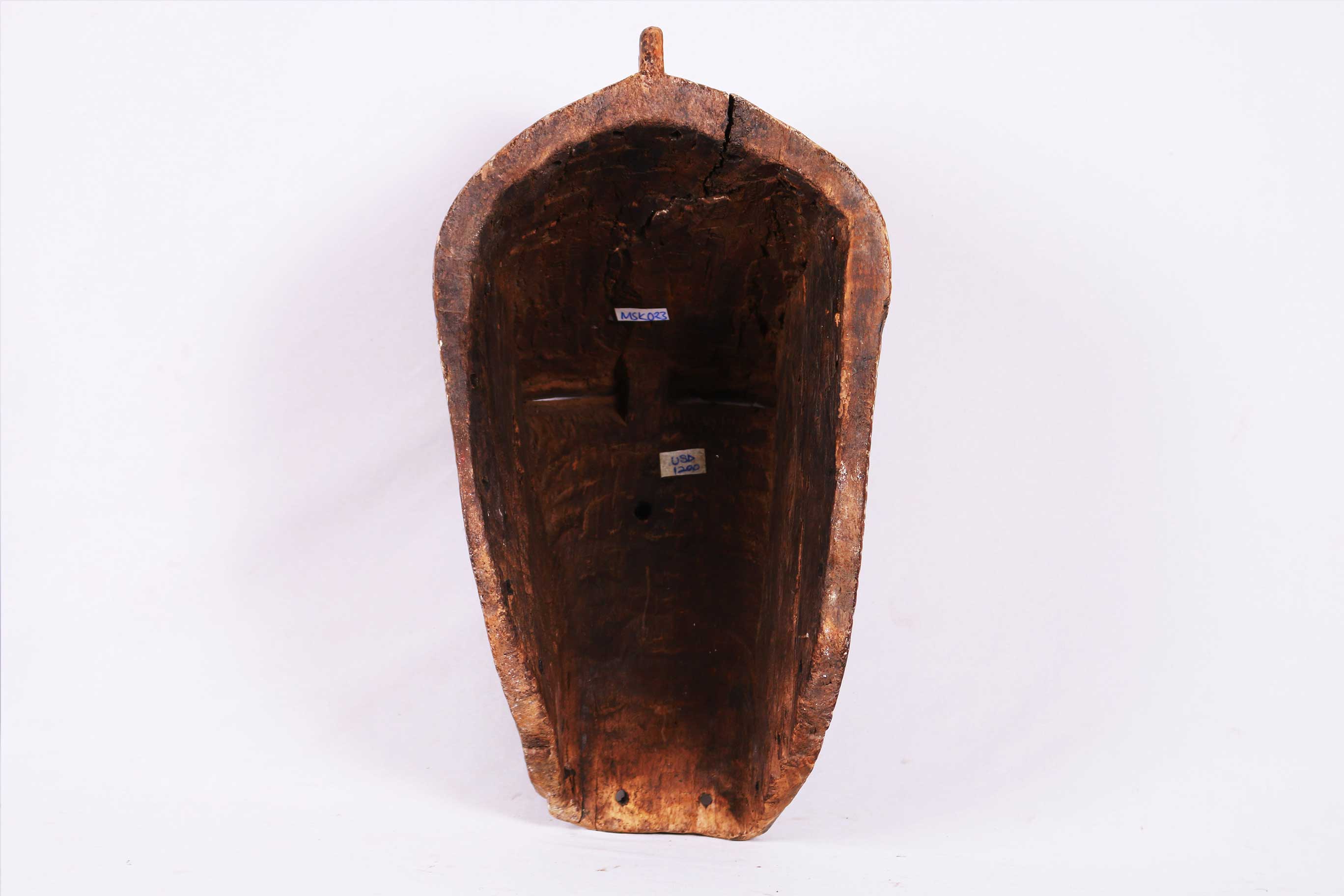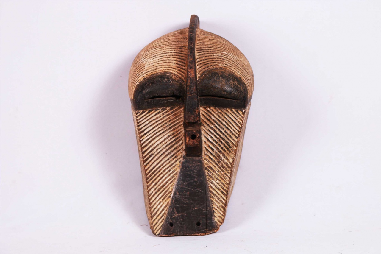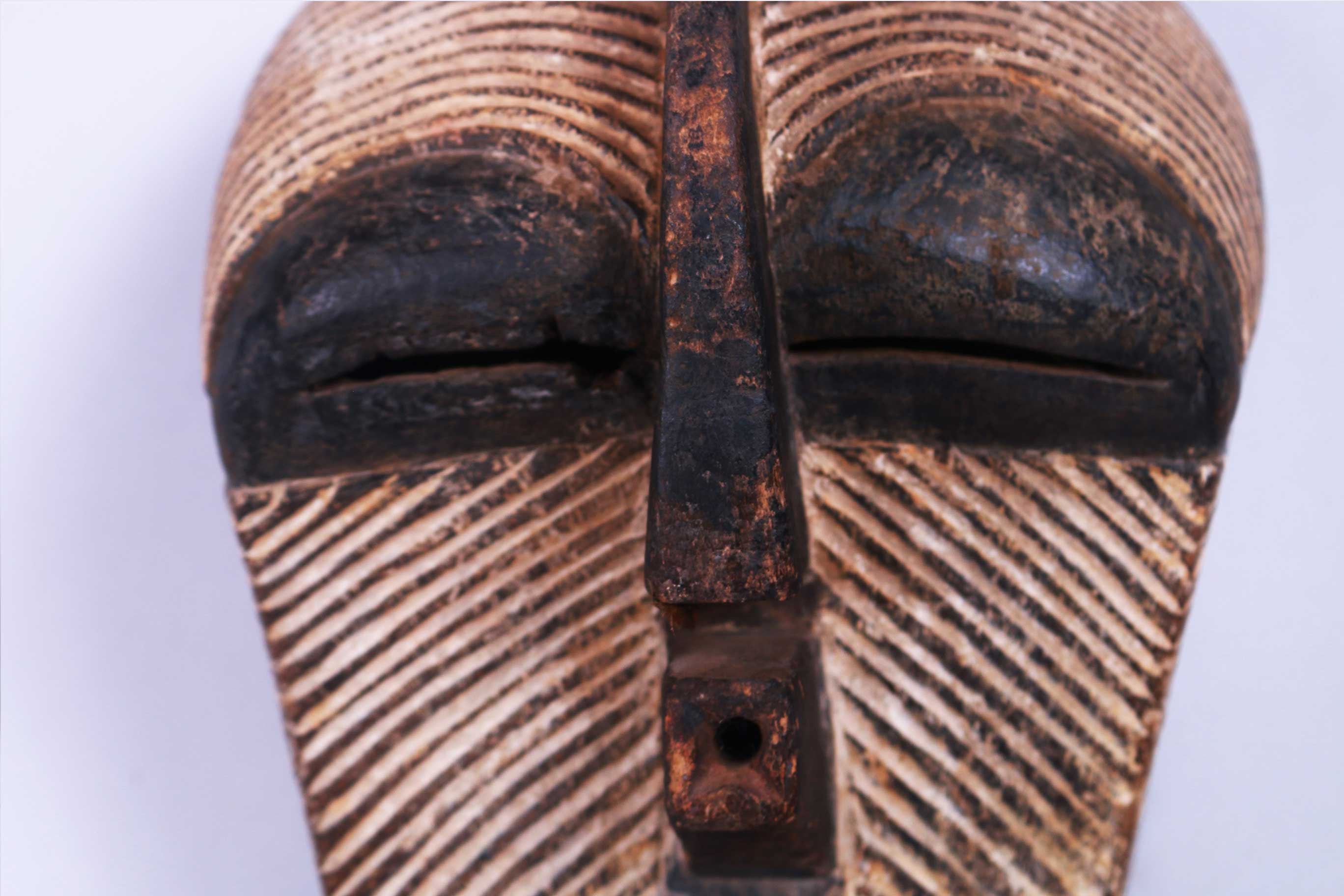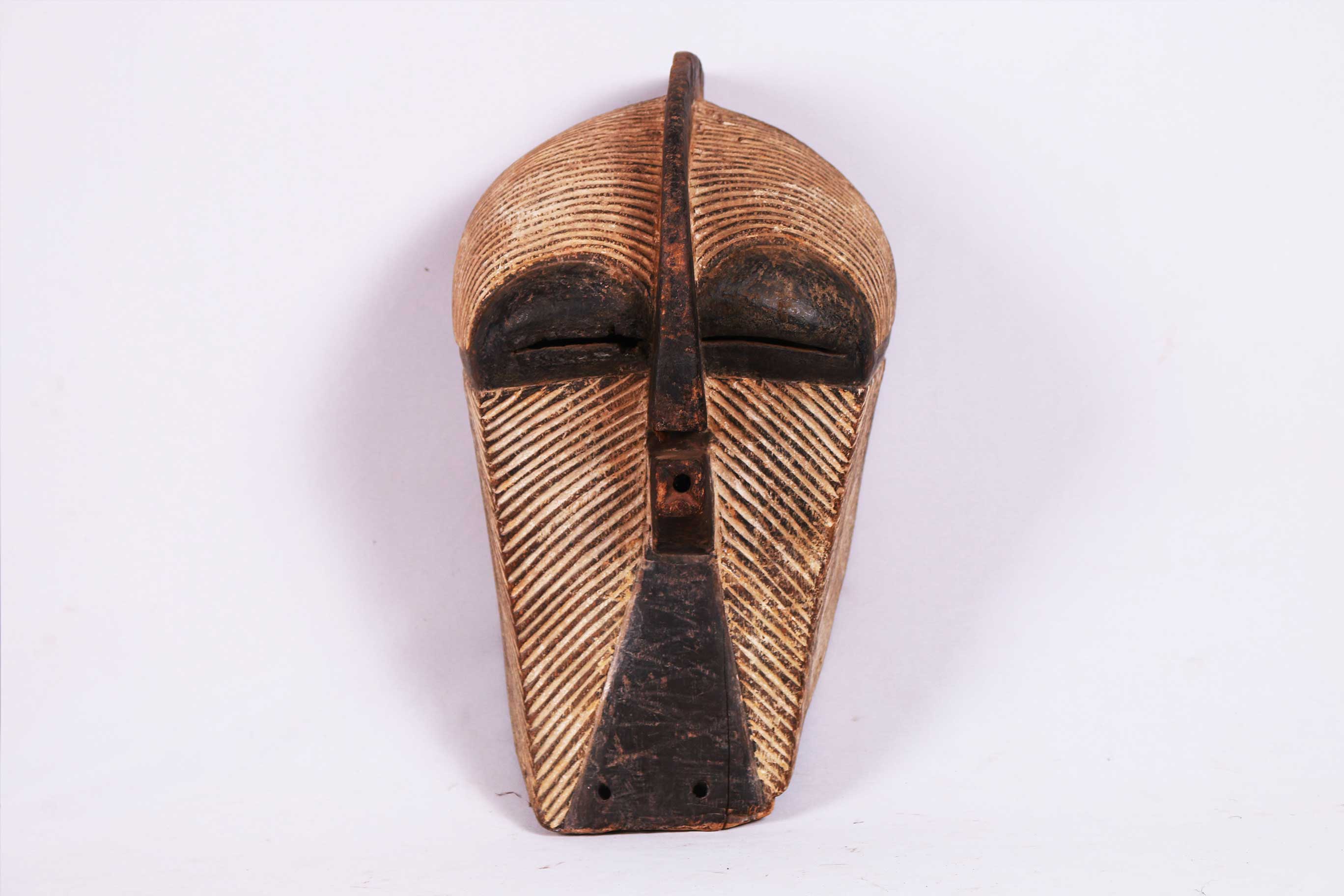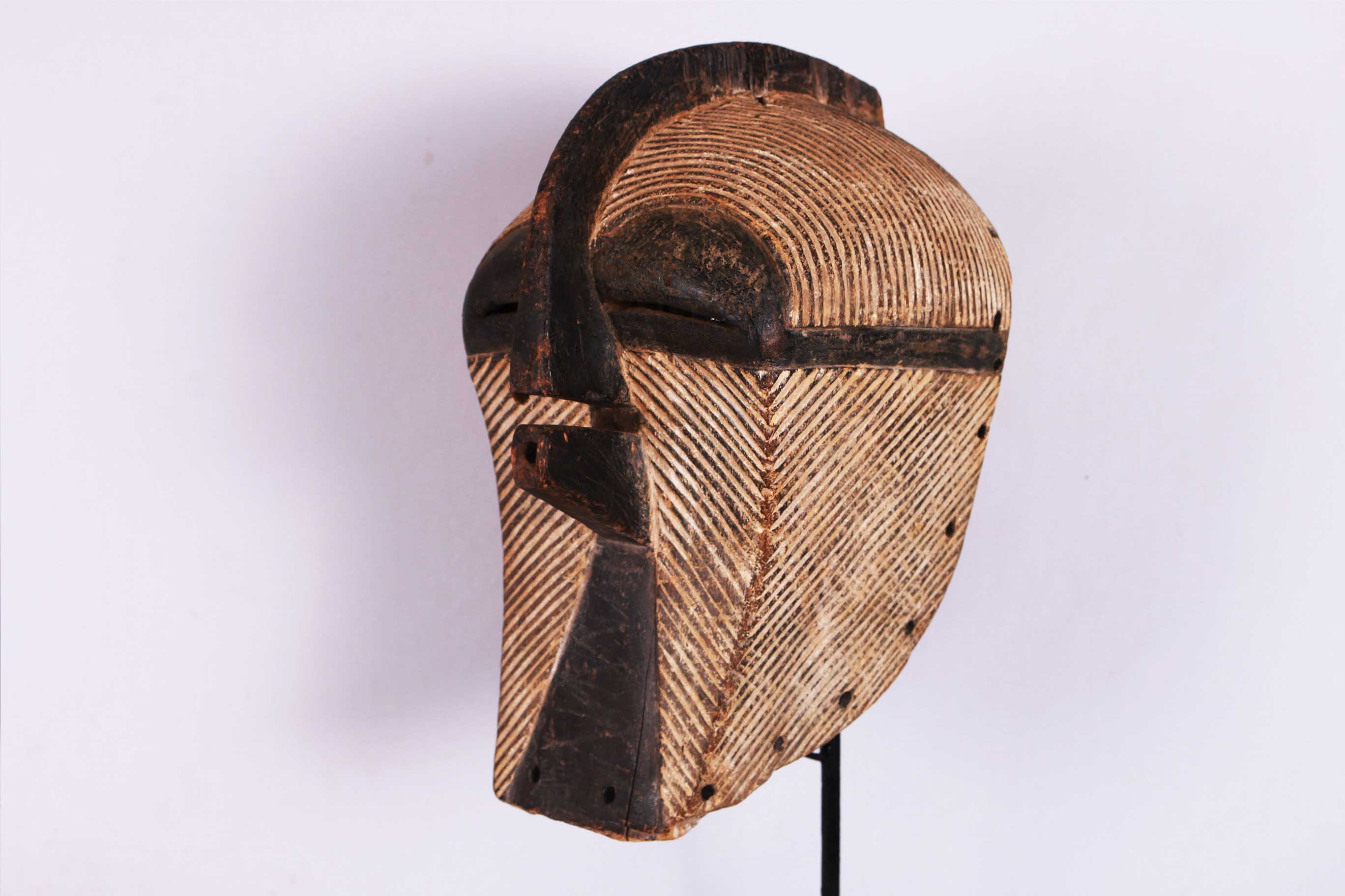 Kifwebe masks were made for the Kifwebe association, a type of society that provided a means of controlling social behavior and neutralizing disruptive elements within the group. These masks appeared at the installation and death of a chief, and at the initiation rites of young men as well as a whole range of occasions that included punishments, warfare, and public works. There are great variety and symbolism within the various Kifwebe masks. More than thirty different mask names have been recorded. Several have animal names while other masks have names of illnesses like leprosy or names denoting natural phenomena. For the most part, Kifwebe masks no longer function to maintain social control among the Songye except in the southeastern regions bordering on Luba territory. Female masks, in direct relation to the physical world and procreation, move calmly; their task is to invoke benevolent spirits that will influence the future generation. Female masks are associated with the moon and are worn for moon rituals as well as during funerals and initiation rites. The following mask shows age and good usage. The following Songye mask shows signs of good age usage.