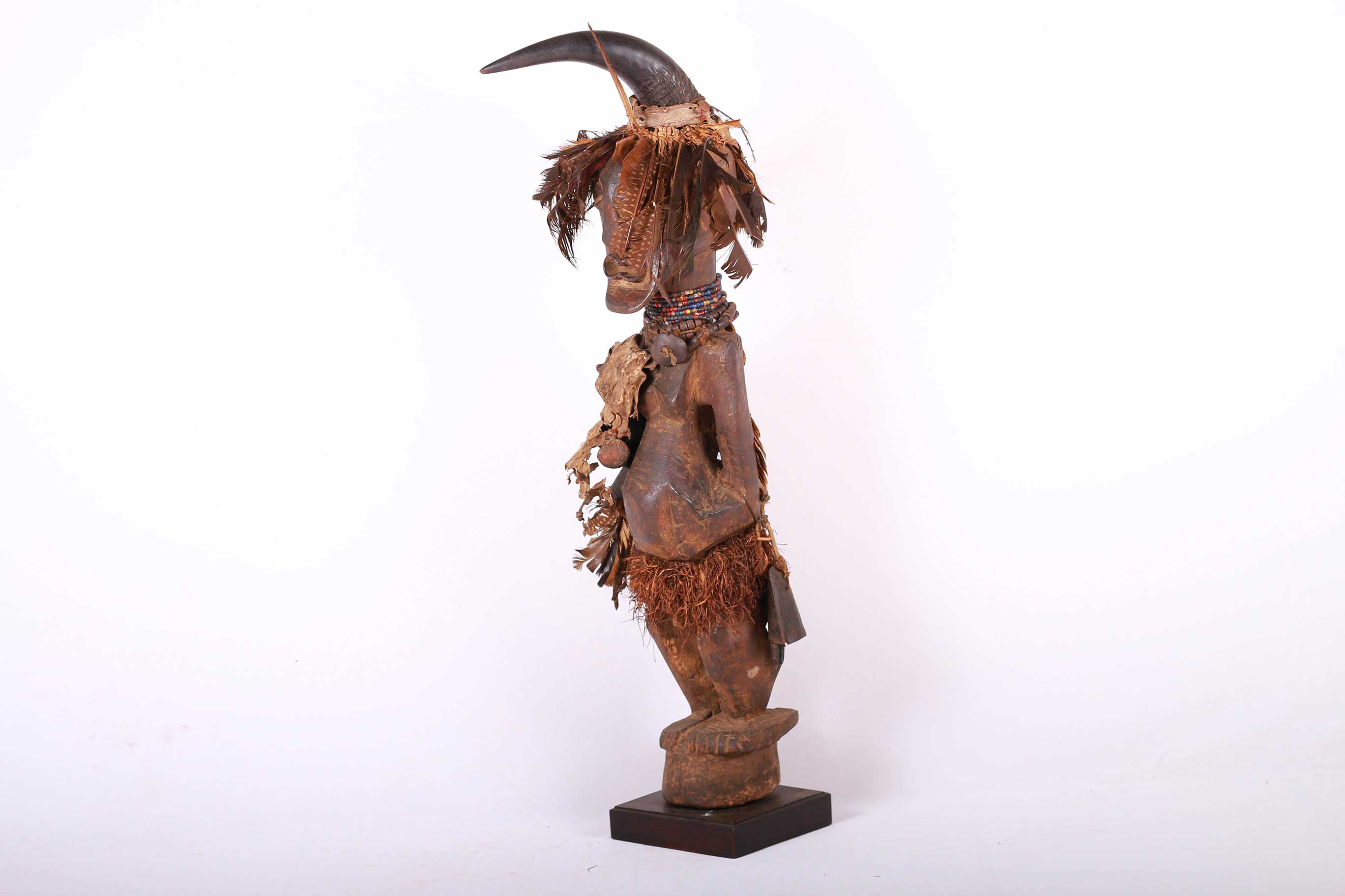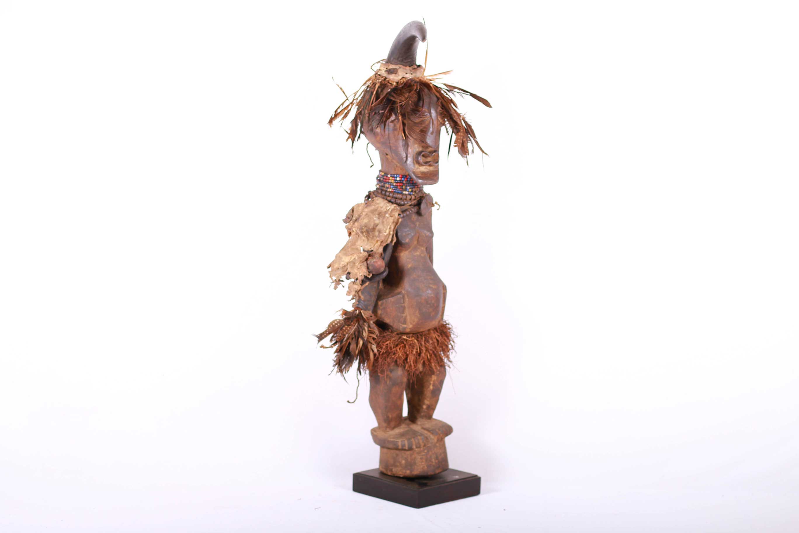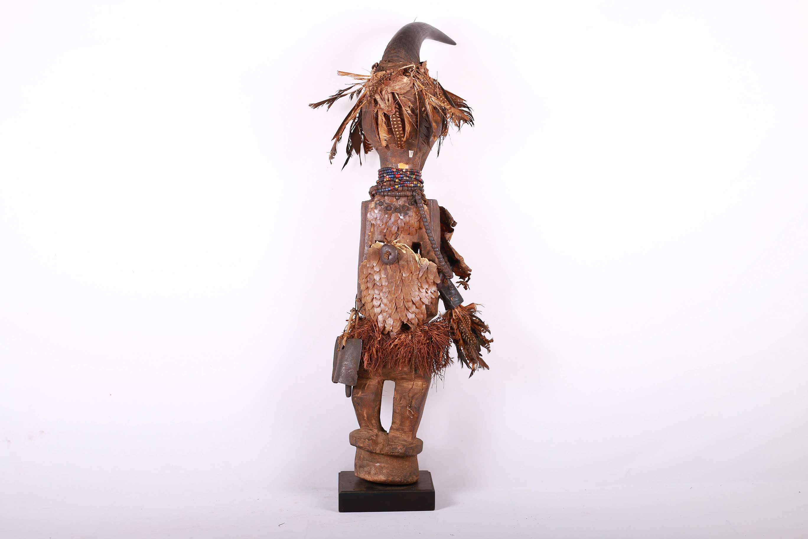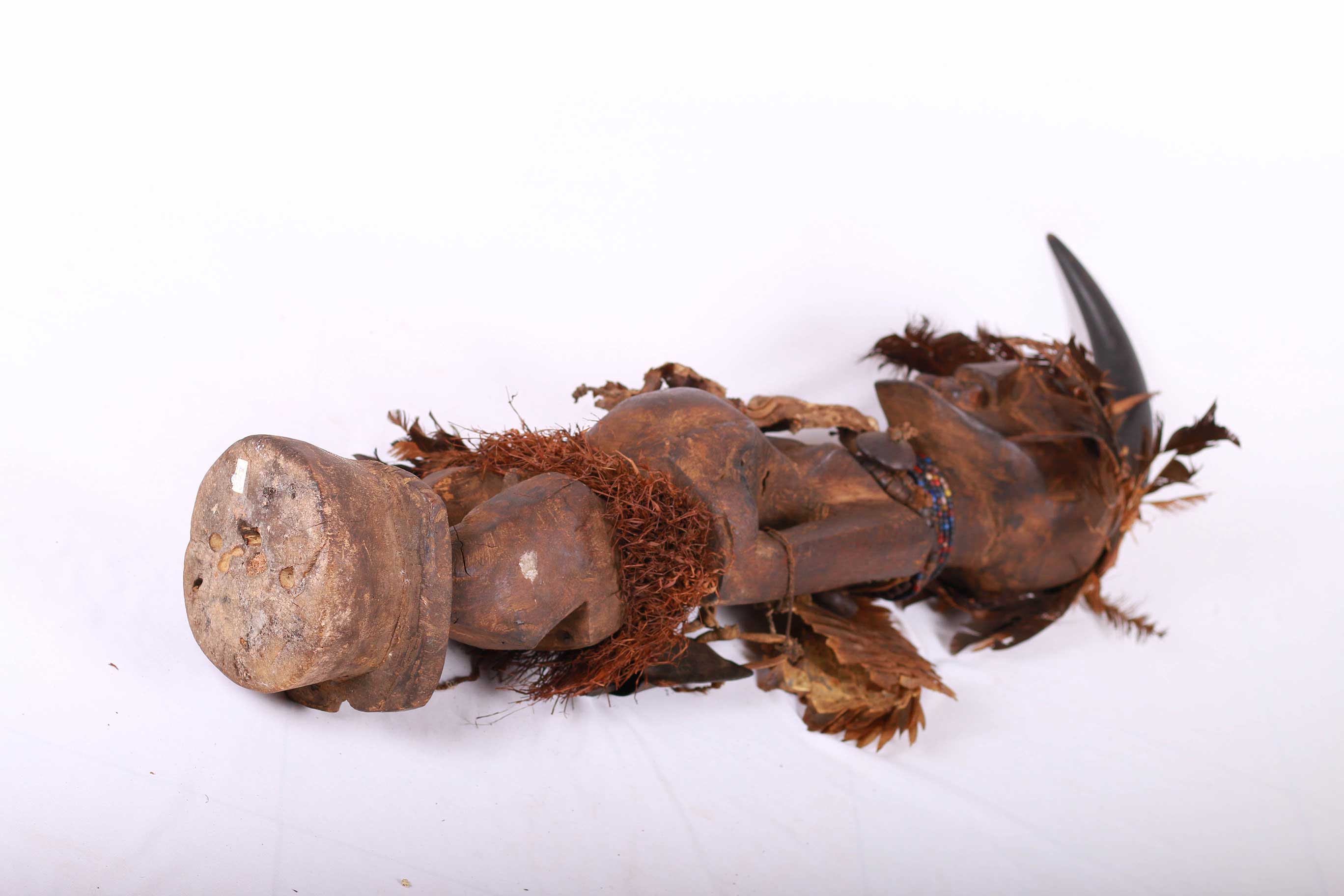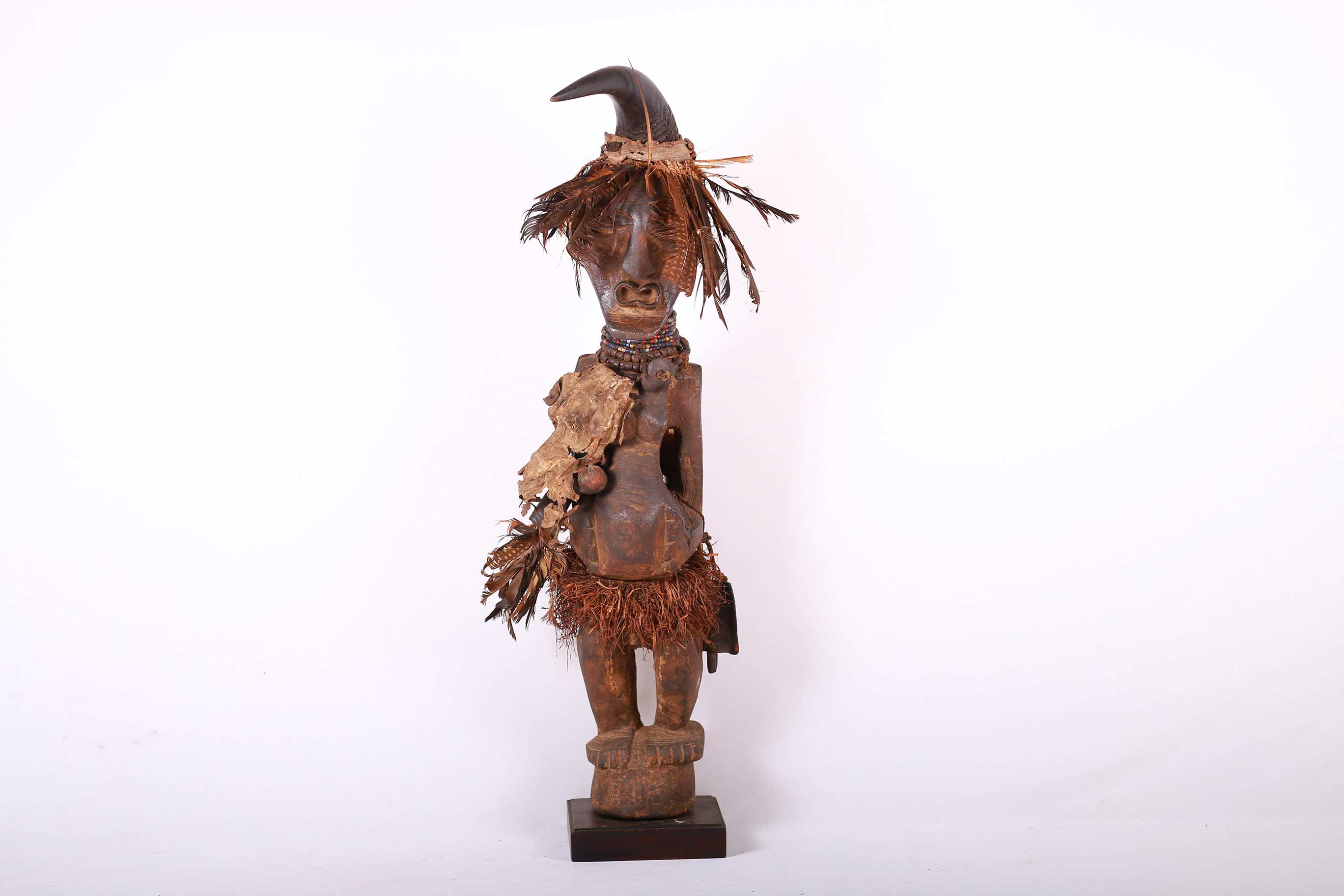 The Songye people are a Bantu ethnic group from the central Democratic Republic Of Congo, the Songye made power figures known as Nkisi that were used to combat witchcraft and sorcery. They were also believed to bring promote fertility and success, vanquish enemies and protect one from evil. The smaller ones were for individual families and the larger ones acted as intercessors between ancestral spirits and the living, they were owned by and served the entire community and also brought togetherness among the community. Such sculptures were commissioned by chiefs and elders, the entire community selected the tree in which the sculpture was to be carved in and it was carved by a professional artist called a nganga who selected the type of wood and features. The following is a very special figure with many interesting features, a curved pointed horn covered with feathers around the bottom of the horn which extend and cover part of the face. These feathers are held tight by old strings and animal skin, dense layer of beads around the neck and animal skin, a hanging metallic bell, horn-shaped feature staffed with feathers on the right-hand side and dense raffia around the waist. This piece is carved in dense wood with a brown patina and shows a perfect age.