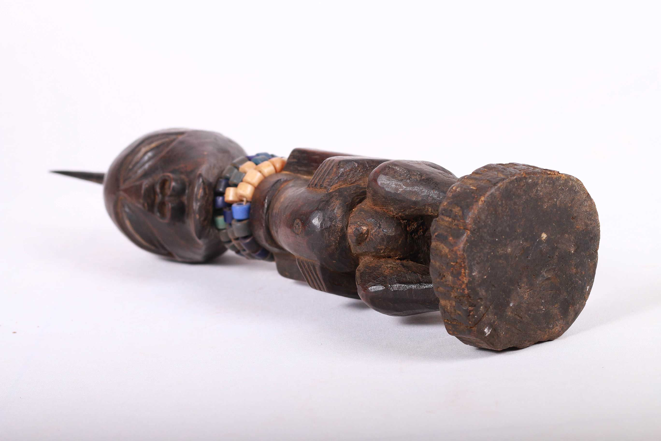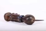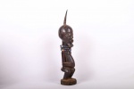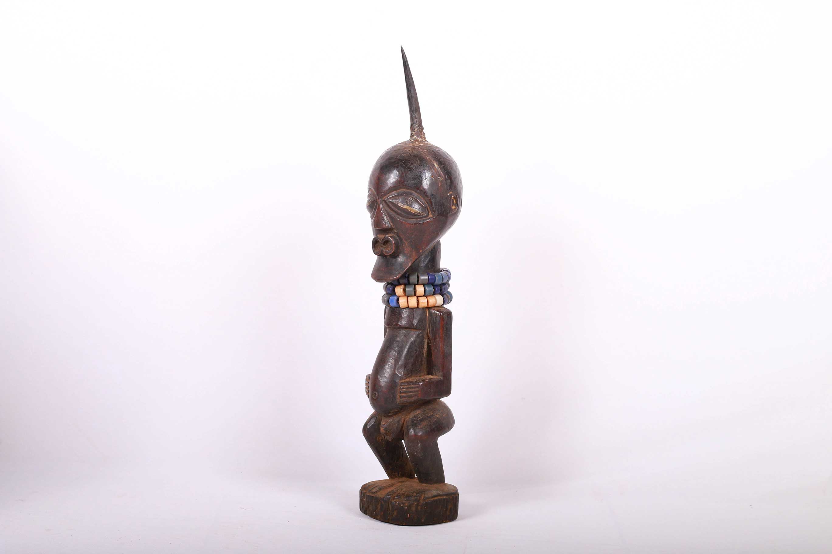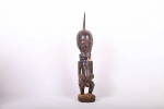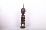 The Songye people are a Bantu ethnic group from the central Democratic Republic Of Congo, the Songye made power figures known as Nkisi that were used to combat witchcraft and sorcery. They were also believed to bring promote fertility and success, vanquish enemies and protect one from evil. The smaller ones were for individual families and the larger ones acted as intercessors between ancestral spirits and the living, they were owned by and served the entire community and also brought togetherness among the community. Such sculptures were commissioned by chiefs and elders, the entire community selected the tree in which the sculpture was to be carved in and it was carved by a professional artist called a nganga who selected the type of wood and features. The following sculpture is crafted from hardwood with a brown patina.