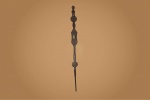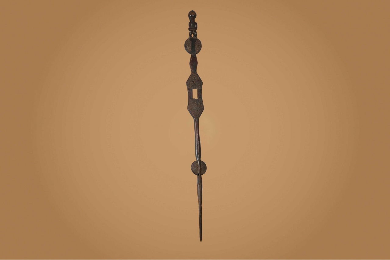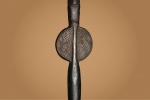 The Songye people are a Bantu ethnic group from the central Democratic Republic Of Congo, the Songye made power figures. Walking sticks/canes were carved for men’s attire, they were carefully carved ornamental objects made in different forms, they were used to provide support and as act as a symbol of authority among the Songye. Often the staffs represented the hierarchy among the chiefs of the tribe, who might carry a staff to show their rank as distinguished elders. The ornamental faces on the staffs can represent spirits, chiefs, or the chief’s ancestors. They are as much a religious symbol as an authoritative one. This is an elegant staff decorated with a human figurine at the top standing on a wide disc-shaped sculpted piece of wood and a long stick, it has a dark brown patina and shows signs of age.