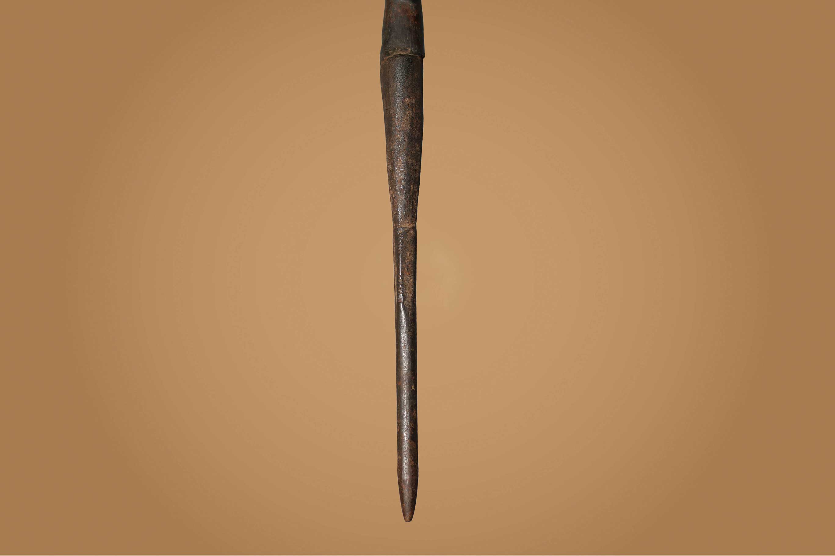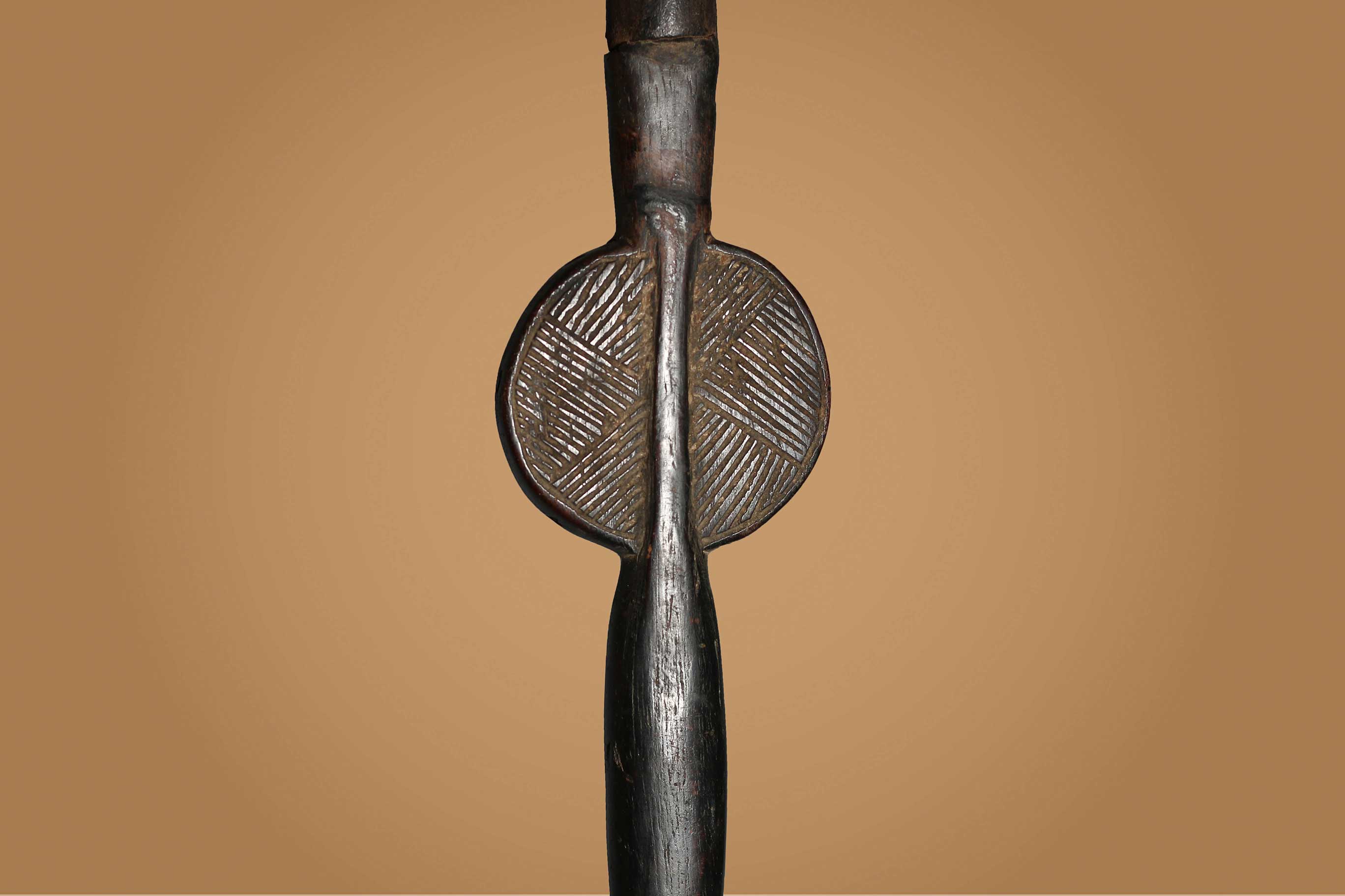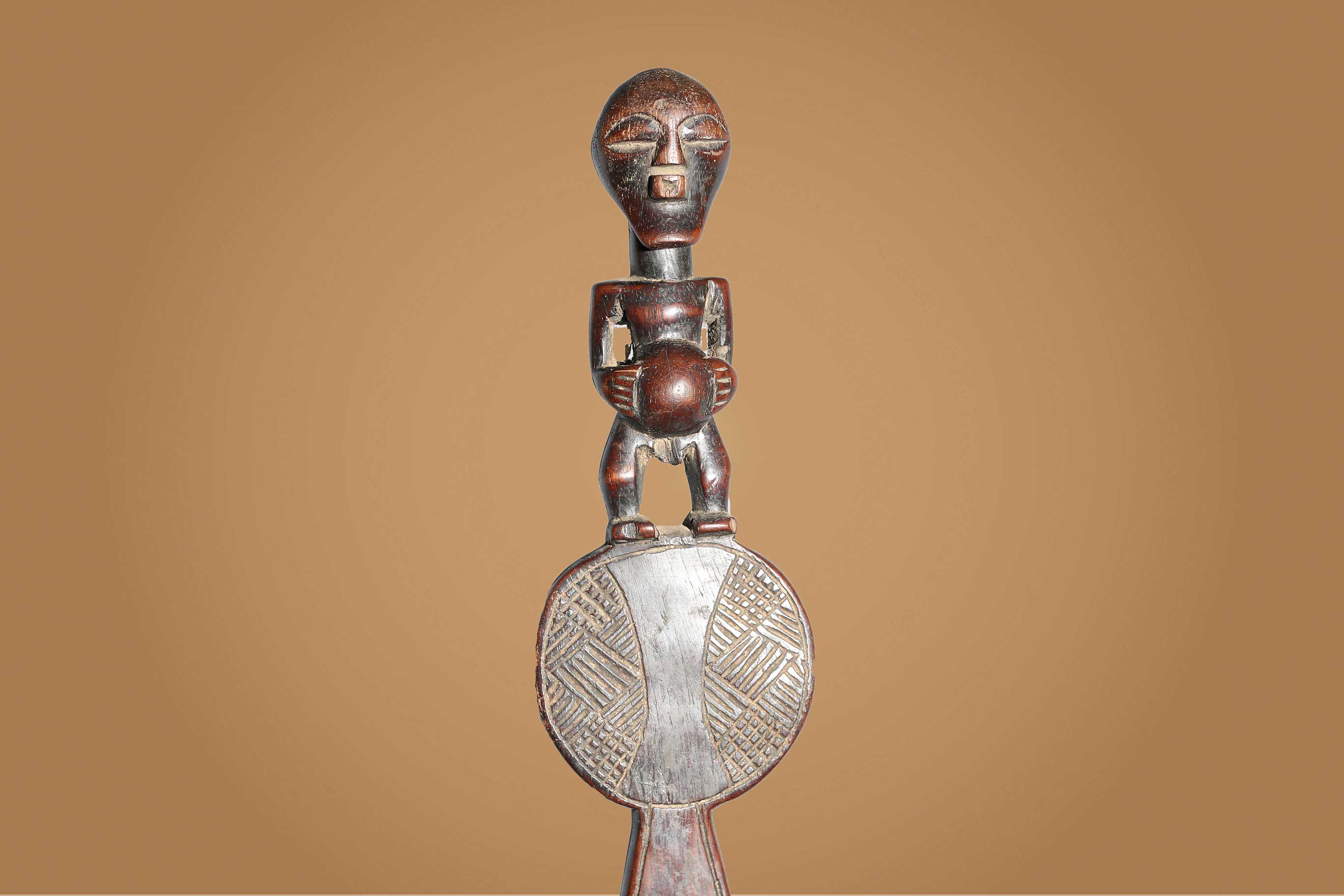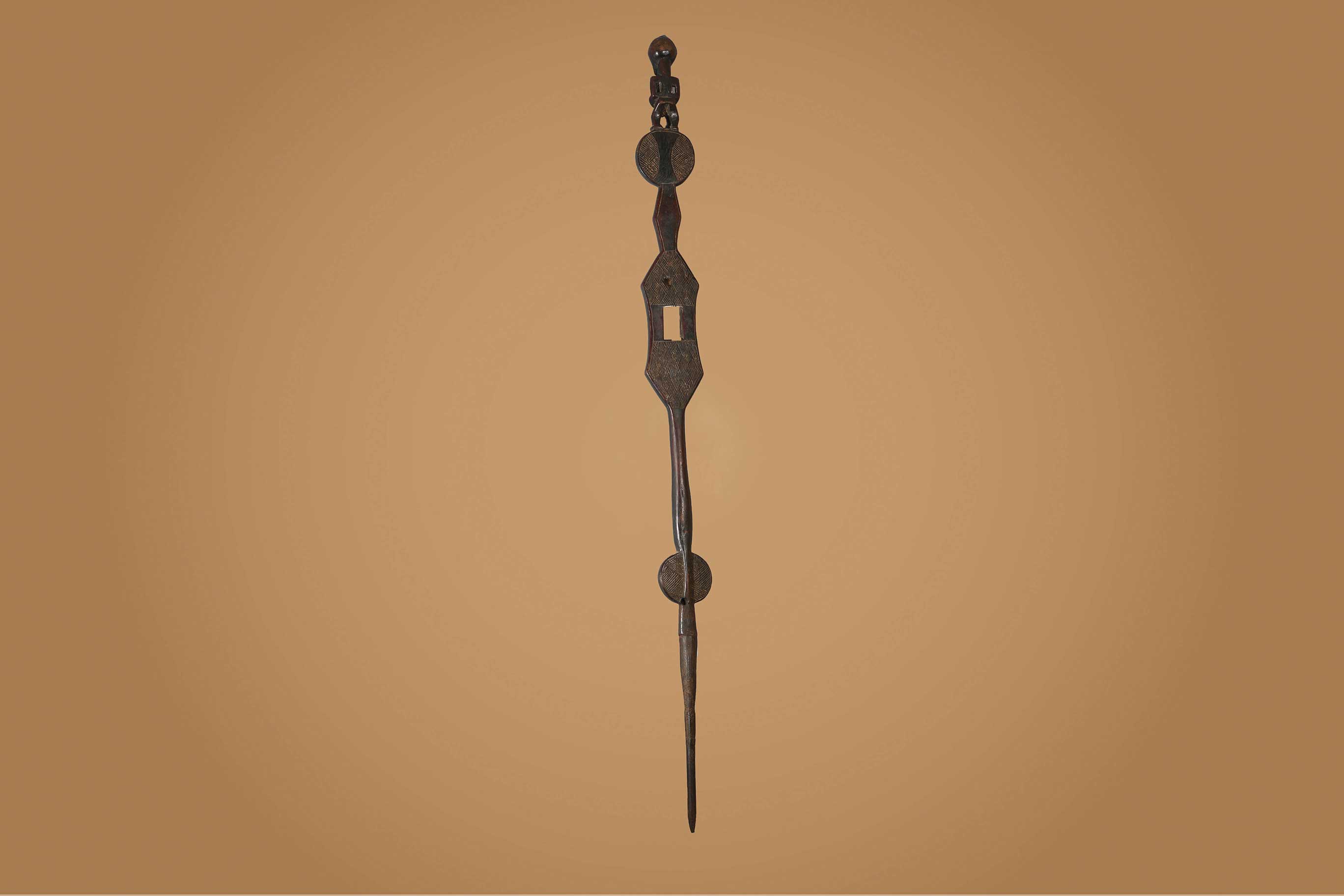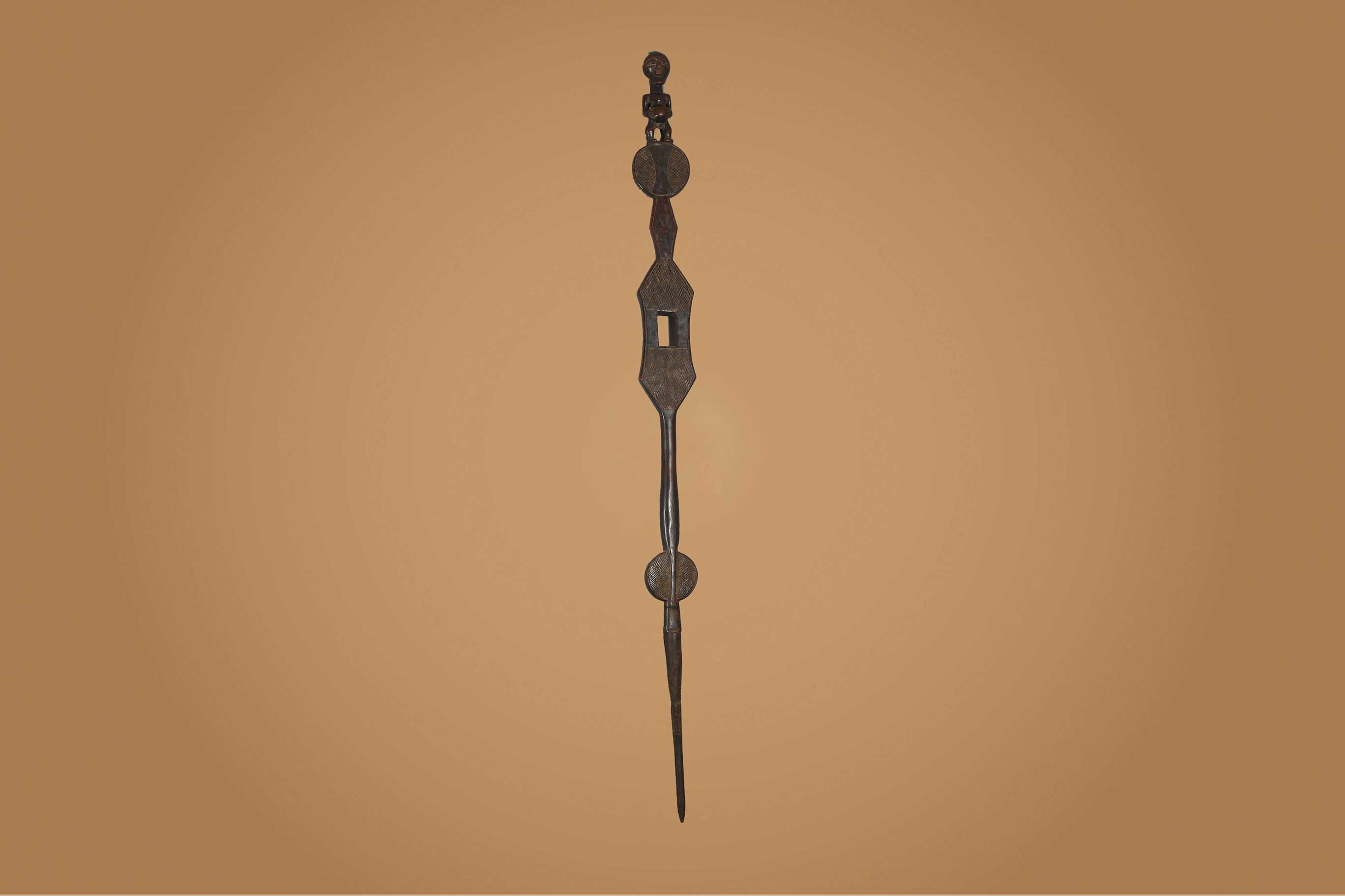 The Songye people are a Bantu ethnic group from the central Democratic Republic Of Congo, the Songye made power figures. Walking sticks/canes were carved for men’s attire, they were carefully carved ornamental objects made in different forms, they were used to provide support and as act as a symbol of authority among the Songye. Often the staffs represented the hierarchy among the chiefs of the tribe, who might carry a staff to show their rank as distinguished elders. The ornamental faces on the staffs can represent spirits, chiefs, or the chief’s ancestors. They are as much a religious symbol as an authoritative one. This is an elegant staff decorated with a human figurine at the top standing on a wide disc-shaped sculpted piece of wood and a long stick, it has a dark brown patina and shows signs of age.