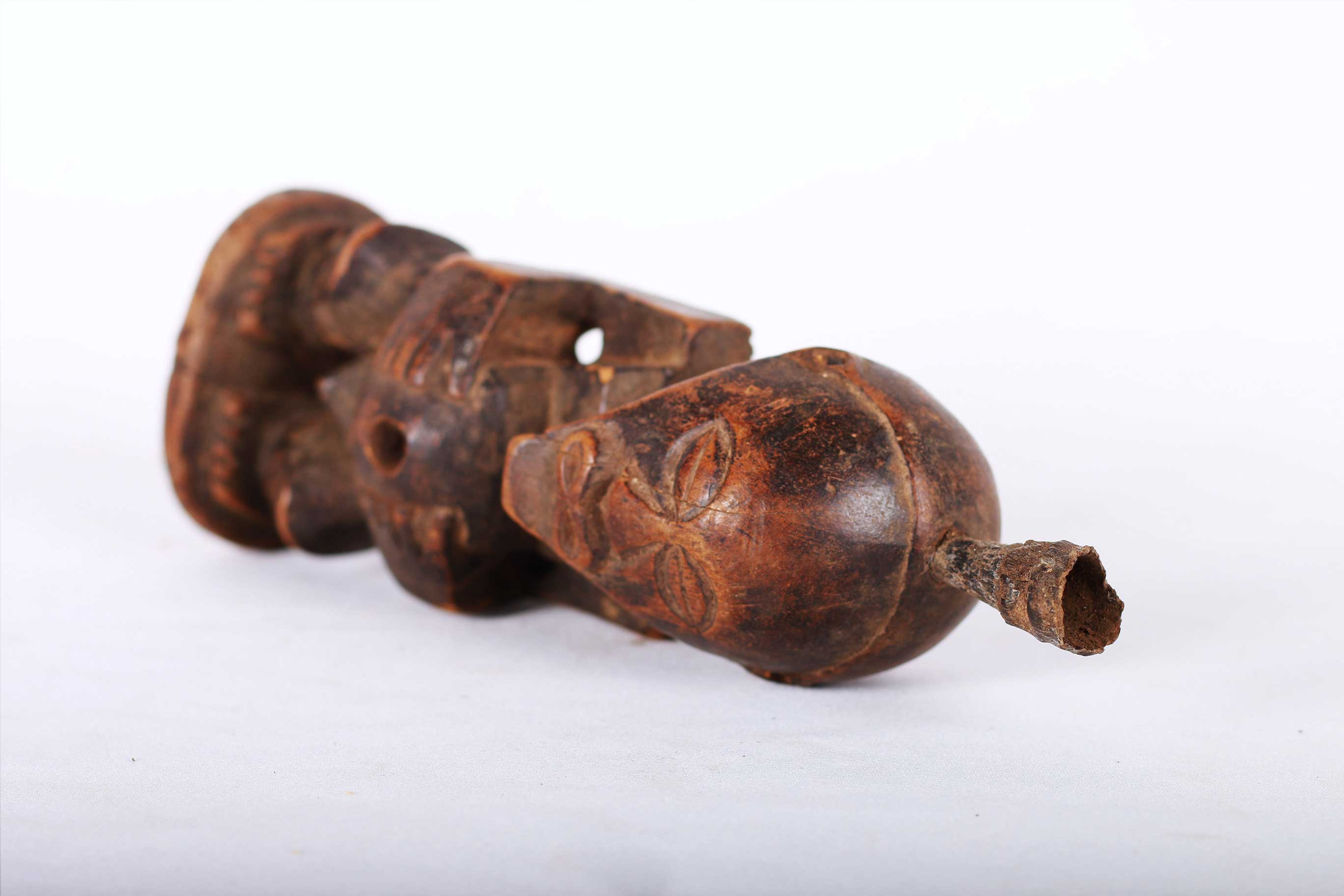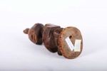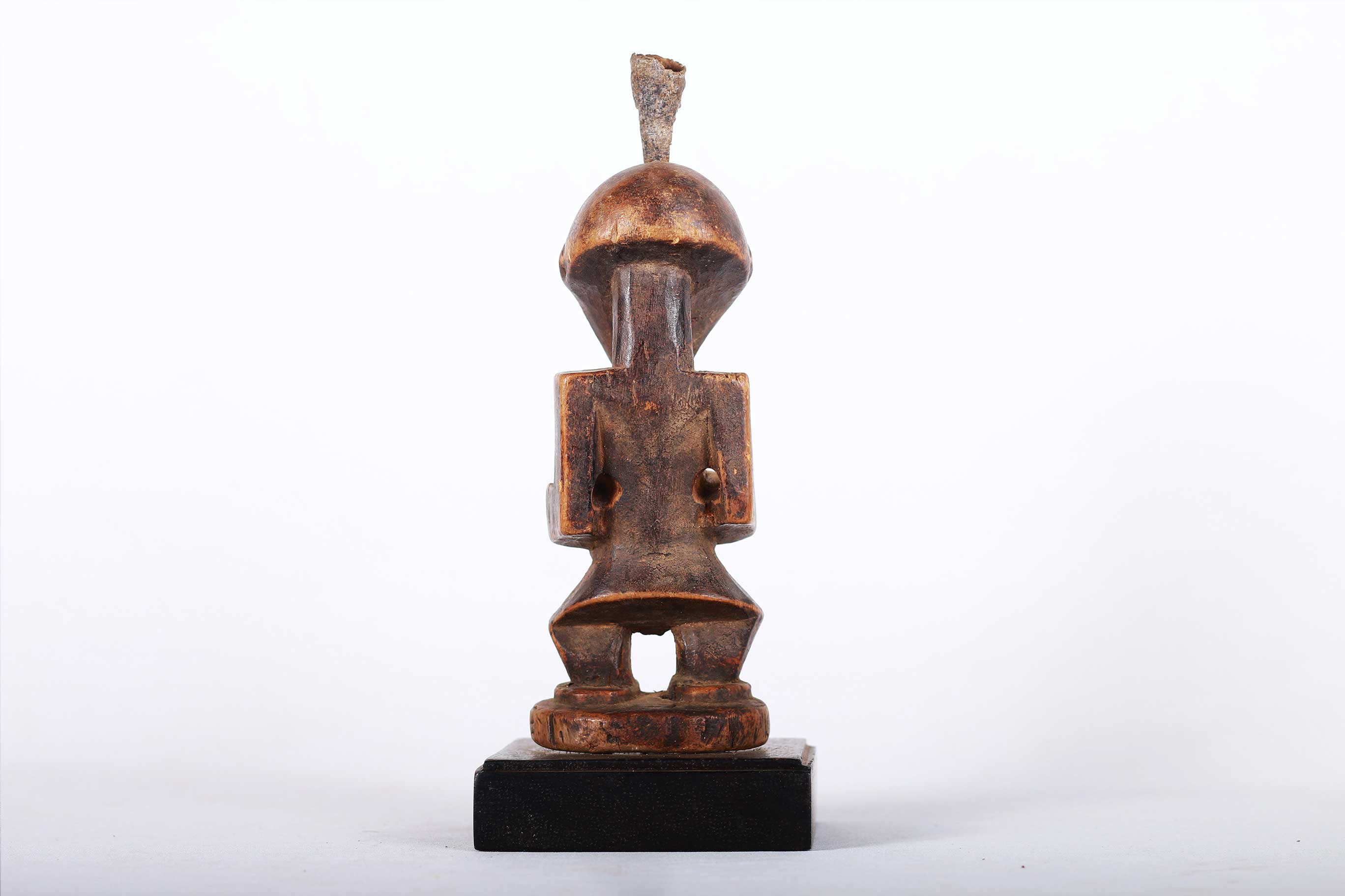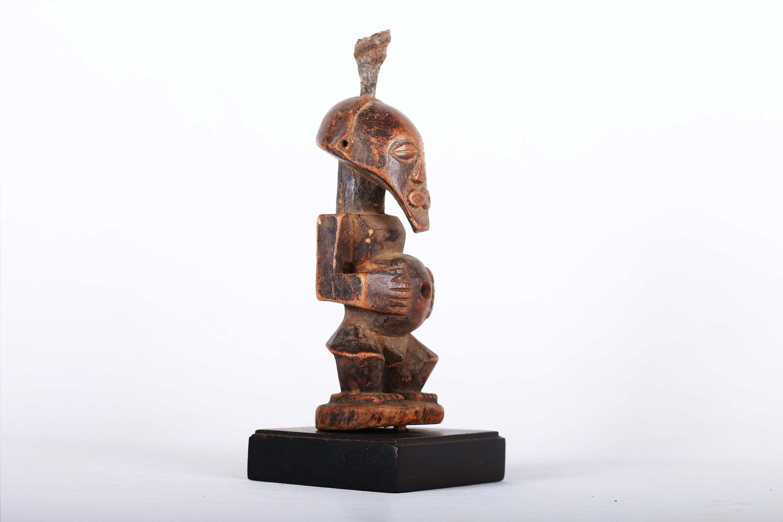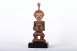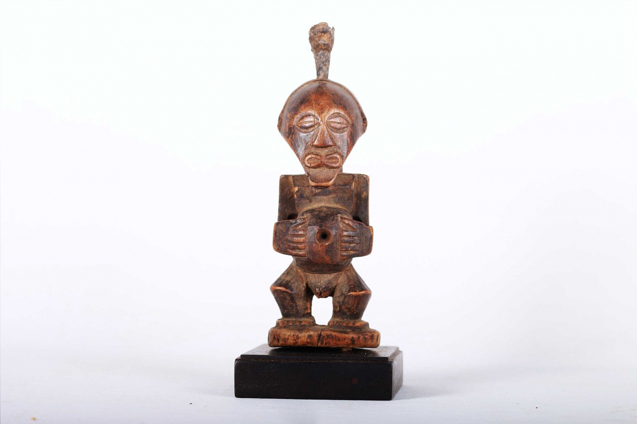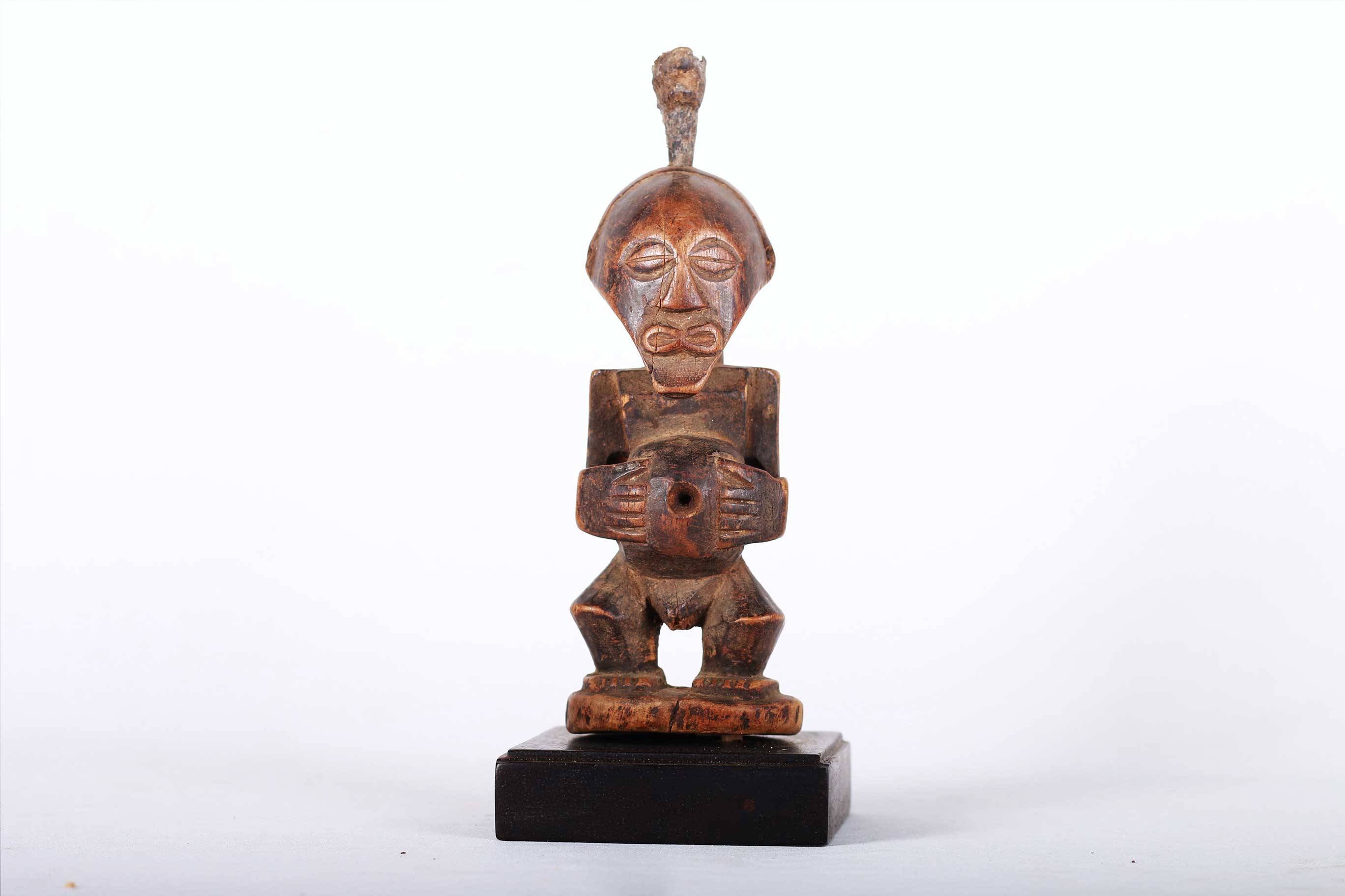 This well-carved miniature Songye power figure has hands on a prominent belly. Magical beliefs and practice are widespread among the Songye people who use figures such as this on family or village altars where they contact the spirits of ancestors, nature spirits and where offerings and prayers are given. Songye fetish figures, often have different materials attached to them including animal skins, nails, strips of metal, magical substances or whatever the owner specialist considers important to give the figure power to act. The following statue has a brown patina and looks visibly old.