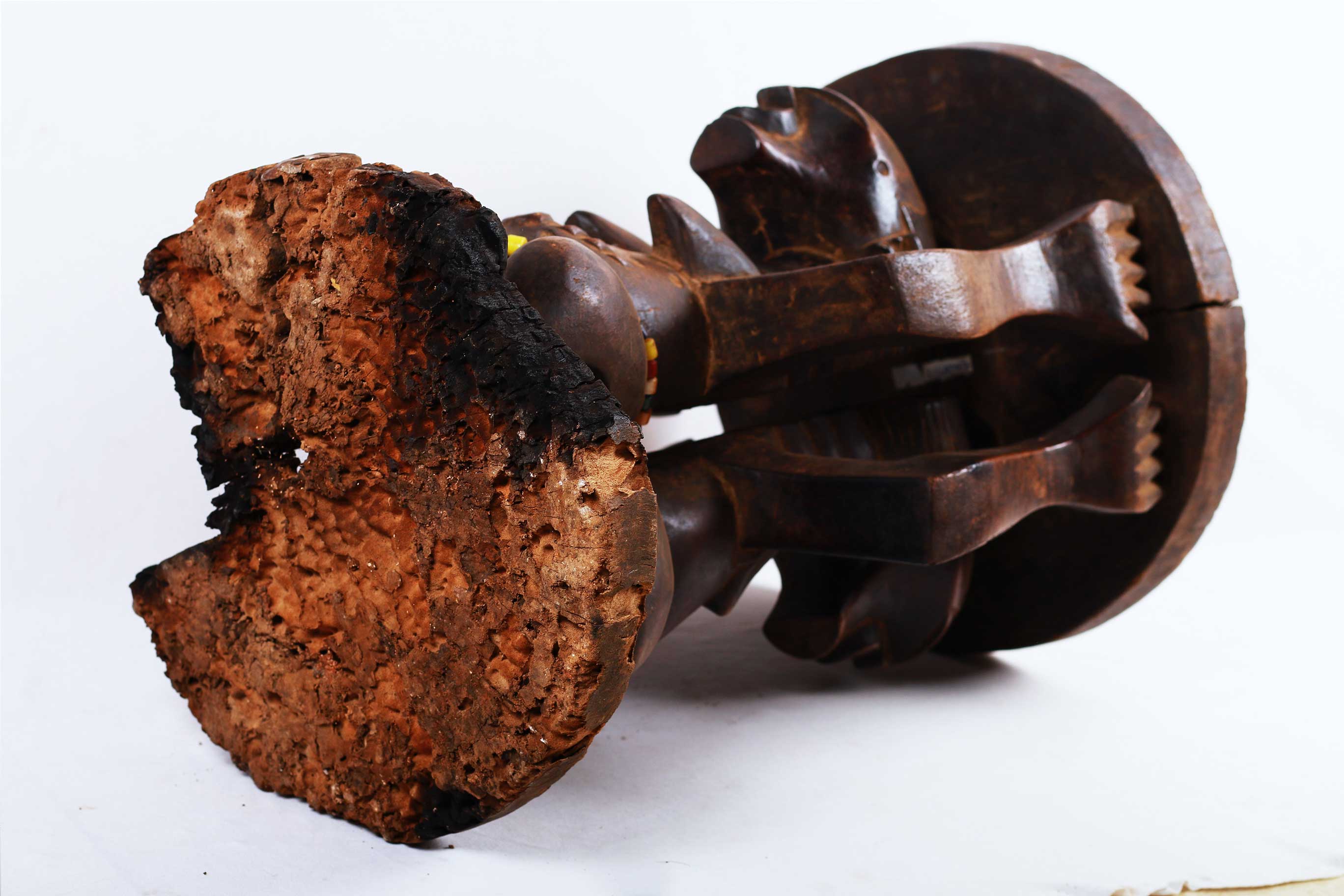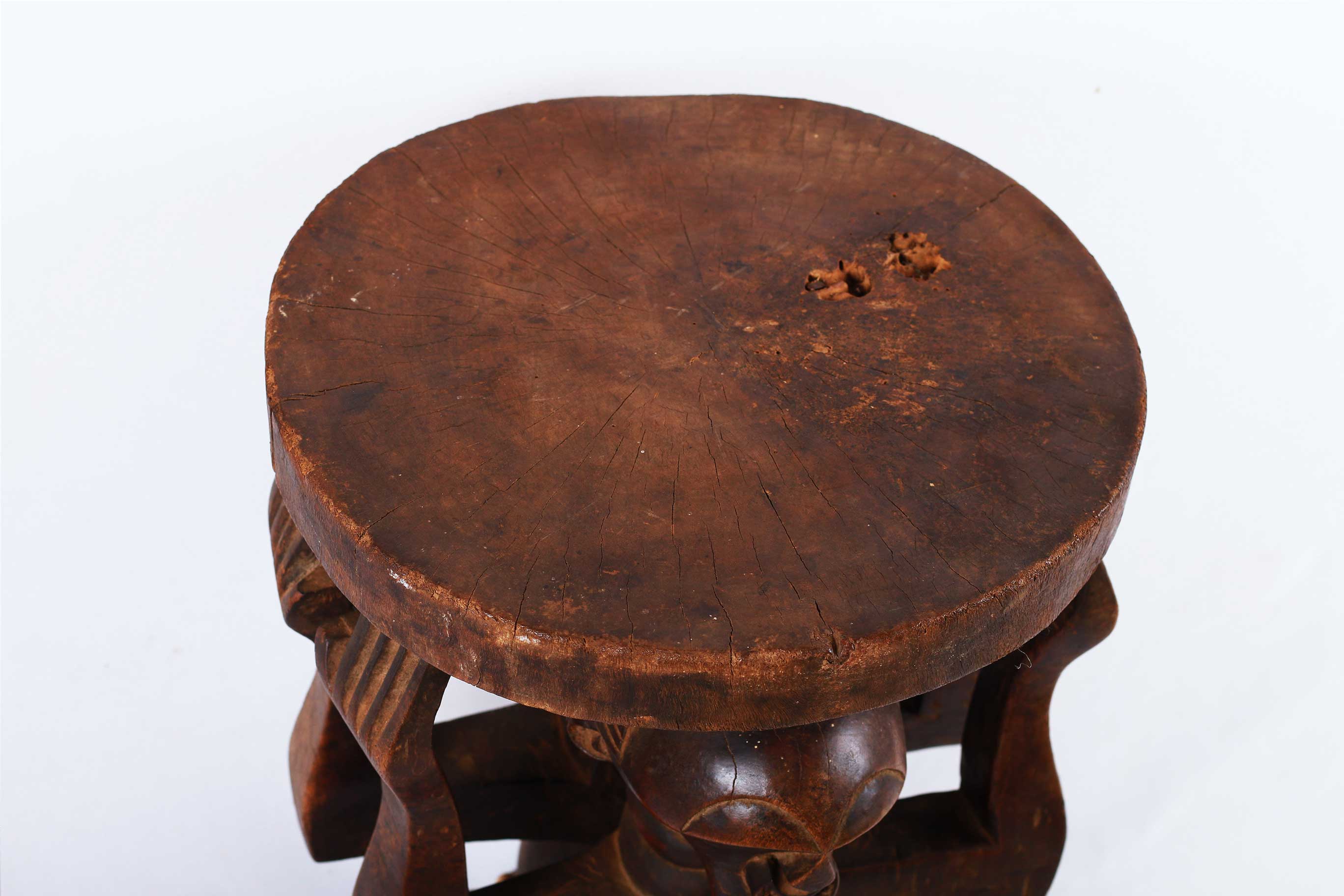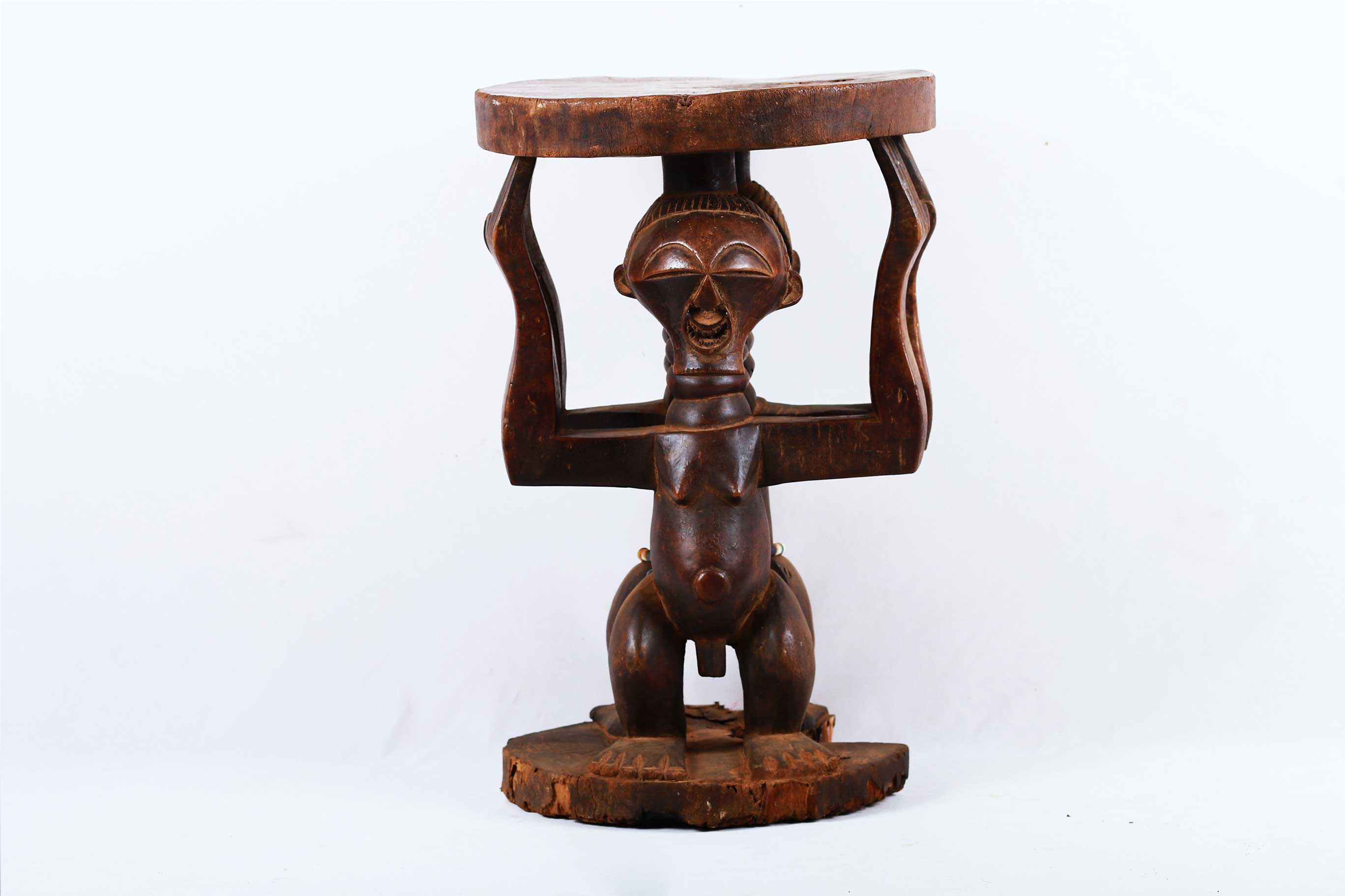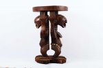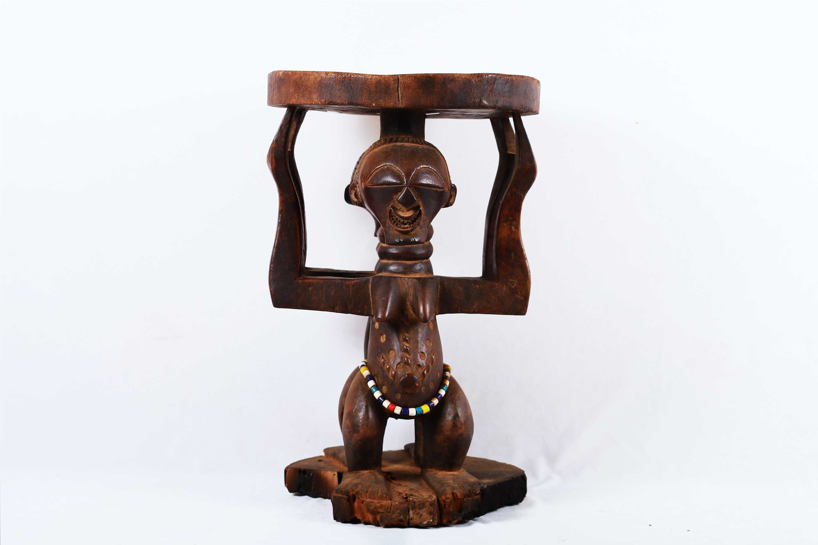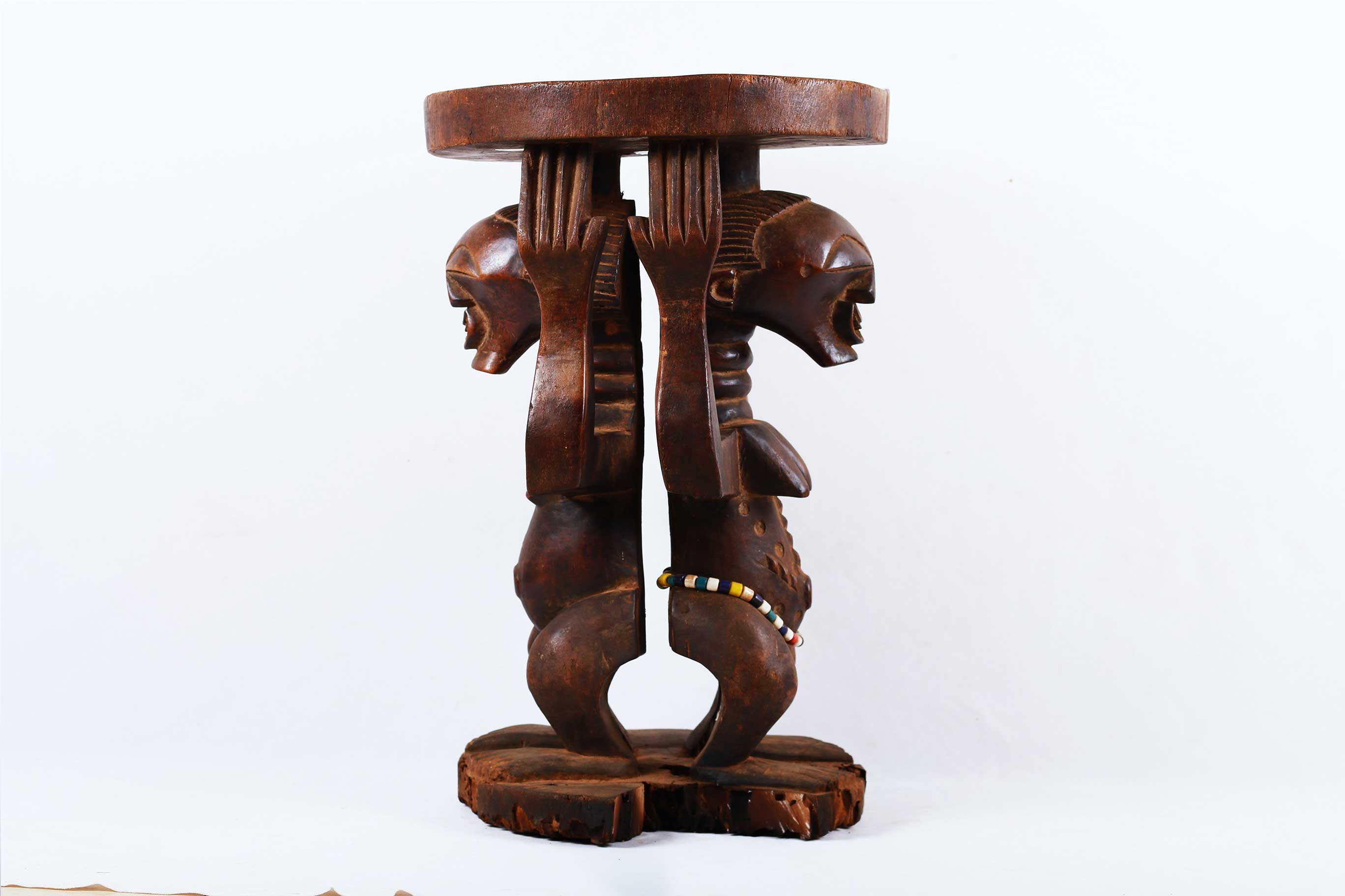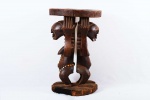 The Songye is found in the Democratic Republic Of Congo on the left of the River Lualaba. The Songye popular for crafting numerous tribal artwork like power objects and objects associated with divination, fertility, and success. This is a caryatid stool with two male and female figures supporting the round seat to represent authority and power. These stools were reserved for leaders/chiefs since the Songye traced succession through the female line so this stool depicts women’s role in the Songye society. This stool is in good condition, though worn with age, and has evidence overall of old worm wear to the surfaces, it is crafted in dense wood with a shiny brown patina with beads around its waist.