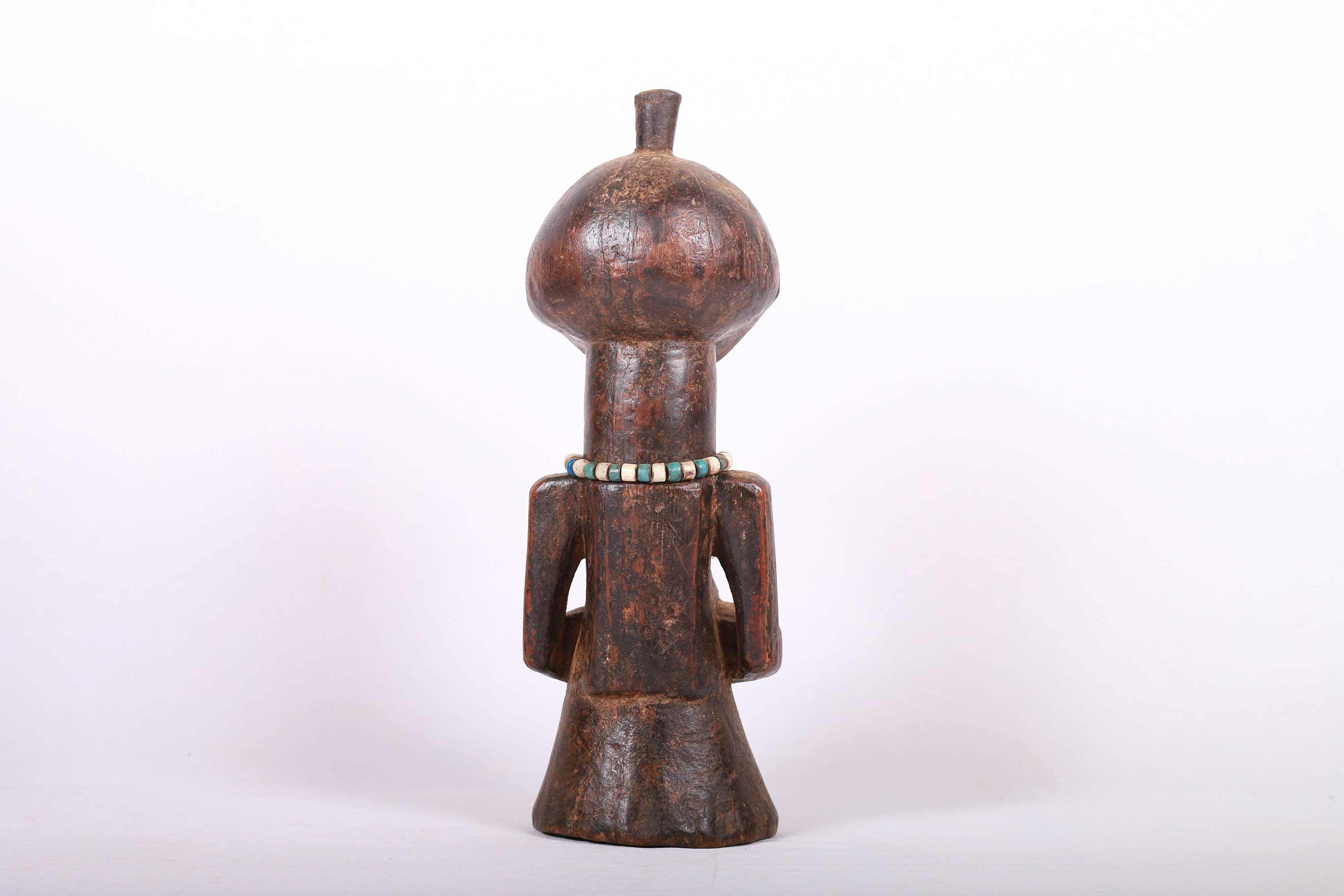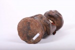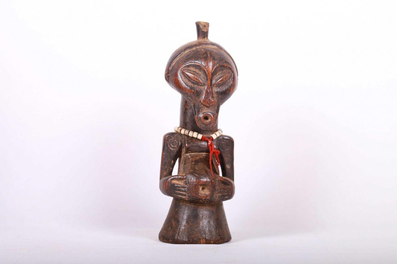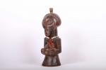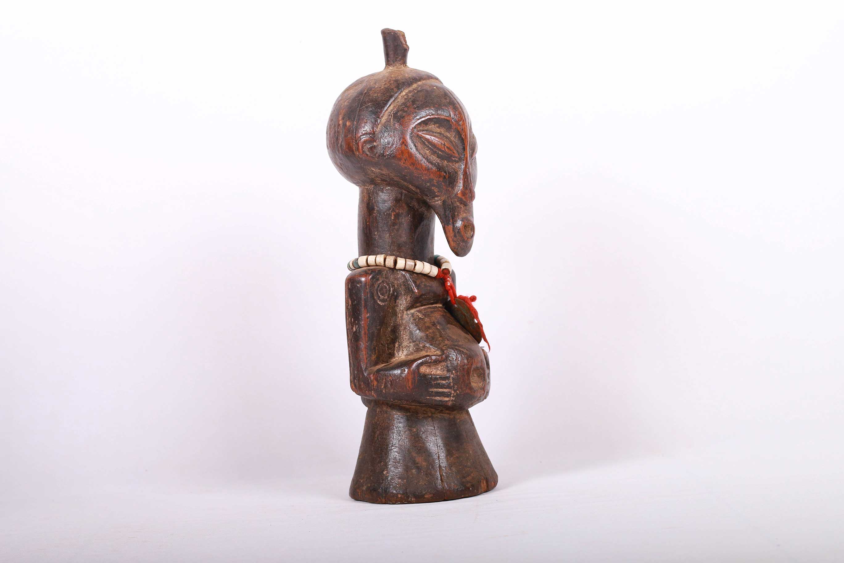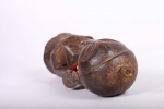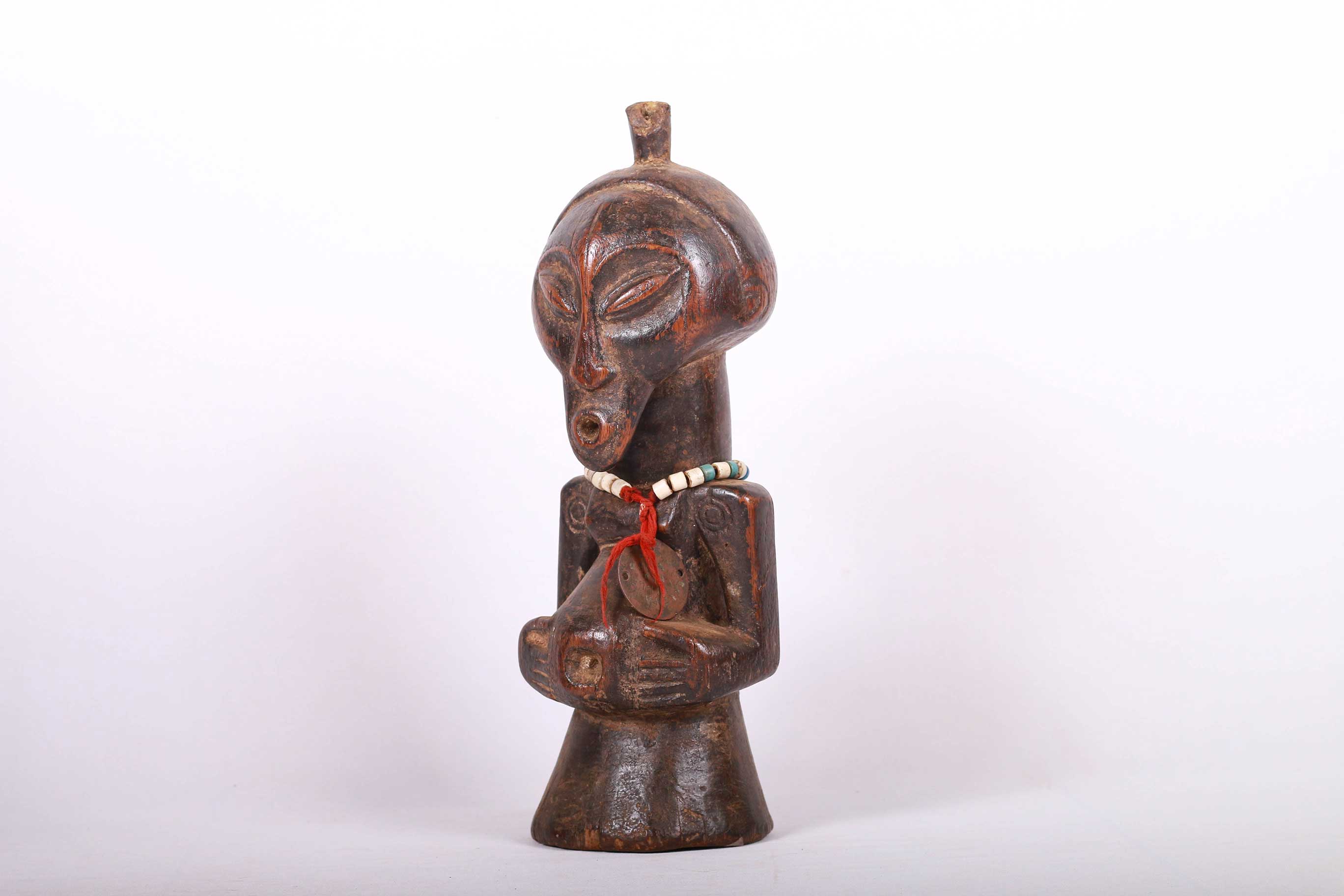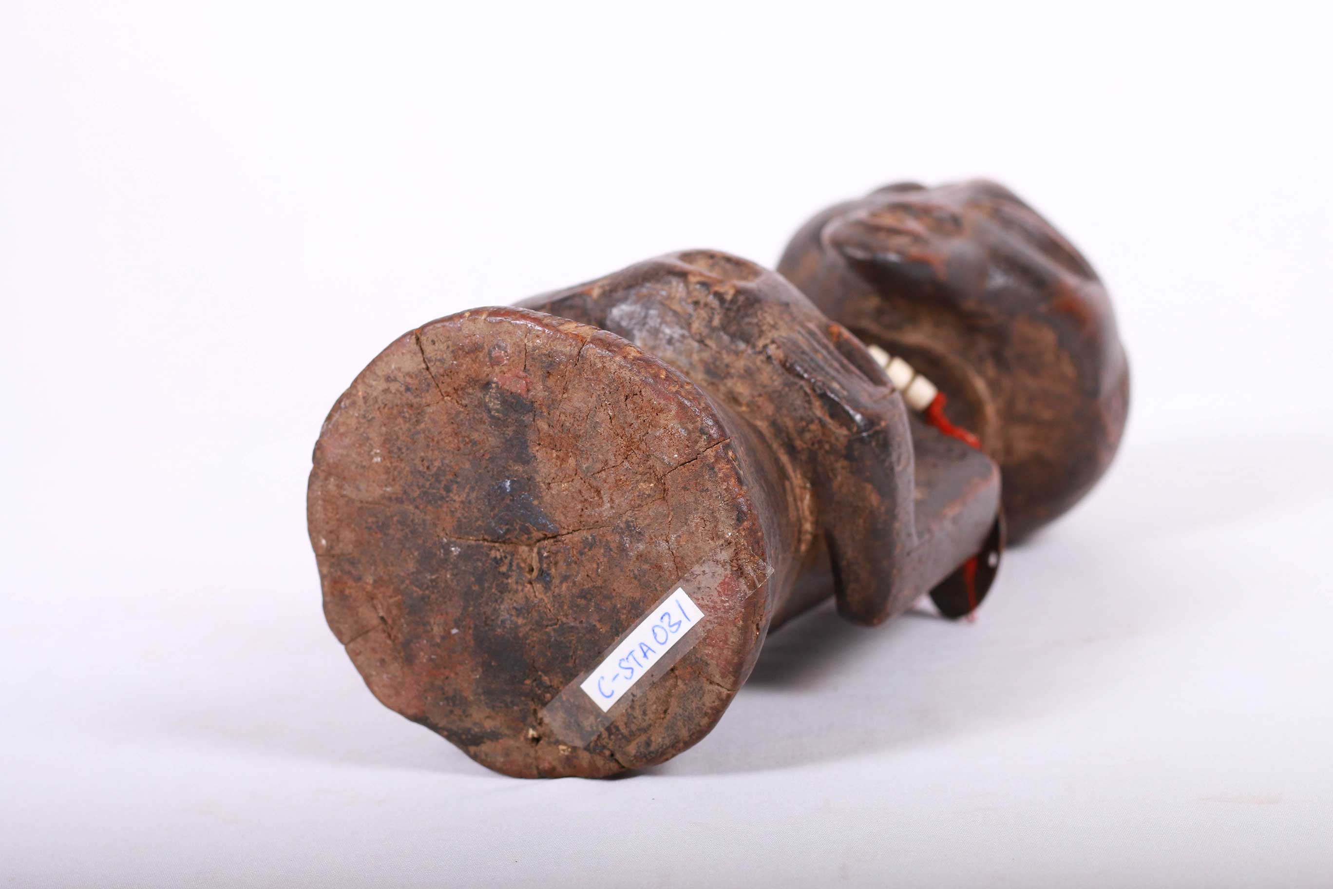 The Songye people are a Bantu ethnic group from the central Democratic Republic Of Congo, they neighbor the Tetela tribe. This is border sculpture between the Songye and the tetela used as a power figure used to combat witchcraft and sorcery. This sculpture is believed to promote fertility and success, vanquish enemies and protect one from evil. The following sculpture is crafted from hardwood with its hands attached to the belly, it has interesting facial features with a brown patina, it shows perfect age and usage.