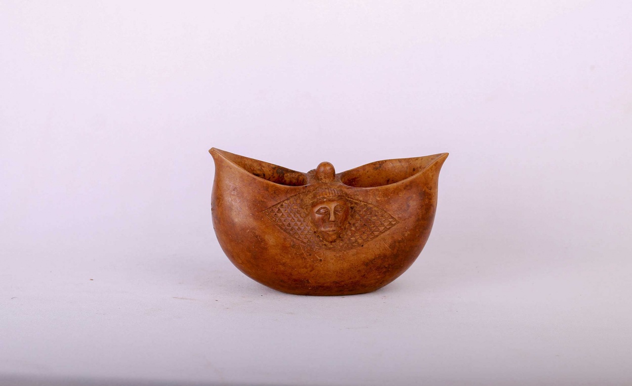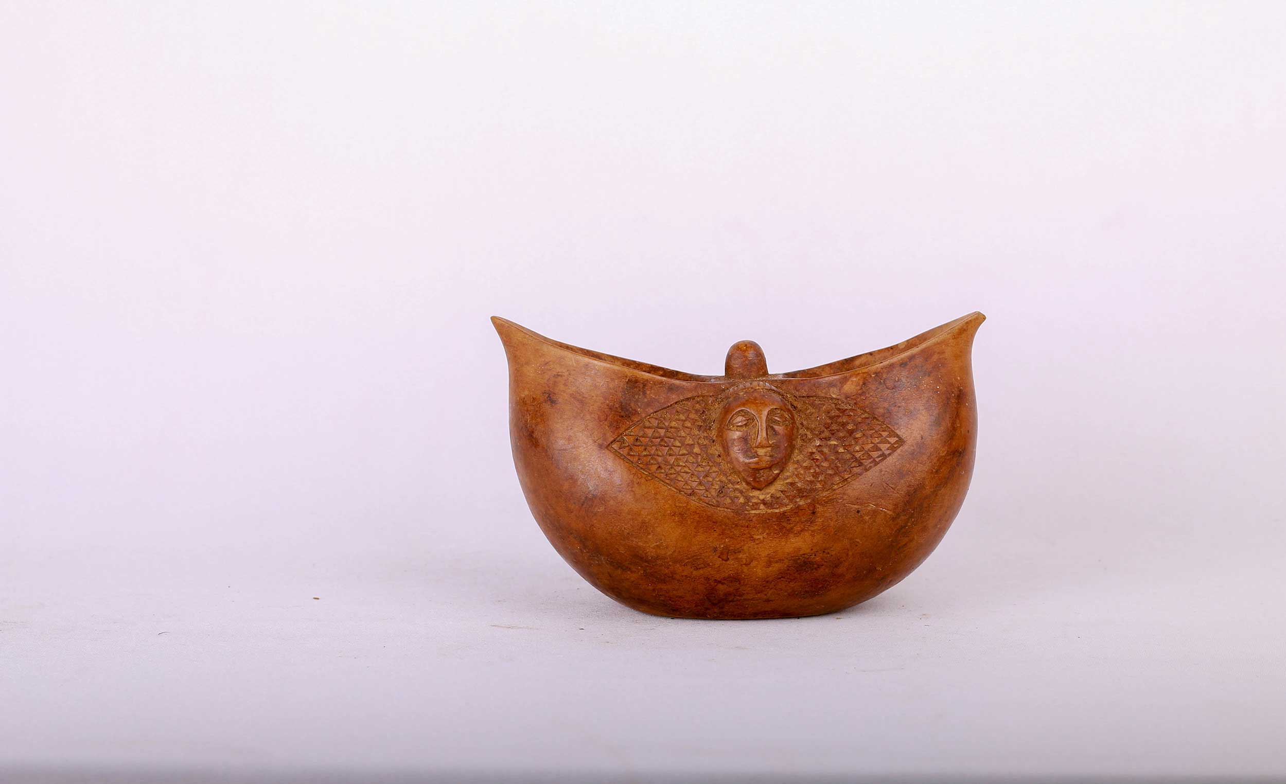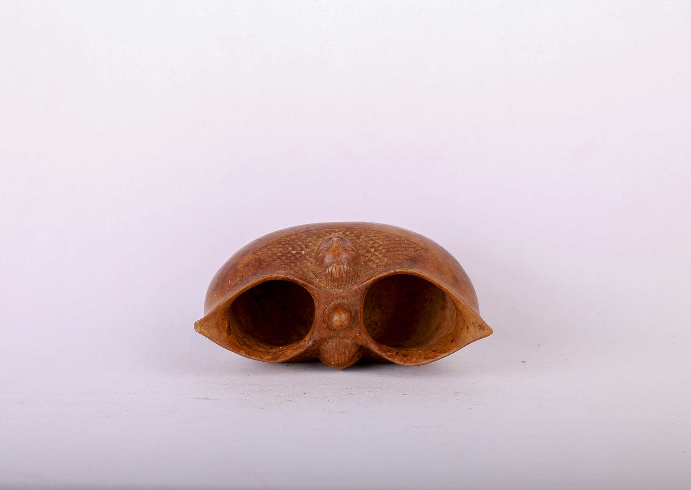 The Suku people have lived in the southwestern part of the Democratic Republic of the Congo. Numerous well carved Suku cups are found of a shape based on a particular gourd sliced in half. This results in two oval mouths with a small bridge in between, incised decorations appear on both sides. .The cups were passed down in a matrilinear succession and generations of use accounts for the shiny old patinas that are the characteristic.