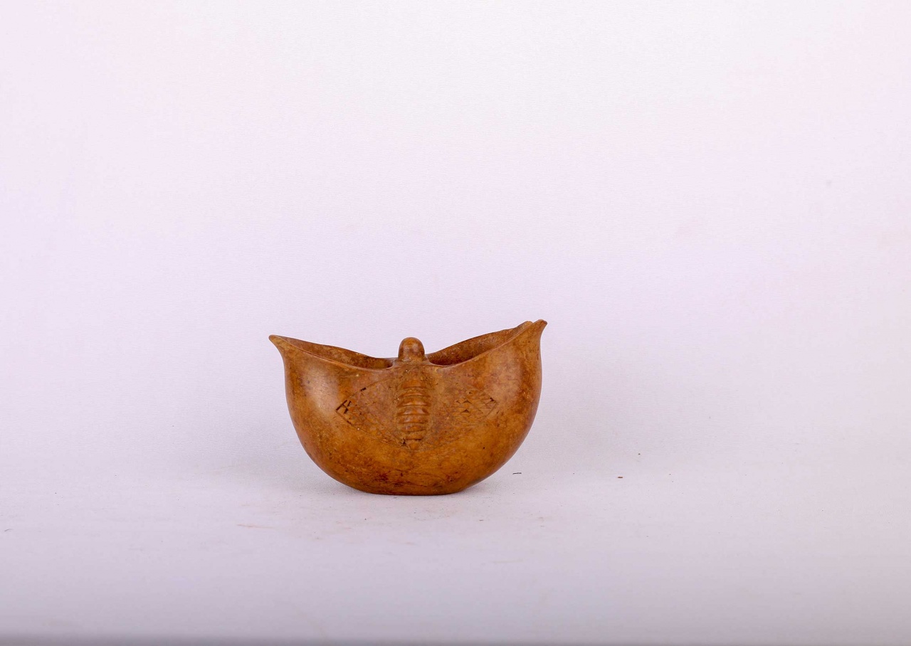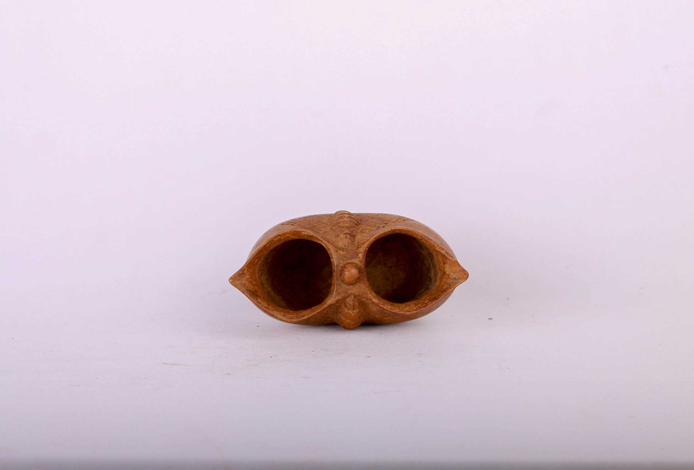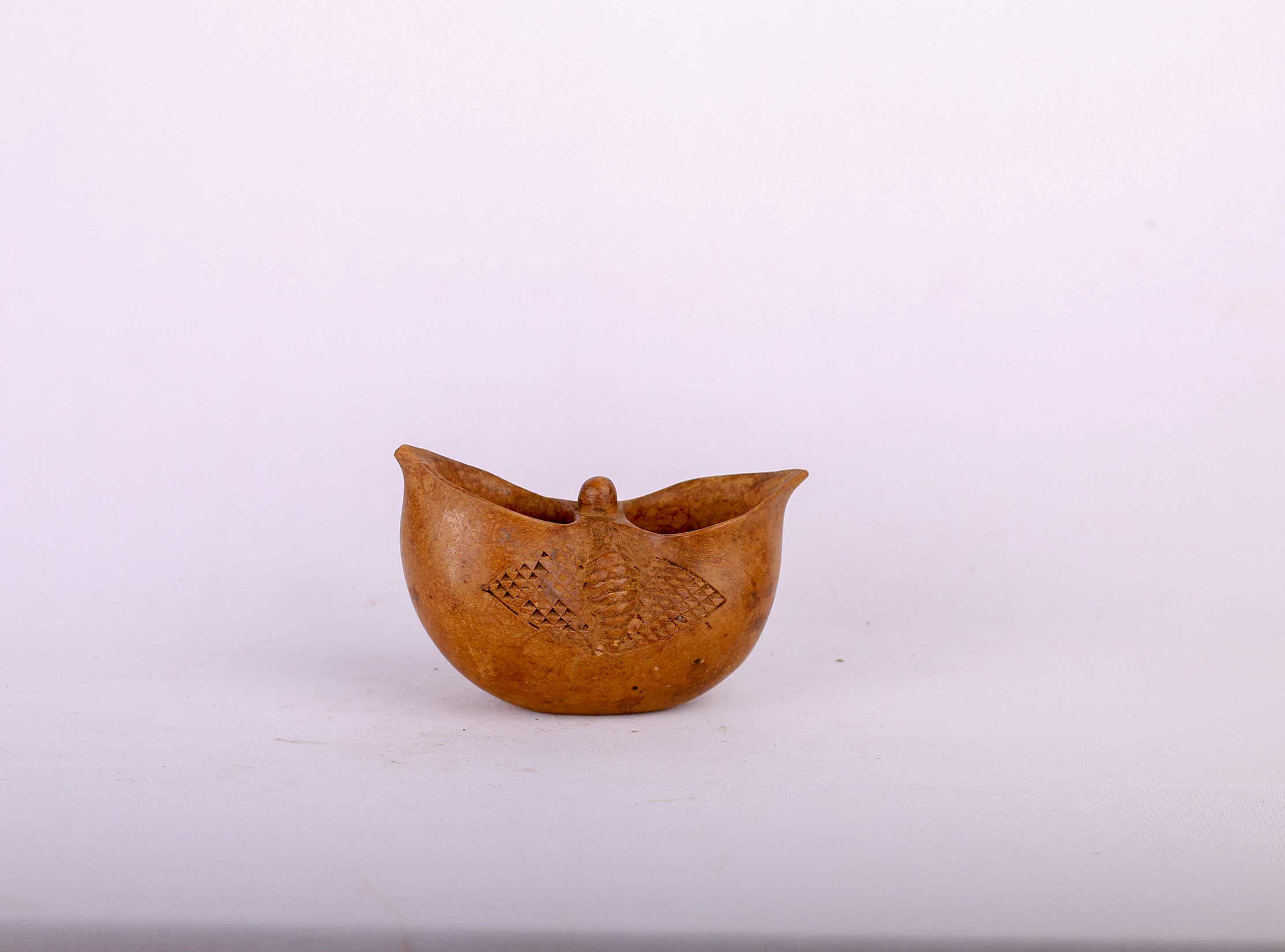 The Suku people have lived in the southwestern part of the Democratic Republic of the Congo. Numerous well carved Suku cups are found of a shape based on a particular gourd sliced in half. This results in two oval mouths with a small bridge in between, incised decorations appear on both sides. .The cups were passed down in a matrilinear succession and generations of use accounts for the shiny old patinas that are the characteristic.
