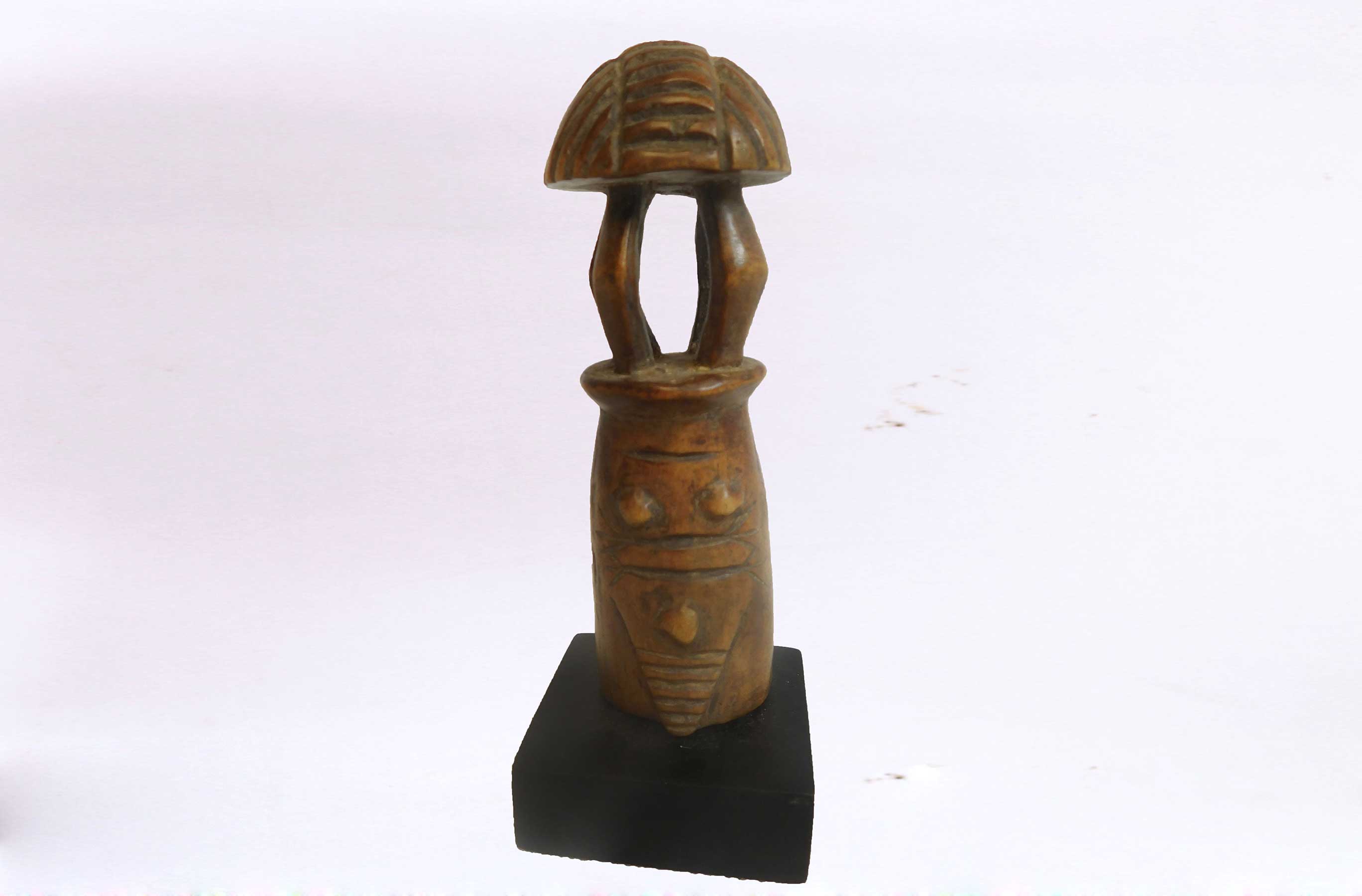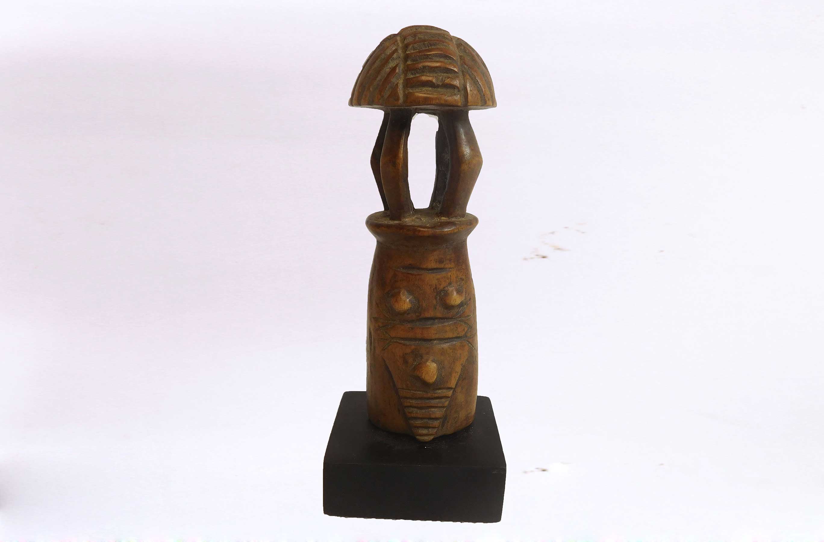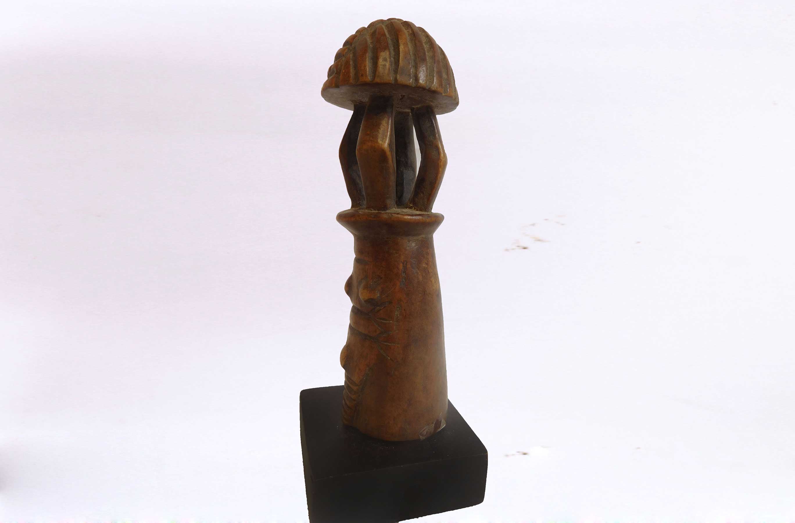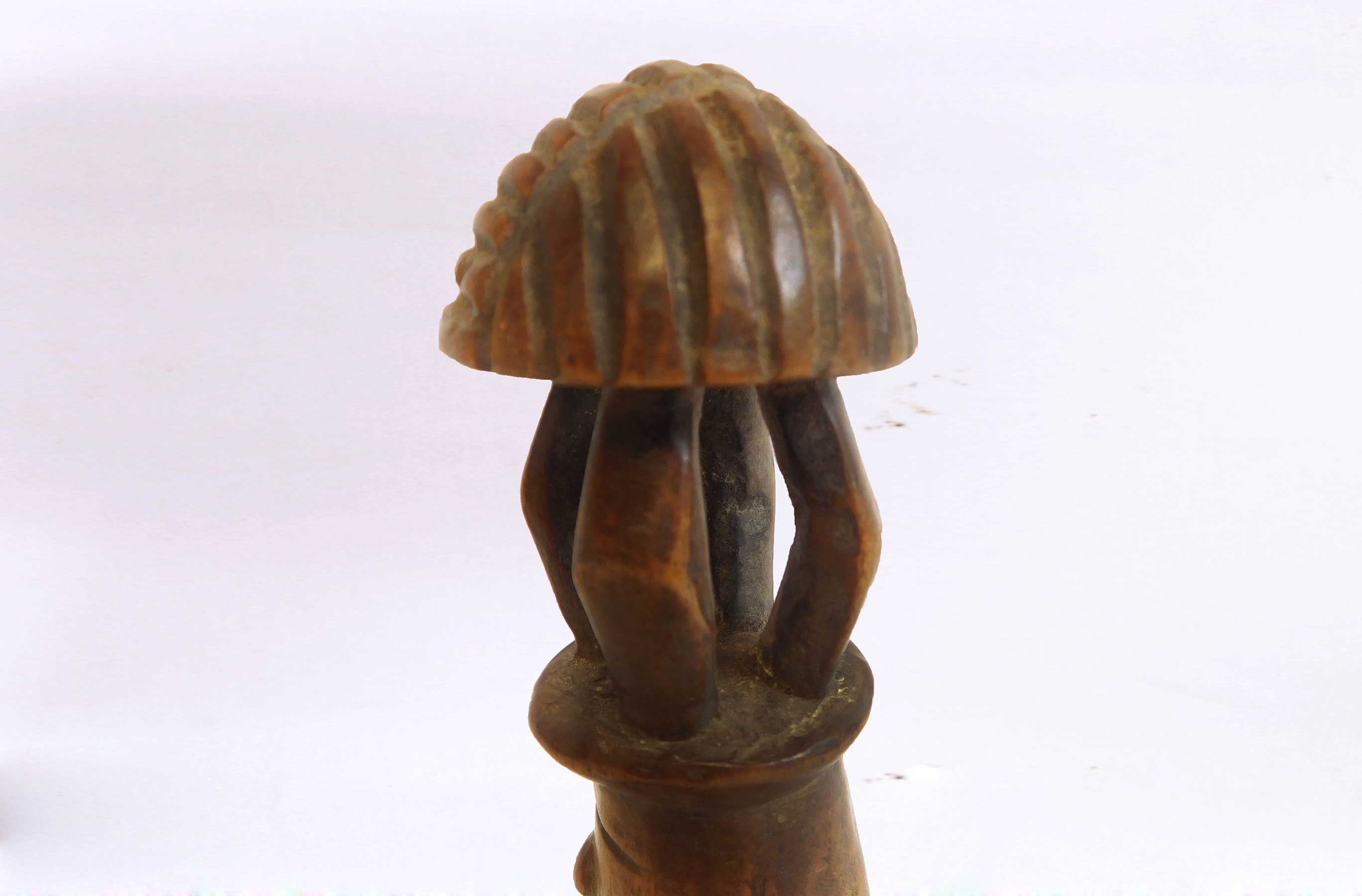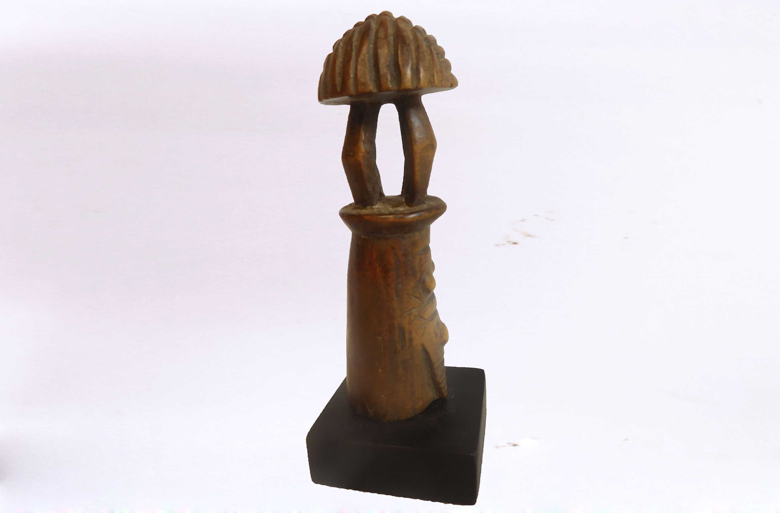 Such figurative sculptures were prestige objects used for divination purposes and also represented the lineage chiefs and sorcerers among the tribes’ people. This is an old miniature figure with formidable features, facial features, mushroom-like top and also a brown patina, it looks visibly old with considerable age.