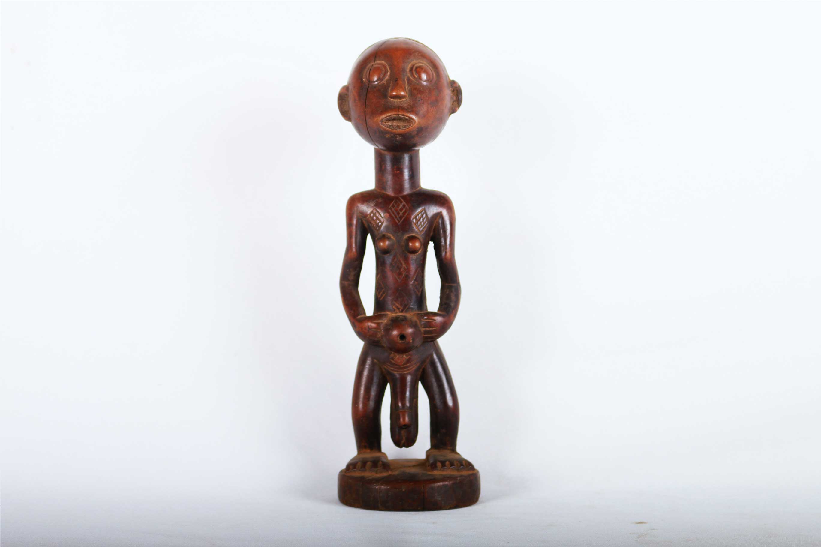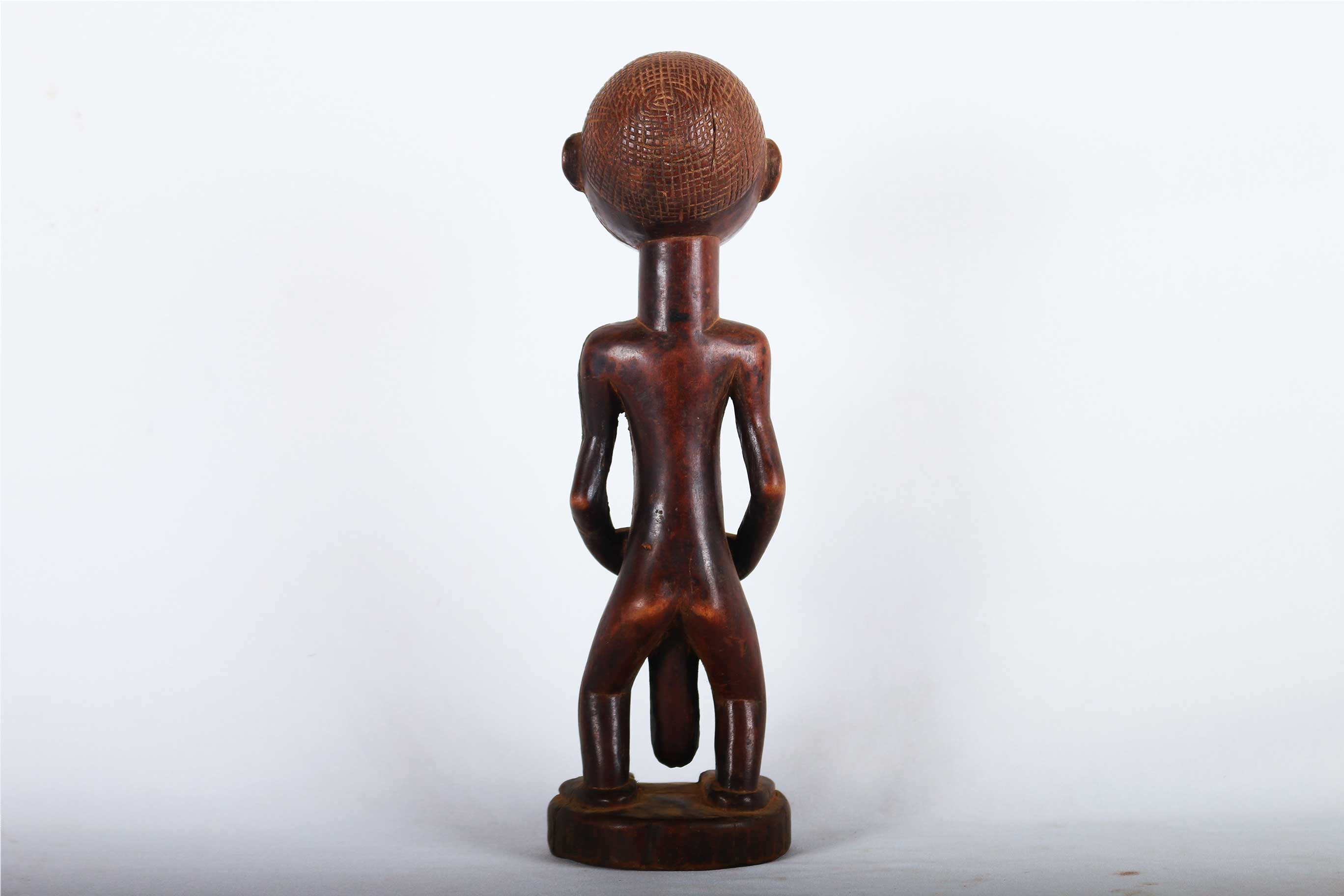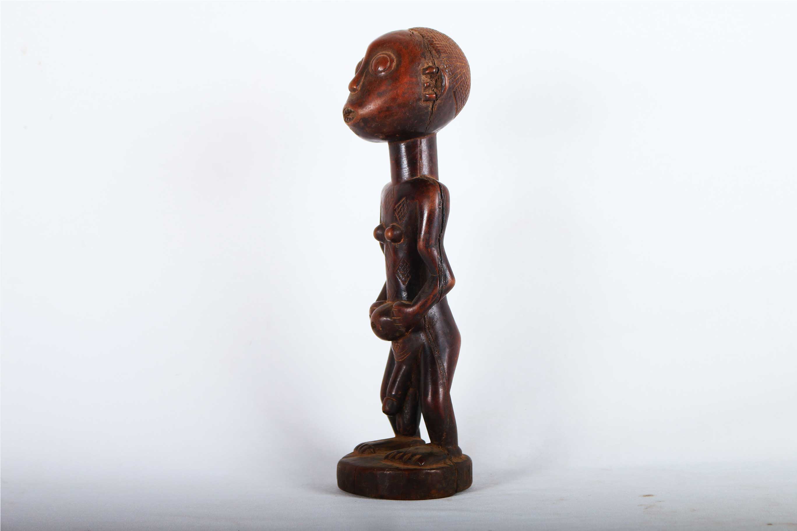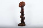 This is an old Tabwa sculpture made of wood, originating from the Fipa area in Congo is a fine example of elegant hand-carved sculptures from the Tabwa tribe. These figurative sculptures were prestige objects used for divination purposes and also represented the lineage chiefs and sorcerers among the tribes’ people. The following sculpture has a shinny brown patina and shows good signs of age and usage.