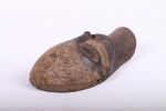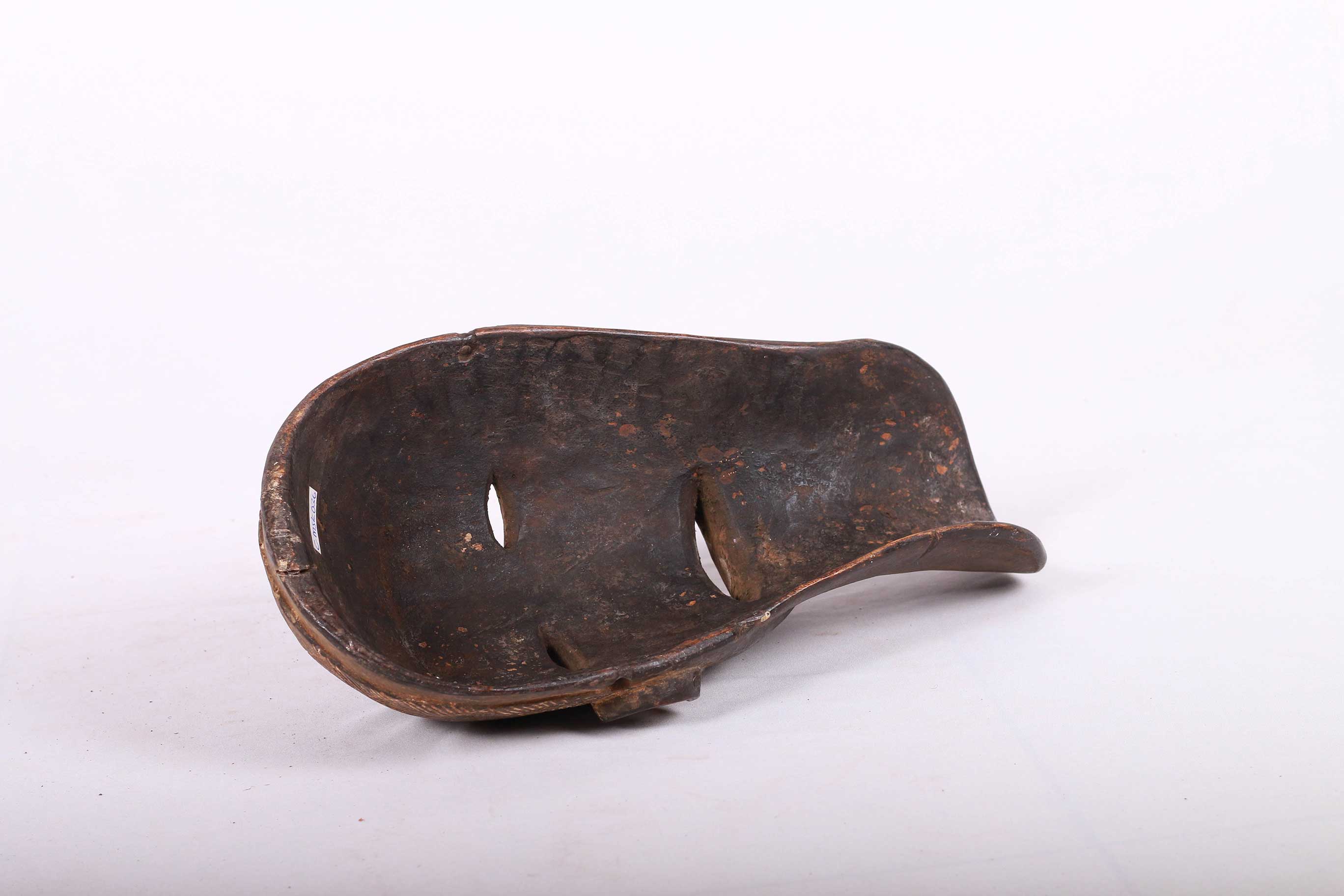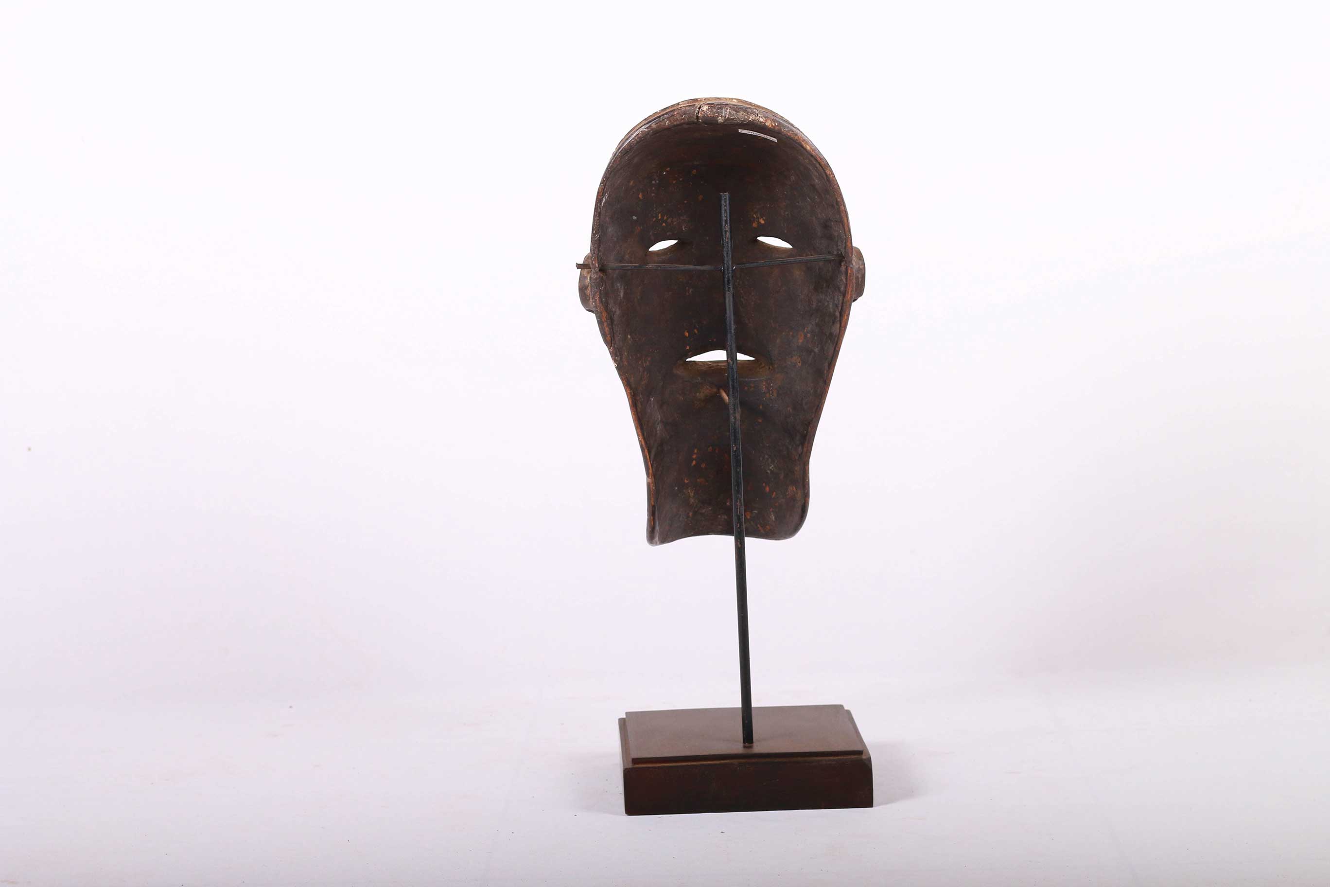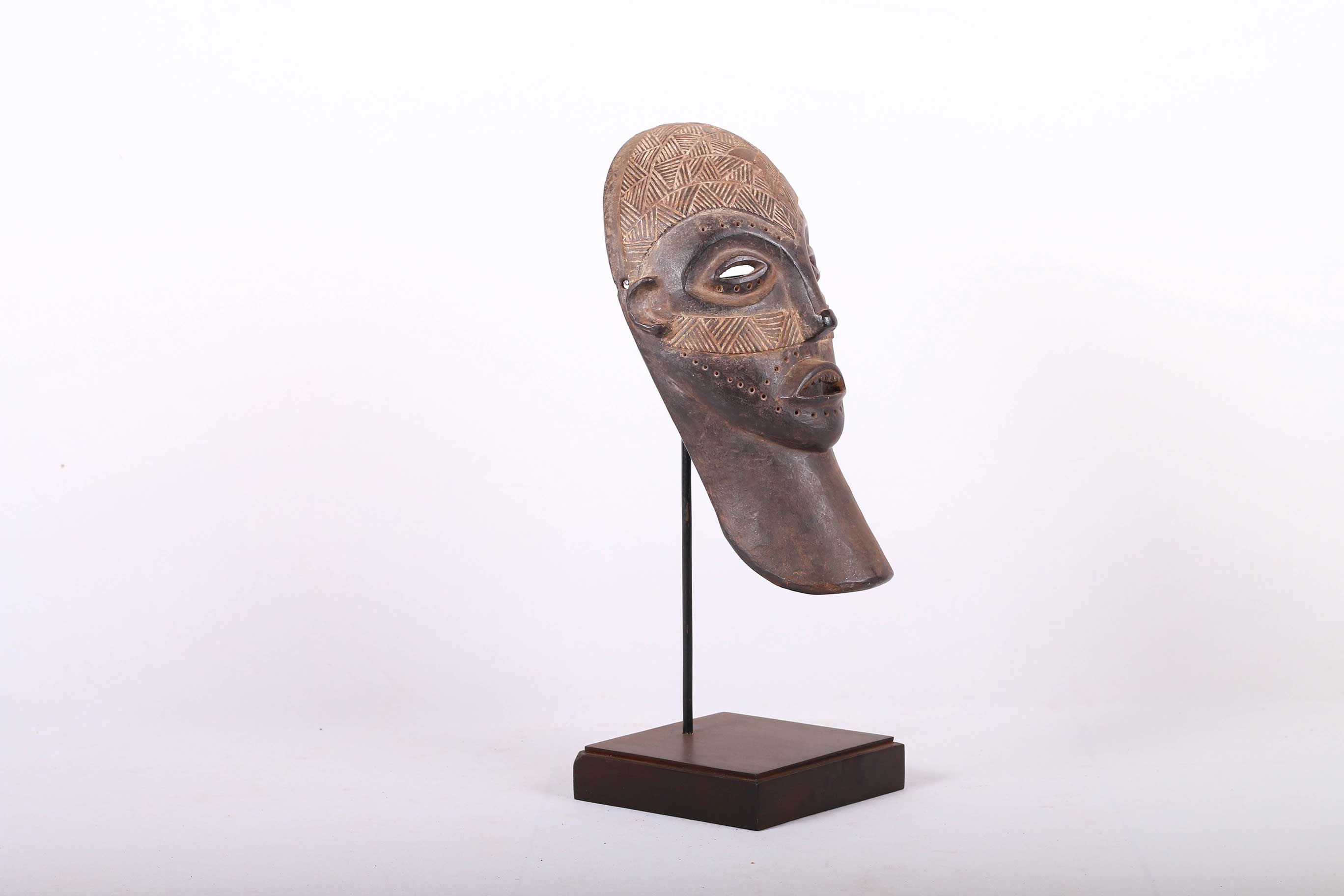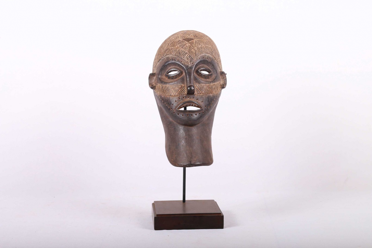 The Tabwa used two types of masks: a human one, which represented woman, and another in the form of a buffalo head, which represented man. Both would make an appearance at the time of the fecundity ritual, celebrated for sterile women. This is strongly believed to be a female mask because of the white scarifications covering the mask’s, there are also scarifications around the well-sculpted oval-shaped mouth opening, it has eye openings and a long neck, a brown patina and was carved with great sensitivity, shows traces of wear which show that mask was used a few times.