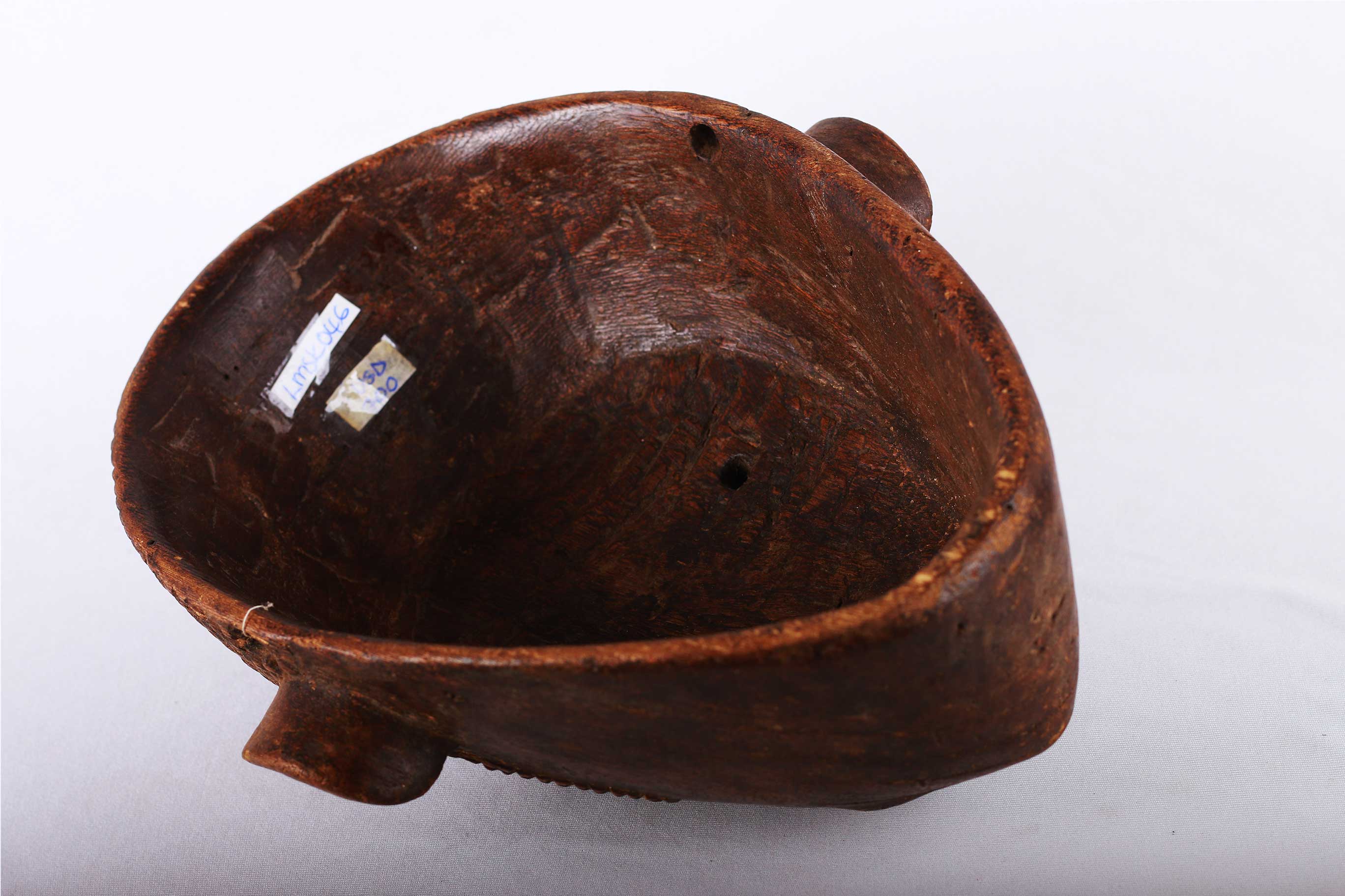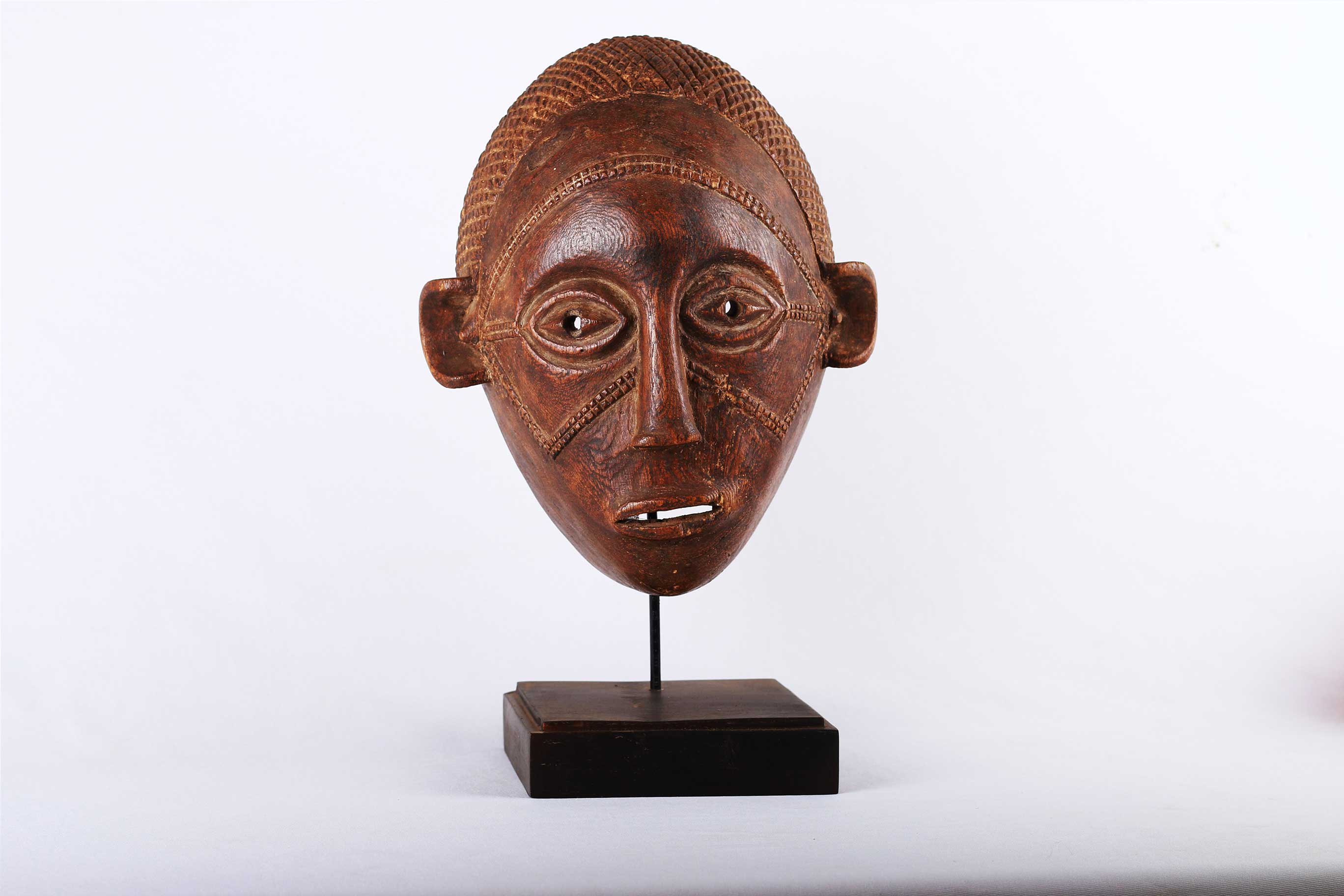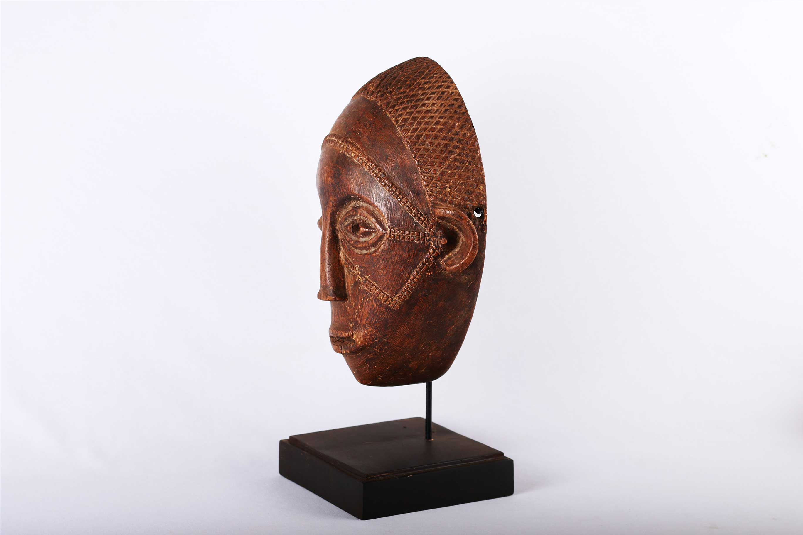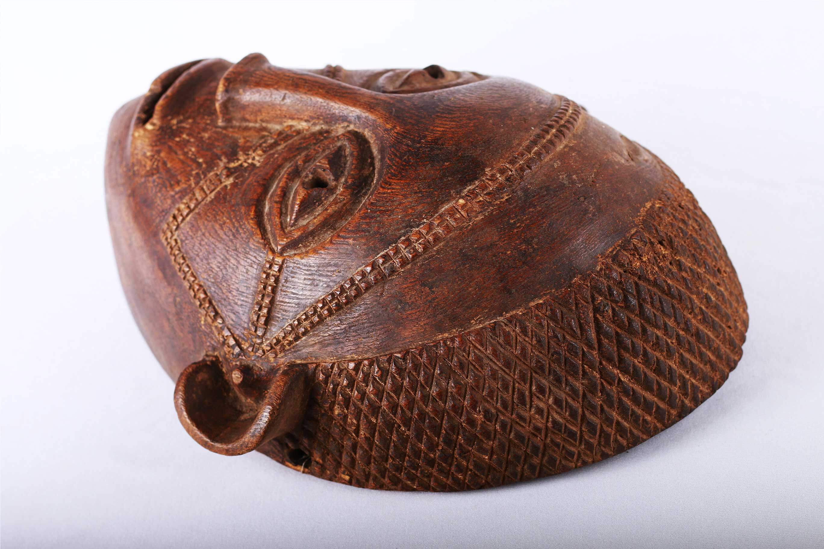 The Tabwa are an ethnic group living mainly on the southwestern shores of Lake Tanganyika, and in the eastern Democratic Republic of the Congo. Today, they are led by chiefs-sorcerers who rule over village chiefs and family chiefs. Their power is counterbalanced by male societies created on Luba prototypes and by female associations influenced by East African models. The Tabwa used two types of masks: a human one, which represented woman, and another in the form of a buffalo head, which represented man. Both would make an appearance at the time of the fecundity ritual, celebrated for sterile women. This is strongly believed to be a female mask because of the scarifications on the mask’s face, it has a brown patina and was carved with great sensitivity and visible signs of old age.
