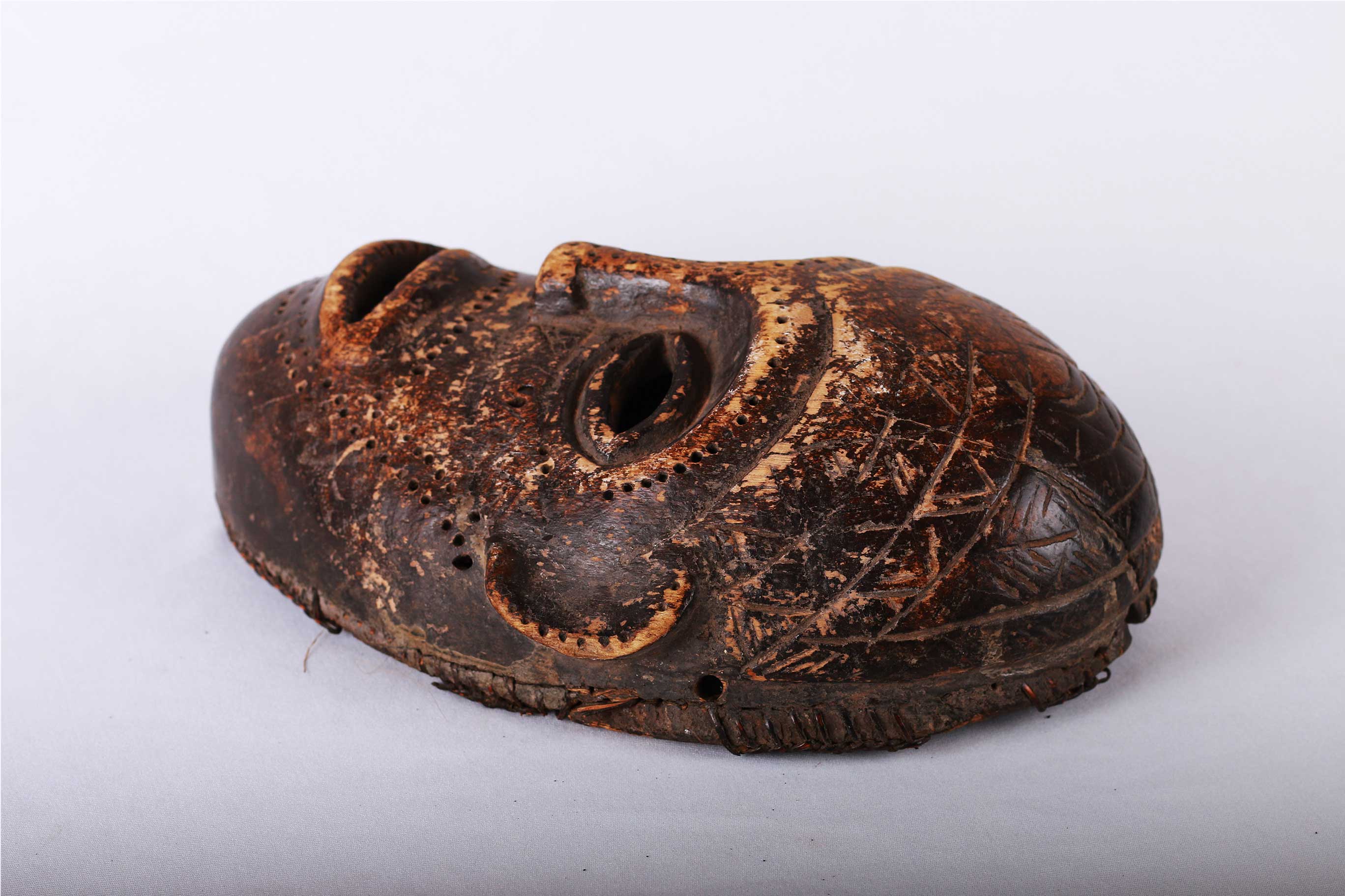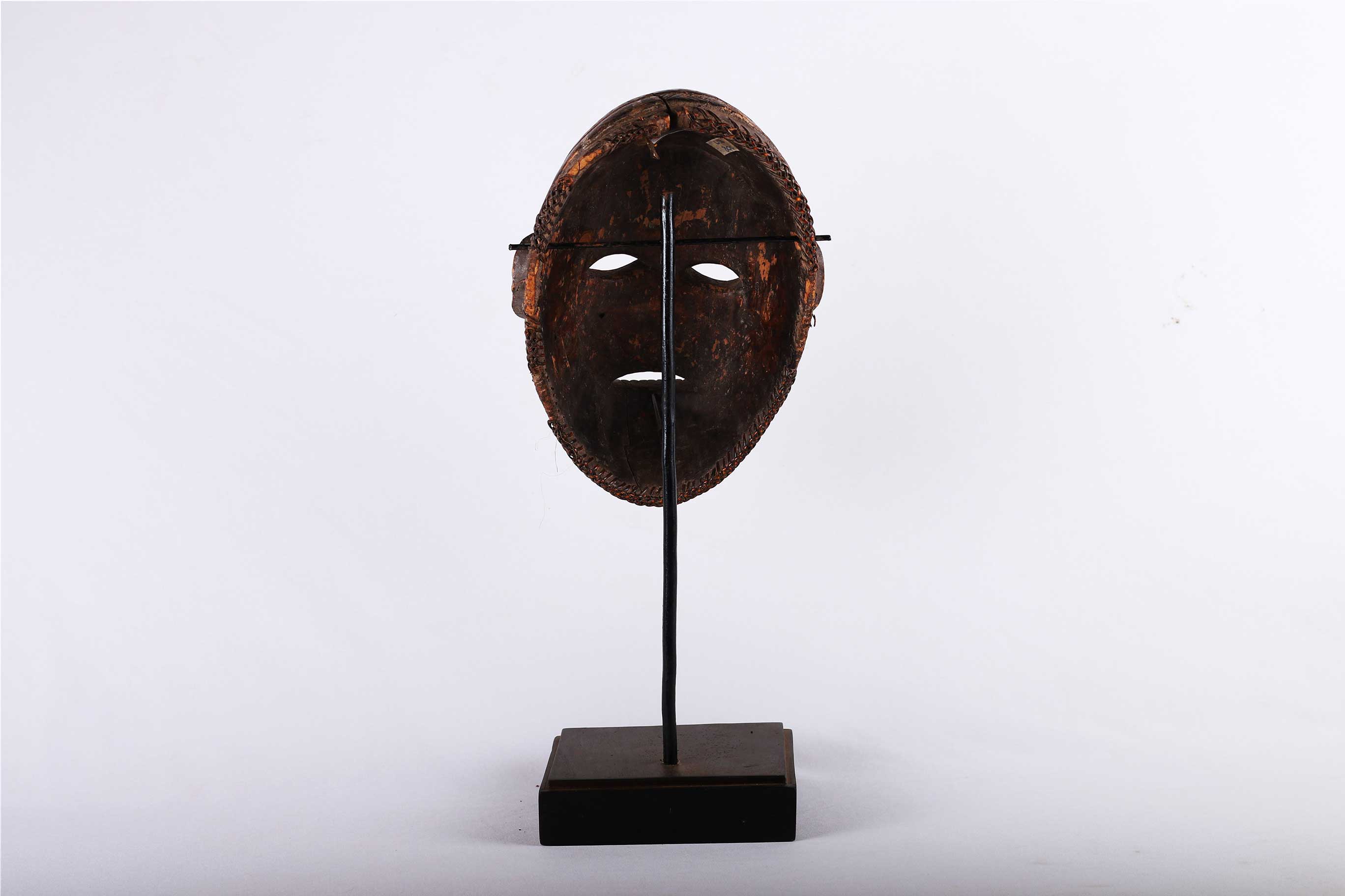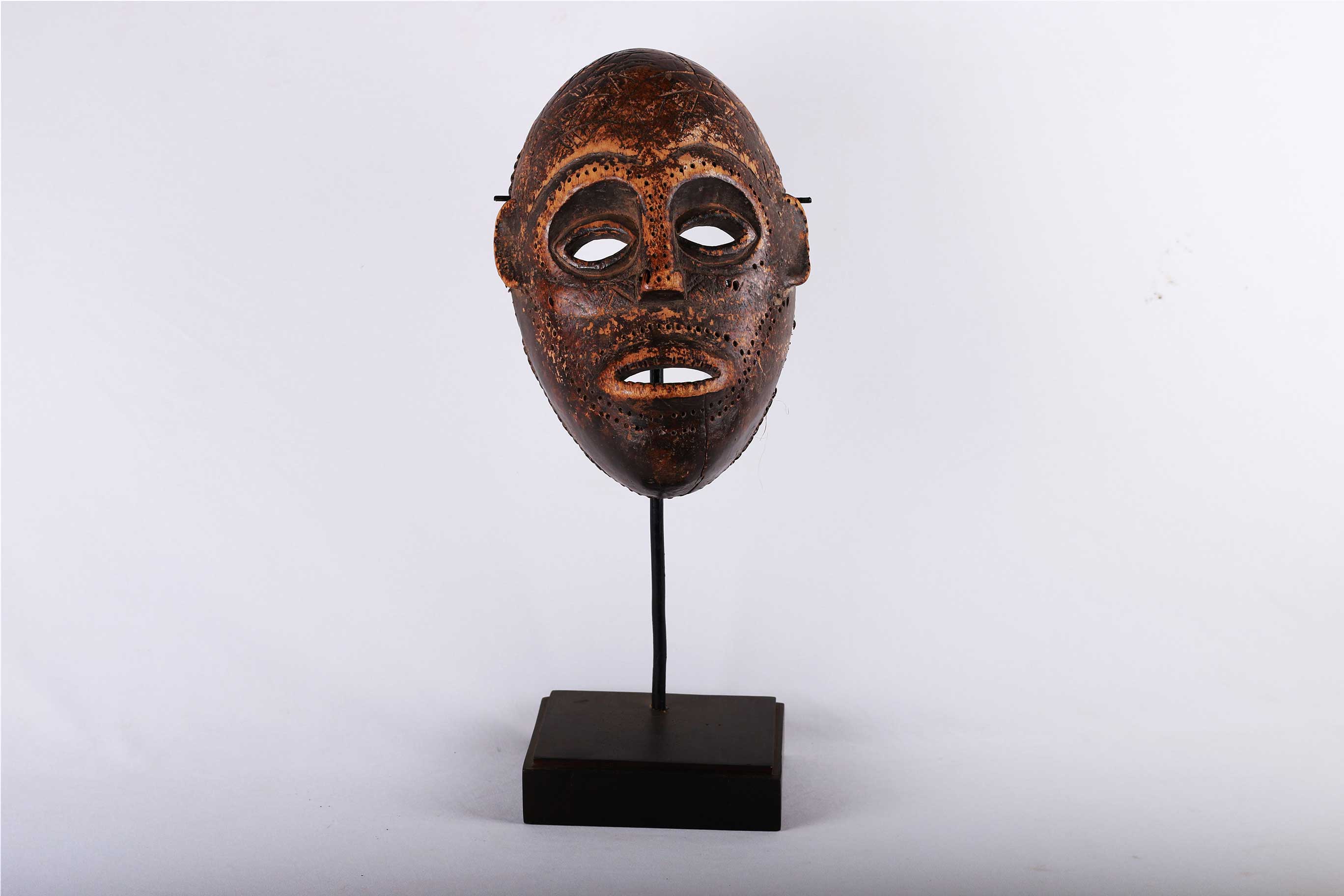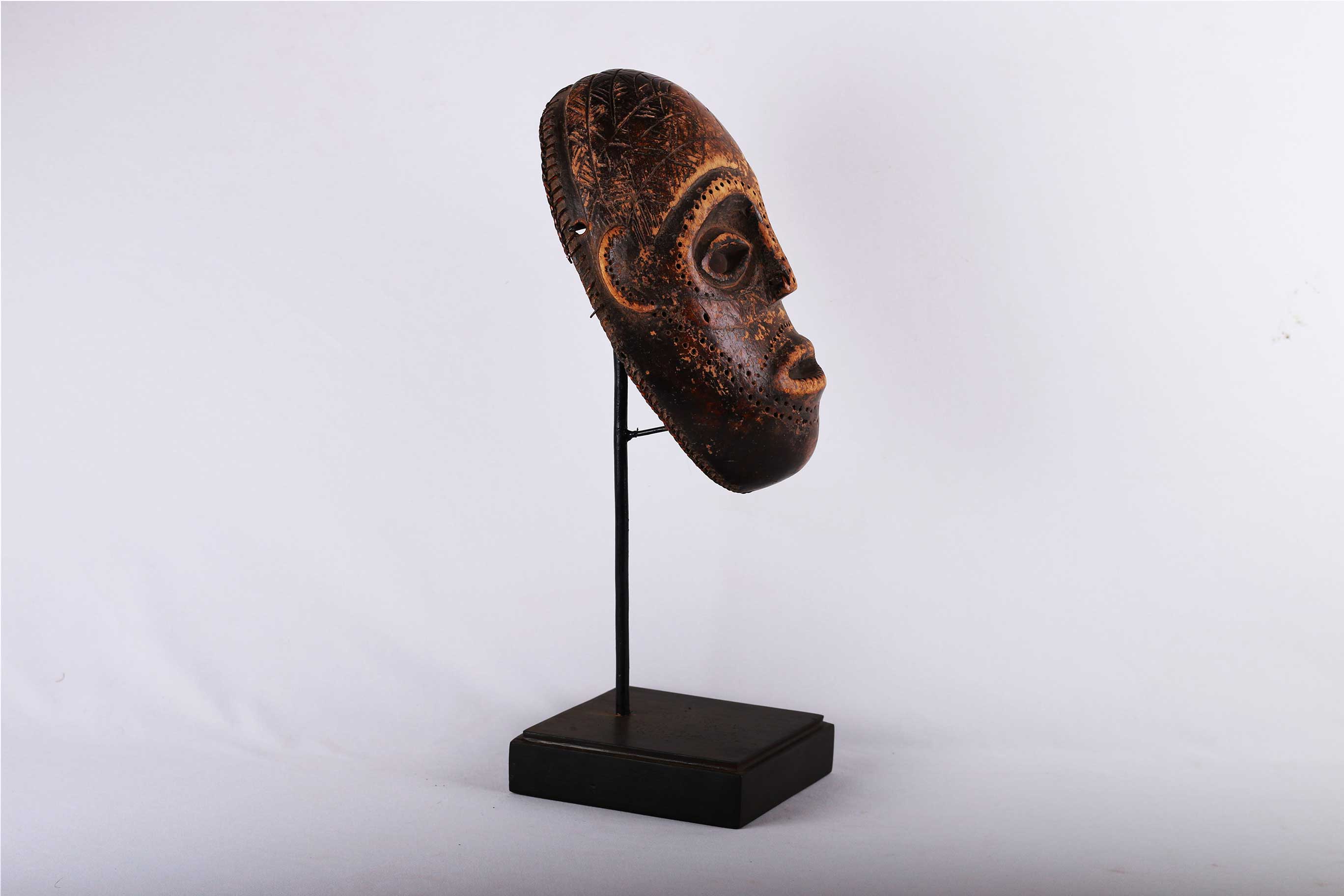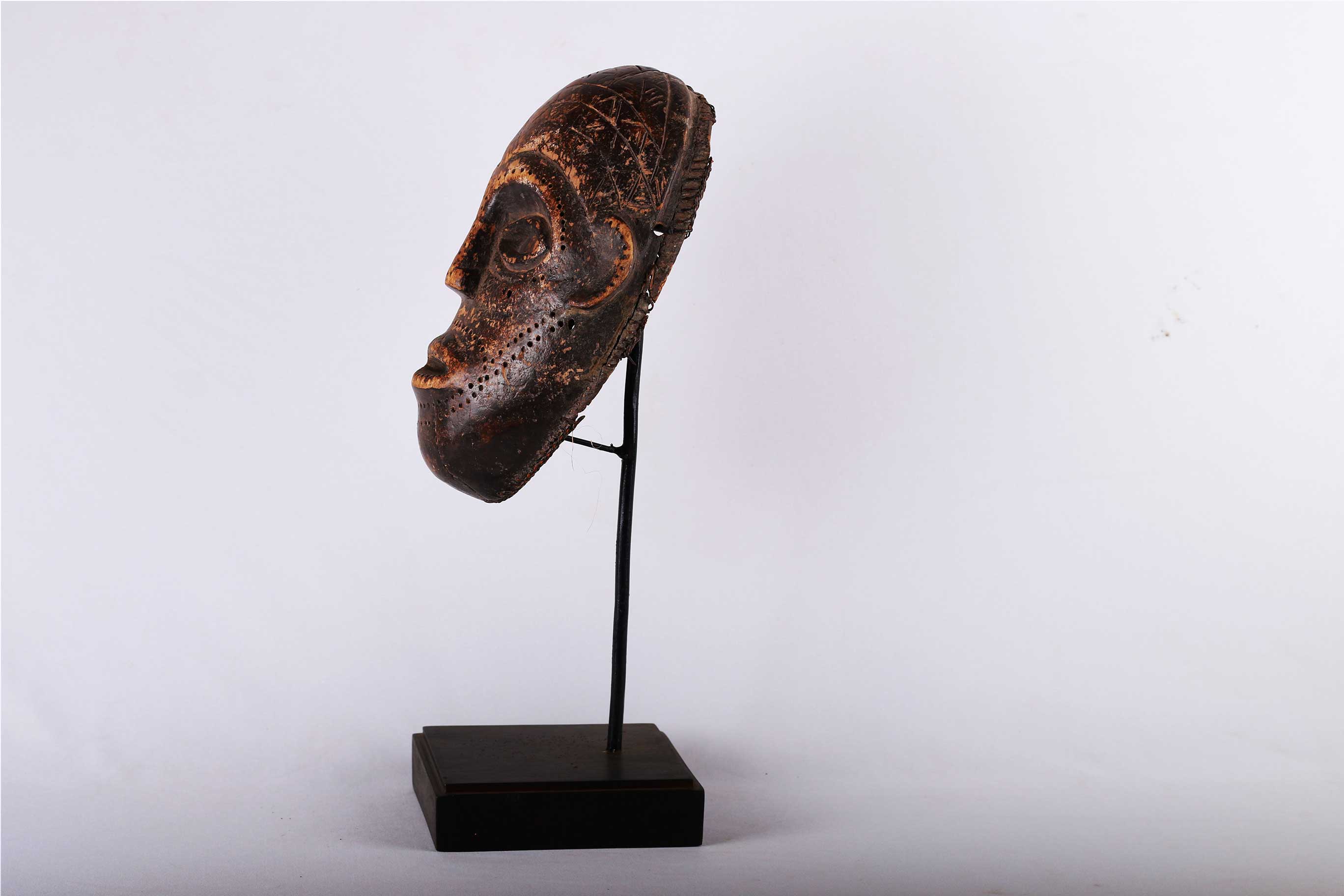 The Tabwa are an ethnic group living mainly on the southwestern shores of Lake Tanganyika, and in the eastern Democratic Republic of the Congo. Today, they are led by chiefs-sorcerers who rule over village chiefs and family chiefs. Their power is counterbalanced by male societies created on Luba prototypes and by female associations influenced by East African models. The Tabwa used two types of masks: a human one, which represented woman, and another in the form of a buffalo head, which represented man. Both would make an appearance at the time of the fecundity ritual, celebrated for sterile women. This is strongly believed to be a female mask because of the scarifications on the mask’s face around the eyes, ears, nose, and mouth, it has a brown patina and was carved with great sensitivity, shows traces of wear which show that mask was used a few times.