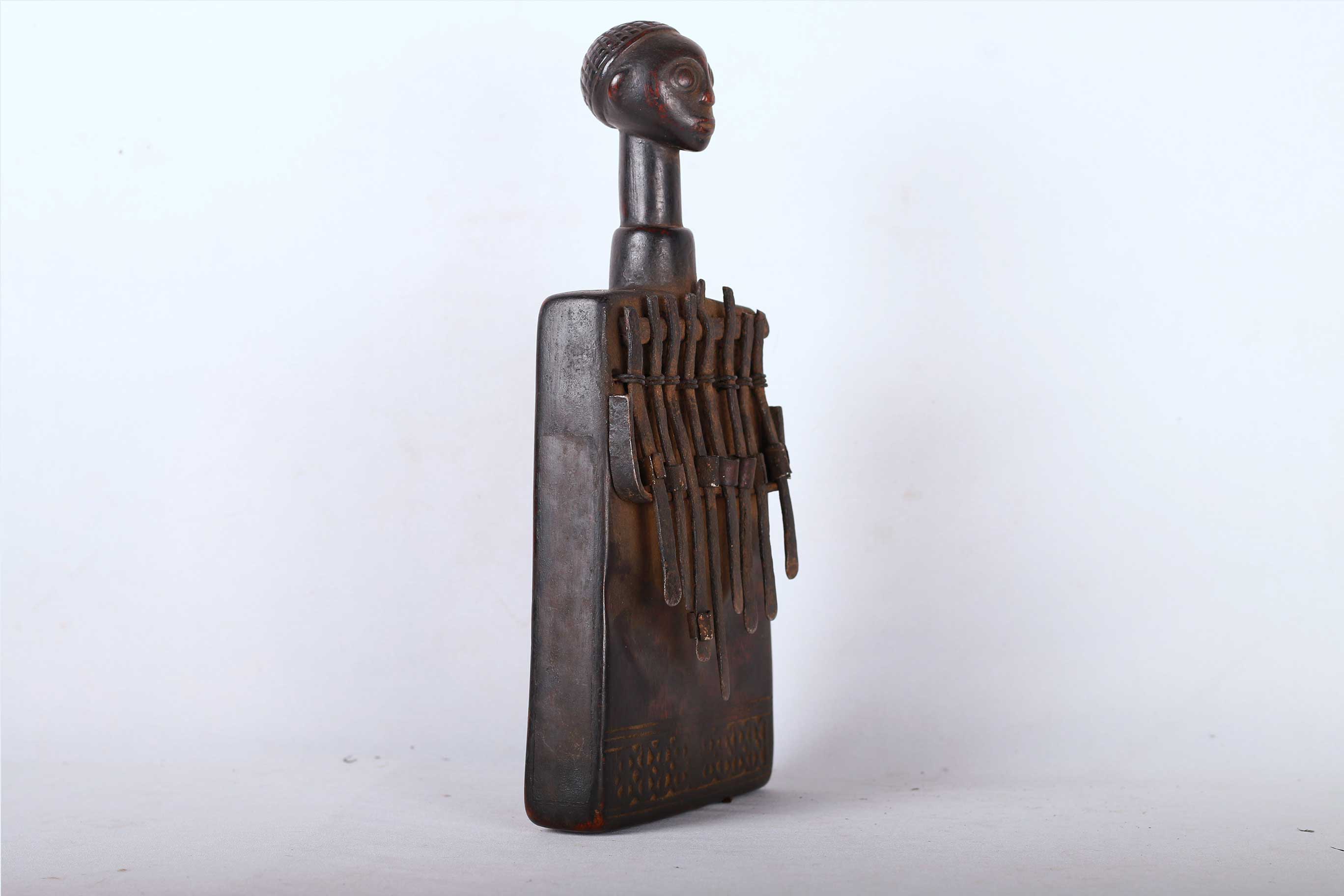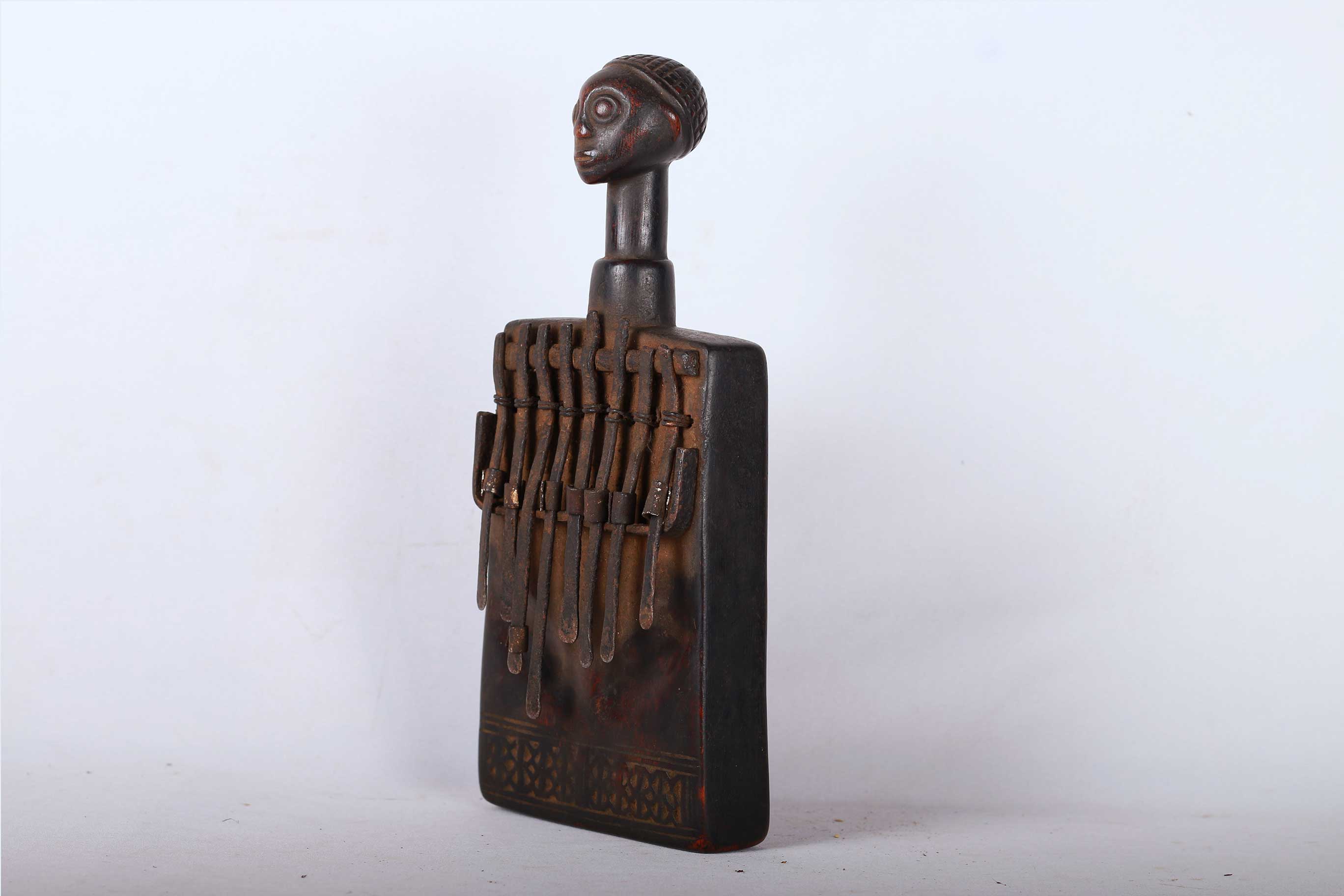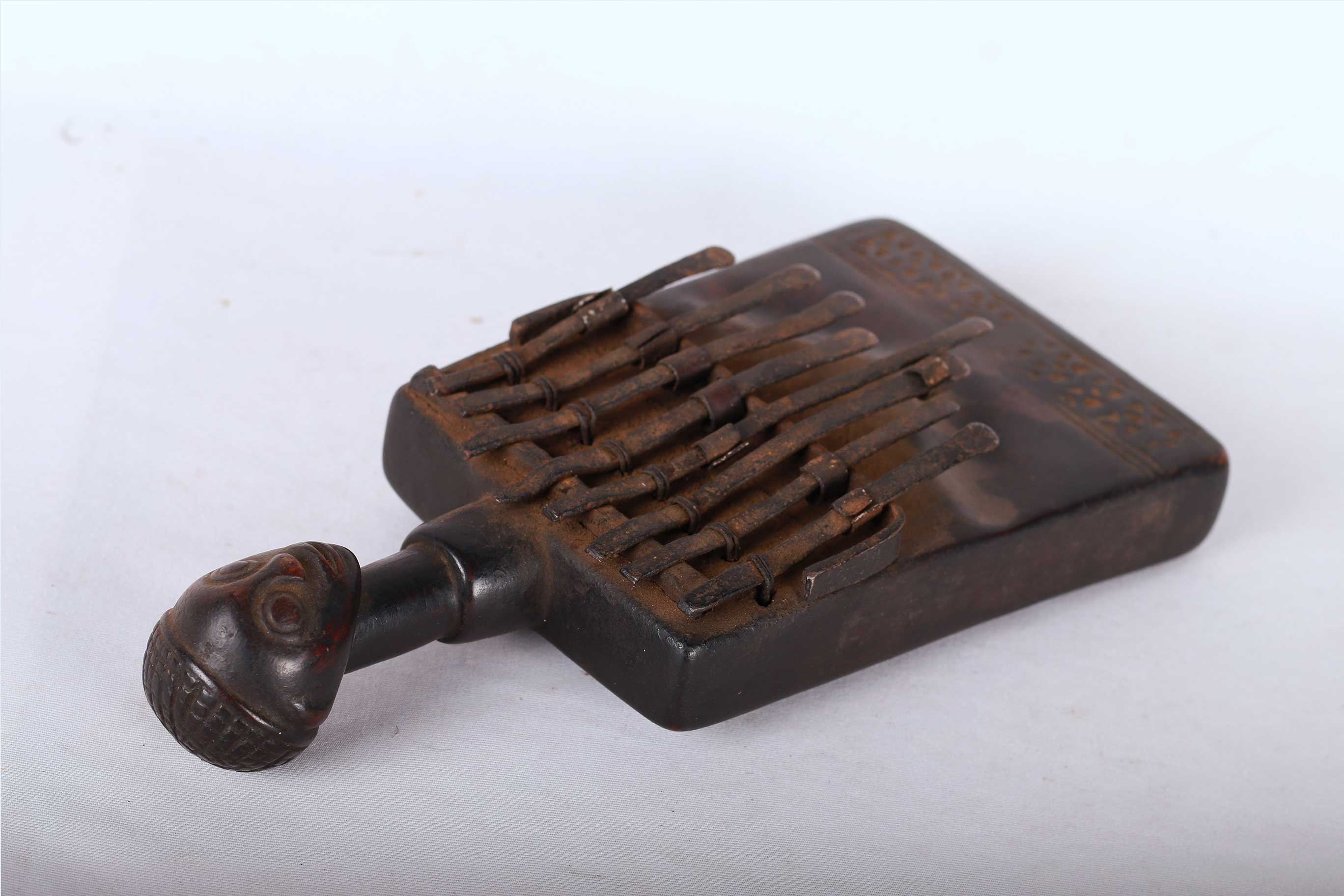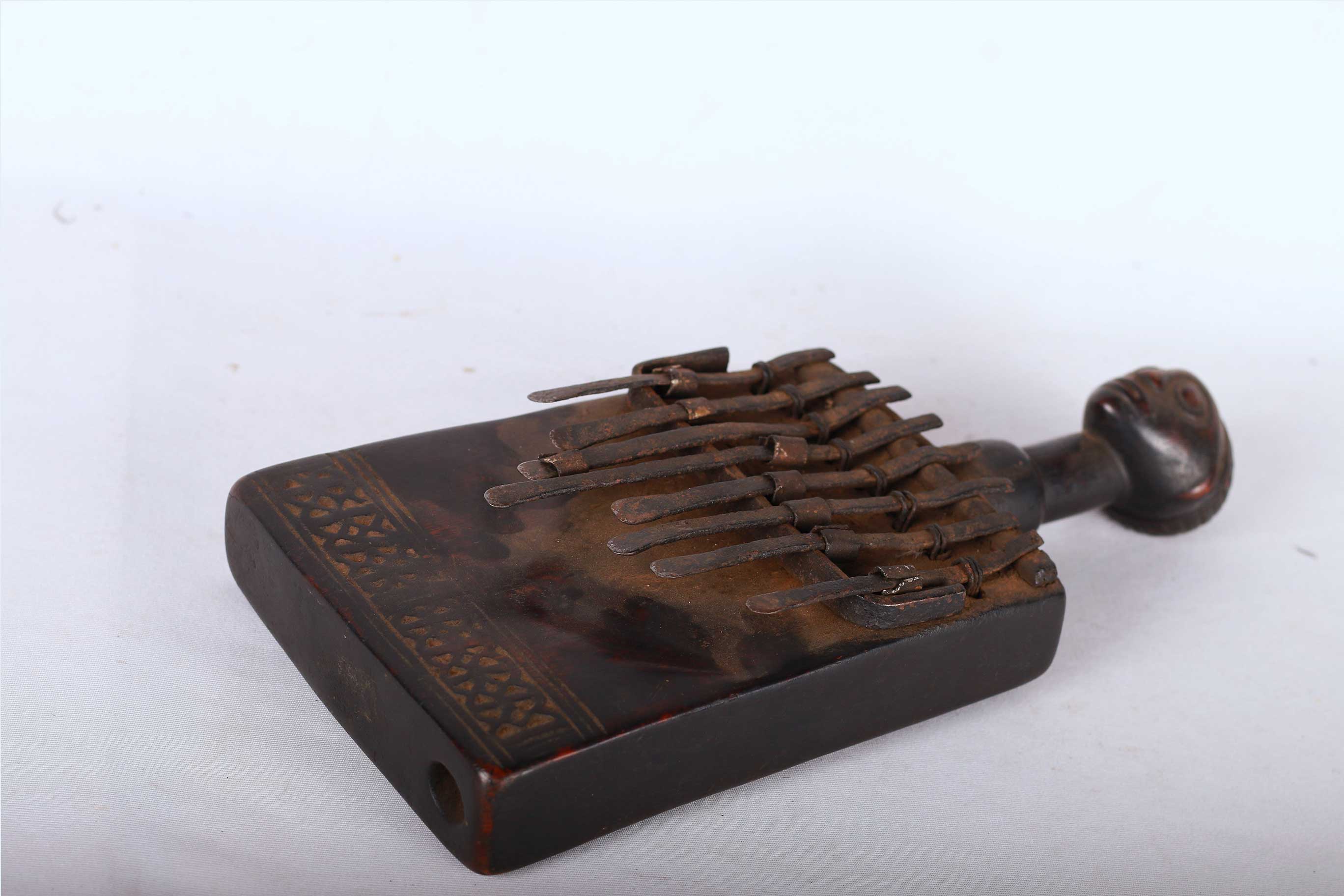Like it is the case with most African instruments, the traditional purpose of the thumb piano isn’t entertainment. It often has religious functions. Its sound may attract spirits and ancestors, seeking their advice. It may be played to honour certain people or to accompany weddings and funerals. This is a fine old music instrument and shows signs of age and usage
