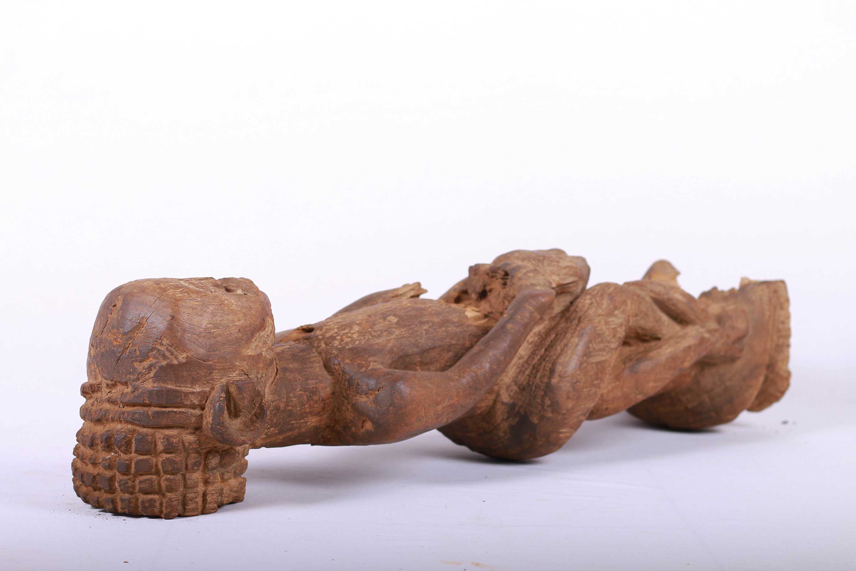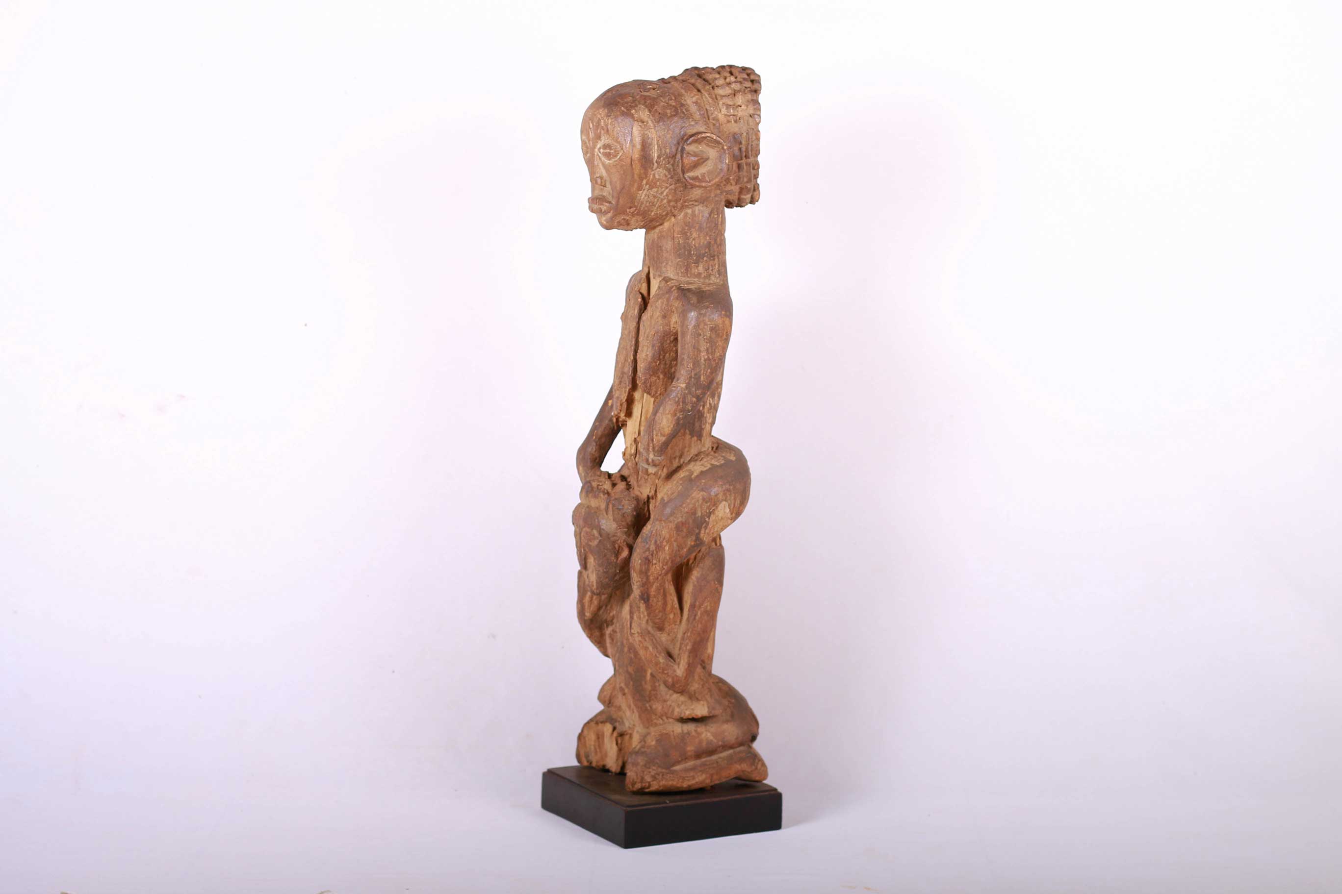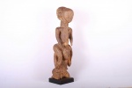This is a beautiful and elegant Tabwa sculpture, with a shinny brown patina carved from wood. The Tabwa are an ethnic group living mainly on the southwestern shores of Lake Tanganyika, and in the eastern Democratic Republic of the Congo. The Tabwa sculptures played a function of consolidating the power of the chiefs. This figure embodies the female ancestor of a Tabwa ruler. The creation of male and female ancestor figures by the Tabwa came about through changing power structures. New rulers wanted to prove that their right to rule was historically pre-determined so they commissioned sculptors to create wooden figures that reflected their chiefly ancestry. They were cared for by family elders who kept the figures in shrines within their compounds and made frequent offerings to them for the well-being of the family and its lineage.