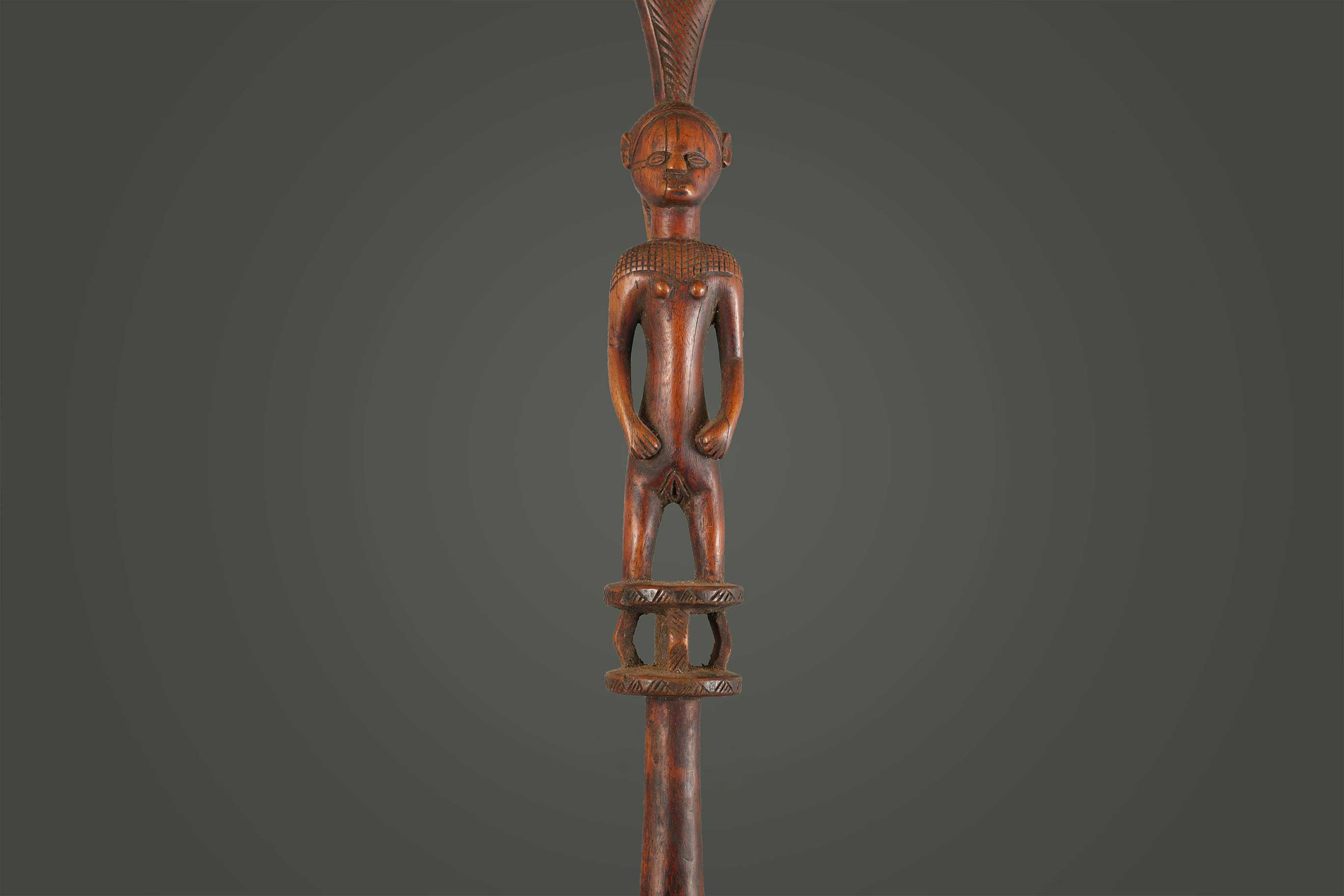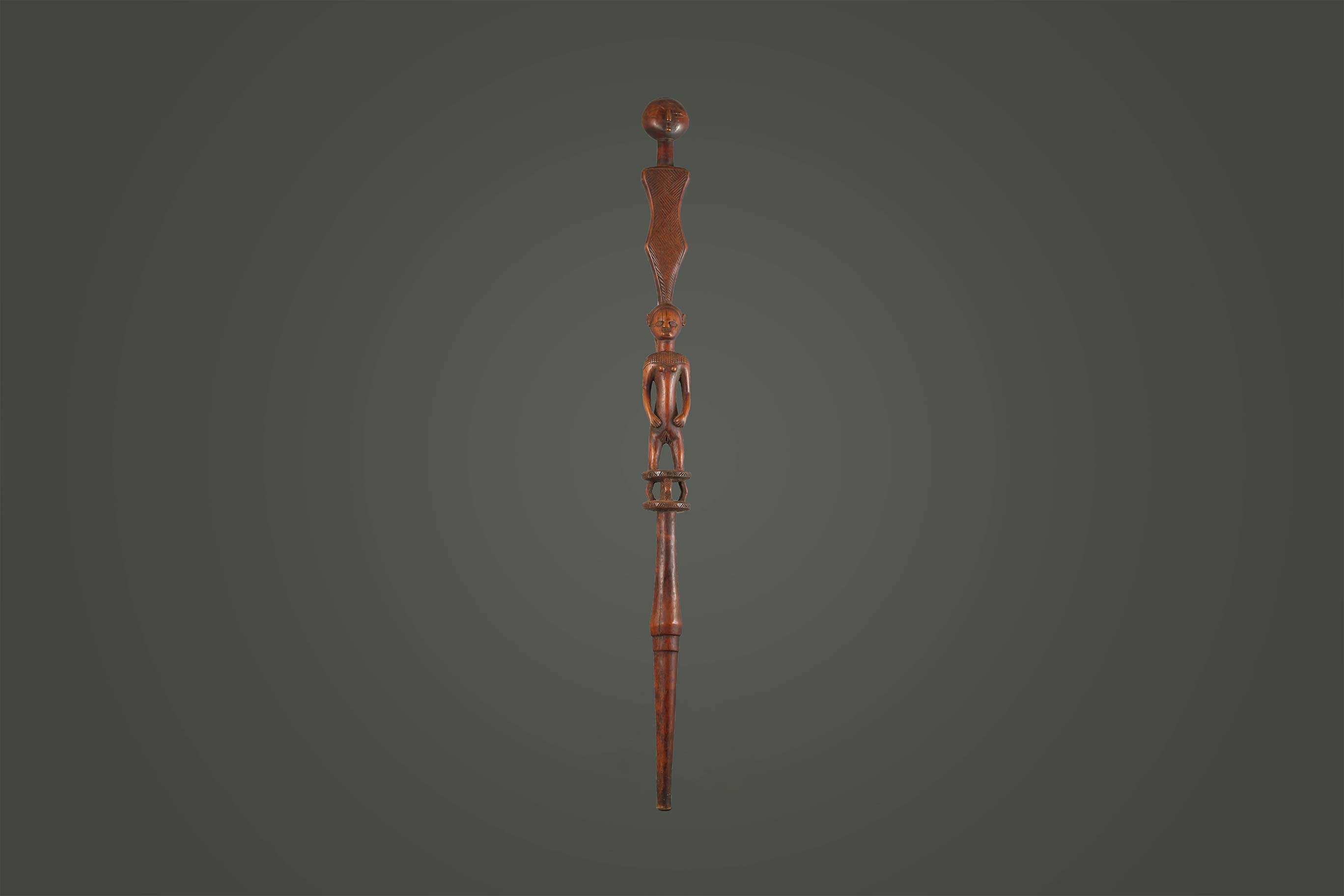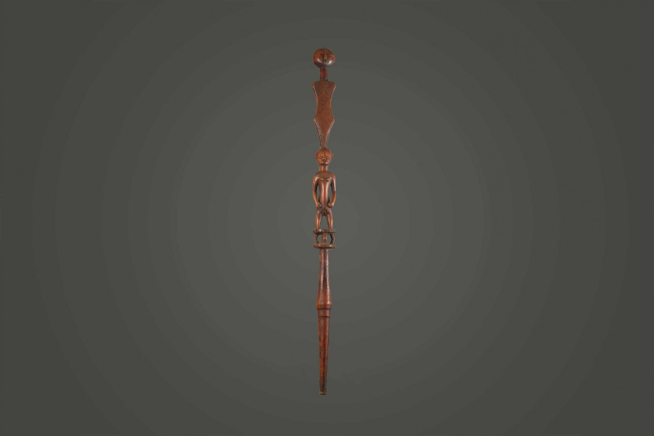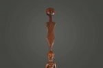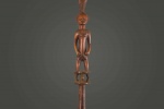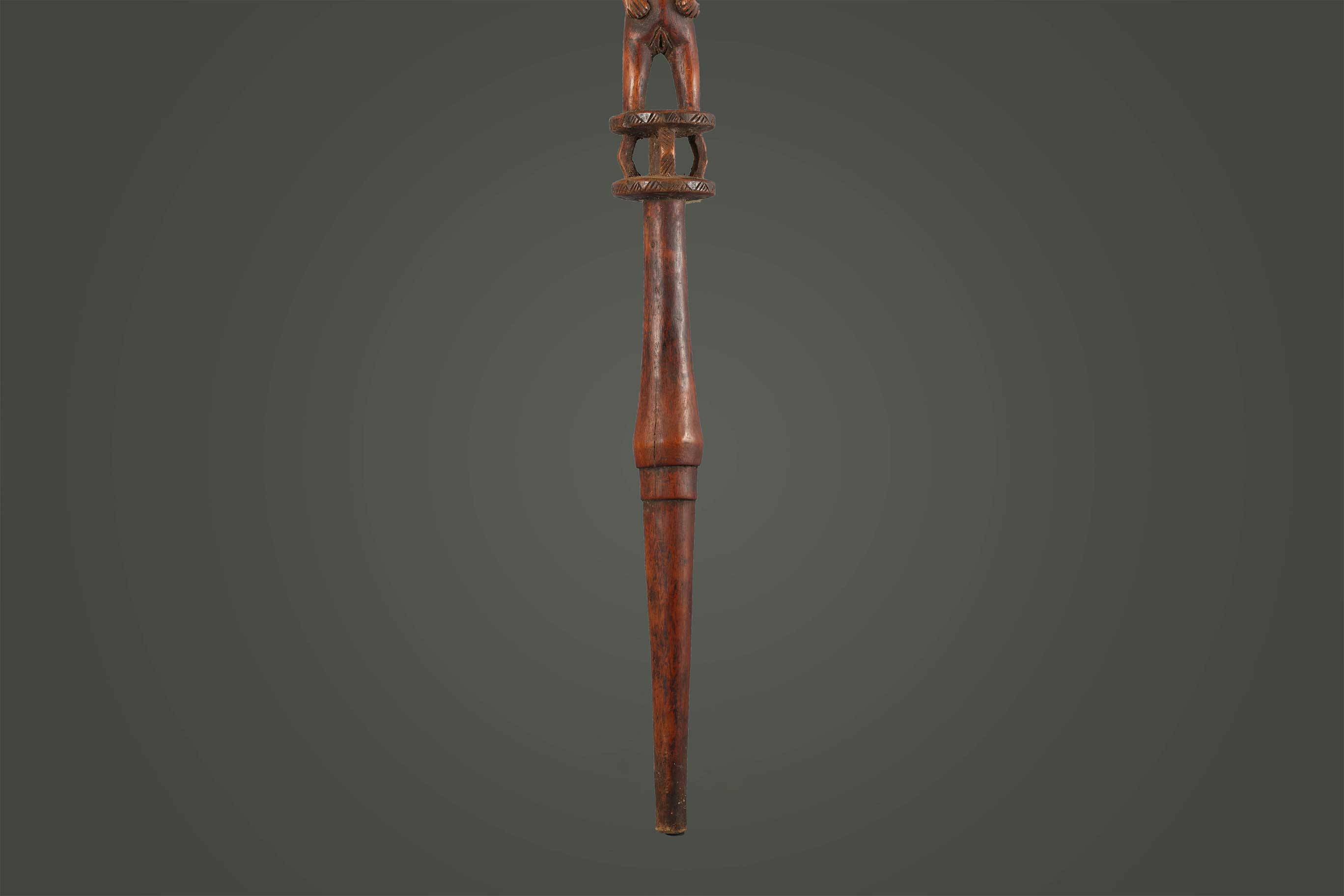 The Tabwa are an ethnic group living mainly on the southwestern shores of Lake Tanganyika, and in the eastern Democratic Republic of the Congo. Today, they are led by chiefs-sorcerers who rule over village chiefs and family chiefs. These ceremonial staffs would have an ancestral figure that might represent the portrait of the ancestor, or the faces might resemble the carrier. Whenever a staff was decorated with a female figure, it was generally used to show specific traits within the carrier. For instance, a wooden staff can show the expression, high forehead, and bodily ornaments revealed the positive qualities the leader might have possessed at the time he carried it. A large forehead meant wisdom, while ornaments around the figure were meant to show social achievement. Among the Tabwa, women’s bodies are considered to be carriers of spirituality and divinity, so female figures adorning the staffs are highly valuable. The following staff has a brown patina and looks visibly old.