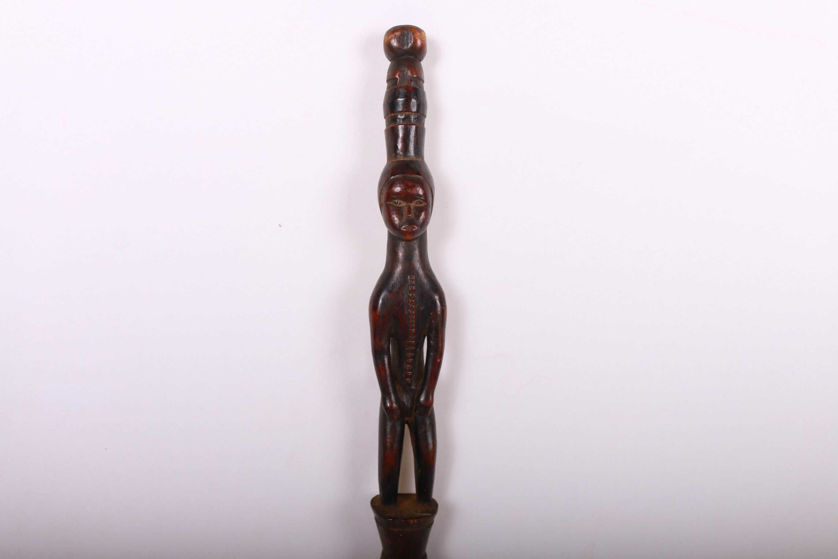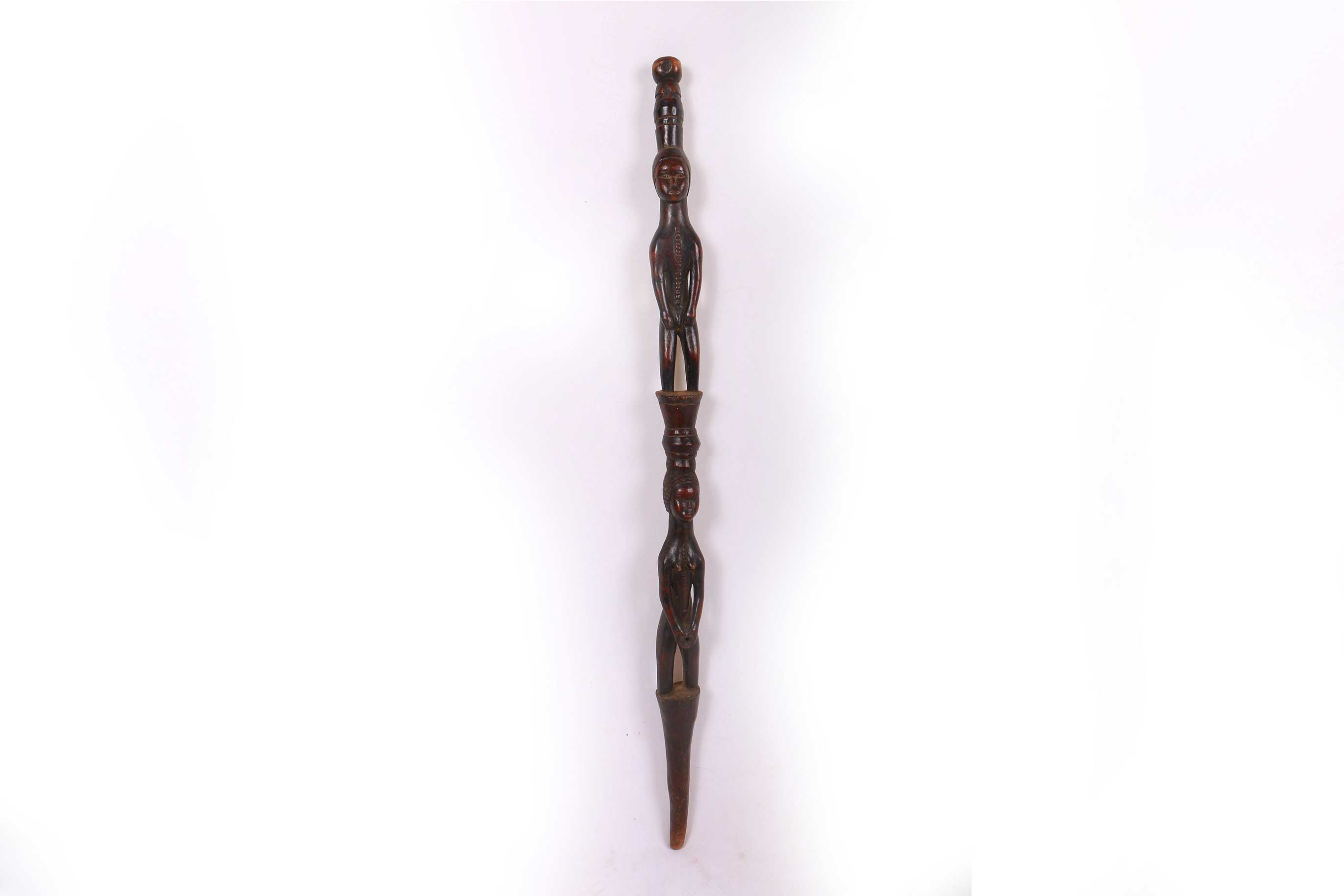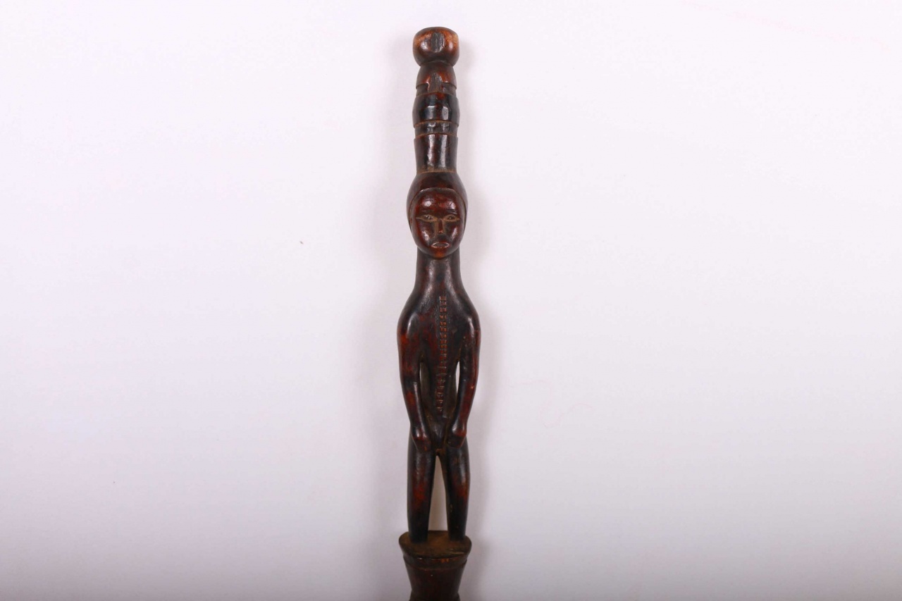These ceremonial staffs would have an ancestral figure that might represent the portrait of the ancestor, or the faces might resemble the carrier. Whenever a staff was decorated with a female figure, it was generally used to show specific traits within the carrier. For instance, a wooden staff can show the expression, high forehead, and bodily ornaments revealed the positive qualities the leader might have possessed at the time he carried it. A large forehead meant wisdom, while ornaments around the figure were meant to show social achievement. Among the Tabwa, women’s bodies are considered to be carriers of spirituality and divinity, so female figures adorning the staffs are highly valuable. The following staff has a shinny brown patina and looks visibly old.
