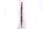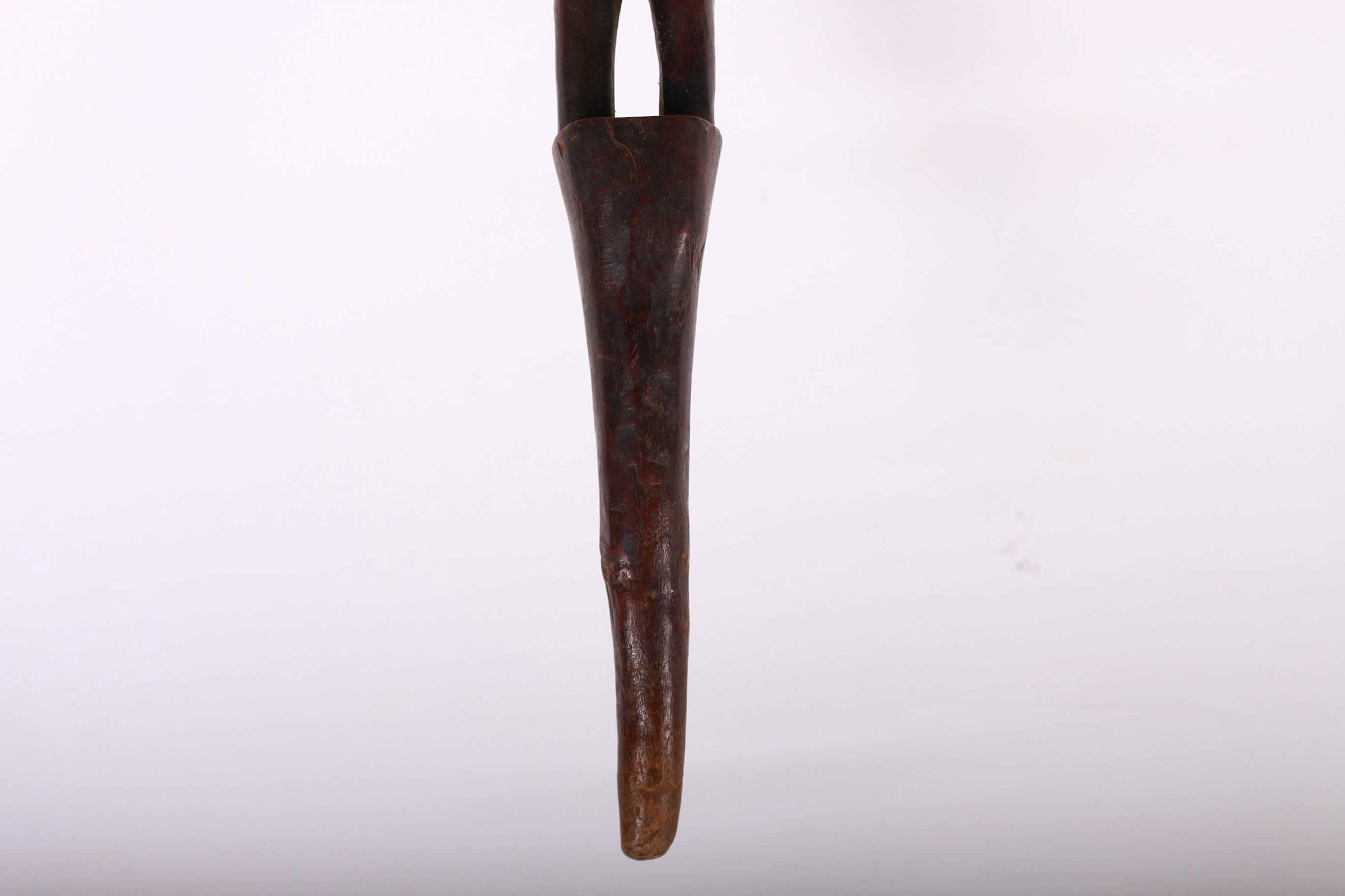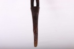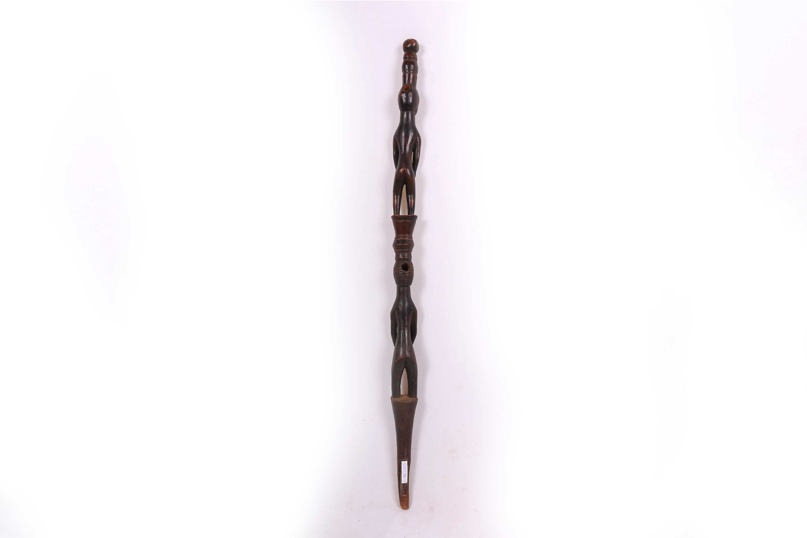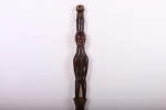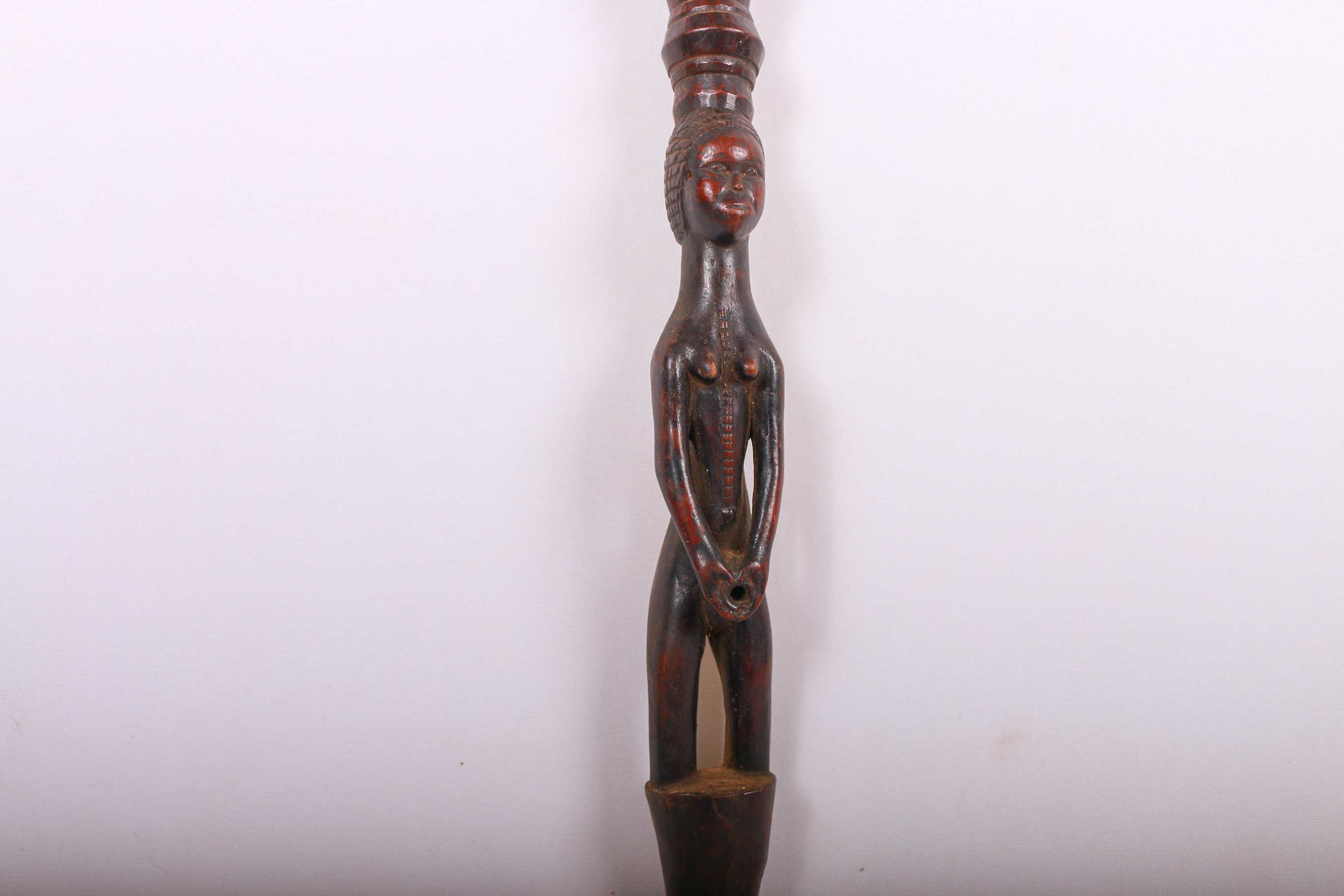 These ceremonial staffs would have an ancestral figure that might represent the portrait of the ancestor, or the faces might resemble the carrier. Whenever a staff was decorated with a female figure, it was generally used to show specific traits within the carrier. For instance, a wooden staff can show the expression, high forehead, and bodily ornaments revealed the positive qualities the leader might have possessed at the time he carried it. A large forehead meant wisdom, while ornaments around the figure were meant to show social achievement. Among the Tabwa, women’s bodies are considered to be carriers of spirituality and divinity, so female figures adorning the staffs are highly valuable. The following staff has a shinny brown patina and looks visibly old.