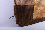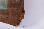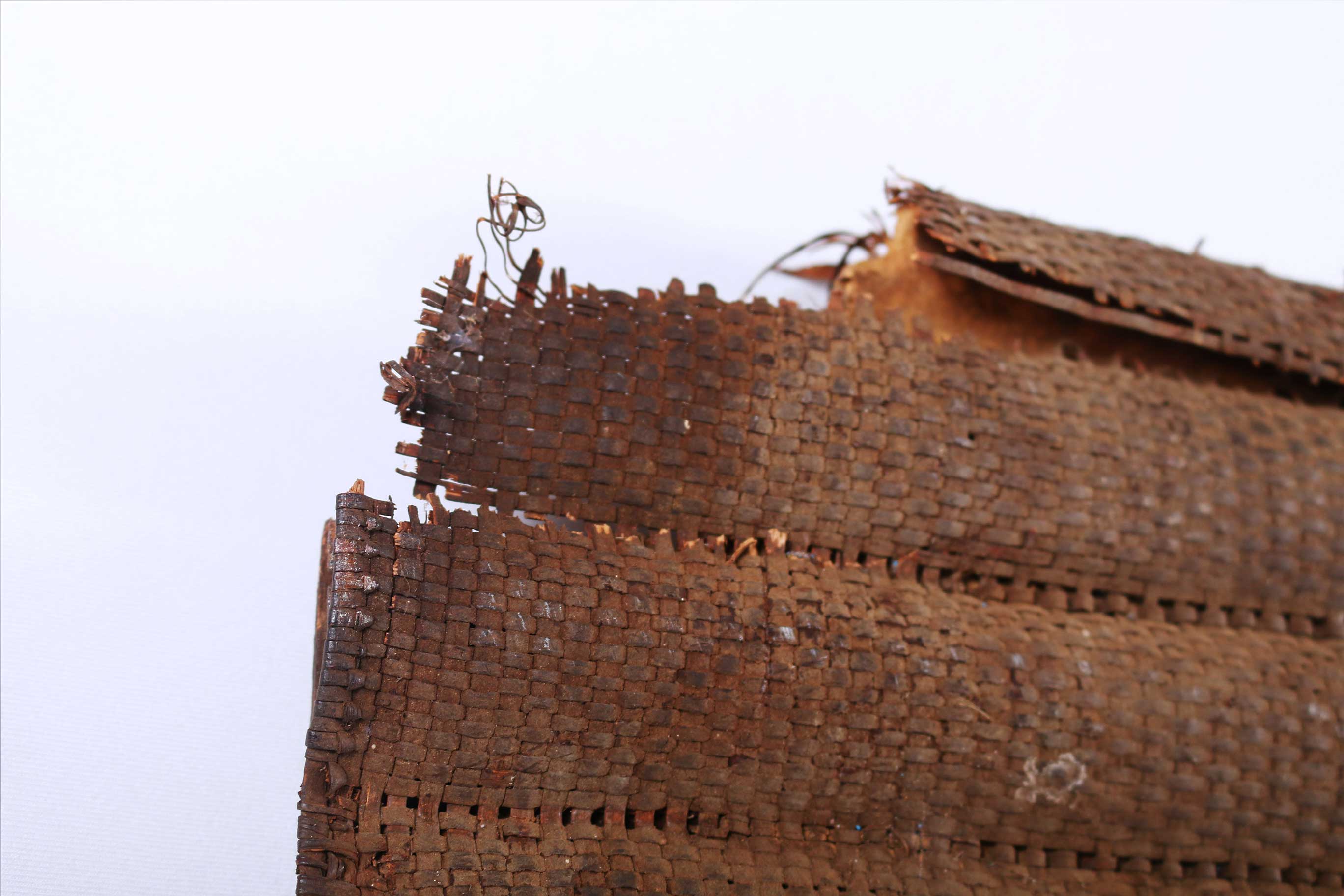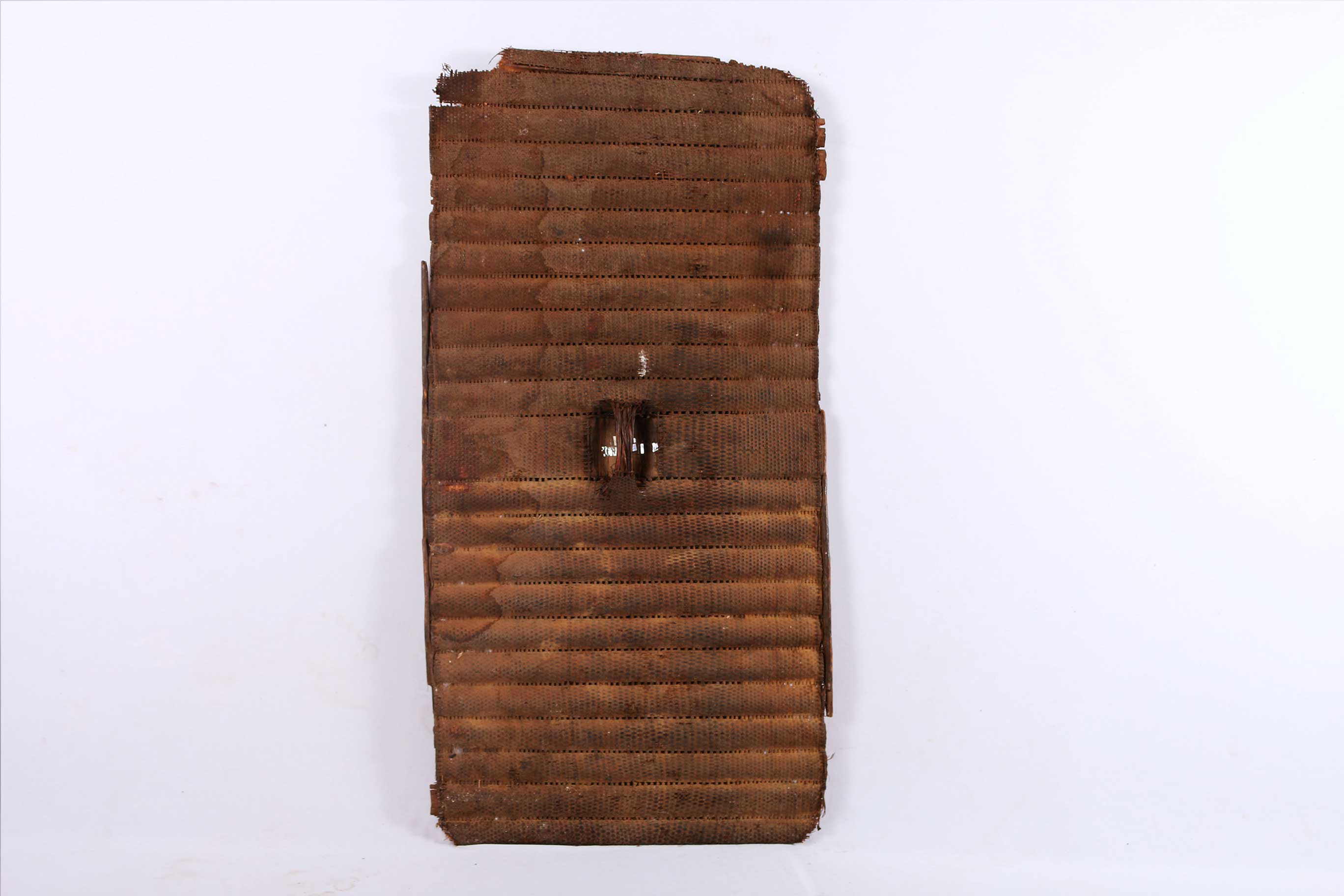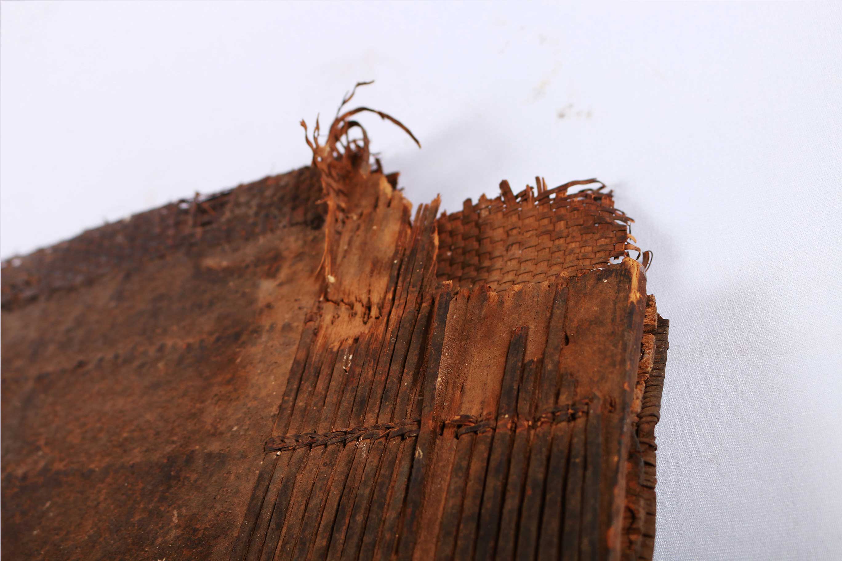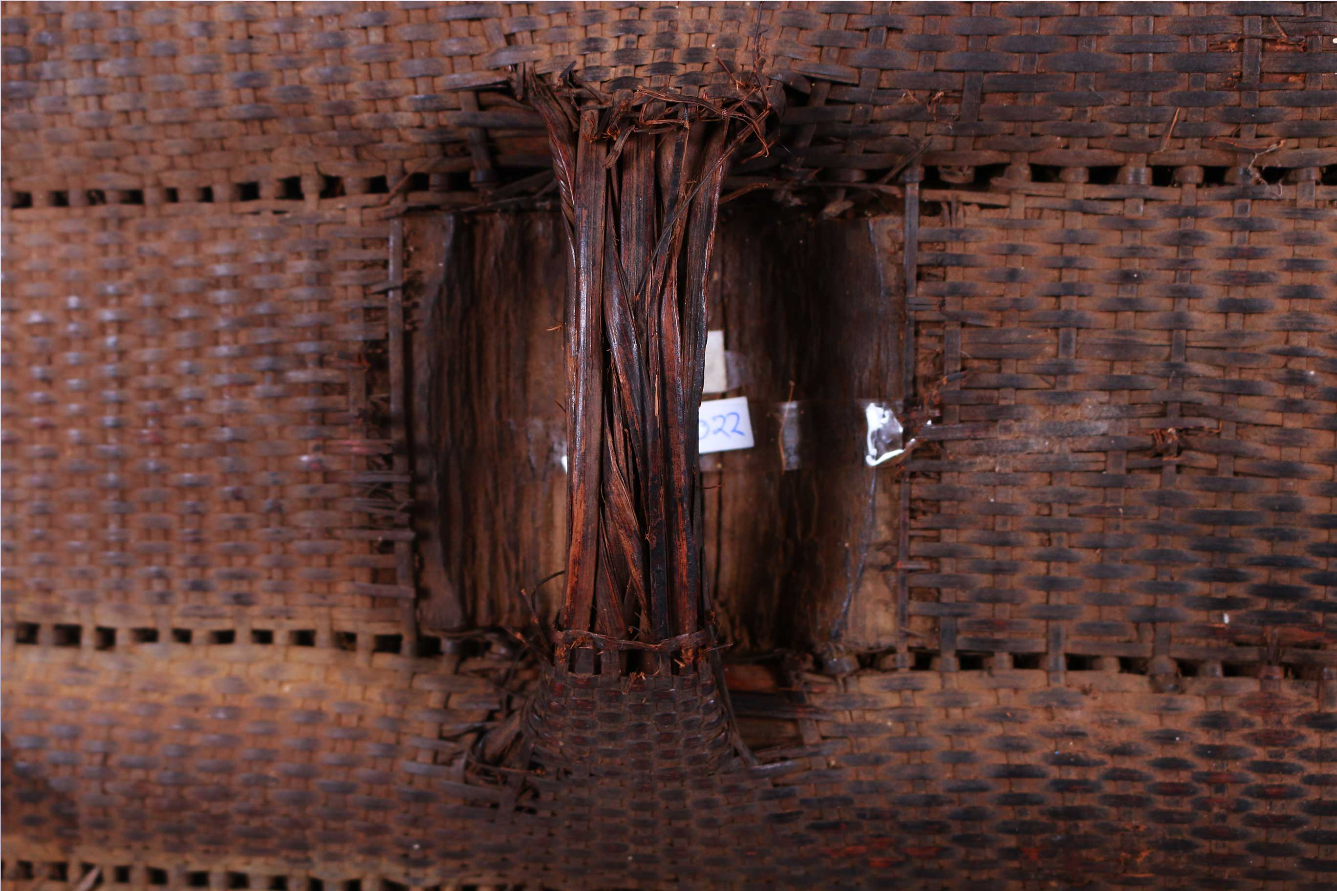 Topoke shields are made of wood and are always constructed with a significant diagonal dent in the middle. The shield is overall coloured in black and braided with narrow rattan strips and with diagonal stitching on its front side above and below, as well as on the side edges. The central, anterior surface made of thin wood displays remnants of additional light-coloured, geometrical colouring. The backside consists of semicircular bamboo slats one on top of the other, which are braided in their entirety with rattan strips. The grip, too, consists of plaited rattan strips. Overall a very well-preserved object with age-related damage to the edges and corners, as well as with old usage patina (especially on the grip)