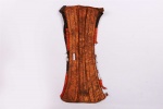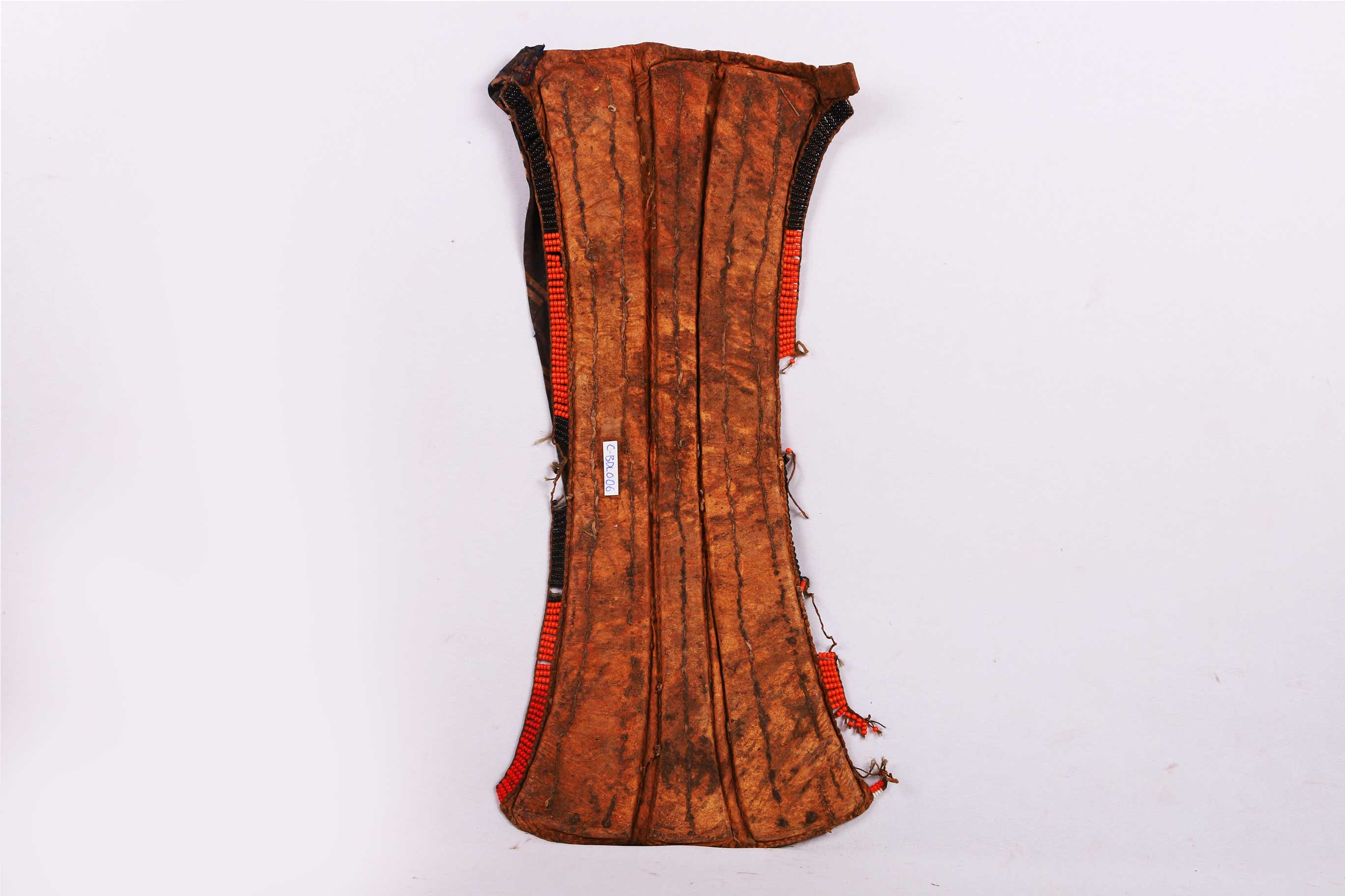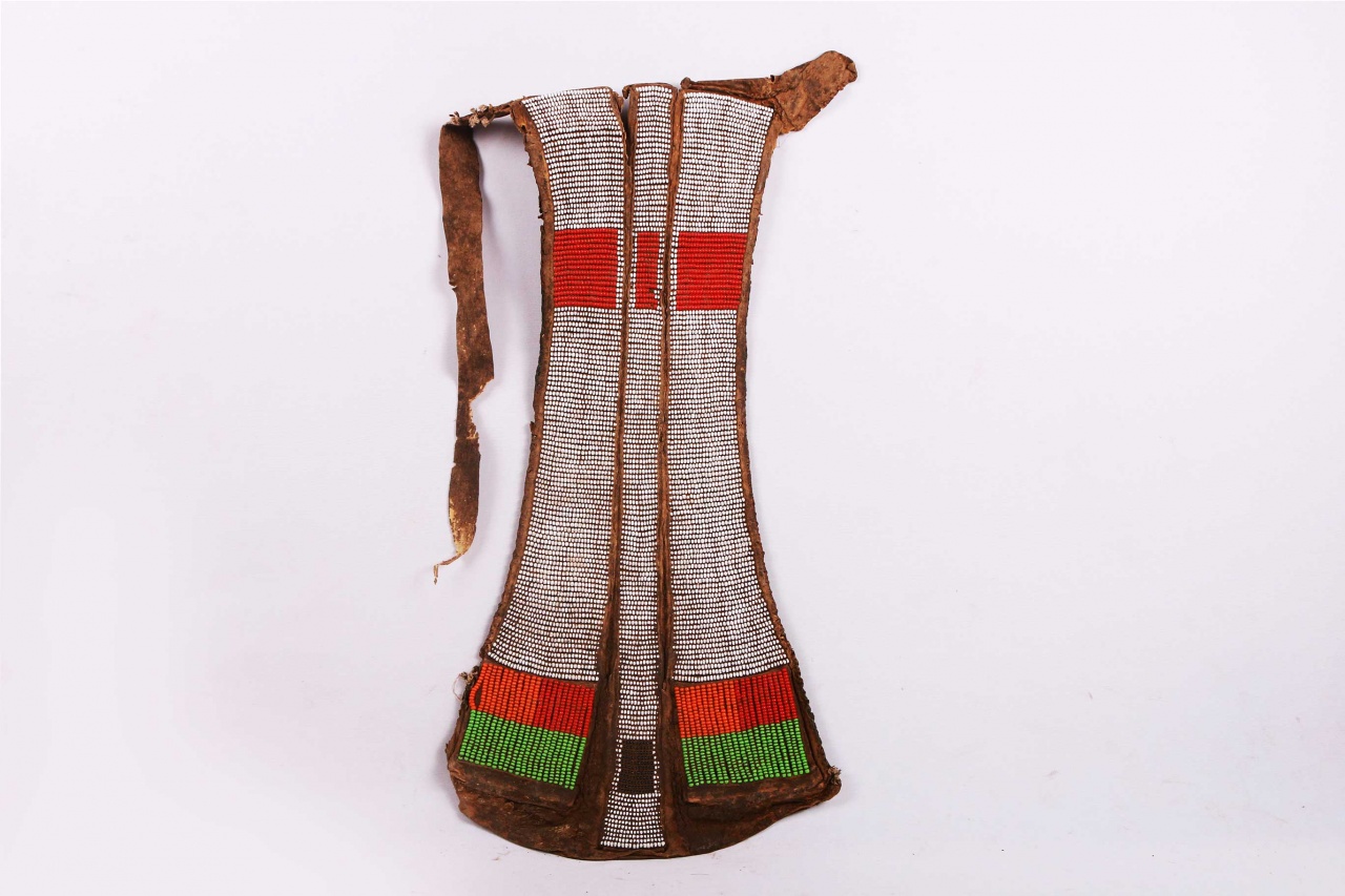 This is a beaded object from Turkana. The Turkana are a Nilotic ethnic group of agro-pastoral herders living in northern Kenya. The Turkana are famous for their dress code with beads as an essential component of an everyday dress. Among the Turkana, Beads signify age grade, marital status, and station in society. Most Turkana pieces have multiple coloured beads (white, red, yellow, brown, black, green and blue) strapped as decorations to a strip of cloth, animal hide or piece of leather.