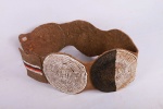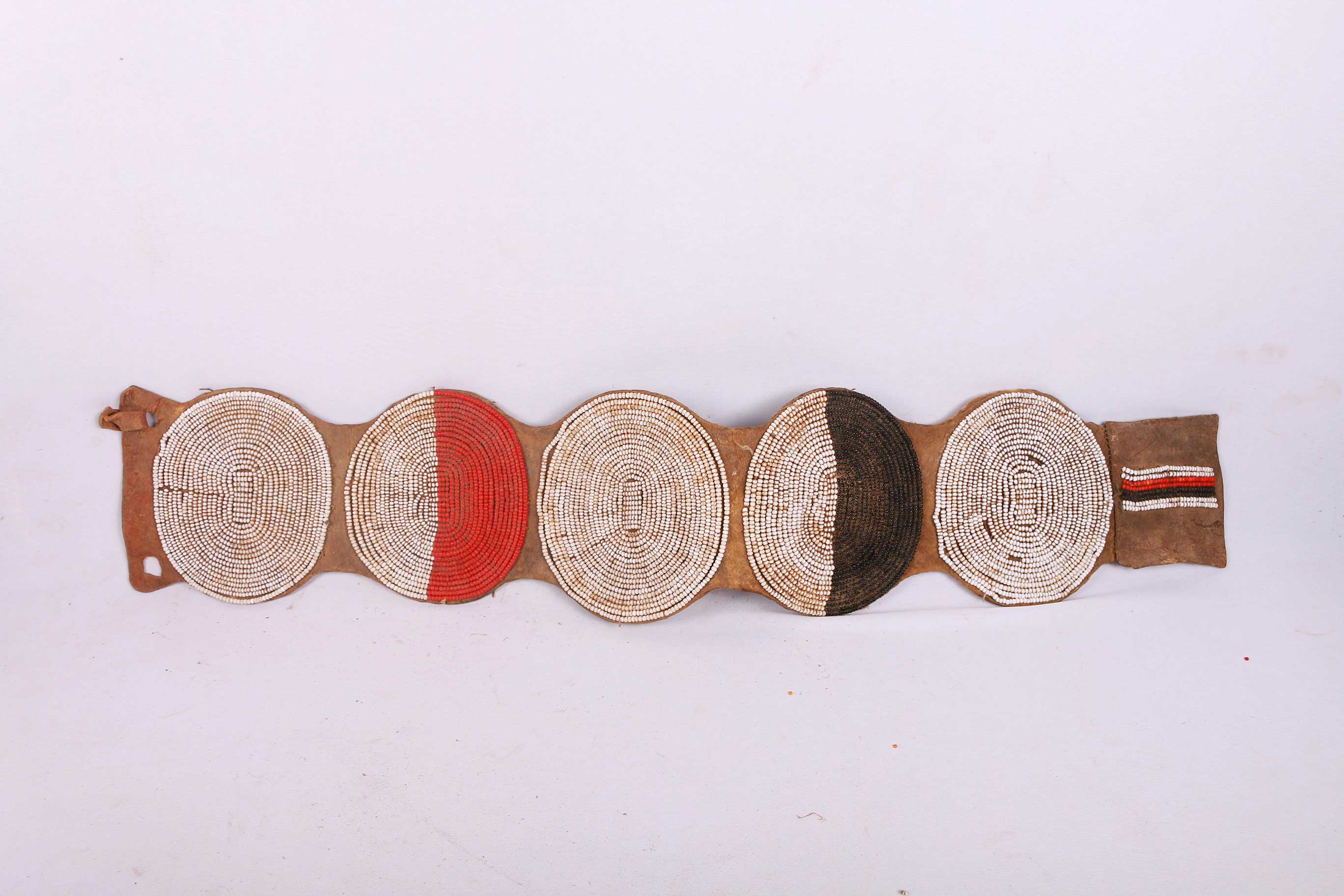 This is a fine example of an old Turkana belt. Such belts were used to distinguish between age groups, development stage, occasions, and status of individuals or groups in the Turkana community. The Turkana used to tie these belts around their waists and these belts were made out of leather or animal skin and were embellished with old beads. The thick layer of leather at the back is old and shows traces of usage but still in good condition.