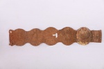 This is a beaded object from Turkana. The Turkana are a Nilotic ethnic group of agro-pastoral herders living in northern Kenya. The Turkana are famous for their dress code with beads as an essential component of an everyday dress. Among the Turkana, Beads signify age grade, marital status, and station in society. Most Turkana pieces have multiple coloured beads (white, red, yellow, brown, black, green and blue) strapped as decorations to a strip of cloth or piece of leather.
