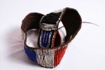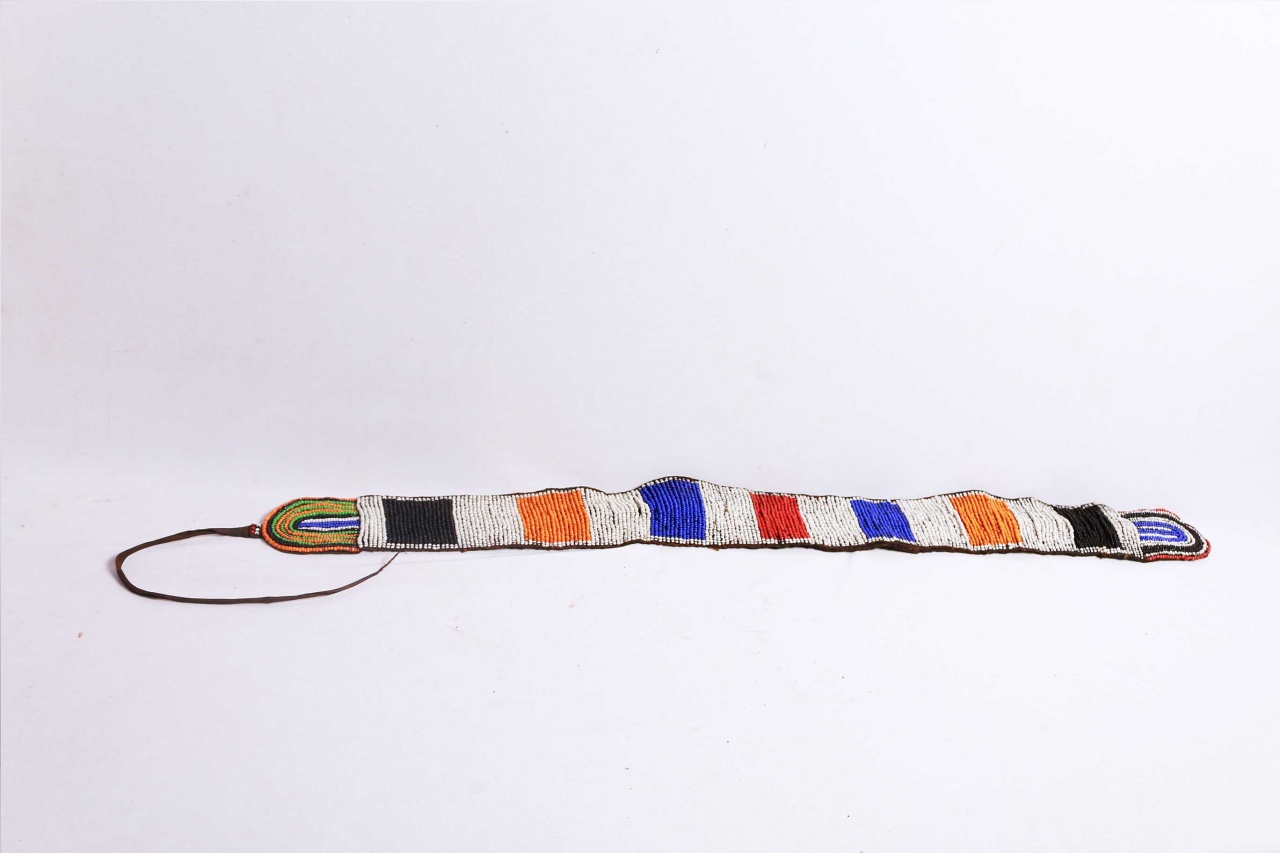 This is a beaded object from Turkana. The Turkana are a Nilotic ethnic group of agro-pastoral herders living in northern Kenya. The Turkana are famous for their dress code with beads as an essential component of an everyday dress. Among the Turkana, Beads signify age grade, marital status, and station in society. Most Turkana pieces have multiple colored beads (white, red, yellow, brown, black, green and blue) strapped as decorations to a strip of cloth or piece of leather.