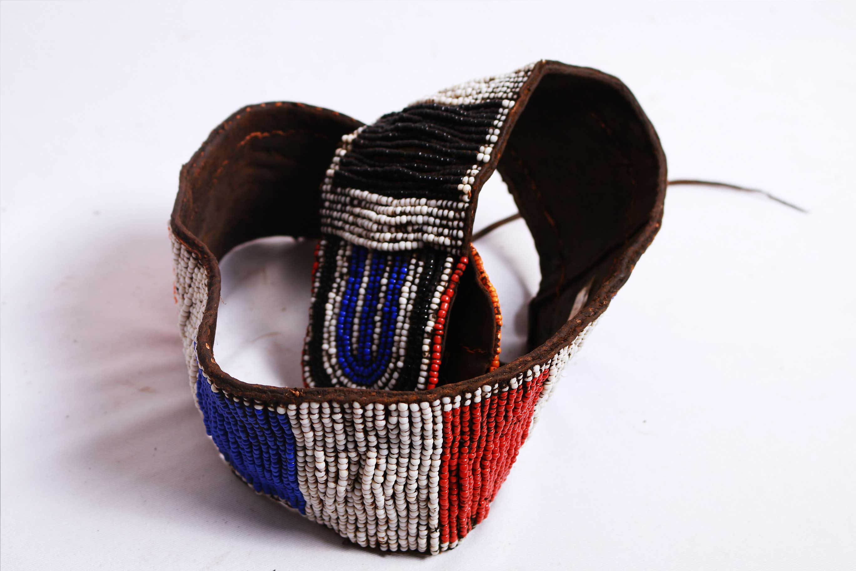 This is a fine example of an old Turkana belt. Such belts were used to distinguish between age groups, development stage, occasions, and status of individuals or groups in the Turkana community. The thick layer of leather at the back is old and shows traces of usage but still in good condition.