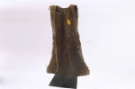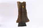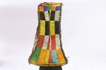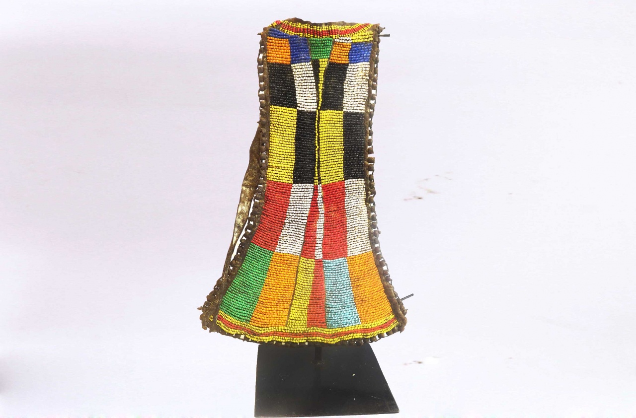 This is a beaded object from Turkana. The Turkana are a Nilotic ethnic group of agro-pastoral herders living in northern Kenya. The Turkana are famous for their dress code with beads as an essential component of an everyday dress. Among the Turkana, Beads signify age grade, marital status, and station in society. Most Turkana pieces have multiple colored beads (white, red, yellow, brown, black, green and blue) strapped as decorations to a strip of cloth, animal hide or piece of leather.