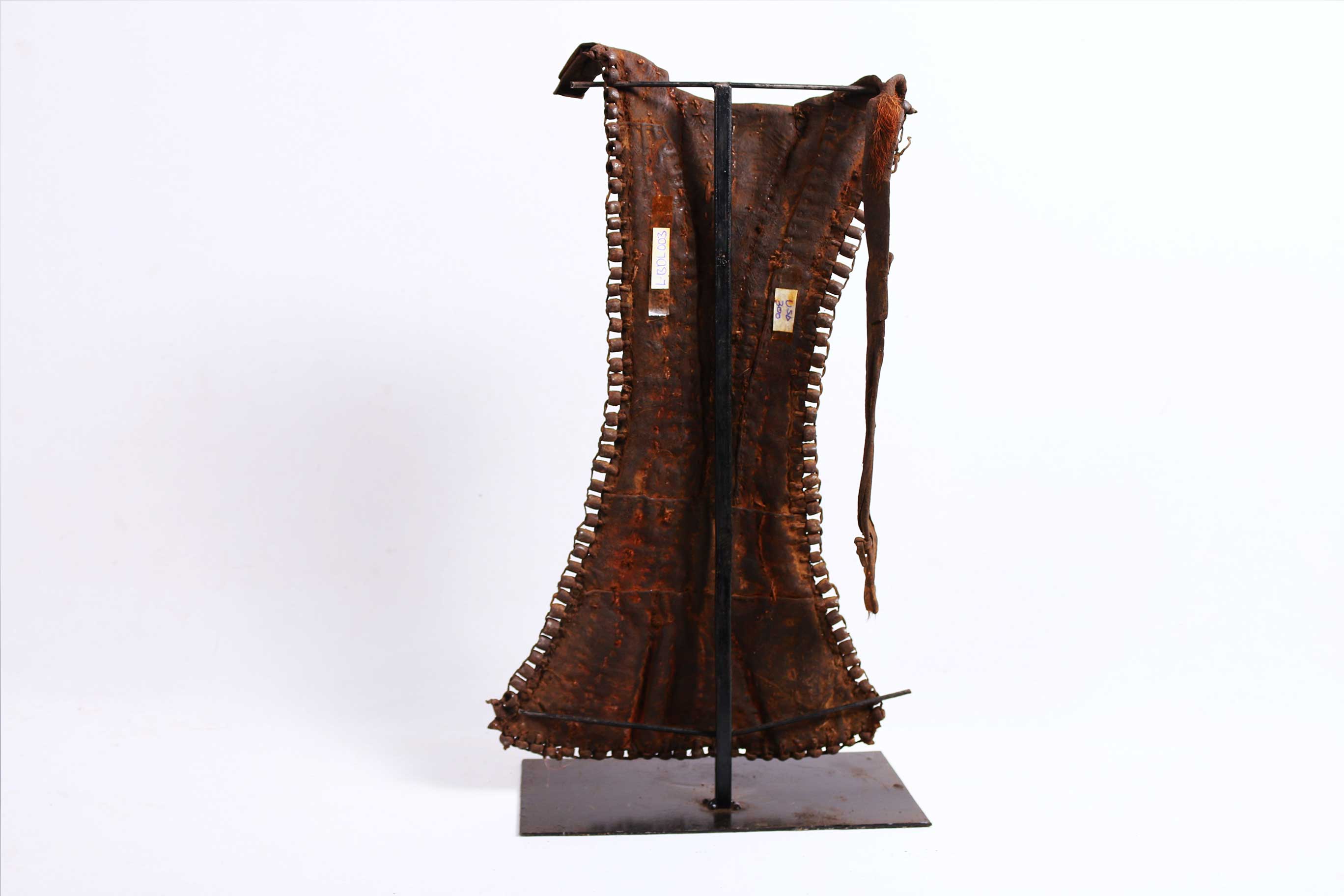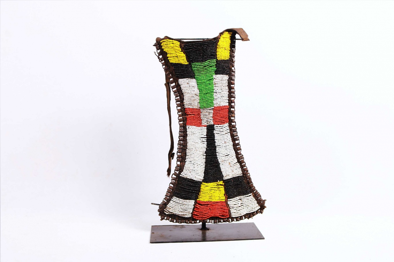 This is a beaded object from Turkana. The Turkana are a Nilotic ethnic group of agro-pastoral herders living in northern Kenya. The Turkana are famous for their dress code with beads as an essential component of an everyday dress. Among the Turkana, Beads signify age grade, marital status, and station in society. Most Turkana pieces have multiple coloured beads (white, red, yellow, brown, black, green and blue) strapped as decorations to a strip of cloth, animal hide or piece of leather.