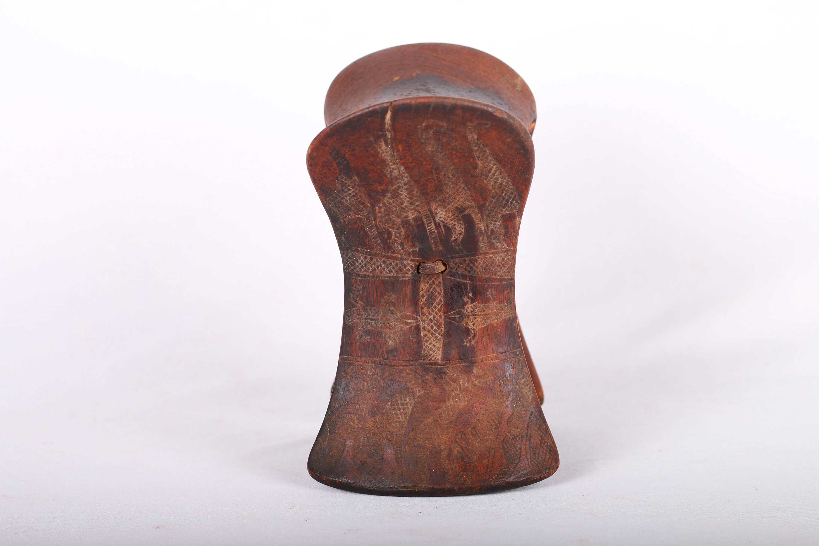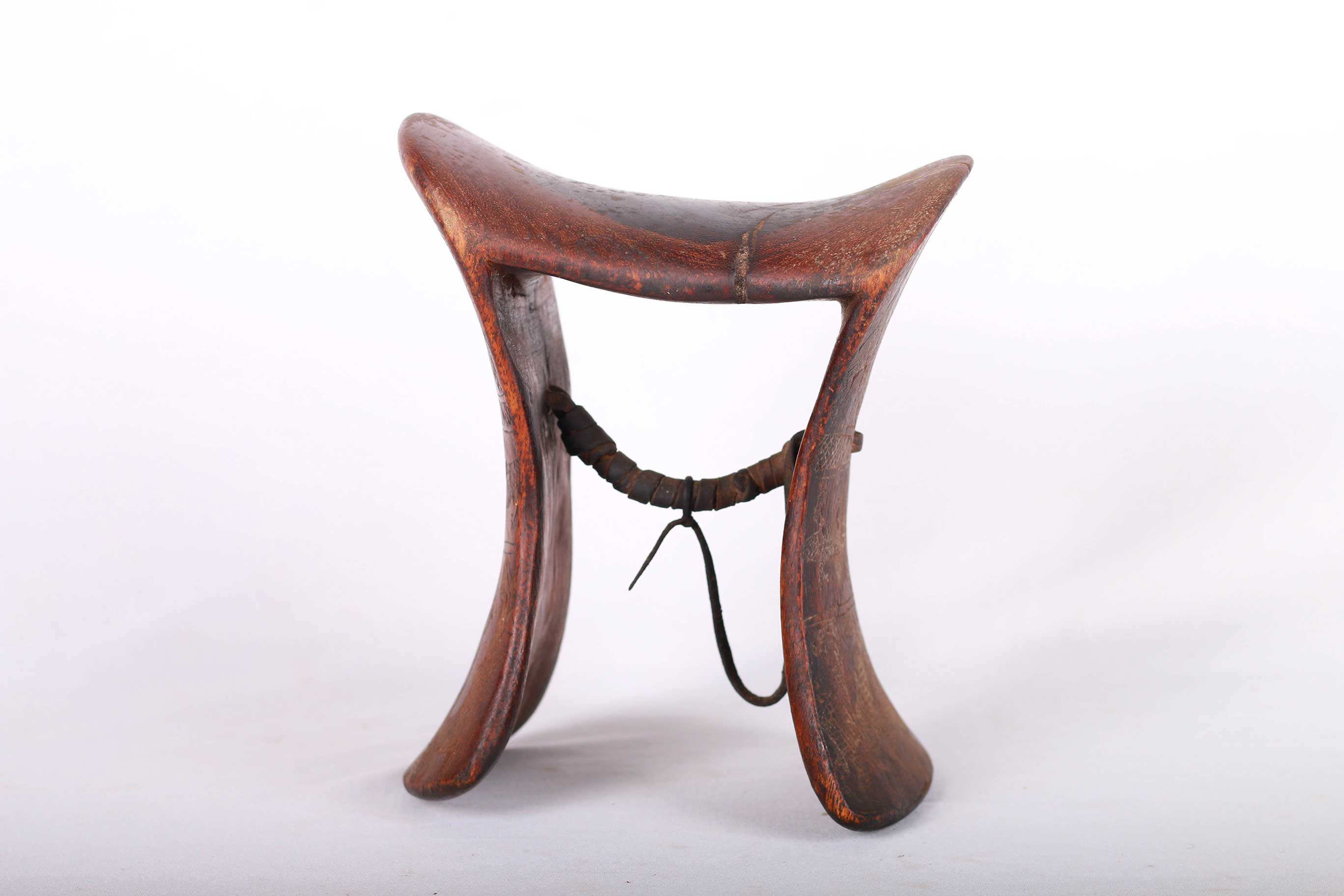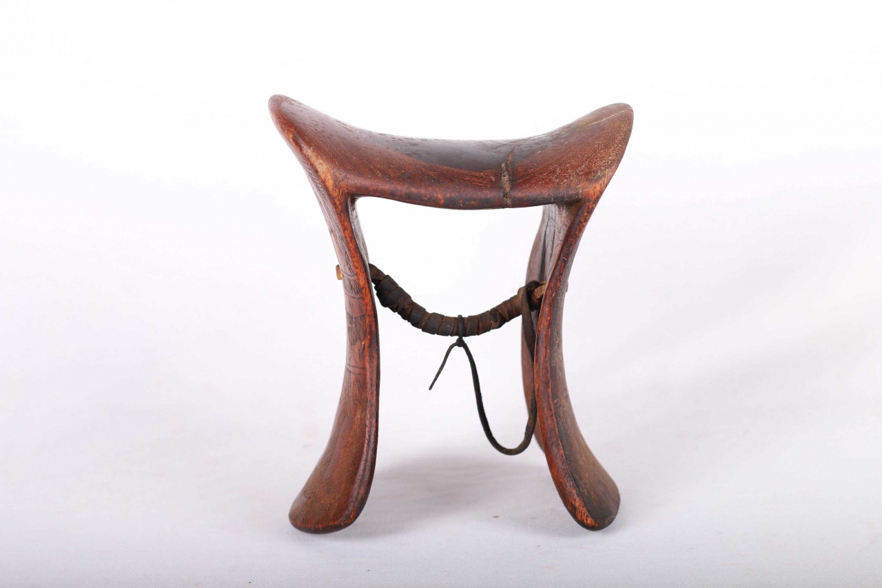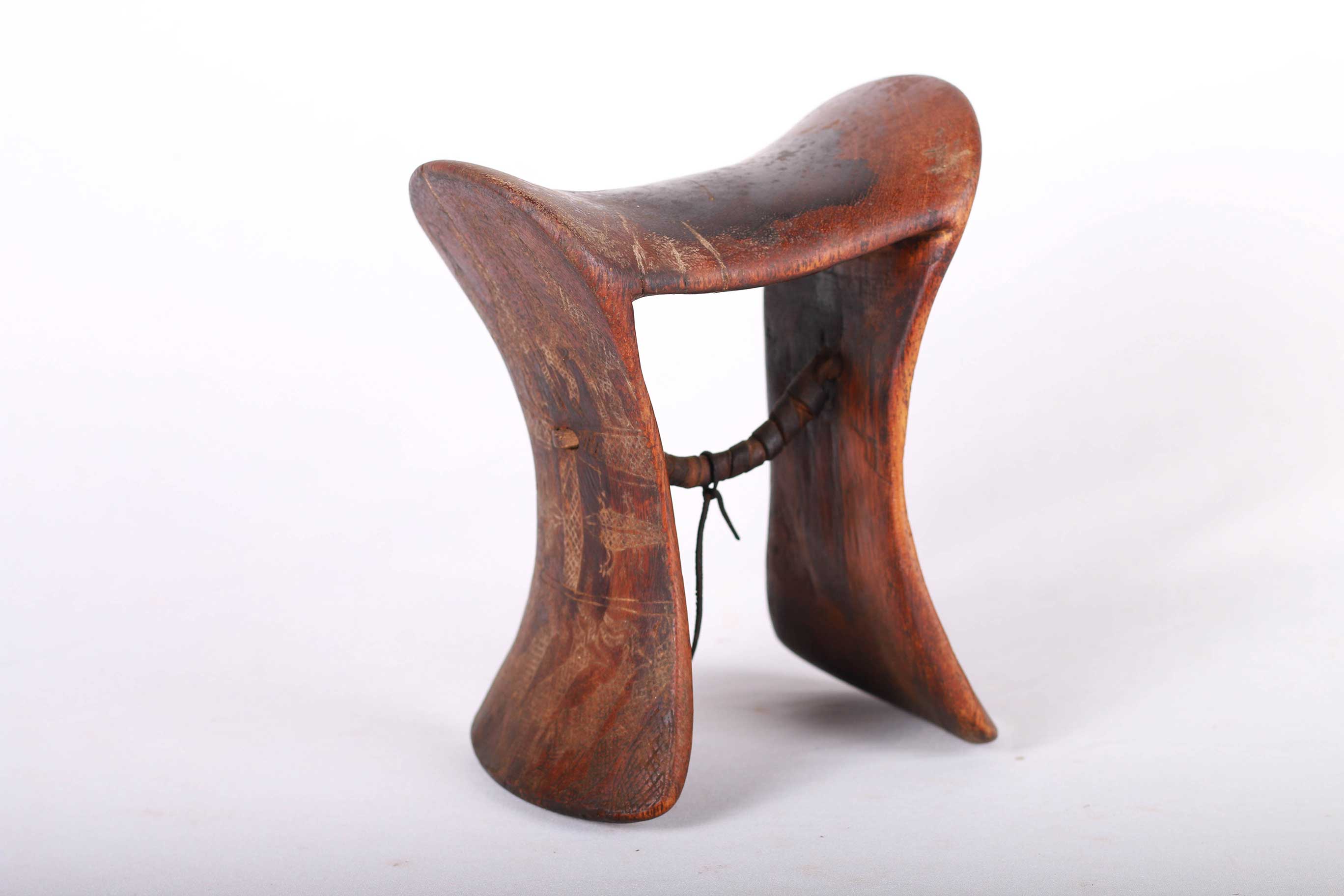 This is an A-shaped headrest from the Turkana, an ethnic group of agro-pastoral herders living mainly in northern Kenya. Headrests appear like simple pieces of craftmanship but they are of aesthetic value. They possess significance value and they have artistic status, they mean more than just mere objects. These pillow-like objects are some of the most distinctive East African artifacts. Headrests symbolized high social status or magical power such as the gift of foretelling. Headrests are also traditionally believed to protect elaborated headdresses, headrests are no longer a feature of modern life in this region.