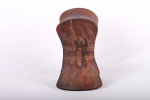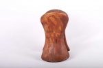 This fine headrest is a result of hard work and skill with its superb vertical A-shape. It is also known as a tied headrest because it is gradually tightened with a piece of leather to prevent the legs from splitting until the desired shape is obtained. It was carved in a single piece of wood, decorated with iron spots on the sides and could only be owned by an elder aged over 50 years. Such pieces were also paid as dowry by a groom to his bride’s family as a demonstration of respect. This piece could also be inherited by only a man, possibly a brother or elder son of the deceased. Its design is similar to those of Pokot and Karamajong as a result of intermingling. It has a brown wonderful patina, clear signs of usage and old age.