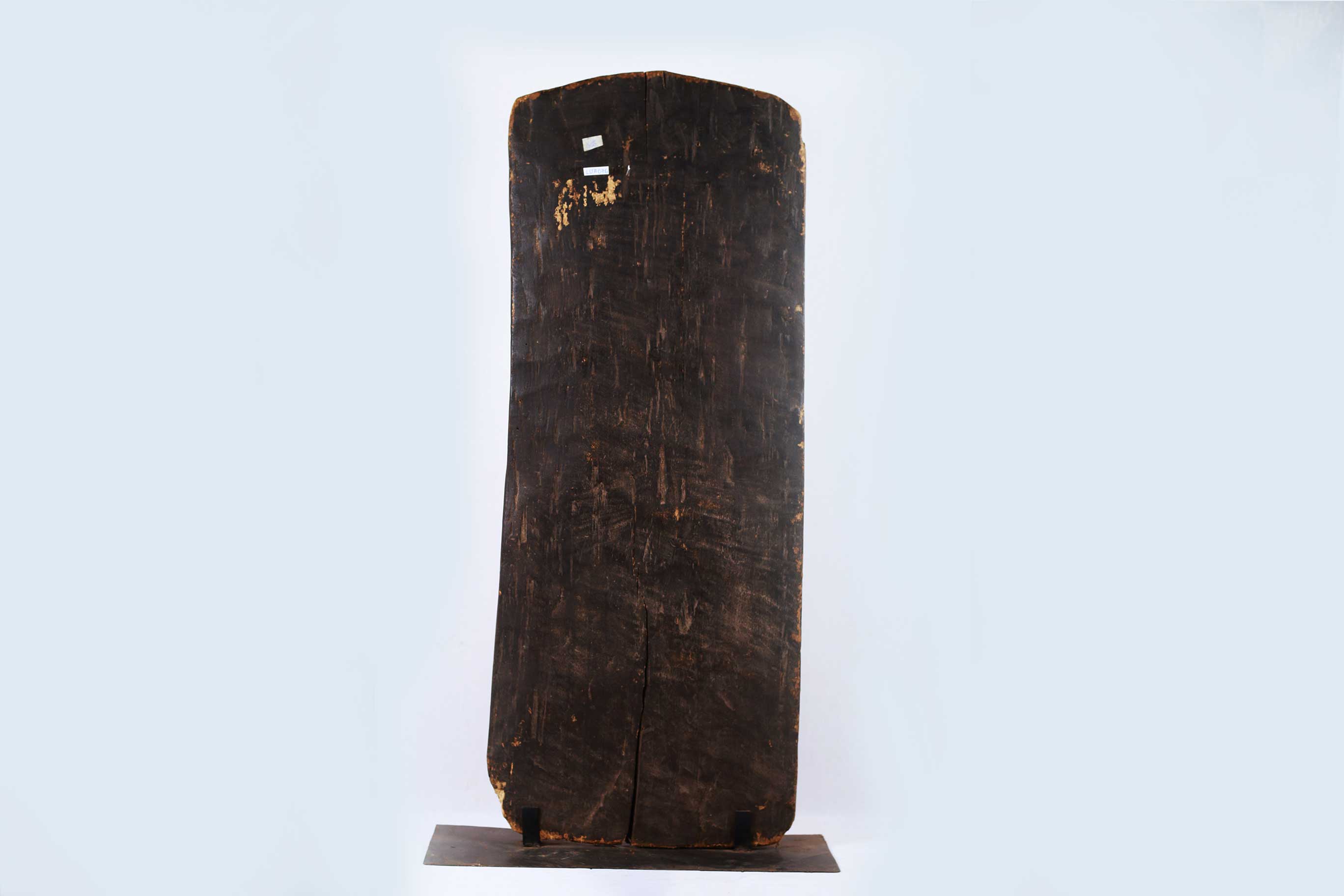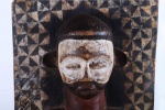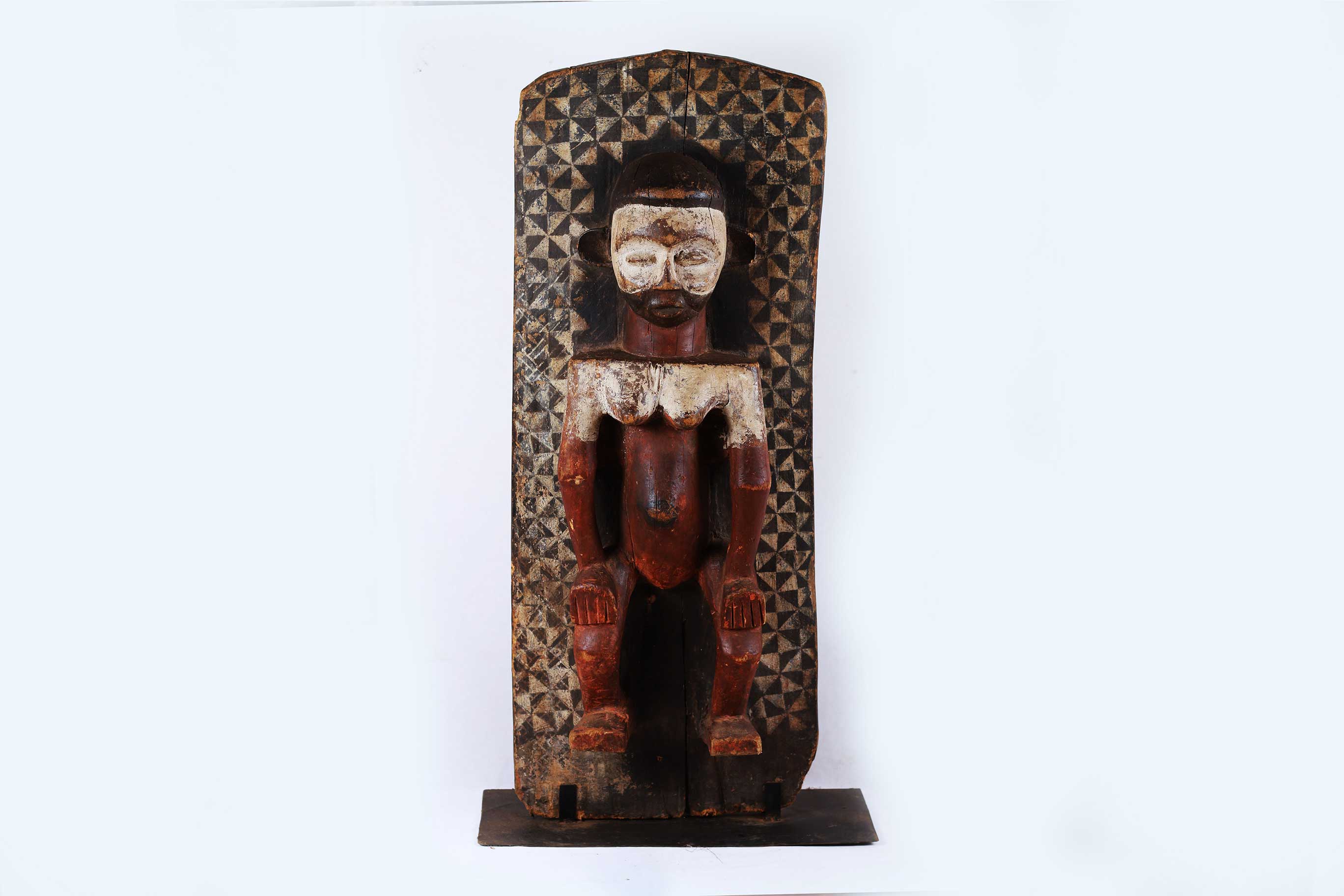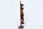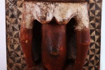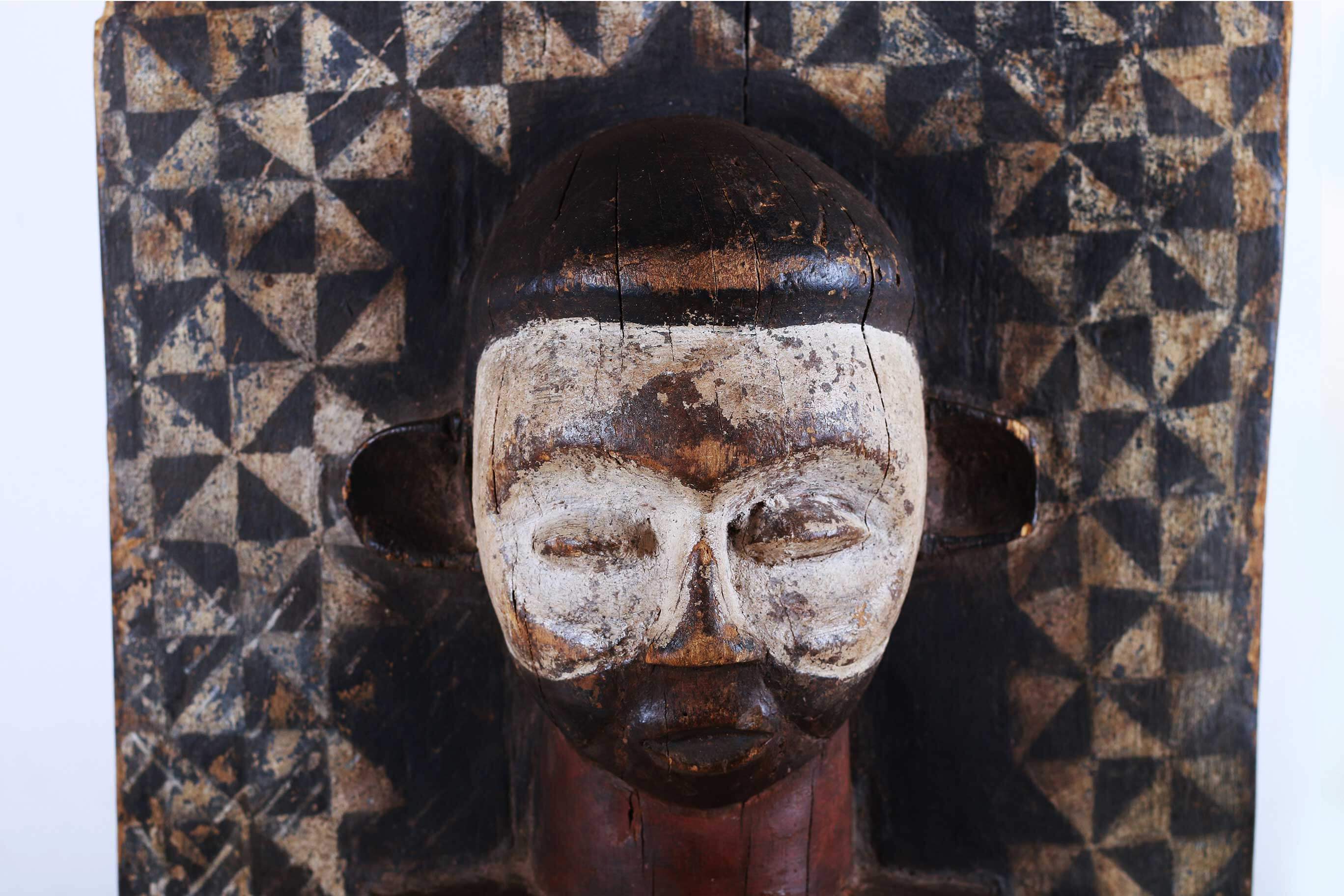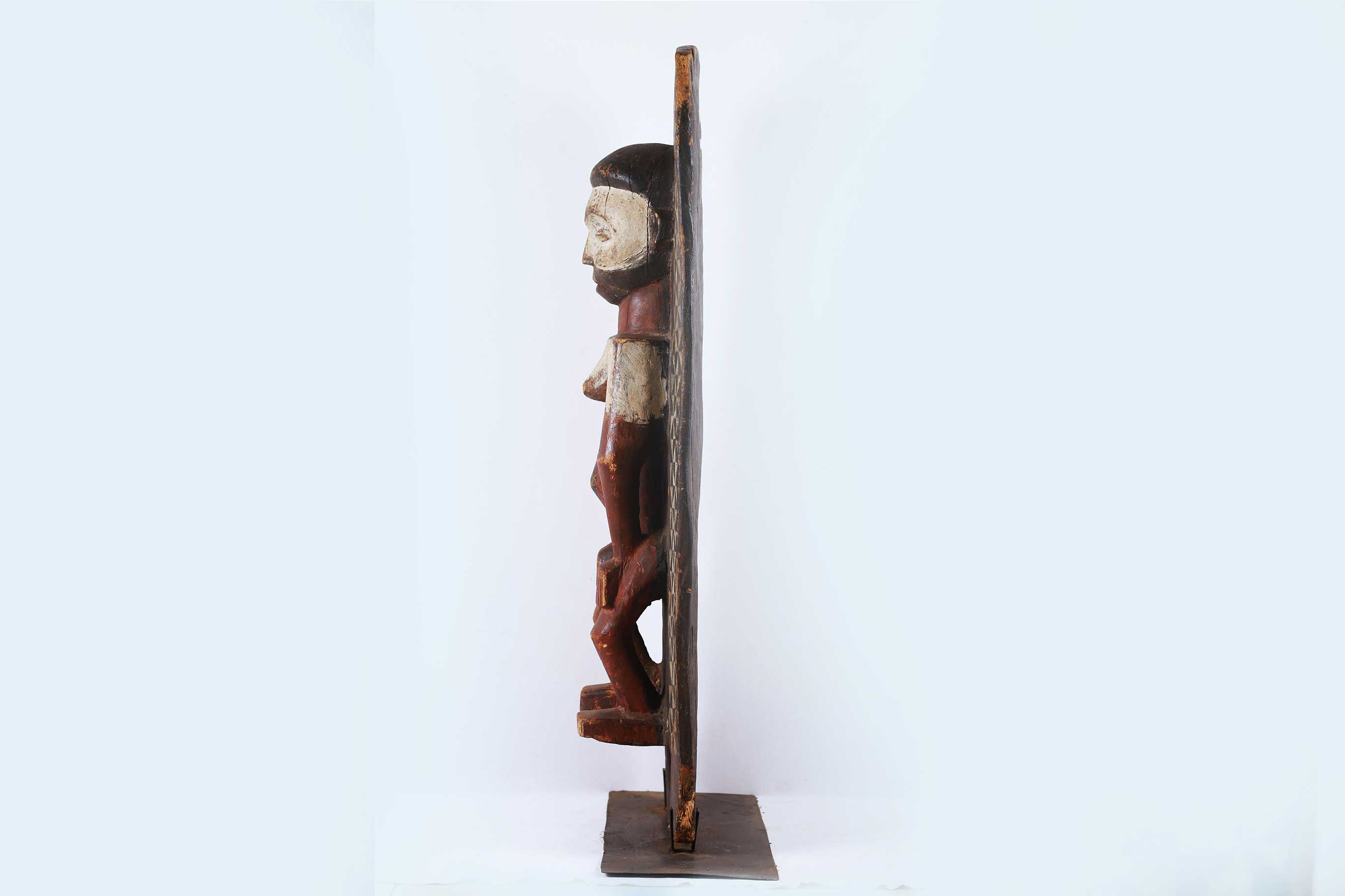 The Yaka are an African ethnic group found in the southwestern Democratic Republic of the Congo. The wall panels are rectangular and carved from light wood with human figures or animals depicted in high relief. All of the panels photographed and/or collected in the 20th century depict a uniform style. The figures are carved in high relief and painted in a characteristic fashion. The upper part of the faces is painted white while the lower parts often have a red pigment. The figures are usually depicted wearing clothing and distinctive hats or headdresses. The background surfaces of the panels are entirely covered with a variety of geometric decorations including circles, lozenges, triangles, zigzag lines and leaf patterns. The stylistic arrangement of panels with figurative reliefs alternating with those displaying two-dimensional geometric decoration or figures bordered with geometric patterns, The function of the panels may have been to restate in visual terms ideas found in stories and proverbs associated with the initiation process. In this way, they were used by the elders who taught moral and social values to the initiates. The panels may also have been a dramatic way for Yaka elders to publicize the successful completion of the initiation cycle, as they displayed a variety of highly decorated wooden sculptures produced in the initiation camp. This sculpture is crafted in dense wood with a shiny brown patina with visible signs of old age.