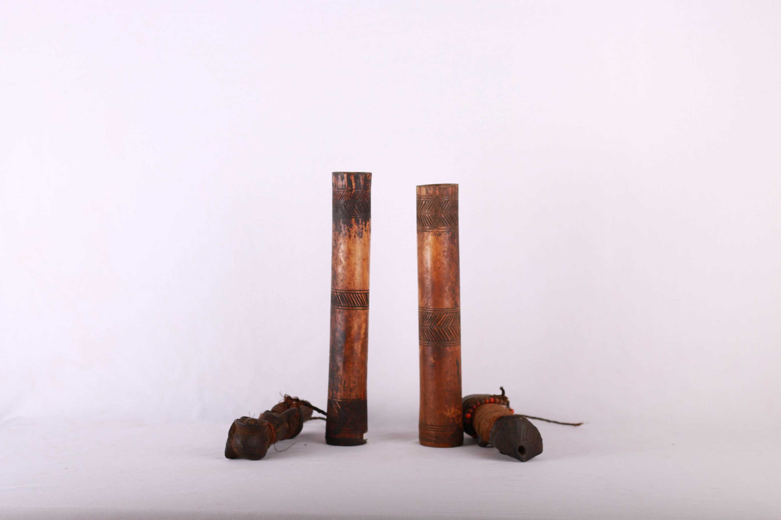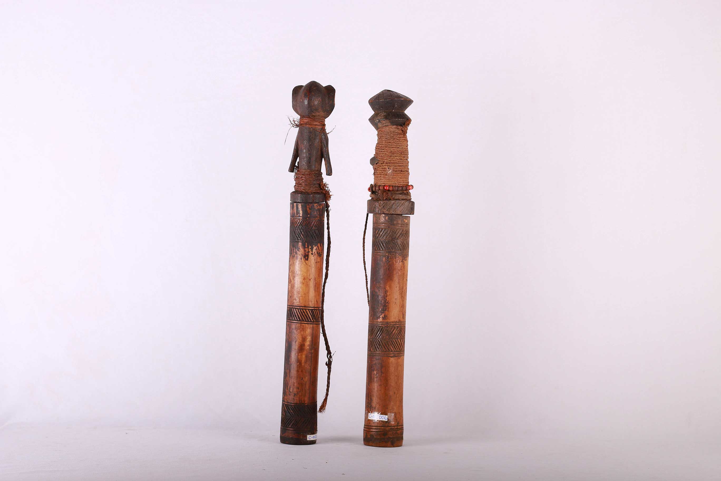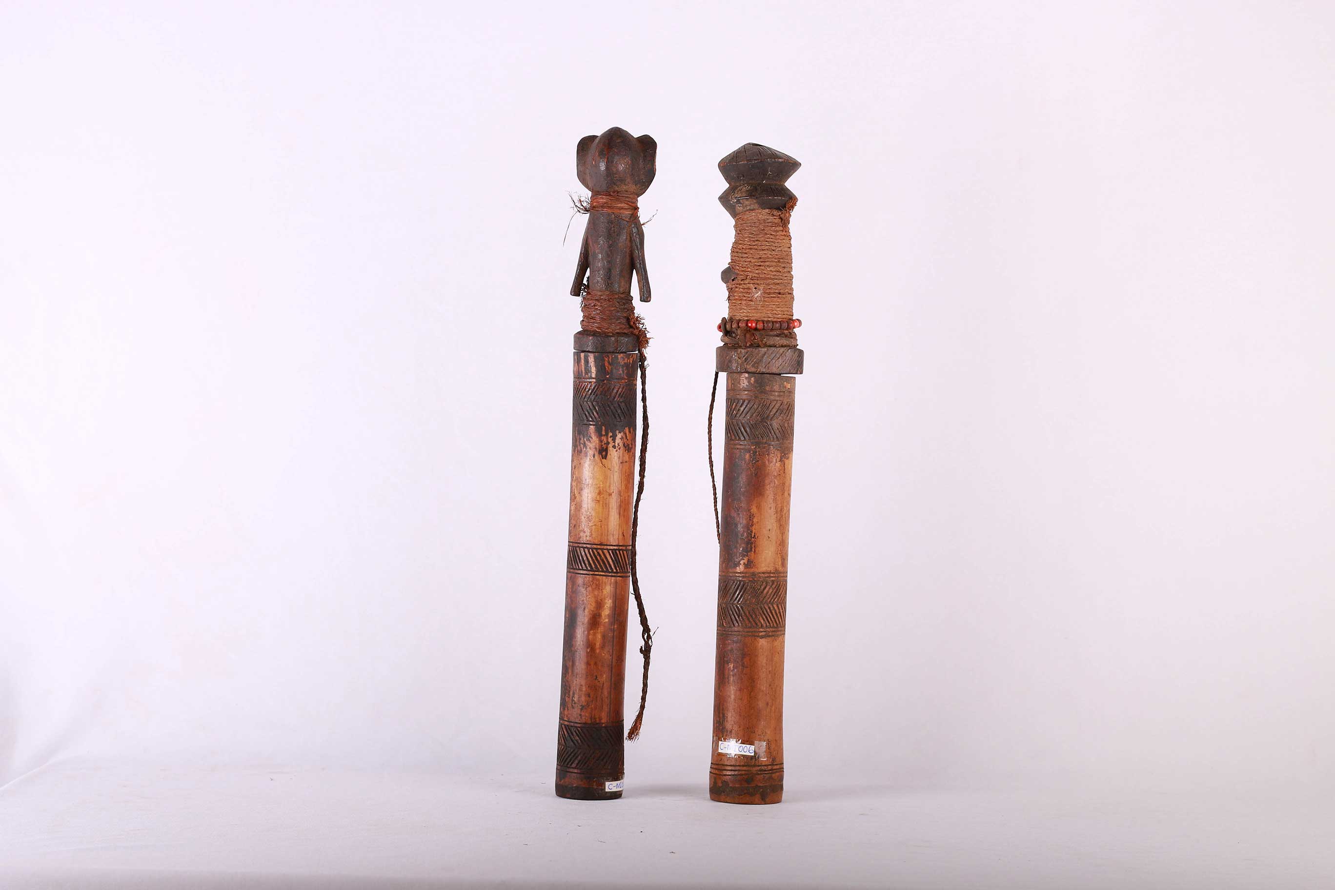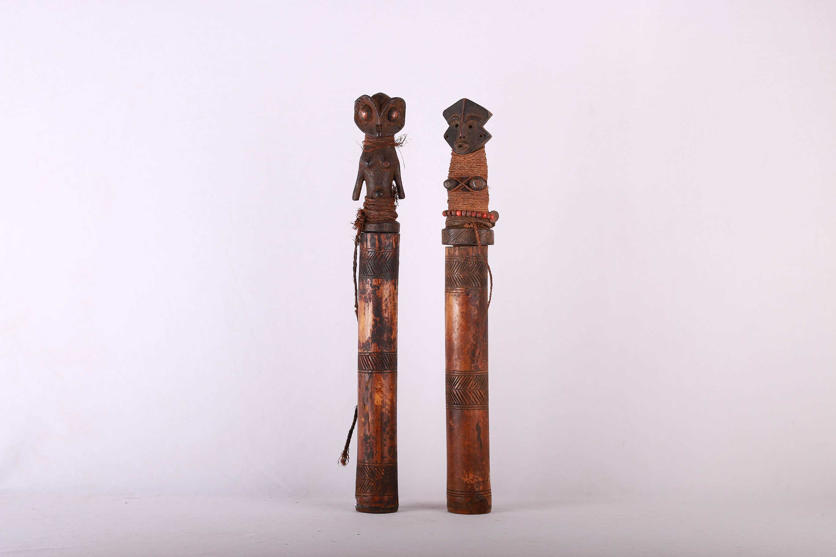 The Zande live in the northern part of the Democratic Republic of the Congo, on the banks of the Uele River. Zande sculptures represent ancestors. Zande statues are associated with the highest rank of the secret Mani society which protects society members from the dangers of illness, hunting, and evil spirits. The following figures were used as storage vessels, they look visibly old and show signs of age and usage.