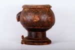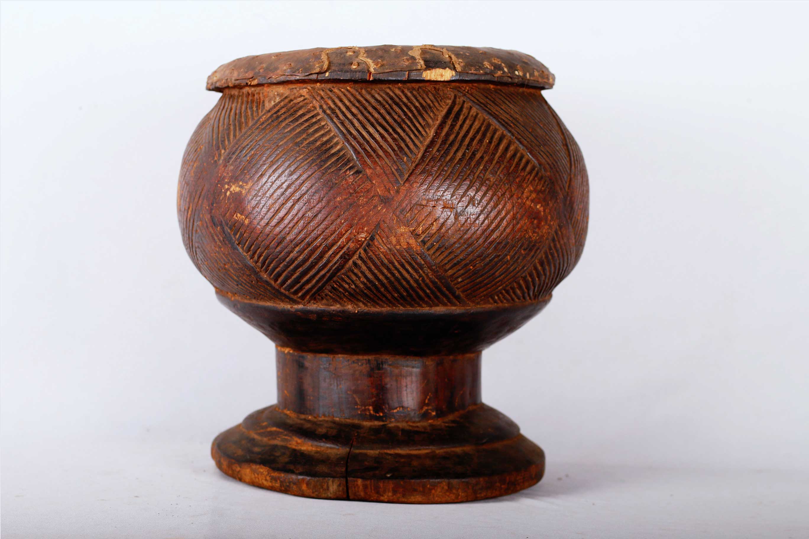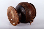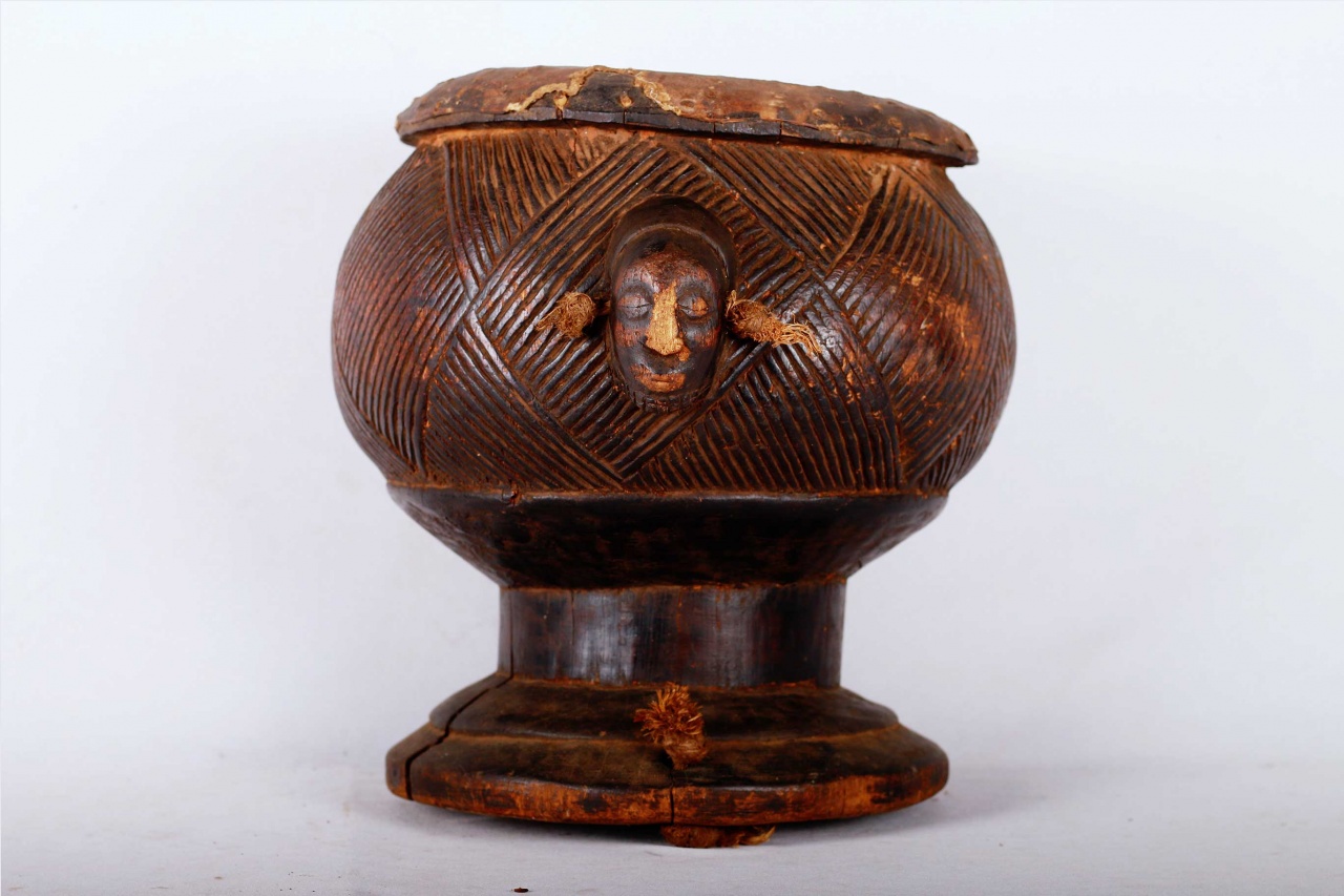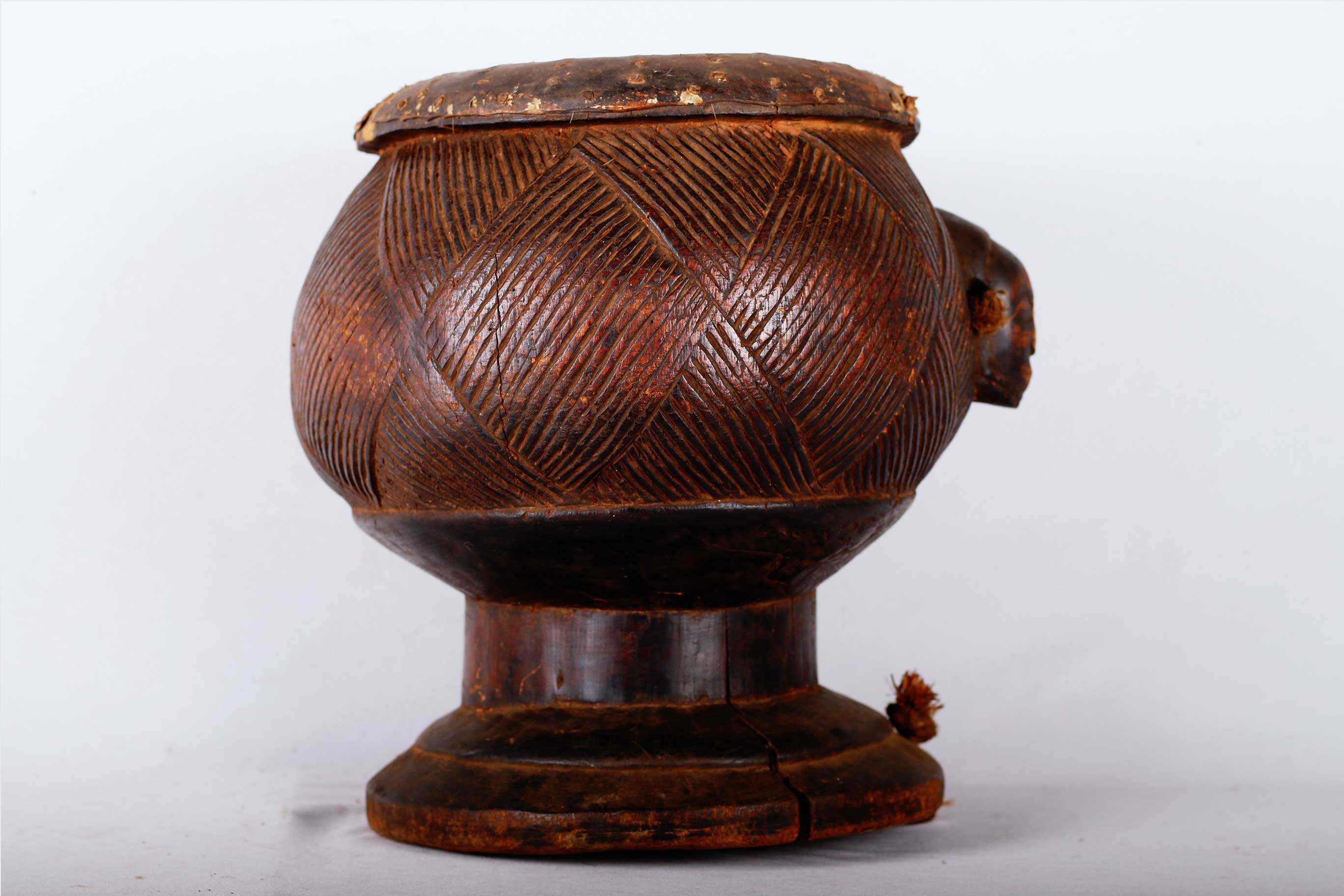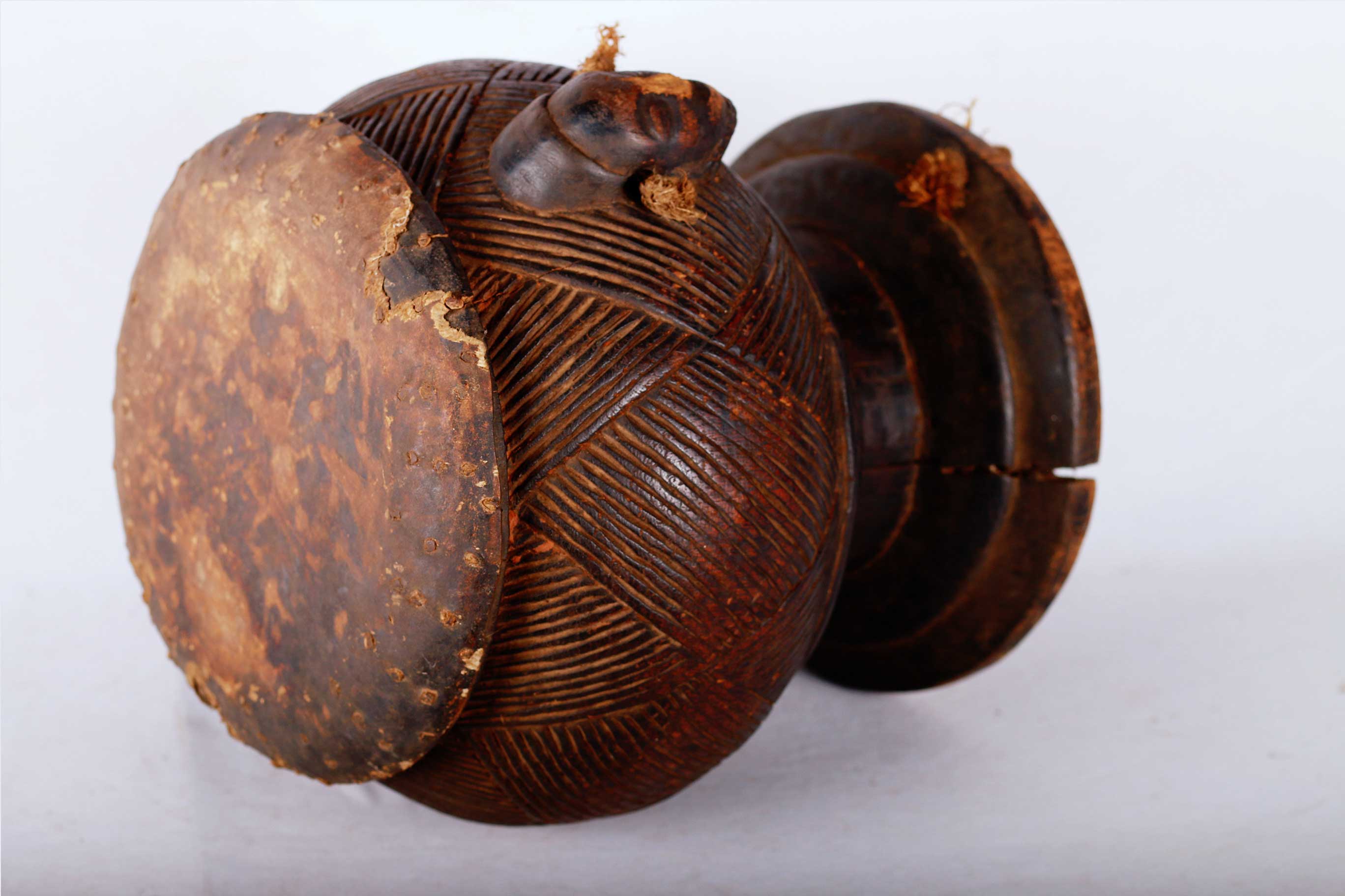 The Zande migrated from Sudan to the northern part of the Democratic Republic of the Congo. They live also in the Central African Republic and Sudan. This is a Zande drum and it was employed during initiations or ceremonies, it is old and bares a dark patina and has leather at the top. It is without a doubt a bush collected item.