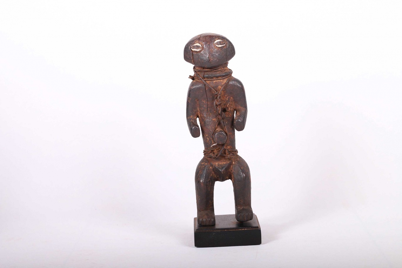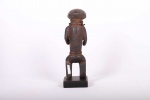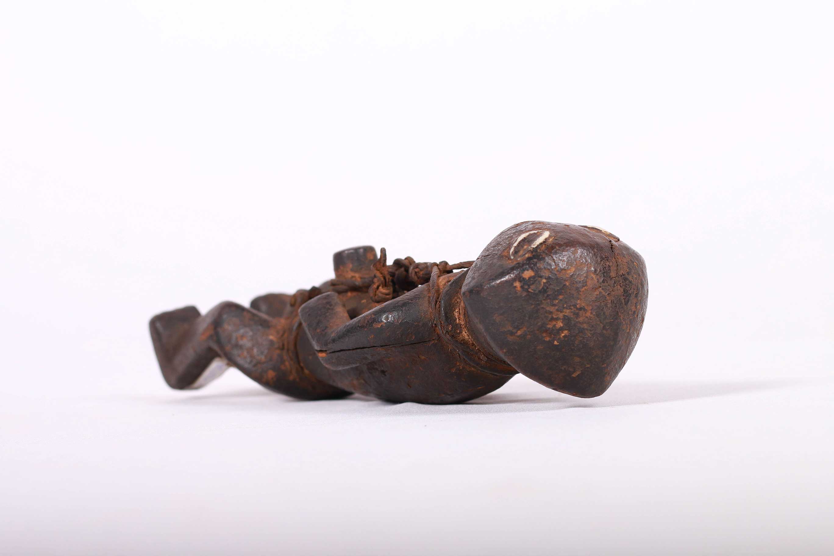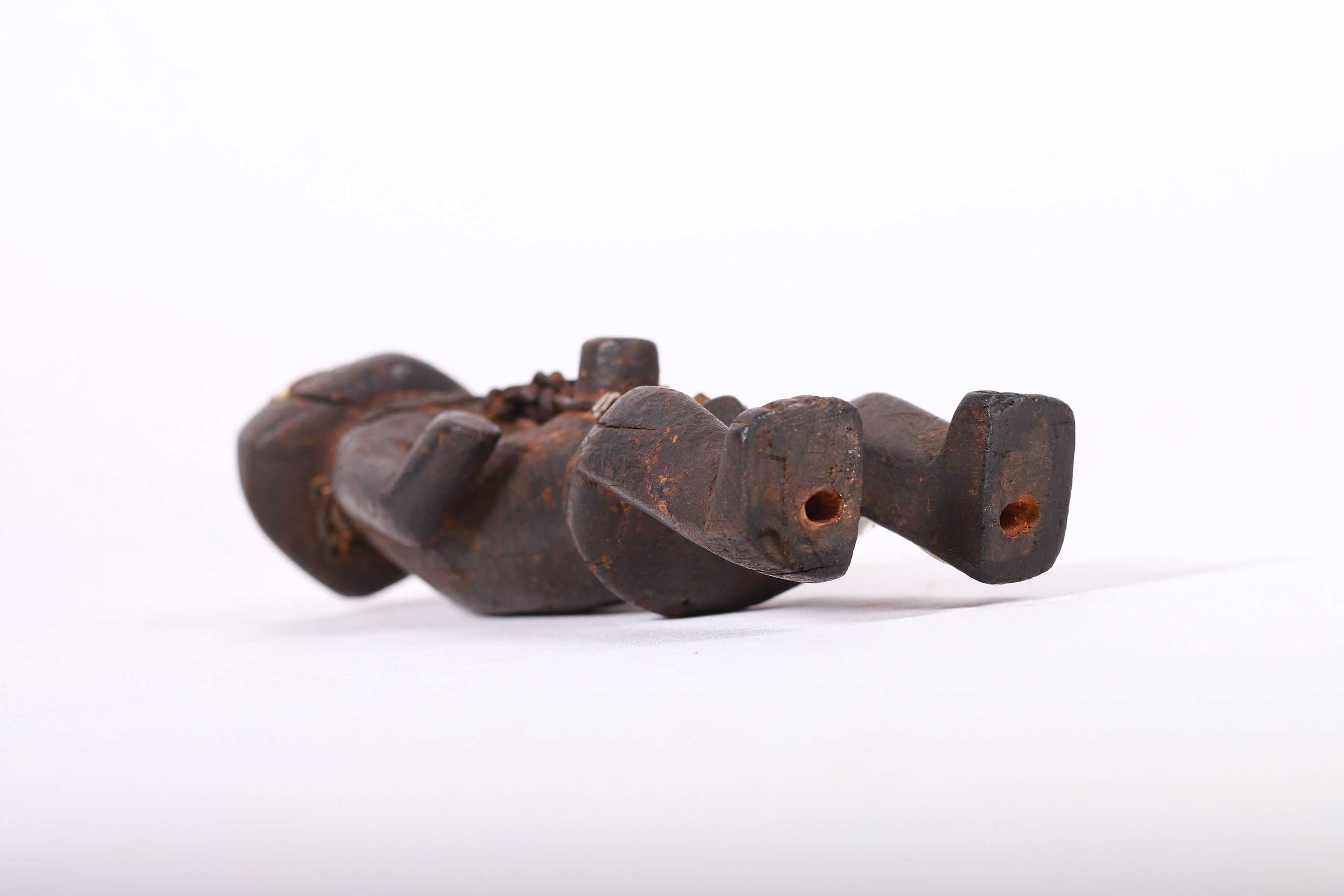The Zande are found in the African countries of South Sudan, the Central African Republic, and the Northern Democratic Republic of Congo. Zande sculptures are often representations of ancestors. Some of the Zande sculptures are associated with the highest rank of the secret Mani society which protects society members from the dangers of illness, hunting, and evil spirits. This is a flat figure with strings of fiber attached around it. The following statue has interesting facial features. It has a dark patina and looks considerably old with traces of wear.