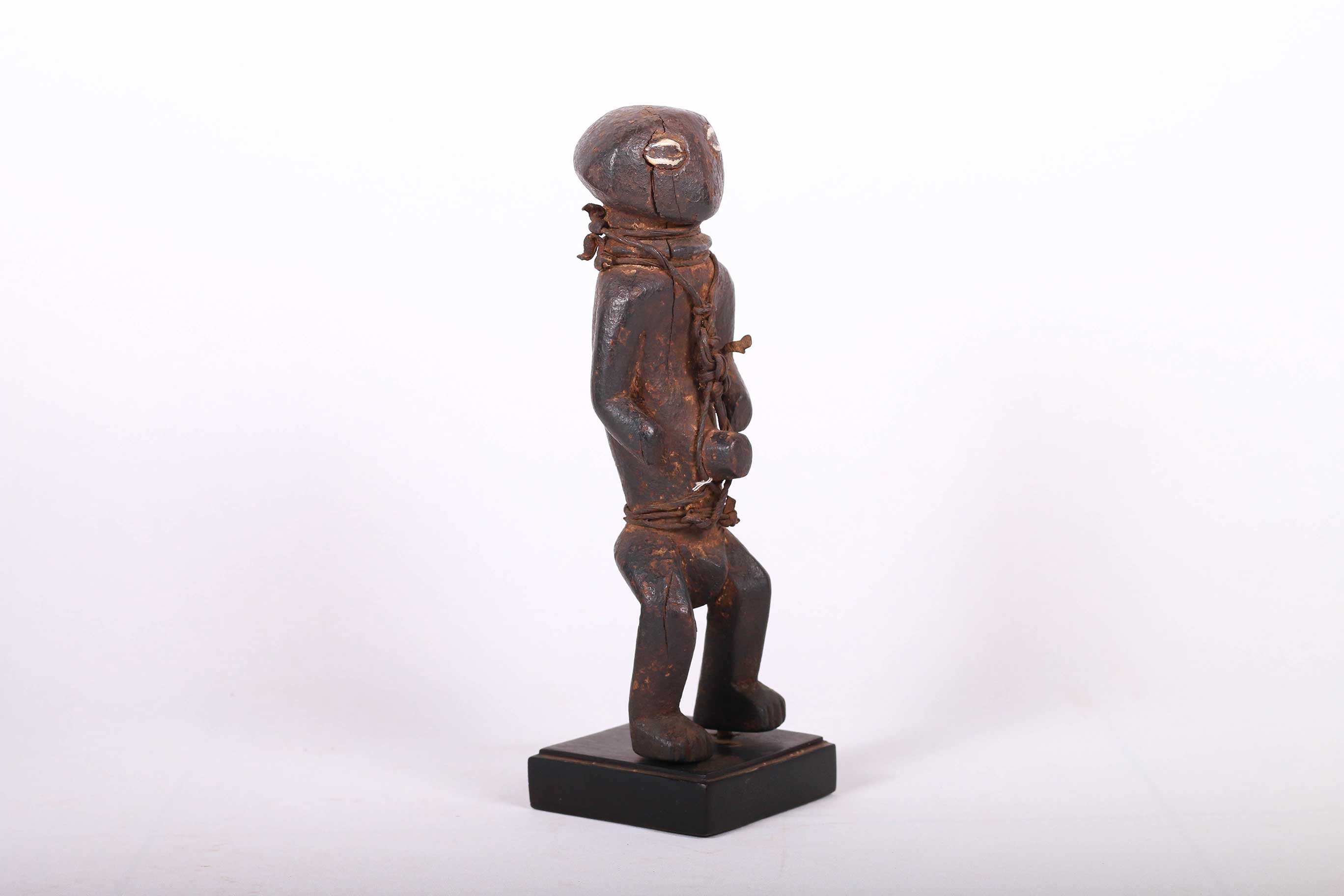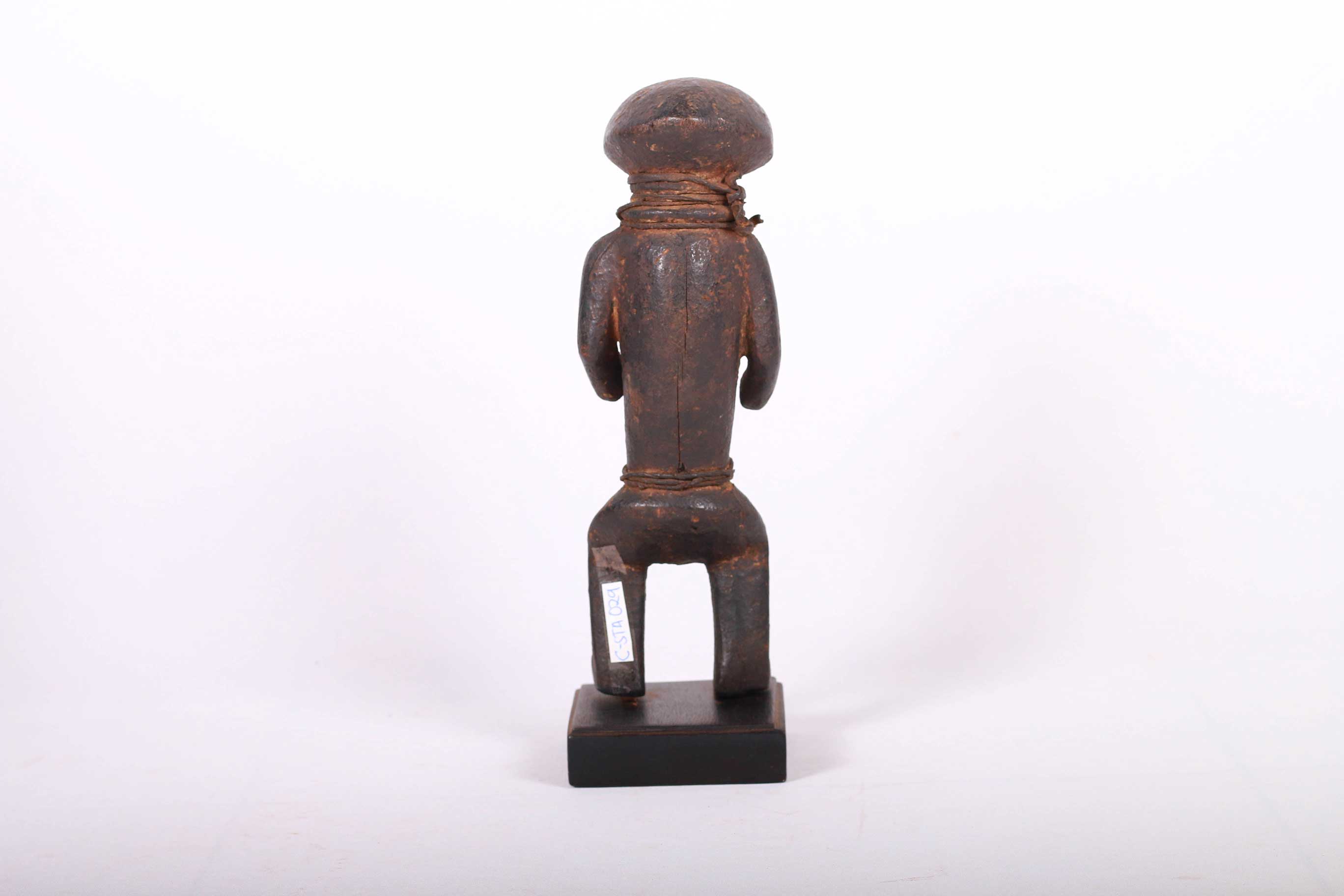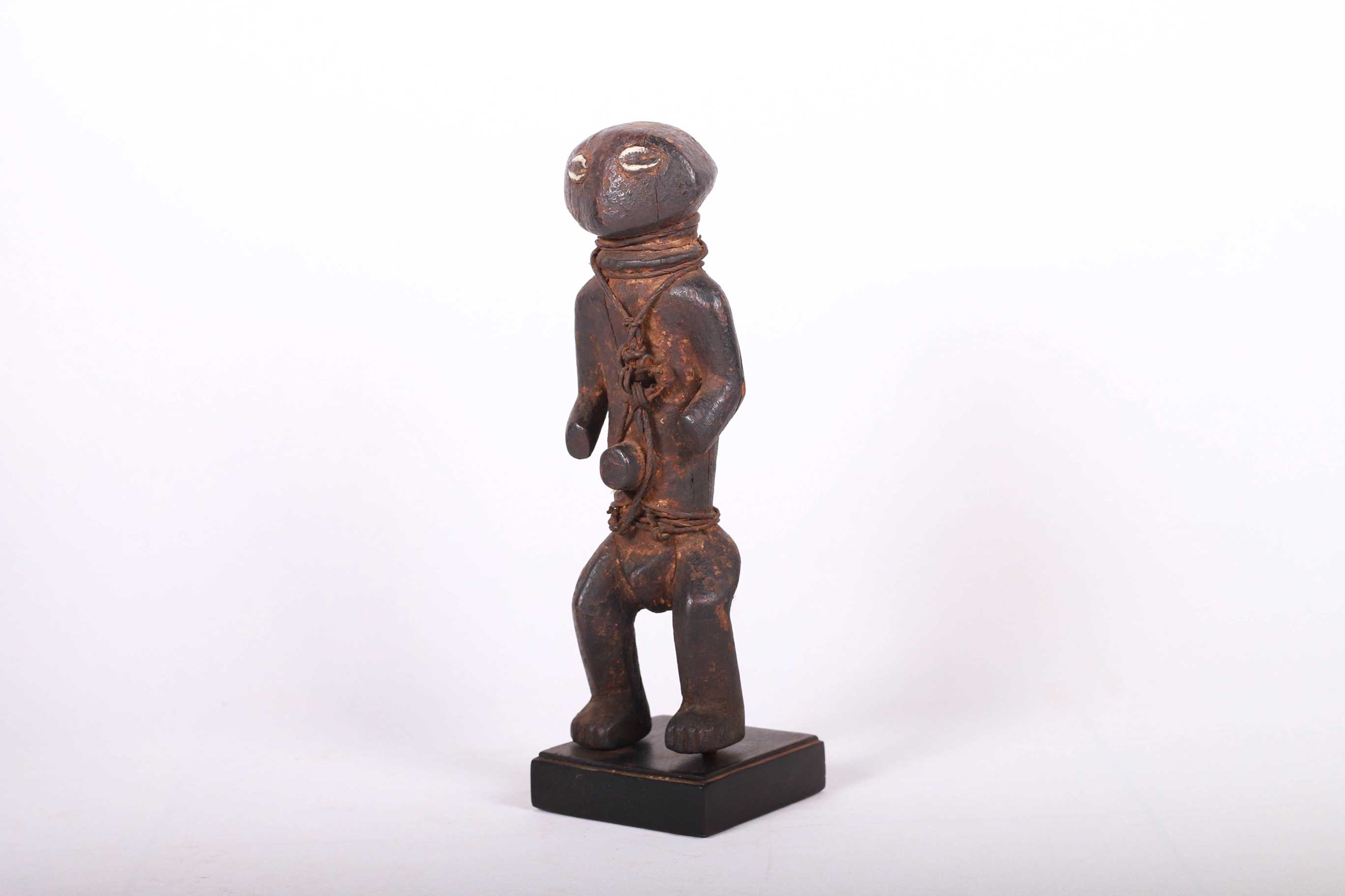 The Zande are found in the African countries of South Sudan, the Central African Republic, and the Northern Democratic Republic of Congo. Zande sculptures are often representations of ancestors. Some of the Zande sculptures are associated with the highest rank of the secret Mani society which protects society members from the dangers of illness, hunting, and evil spirits. This is a flat figure with strings of fiber attached around it. The following statue has interesting facial features. It has a dark patina and looks considerably old with traces of wear.