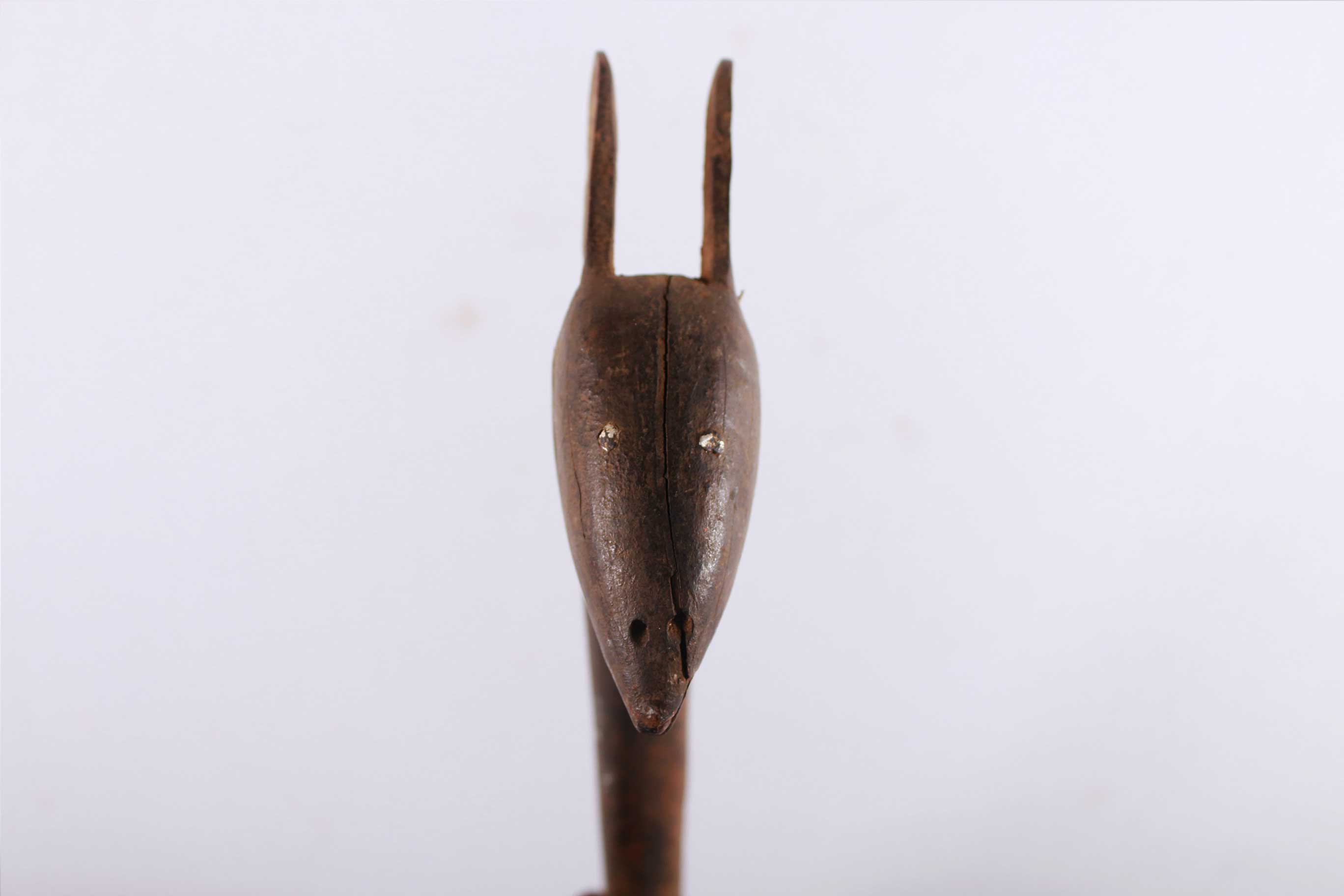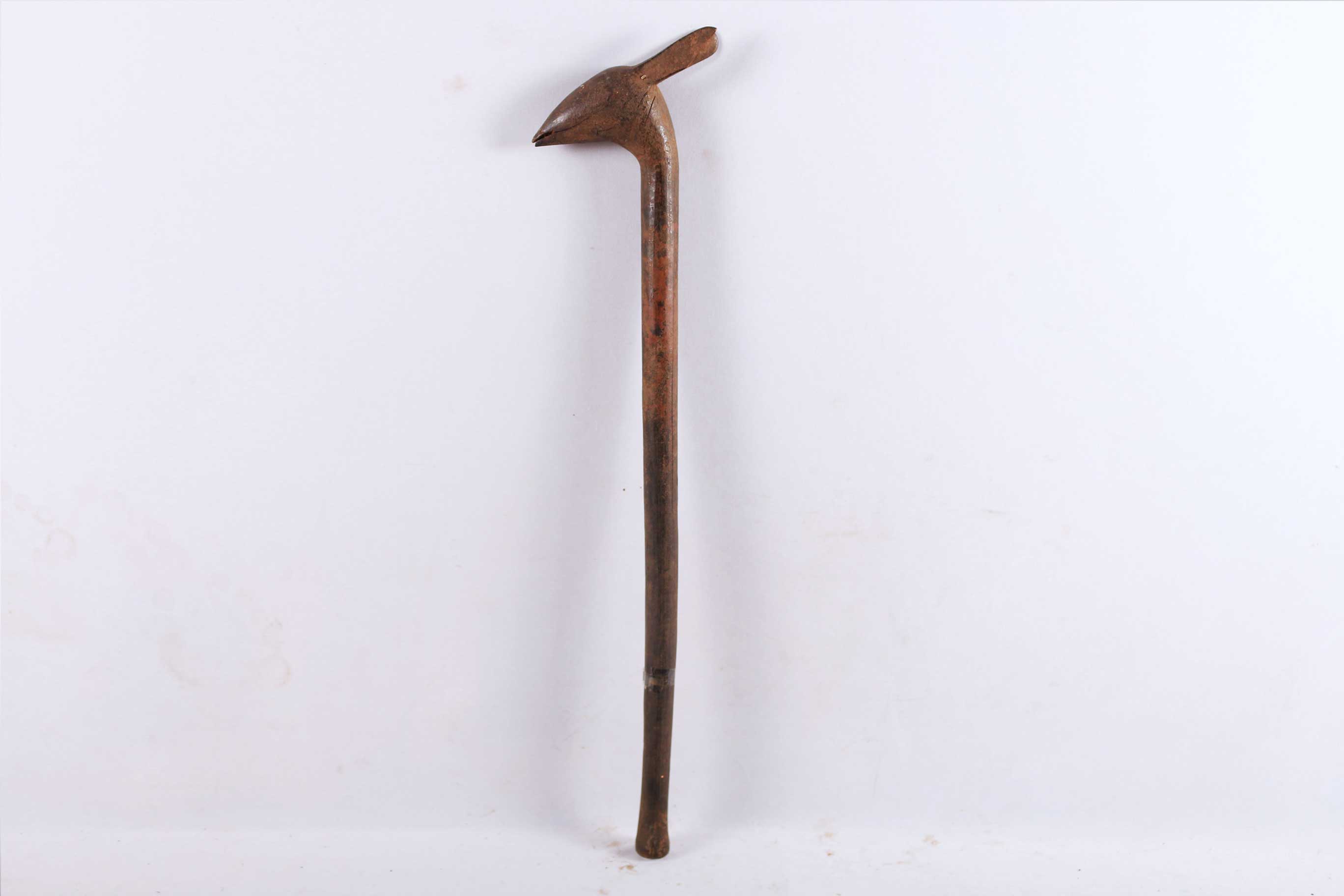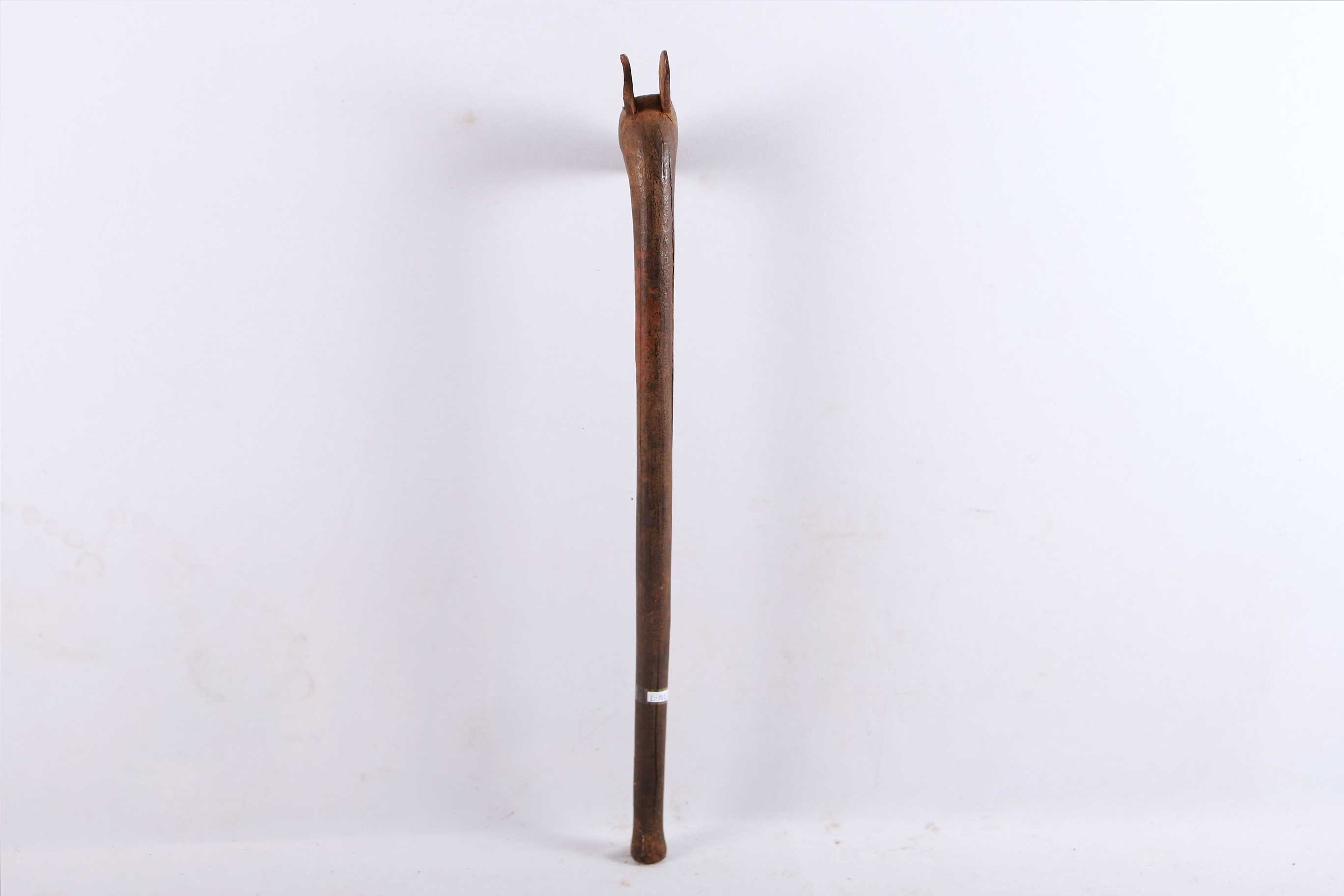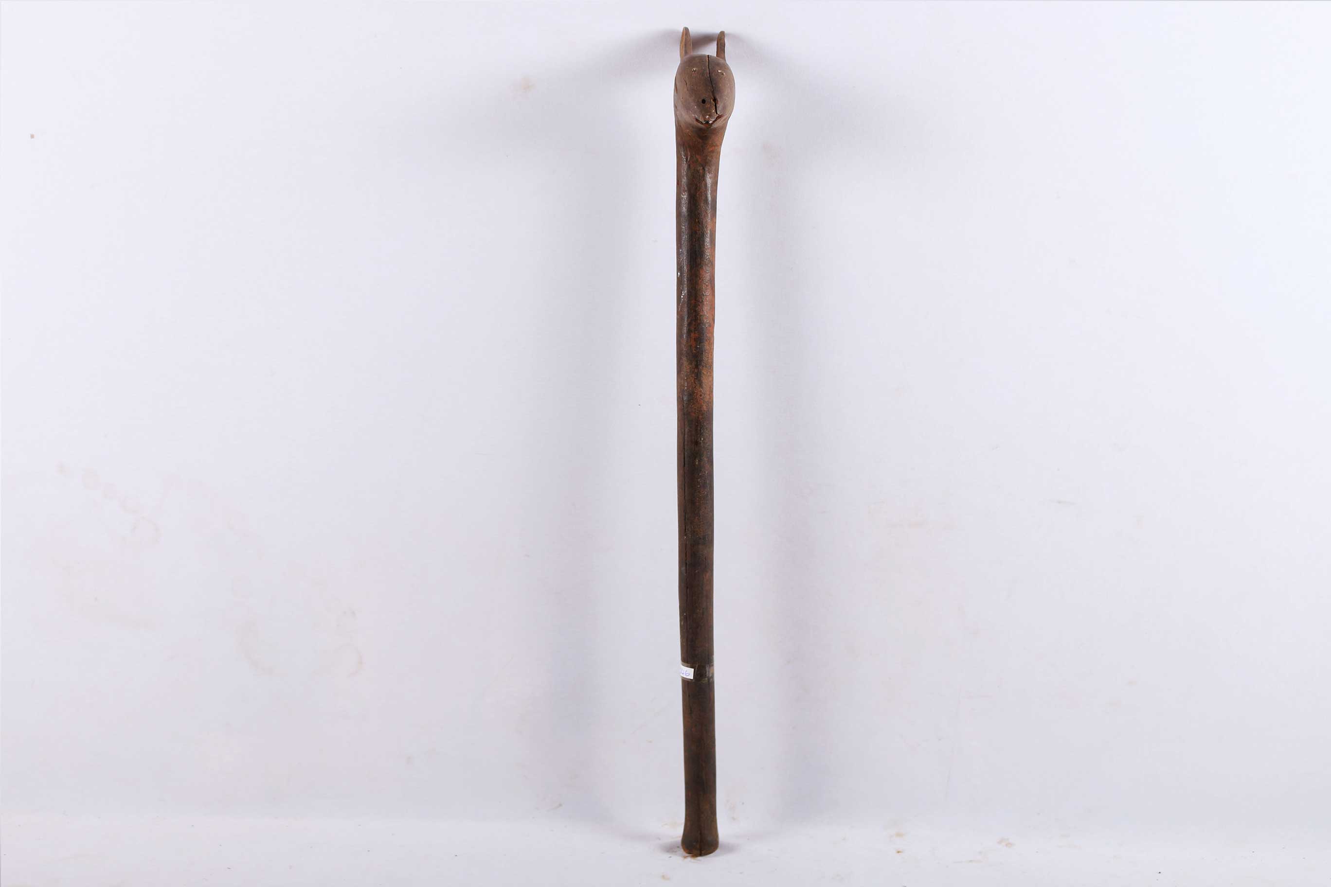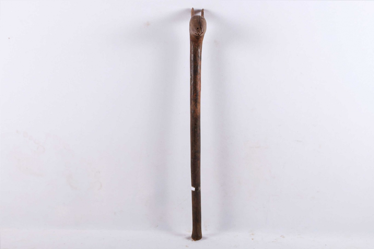 The Zigua are found in Tanzania, their primary religion is Islam. They are part of the Bantu, East-Coastal people cluster found in the Sub-Saharan African affinity bloc. Often the staffs represented the hierarchy among the chiefs of the tribe, who might carry a staff to show their rank as distinguished elders. The zigua made staffs with semi-abstract details like snakes, cows, dogs, horns and more, staffs of this kind underlined the importance of these animals as symbols of wealth, fertility and a form of communication with the royal and other ancestors. This is a well-sculpted Zigua staff ‘sceptre’, of office or dance staff carved in hard, black wood. It has an animal figure at the top to act as a handle, it has a brown worn out patina and of considerable age.
