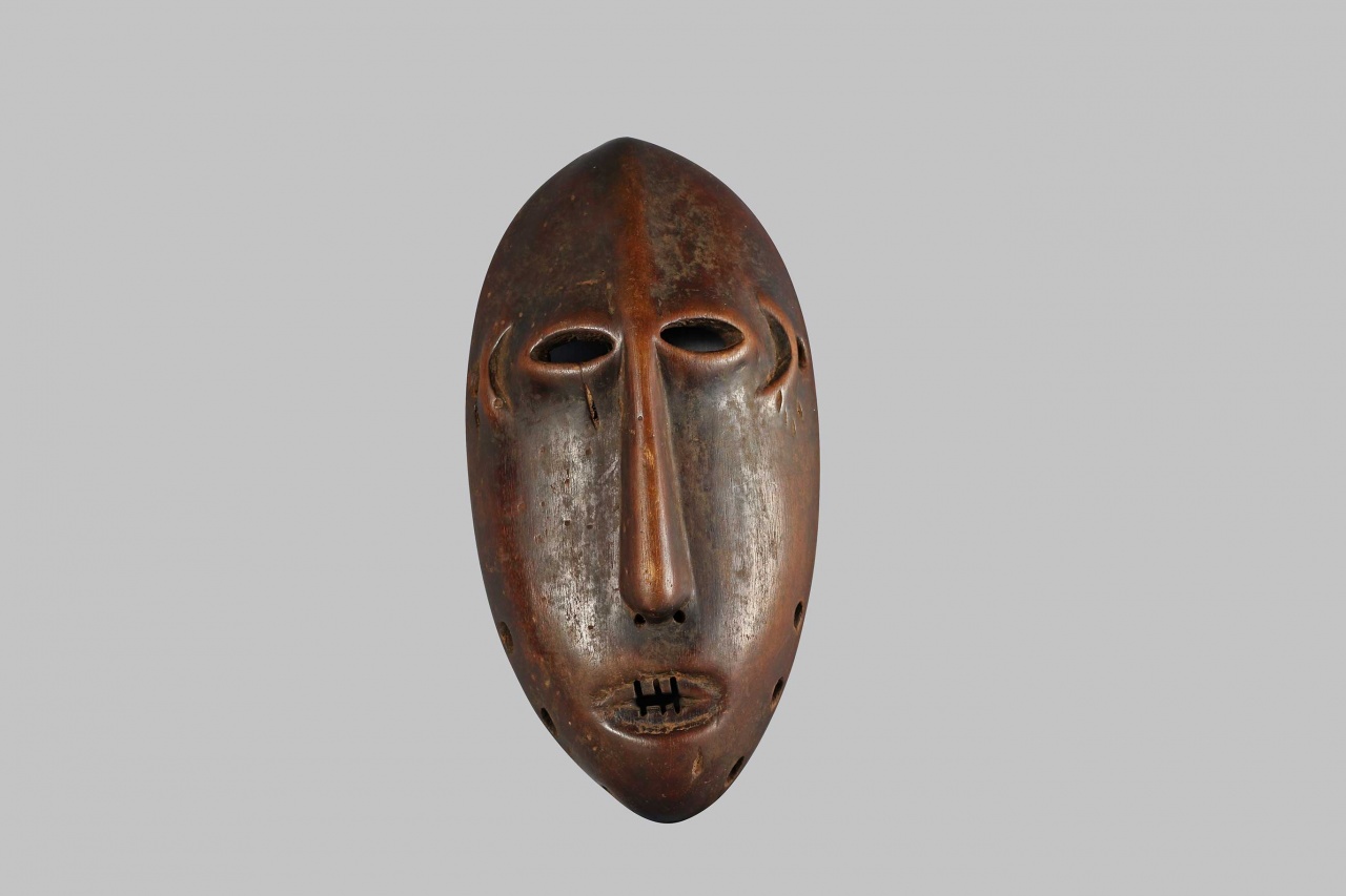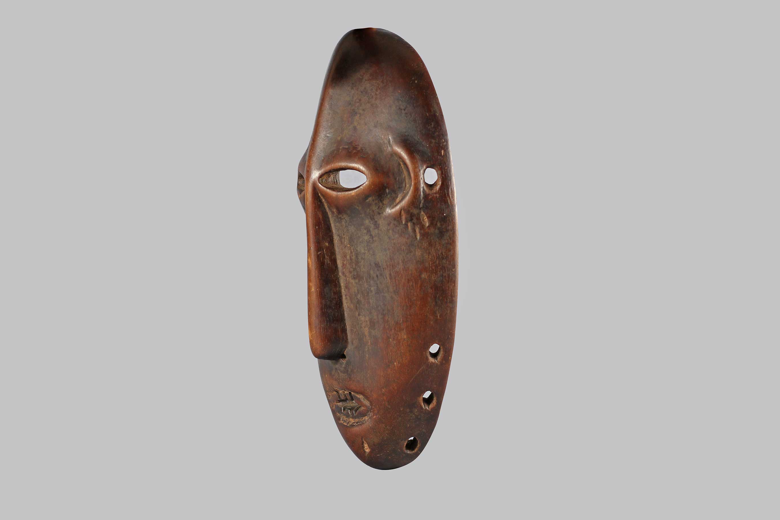 This is a fine and rare Zimba Mask of hollowed spherical form with a carefully shaped facial plane, a slit mouth with teeth markings below a beautiful triangular nose. The Zimba tribe are known to have settled in the region of Elila river in the Democratic Republic of Congo.
